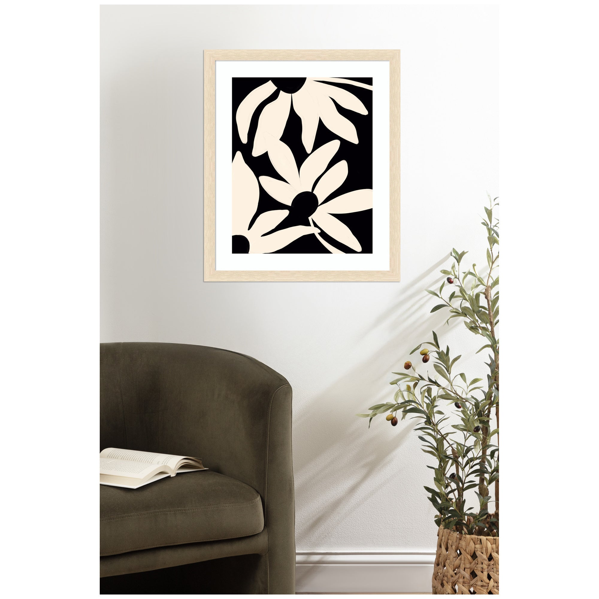 - Authentic Artist Collaboration: 'Minimal Blooms' is an officially licensed work by independent artist Alicia Bock, thoughtfully presented in our Woodgrain Stripe Blonde molding. The finished piece measures 22 x 26, offering a sophisticated statement for your space. Visual Story: The artwork portrays an abstract and minimalist design featuring three daisy-like flowers with white petals and black centers set against a black background. The simplicity of the form highlights the elegance of the flowers and creates a striking contrast. The overall composition is modern and clean, emphasizing the beauty of natural elements through a minimalistic approach. Alicia Bock's