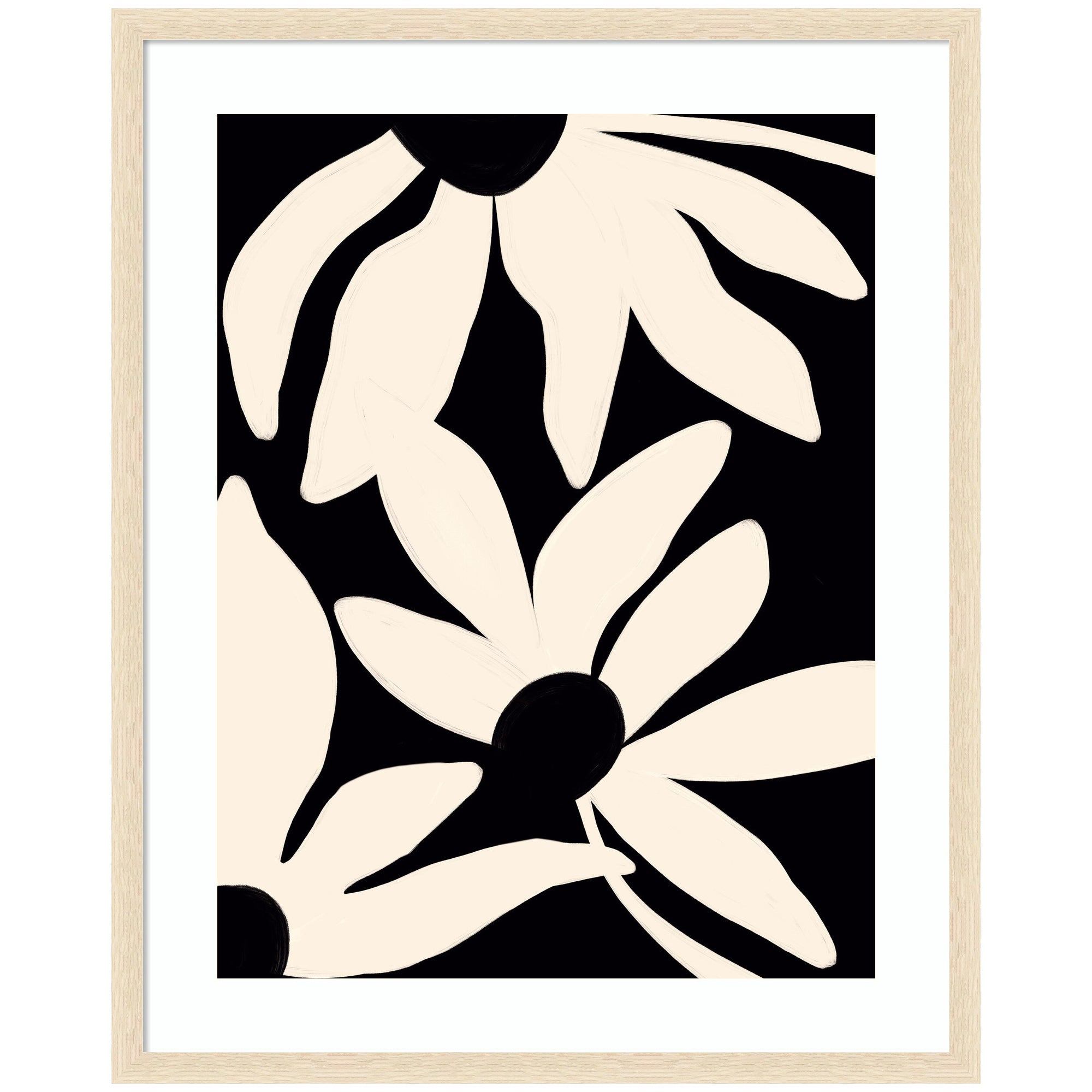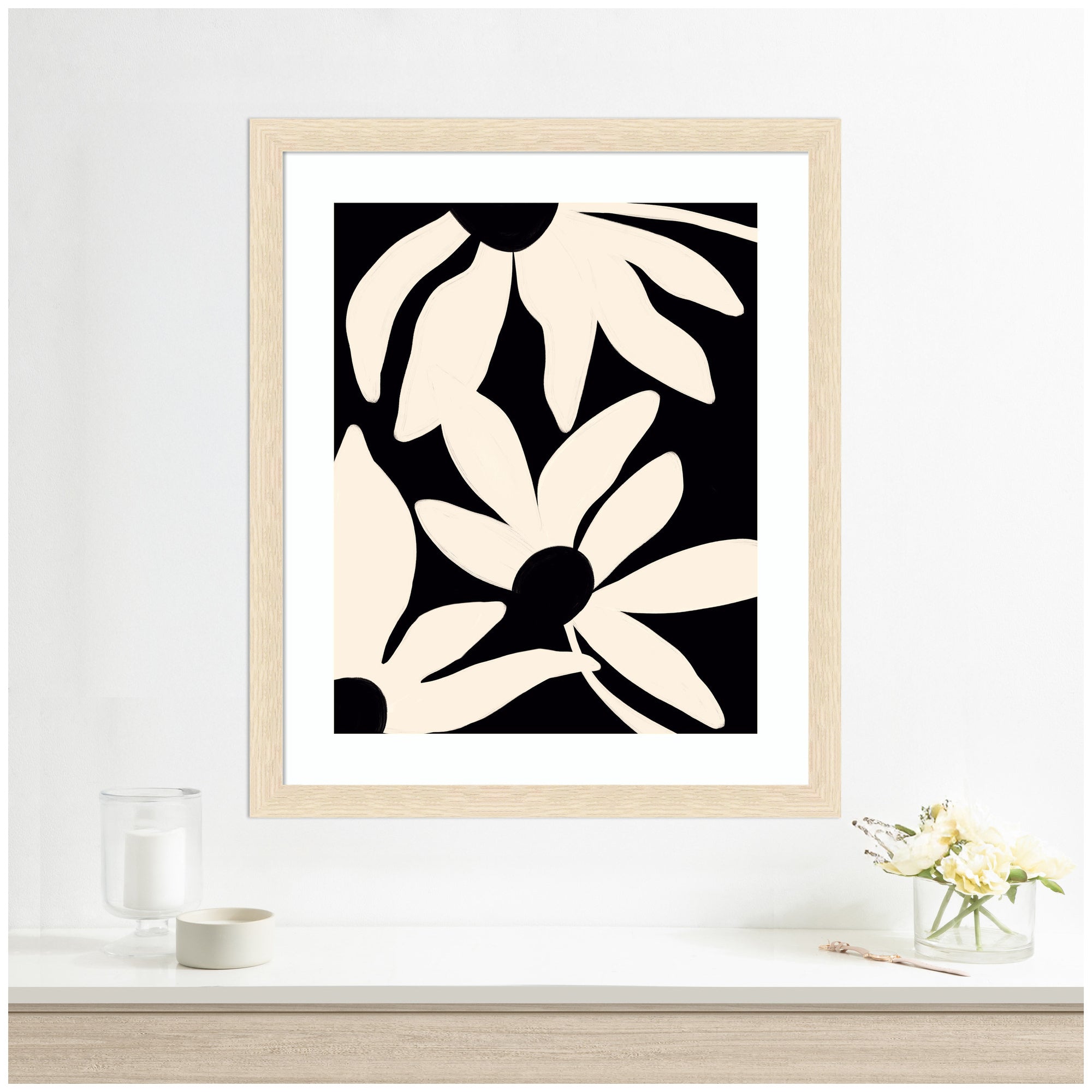 Elevate your space through thoughtfully curated style with this stunning piece designed by independent artist Alicia Bock and beautifully framed by hand in Madison, WI. The image is giclee printed using fade-resistant inks, ensuring every detail comes to life in rich, lasting color. Set in designer moulding, its a Modern Contemporary accent crafted to make a statement. Visual Story: The artwork portrays an abstract and minimalist design featuring three daisy-like flowers with white petals and black centers set against a black background. The simplicity of the form highlights the elegance of the flowers and creates a striking contrast. The overall composition is modern and clean, emphasizing the beauty of natural elements through a minimalistic approach.