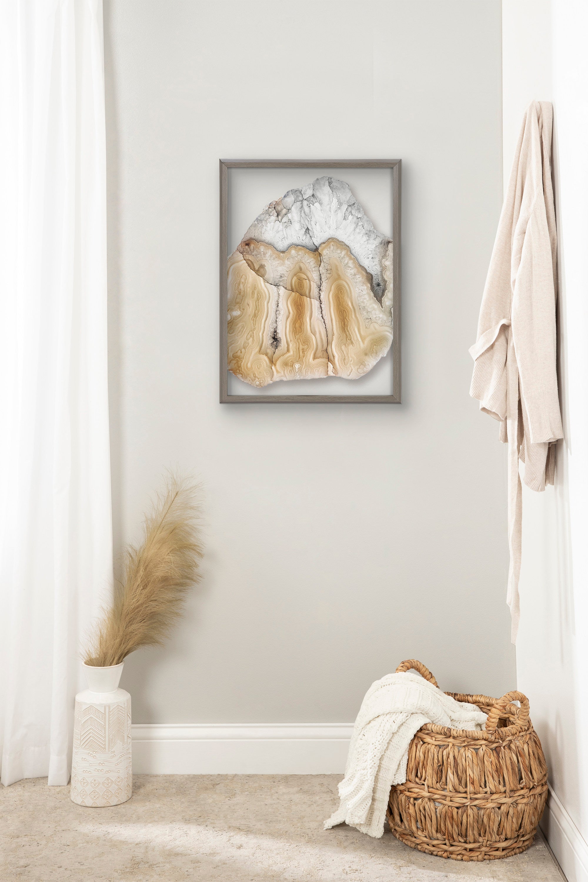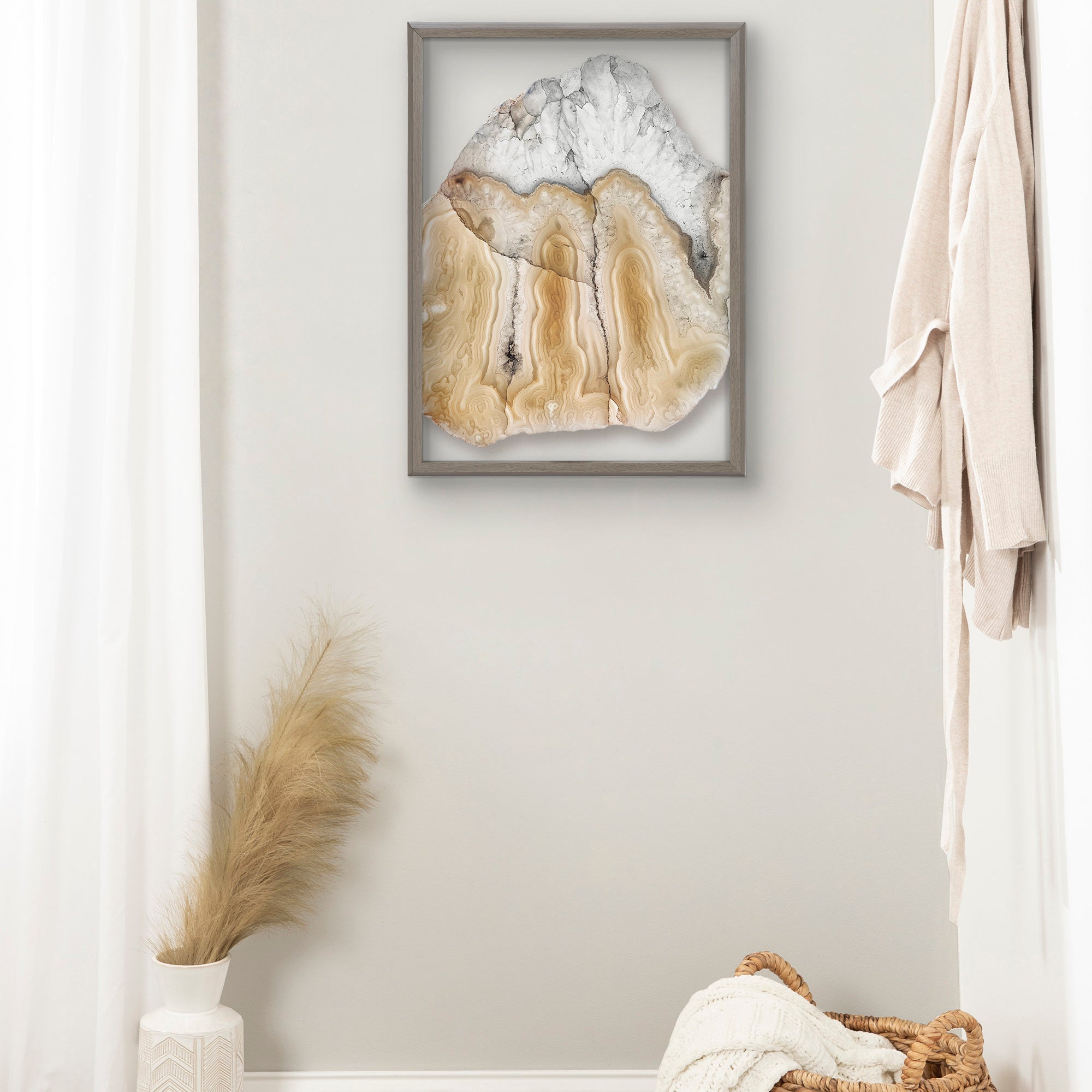 Energize your mind, body and soul with this beautiful photograph of a Brazilian agate. Printed and framed in the USA in Waunakee, Wisconsin, this framed glass art will be a pleasure to look at every day in your living room, bedroom, office, or any room in the home. This art print also makes an excellent gift for birthdays, holidays, or house-warming parties. Printed on glass and framed with a lightweight polystyrene frame, this wall art is easy to display on the wall.