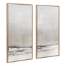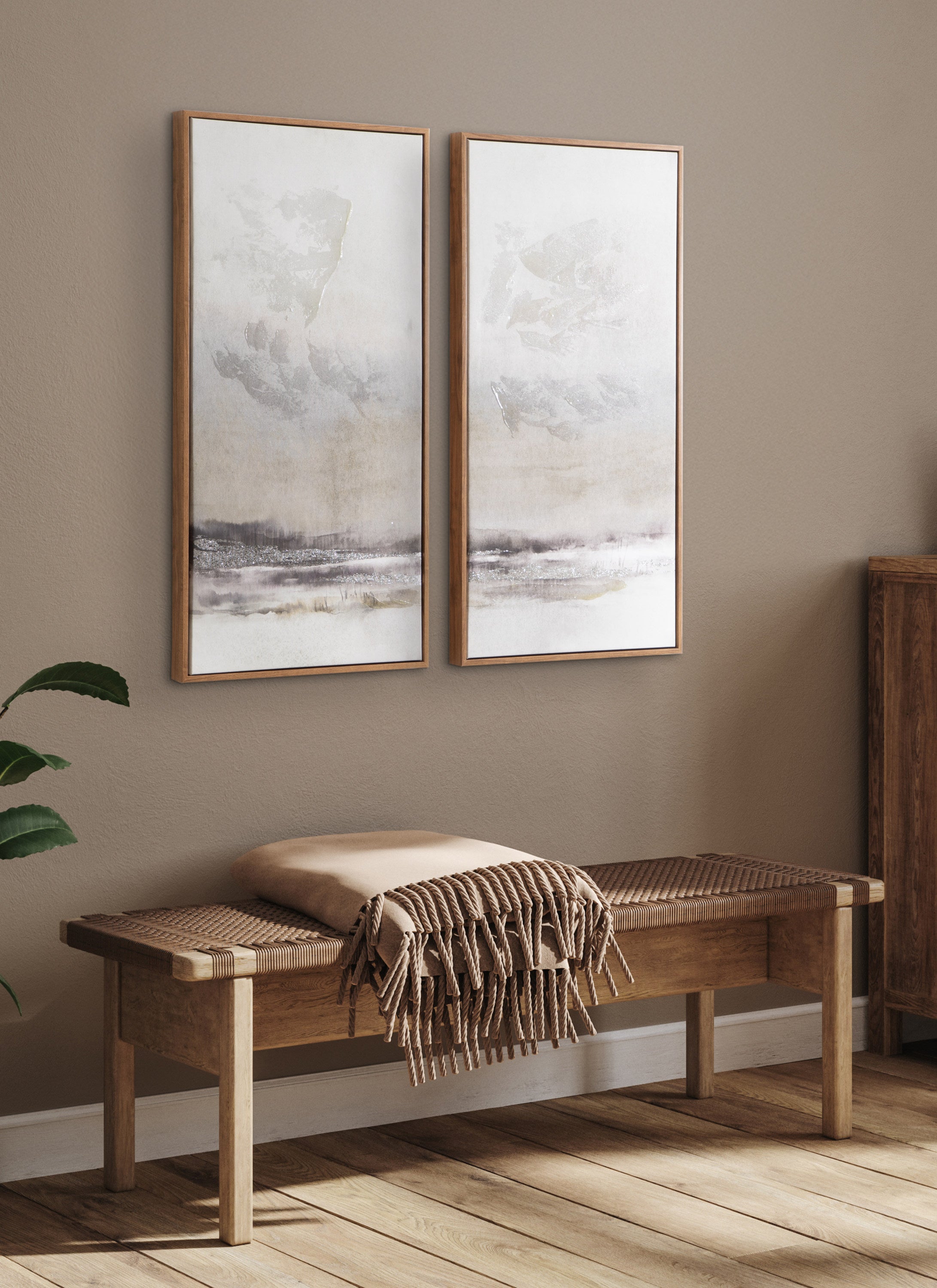 Bring a touch of serenity and modern sophistication to your home with this two-piece framed canvas art set from Kate and Laurel. This unique and captivating art set embodies the harmony between natural elements and contemporary artistry, creating a calming yet intriguing focal point for any room in your home. The soft watercolor painting adds texture to your wall and some metallic accenting within the brushstrokes. Whether you're looking to add visual interest to your bedroom, create a welcoming atmosphere in your entryway, or enhance the aesthetic of your living room, this two-piece abstract landscape set will elevate your décor with its subtle yet striking beauty. Bordered by a polystyrene modern gallery style frame, the artwork is adequately framed with design and function in mind.