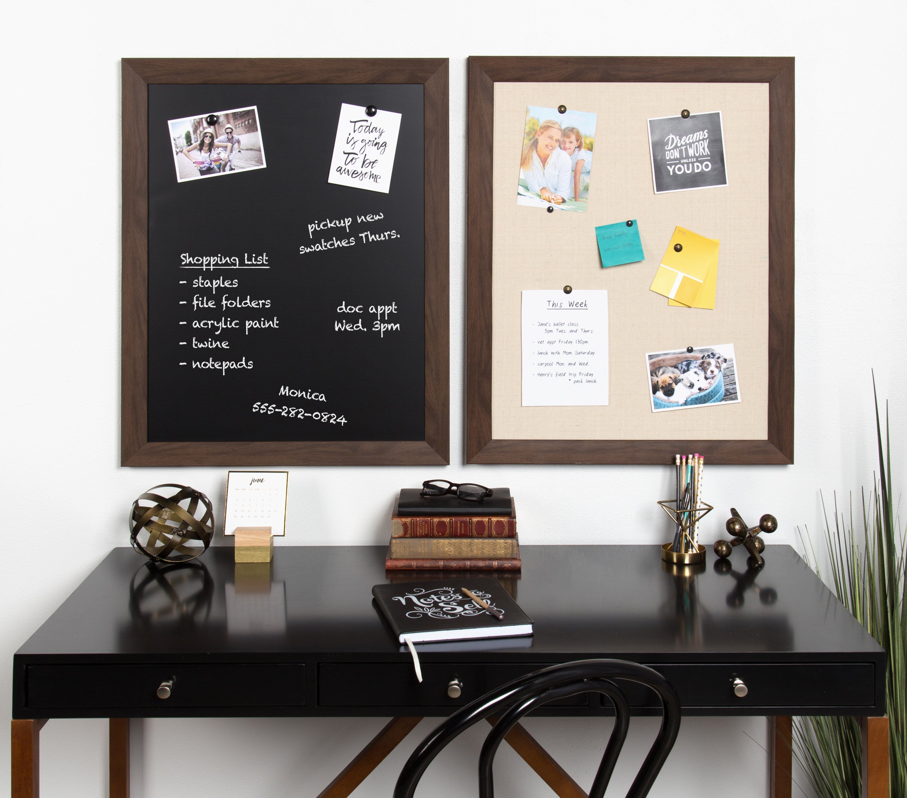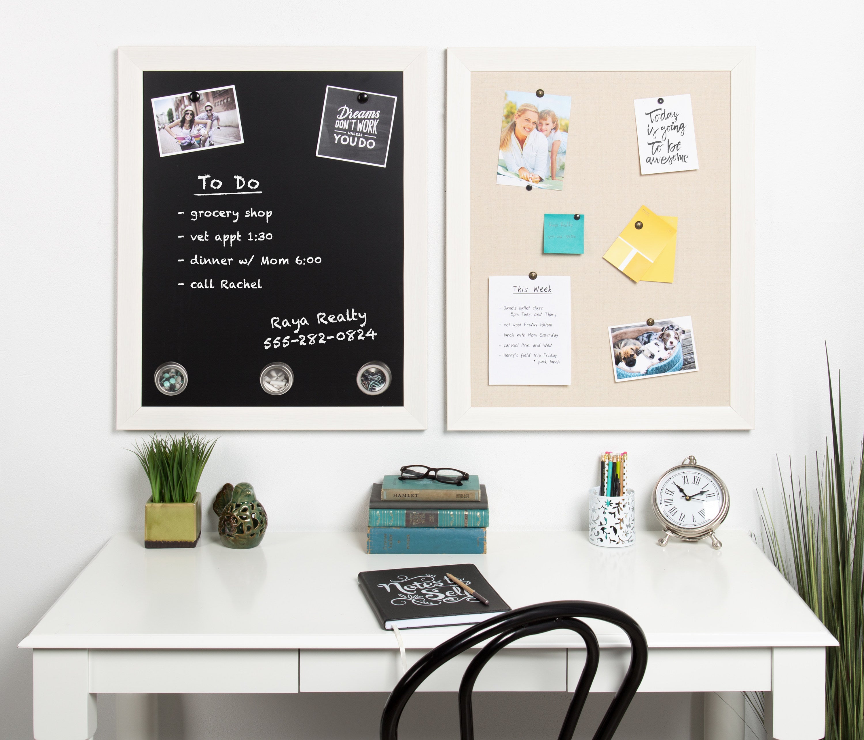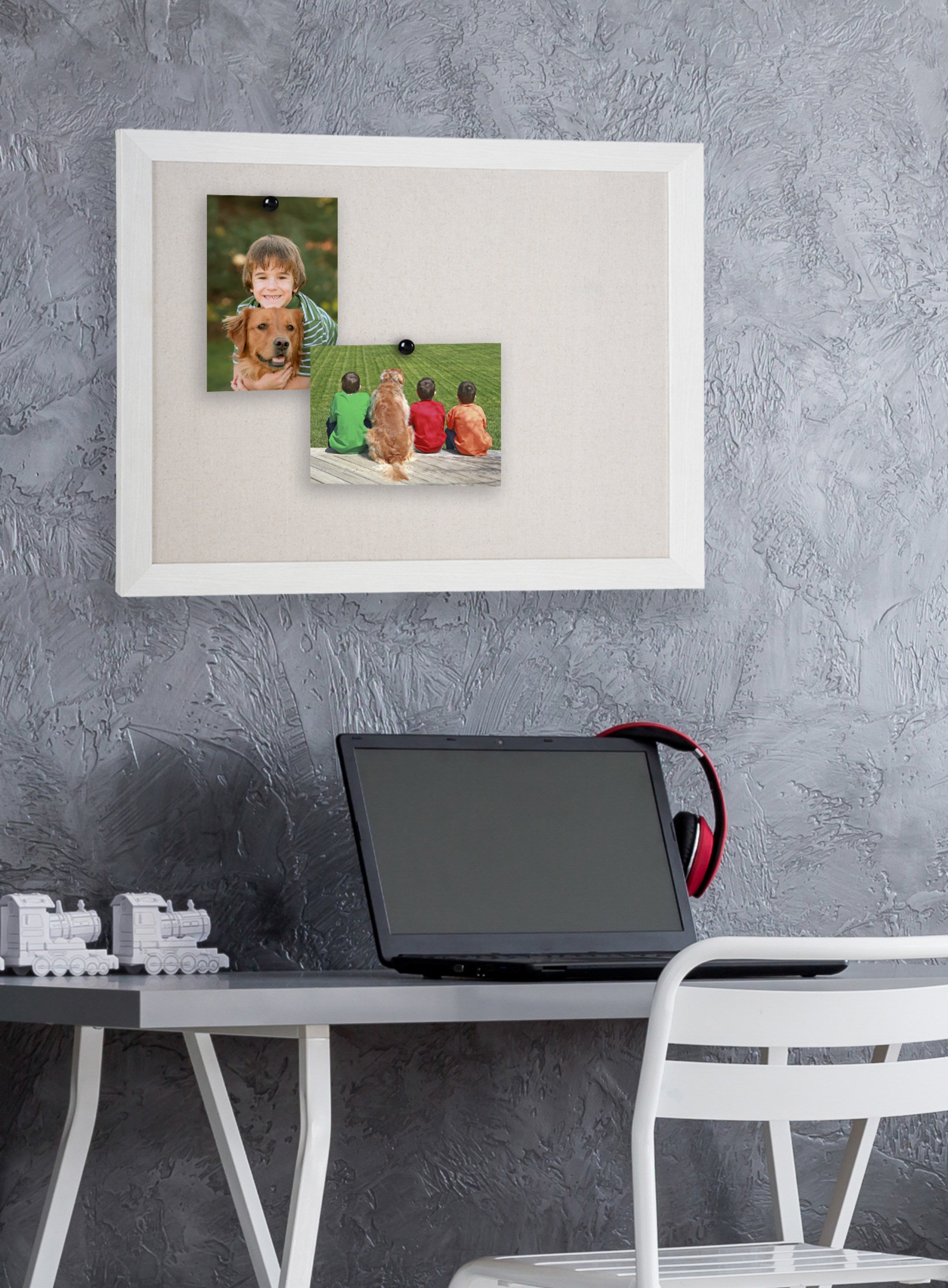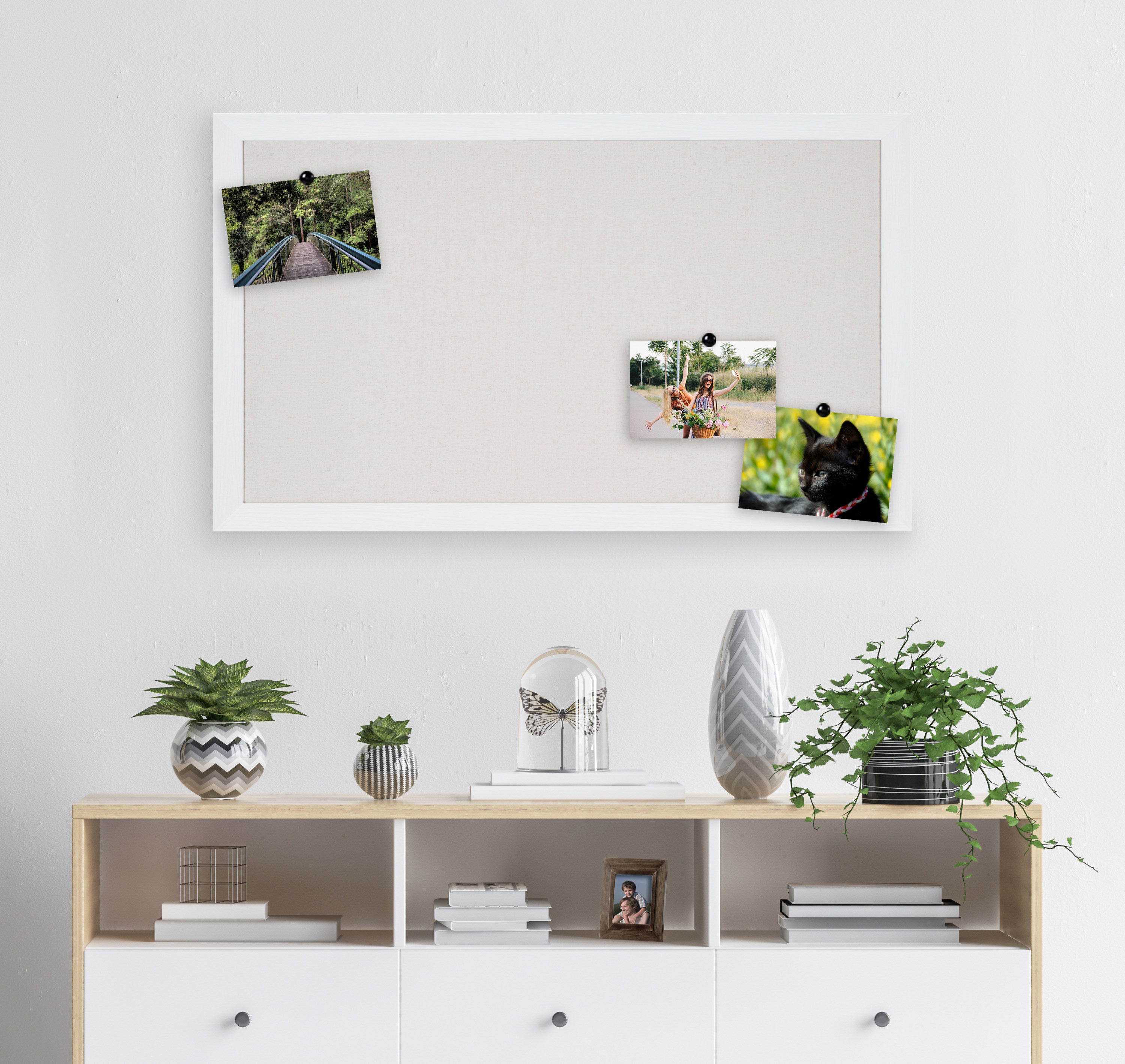 - A durable linen fabric covers a padded pinboard area that leaves plenty of room for displaying all the week's notes and reminders