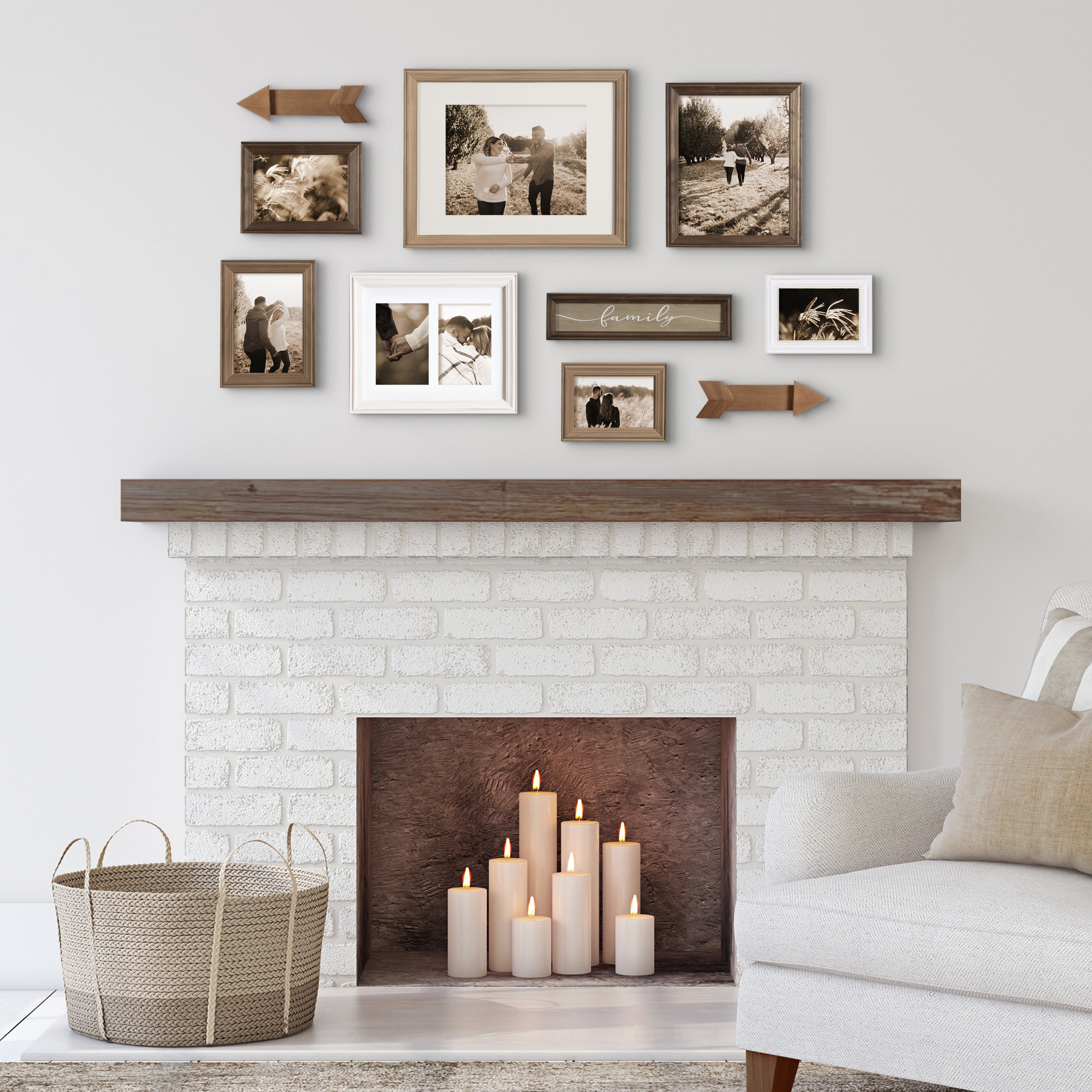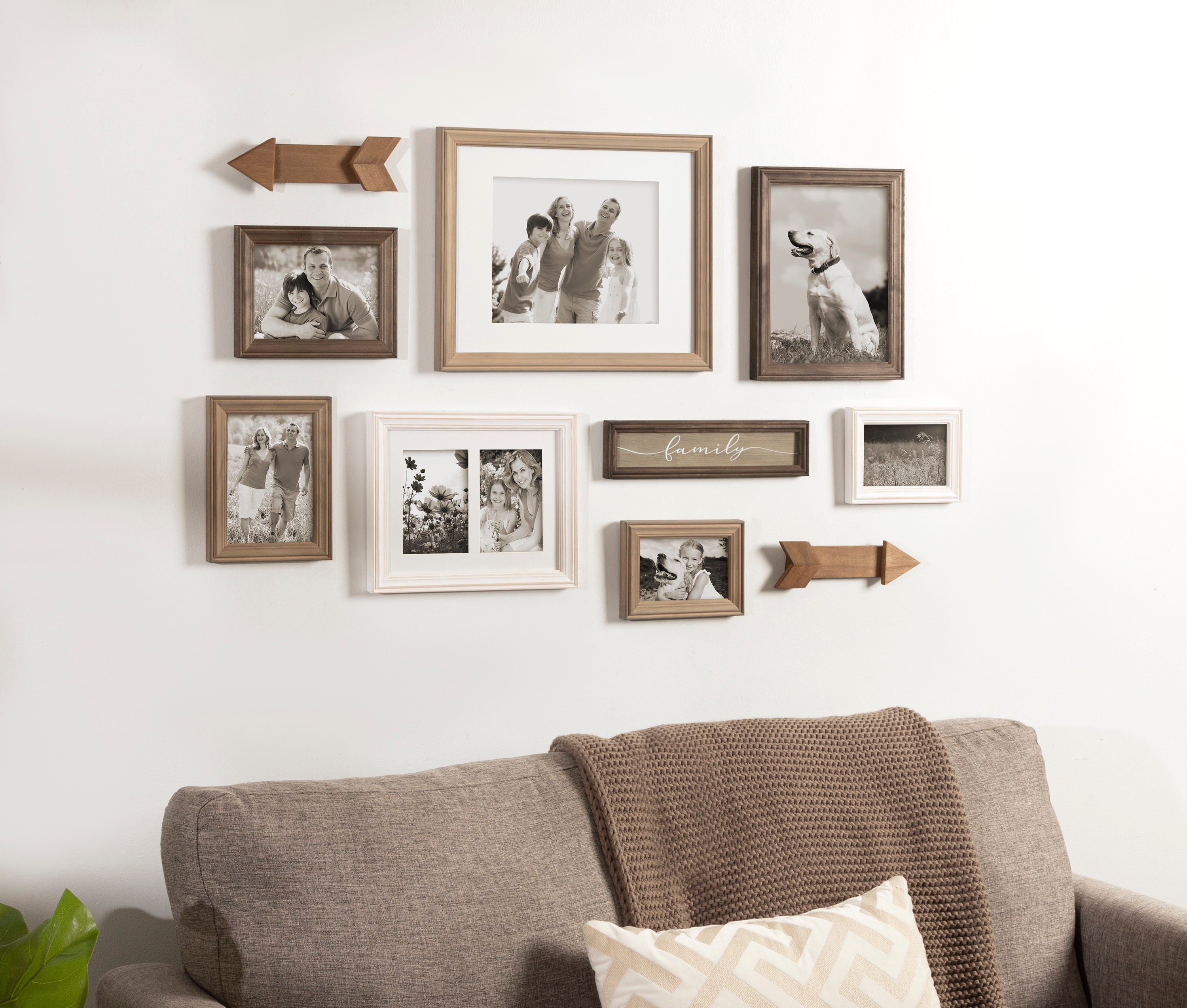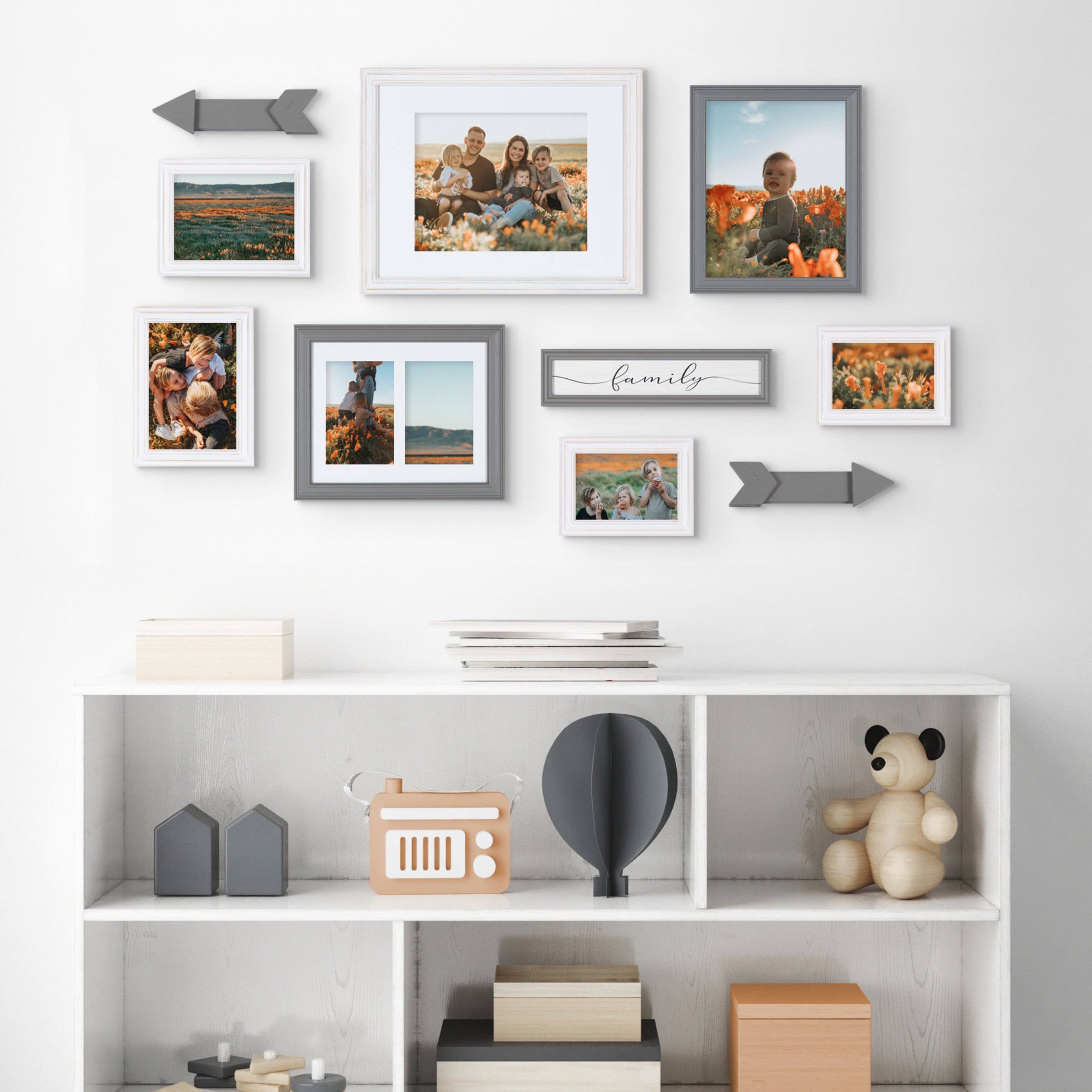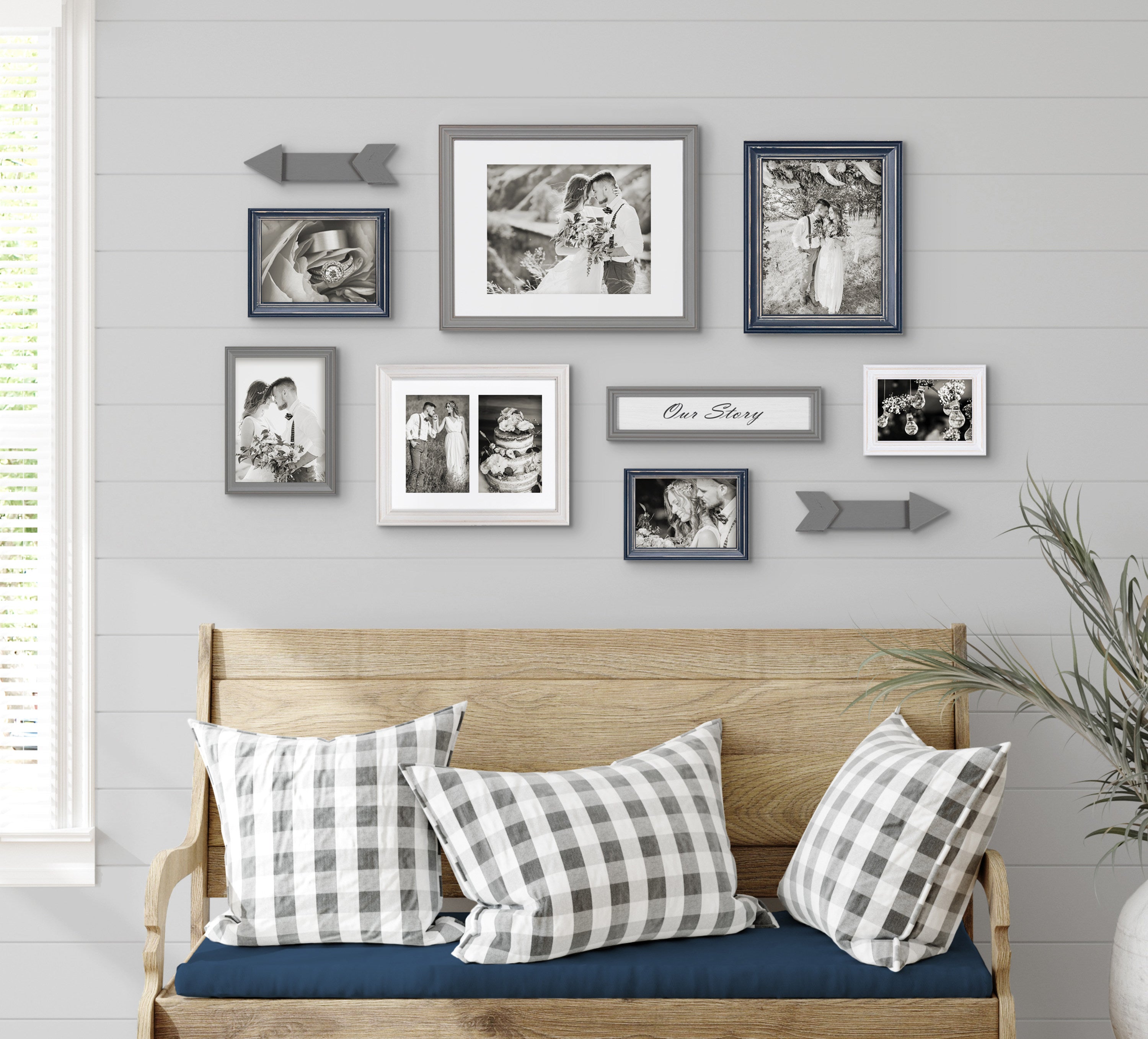 Our Bordeaux gallery wall frame and wall accent kit bring a rustic sophistication to any wall while celebrating your most cherished memories. This set features seven frames of various sizes with two bold farmhouse arrows and a slim frame for the included decorative face paper. This collection includes distressed finishes inspired by simplistic farmhouse aesthetics.