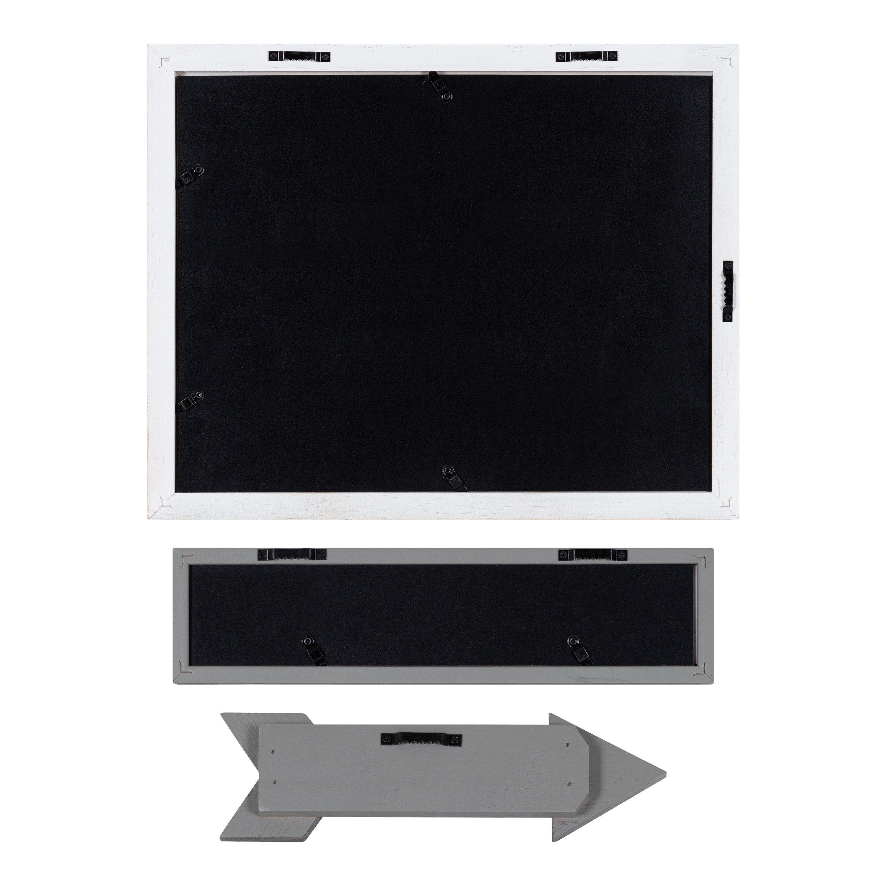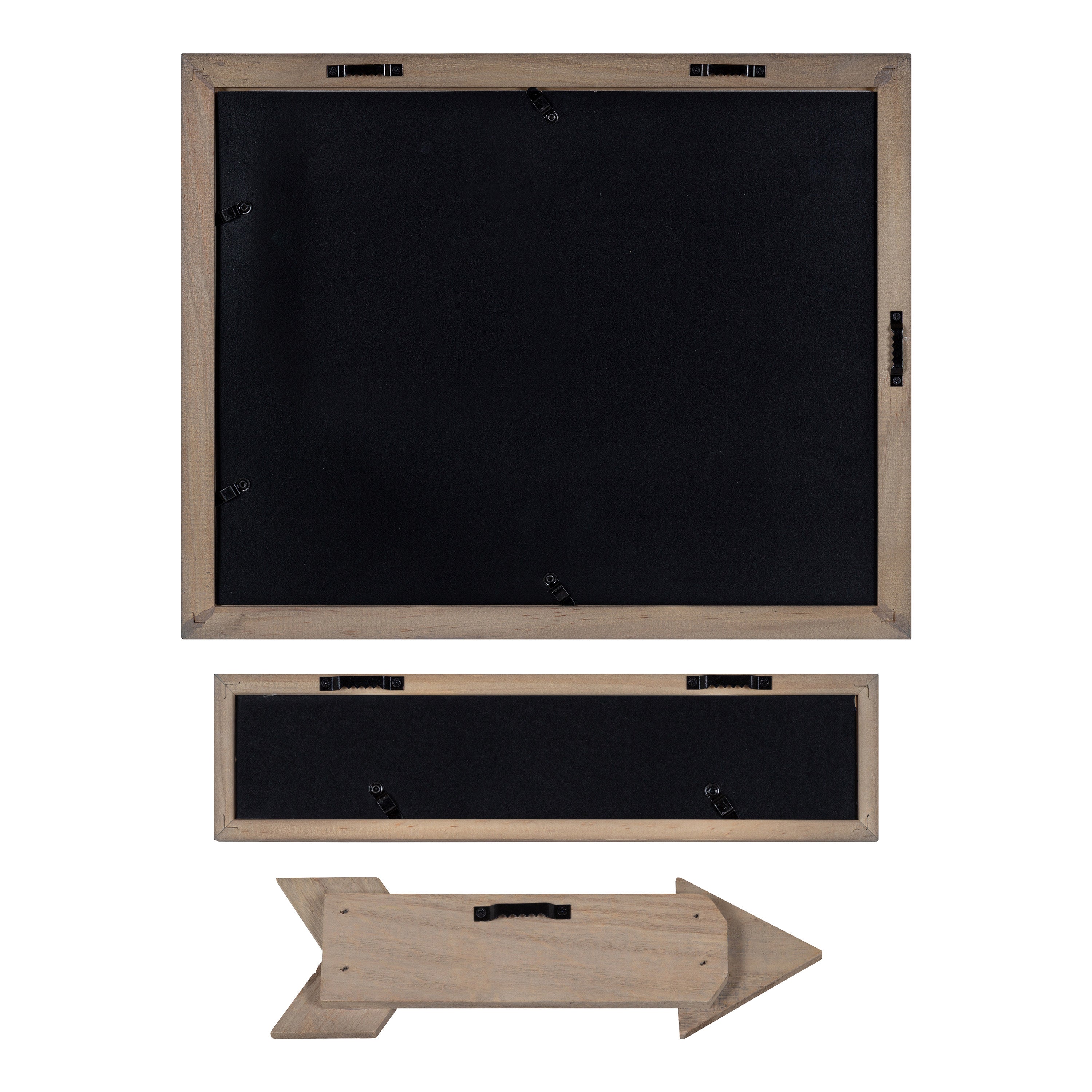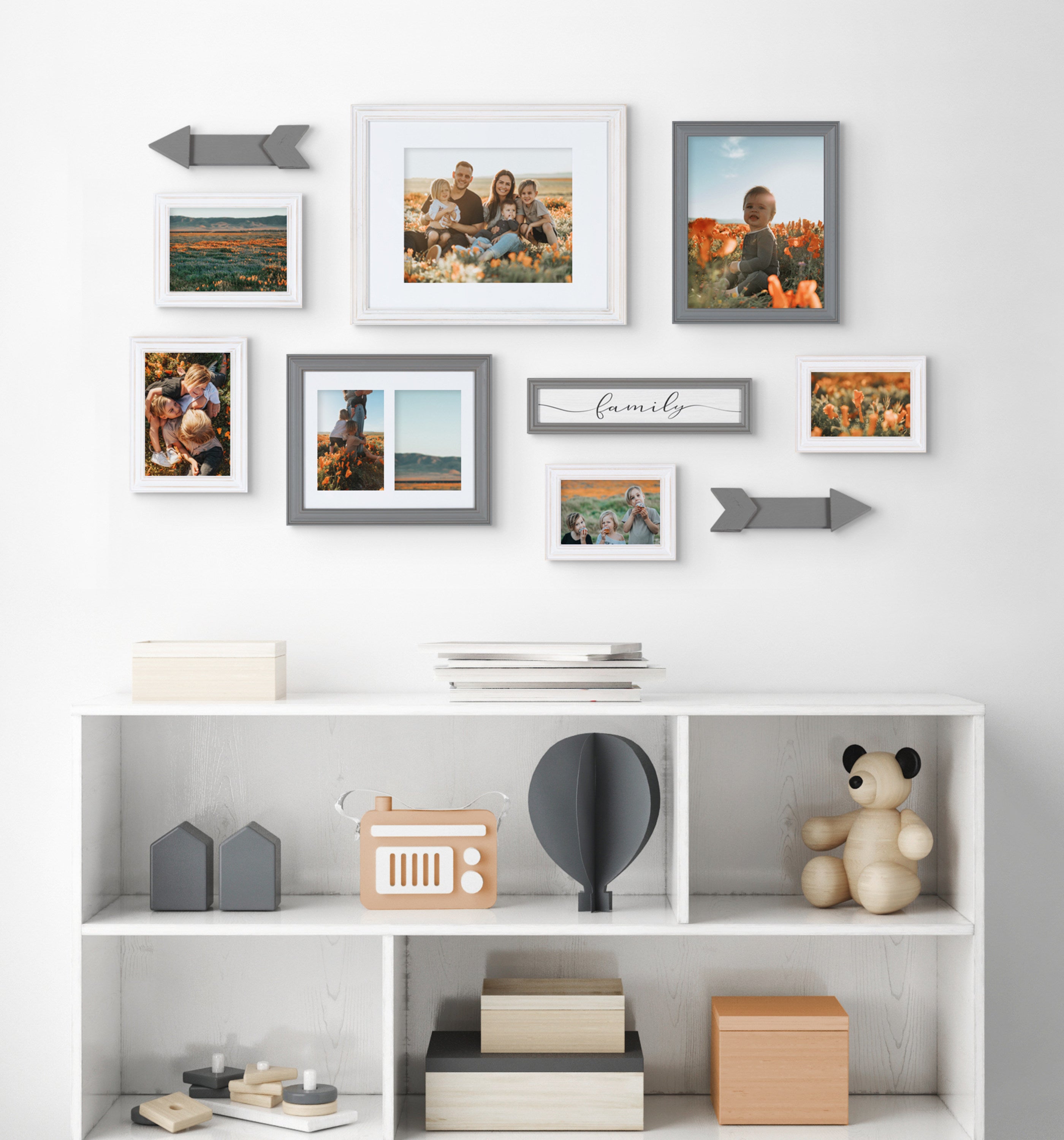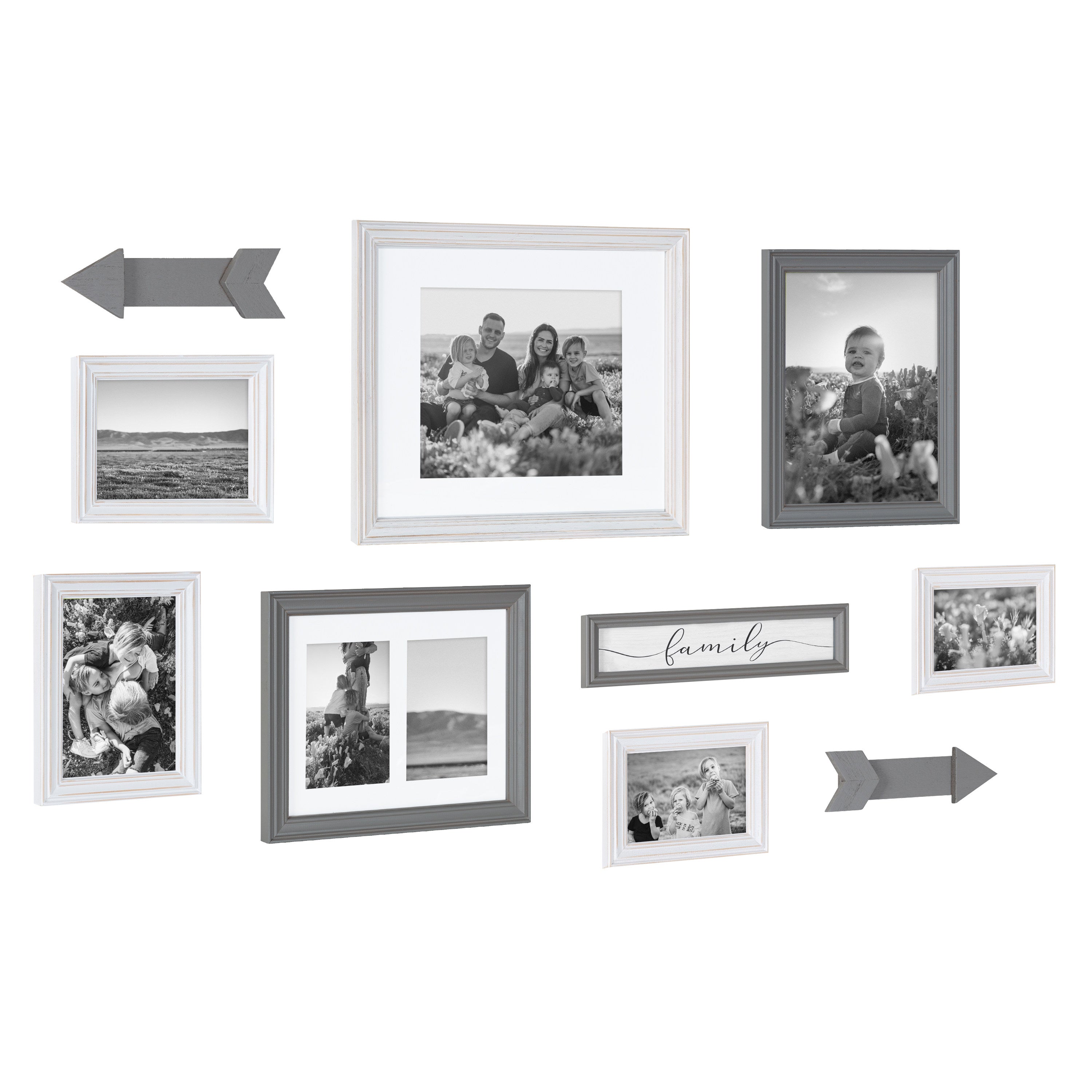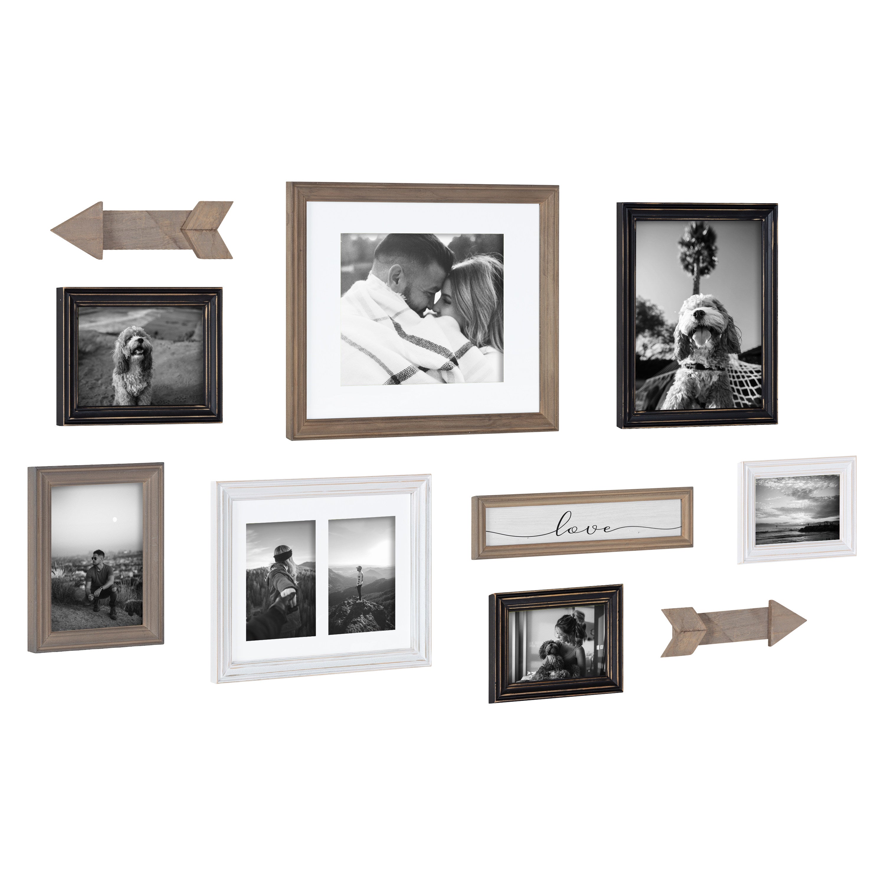 Our Bordeaux gallery wall frame and wall accent kit bring a rustic sophistication to any wall while celebrating your most cherished memories. This set features seven frames of various sizes with two bold farmhouse arrows and a slim frame for the included decorative face paper. This collection includes distressed finishes inspired by simplistic farmhouse aesthetics.