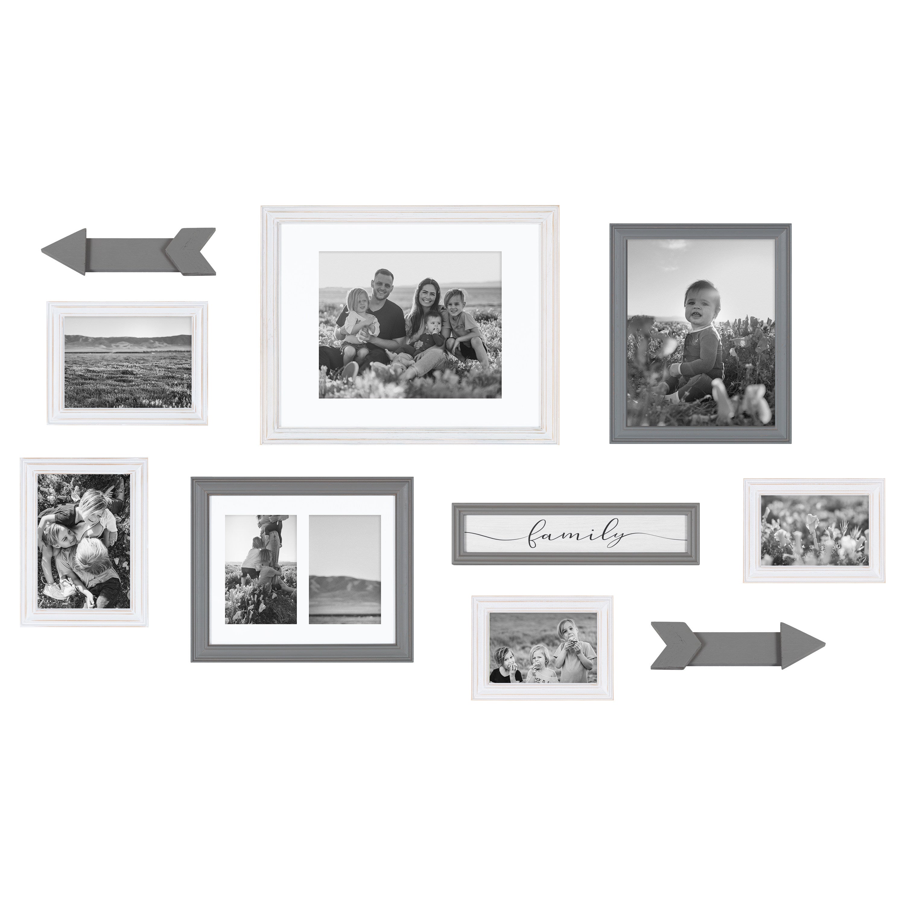 - Includes multiples sizes: (1) 15.5x12.5 frame with an 11x14 opening, matted to photo display size 8x10; (1) 9.5x11.5 with an 8x10 opening, (2) 7.5x5.5 frames with a 4x6 opening, (1) 14x4.75 frame with a 12.5x3.125 opening, (1) 11.5x9.5 frame with an 8x10 opening matted with two 6x4 openings, (2) 6.5x8.5 frame with a 7x5 opening