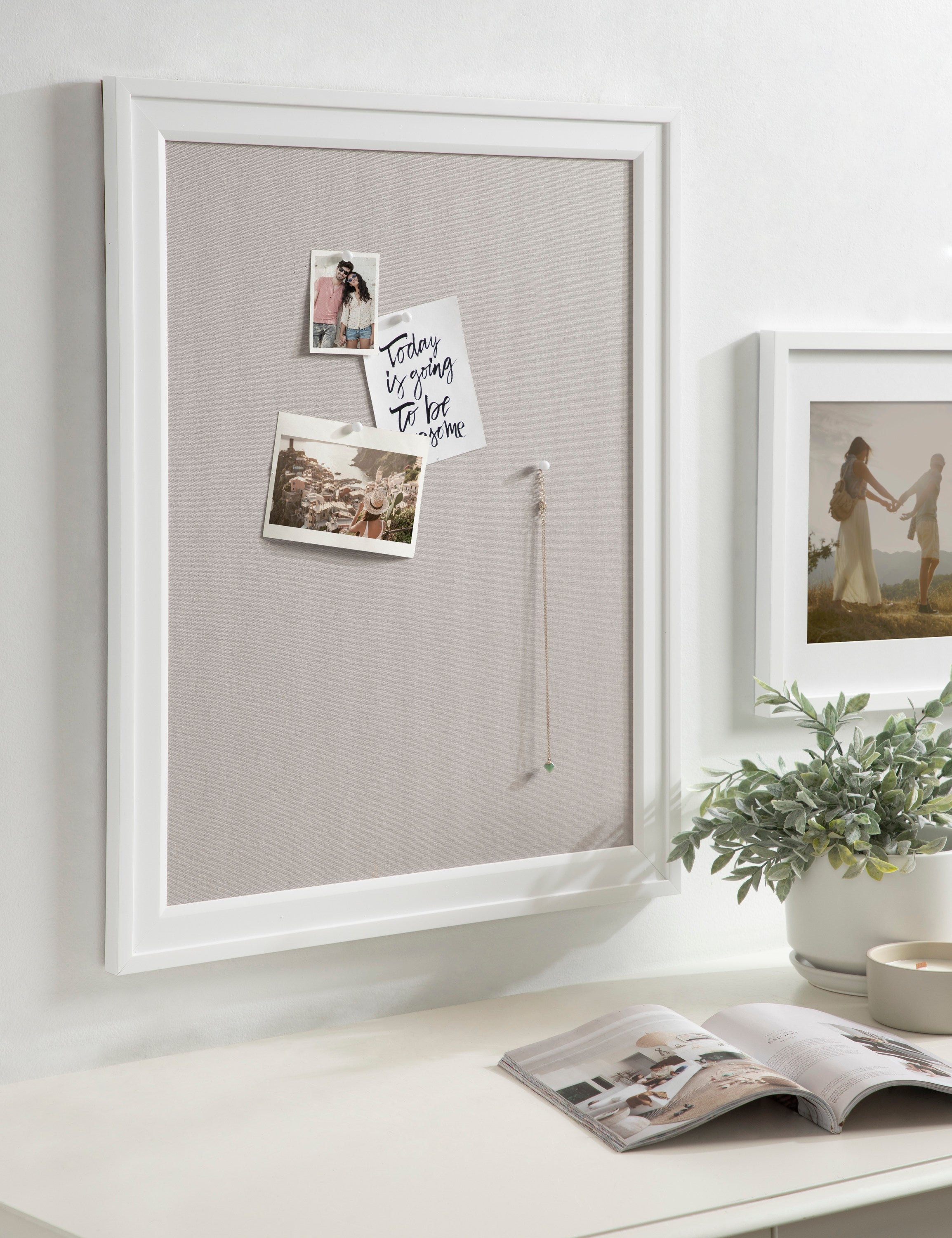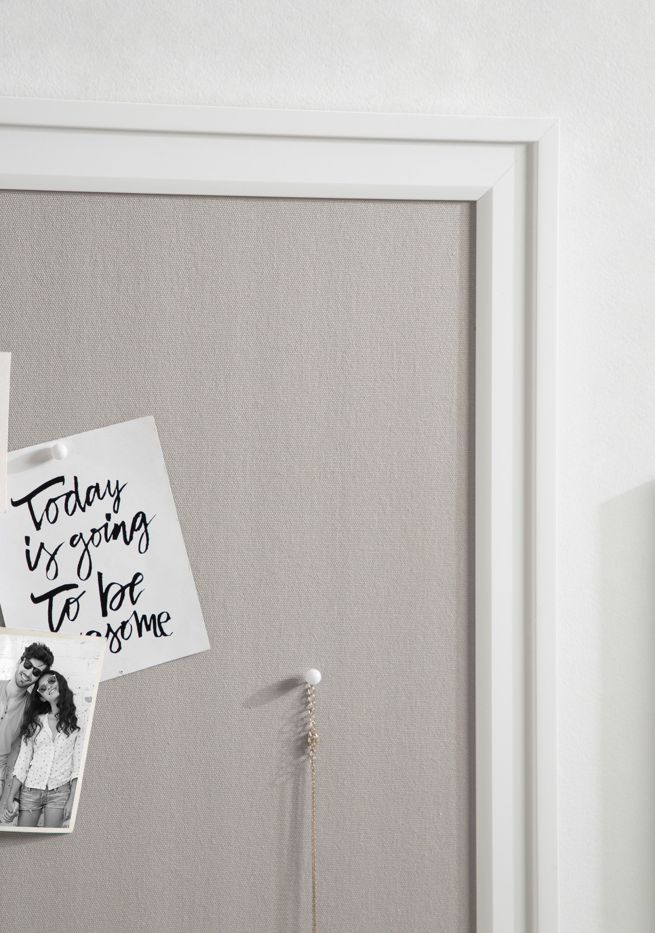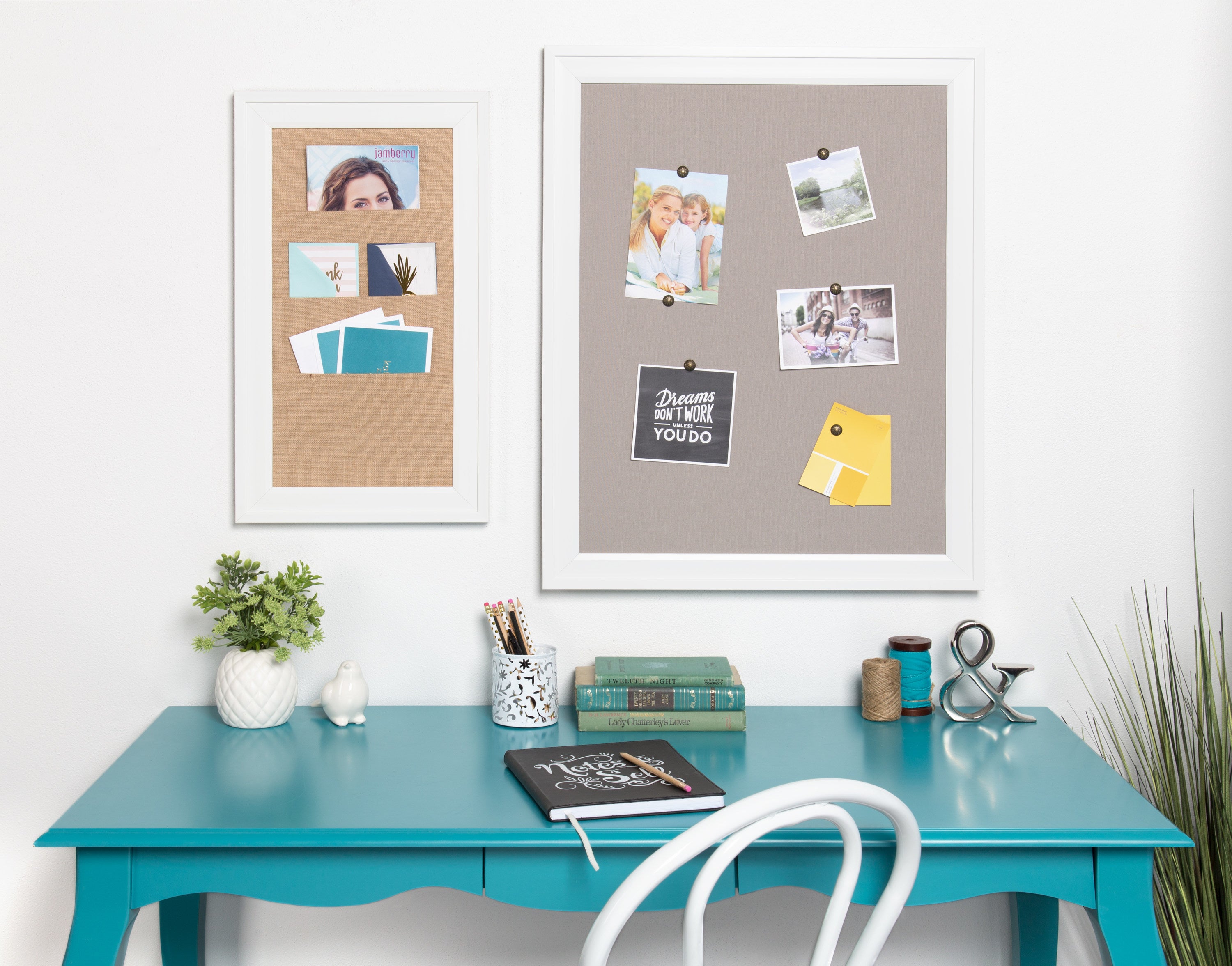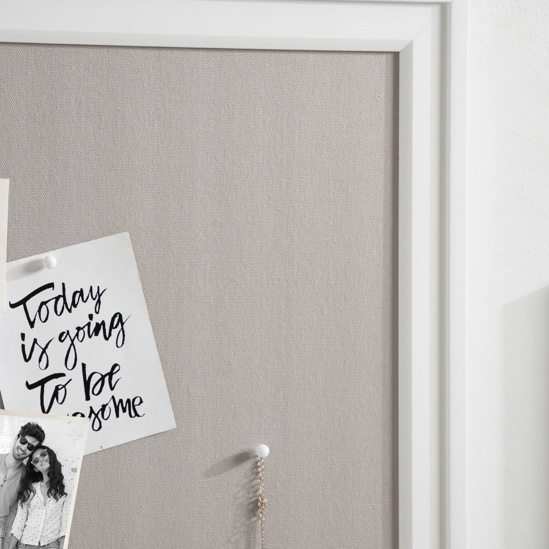 A transitional style frame surrounds the sturdy linen fabric pinboard to create home or office organization that's as decorative as it is functional. It's the wall-mounted memo board you didn't know you needed! With the casual look and the soft linen fabric padded pinboard area, it'll look fantastic in your entry way, kitchen, or home office.