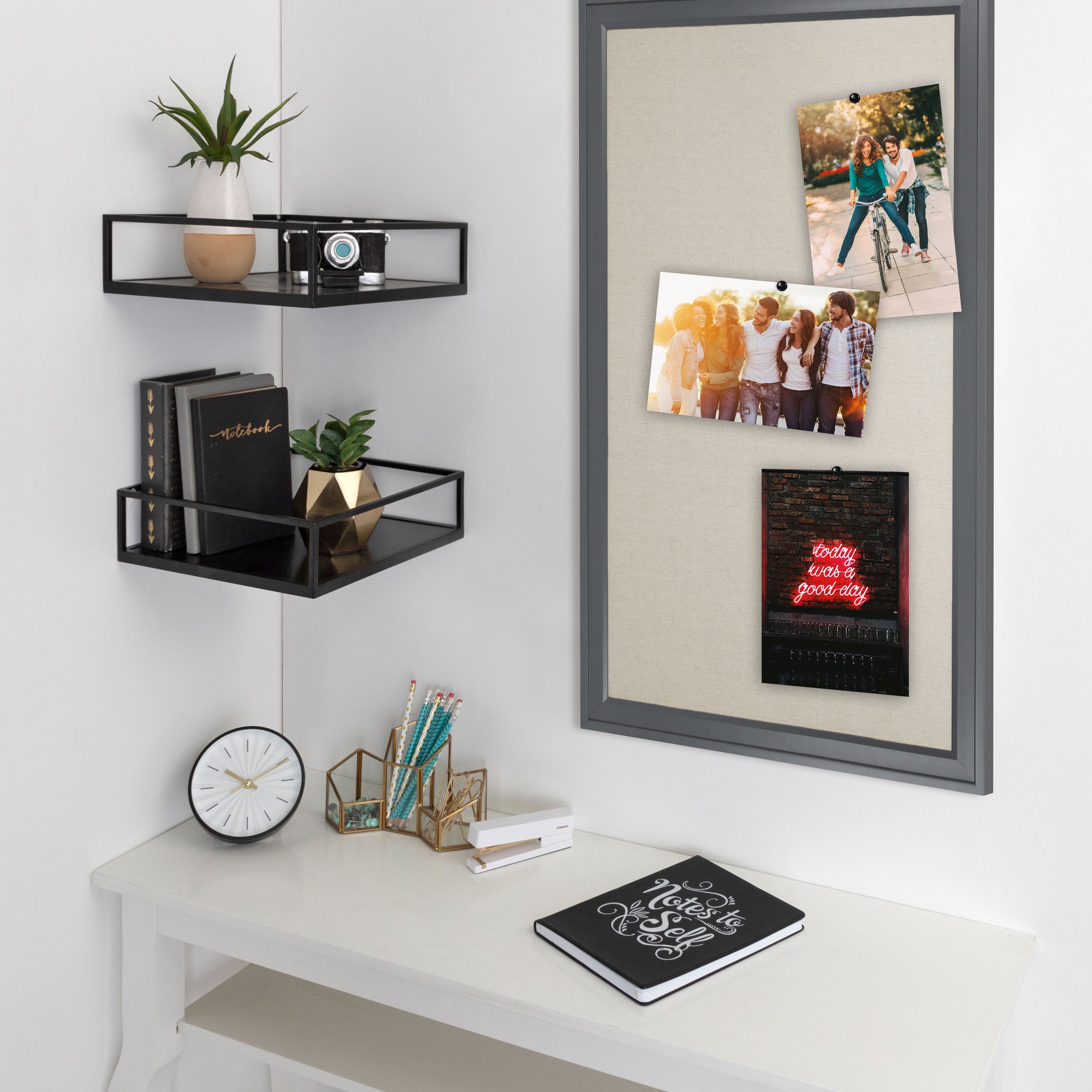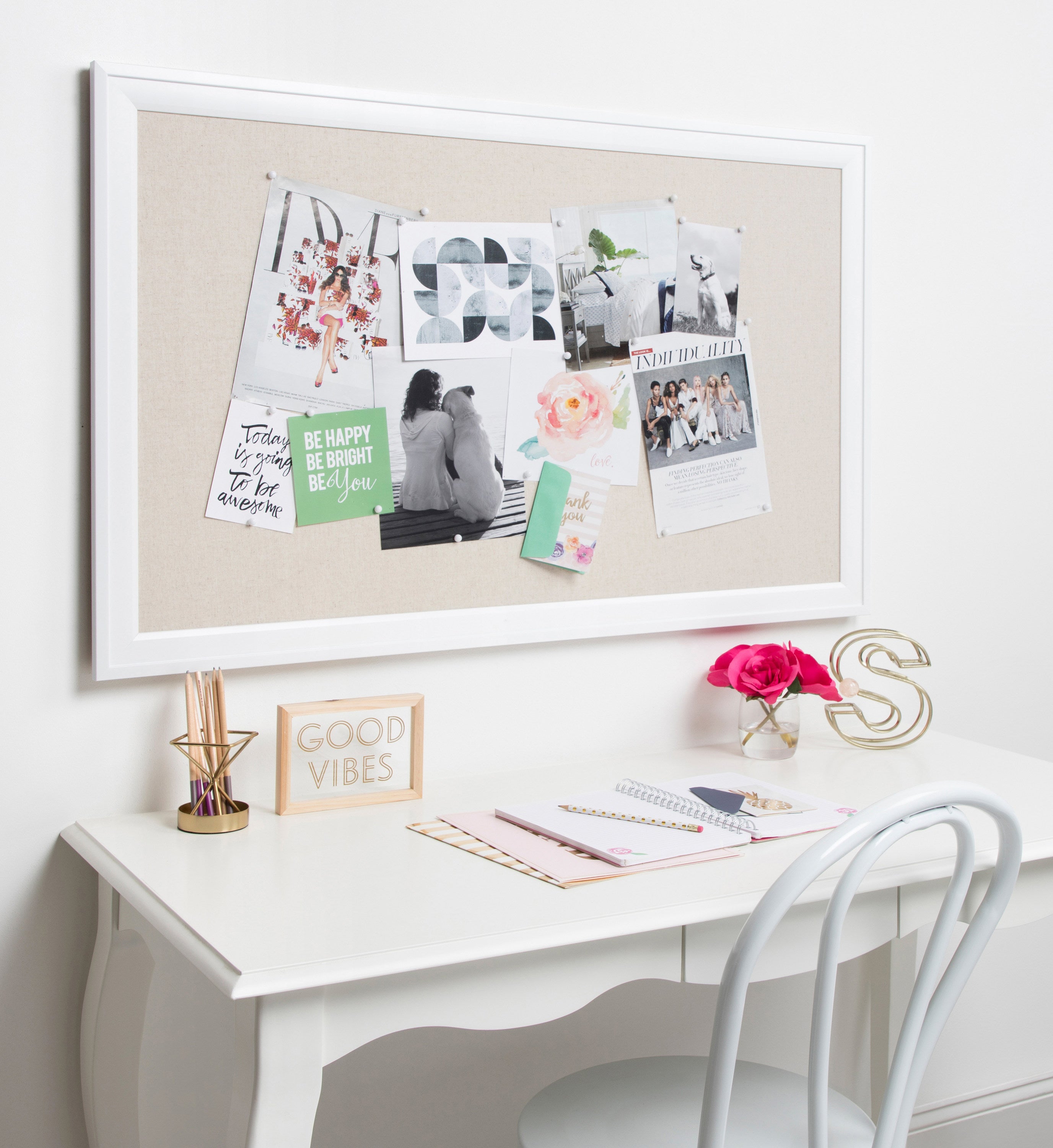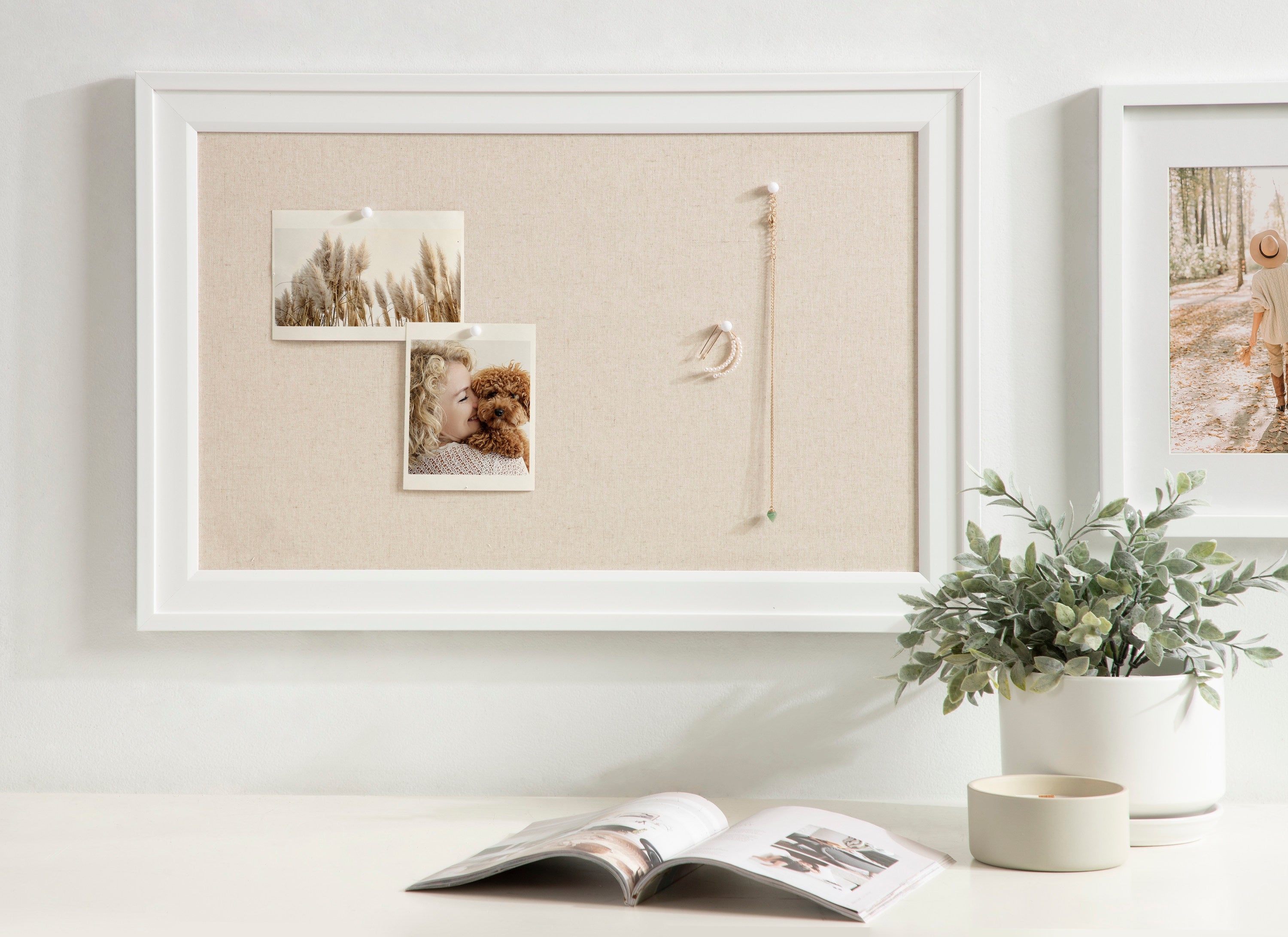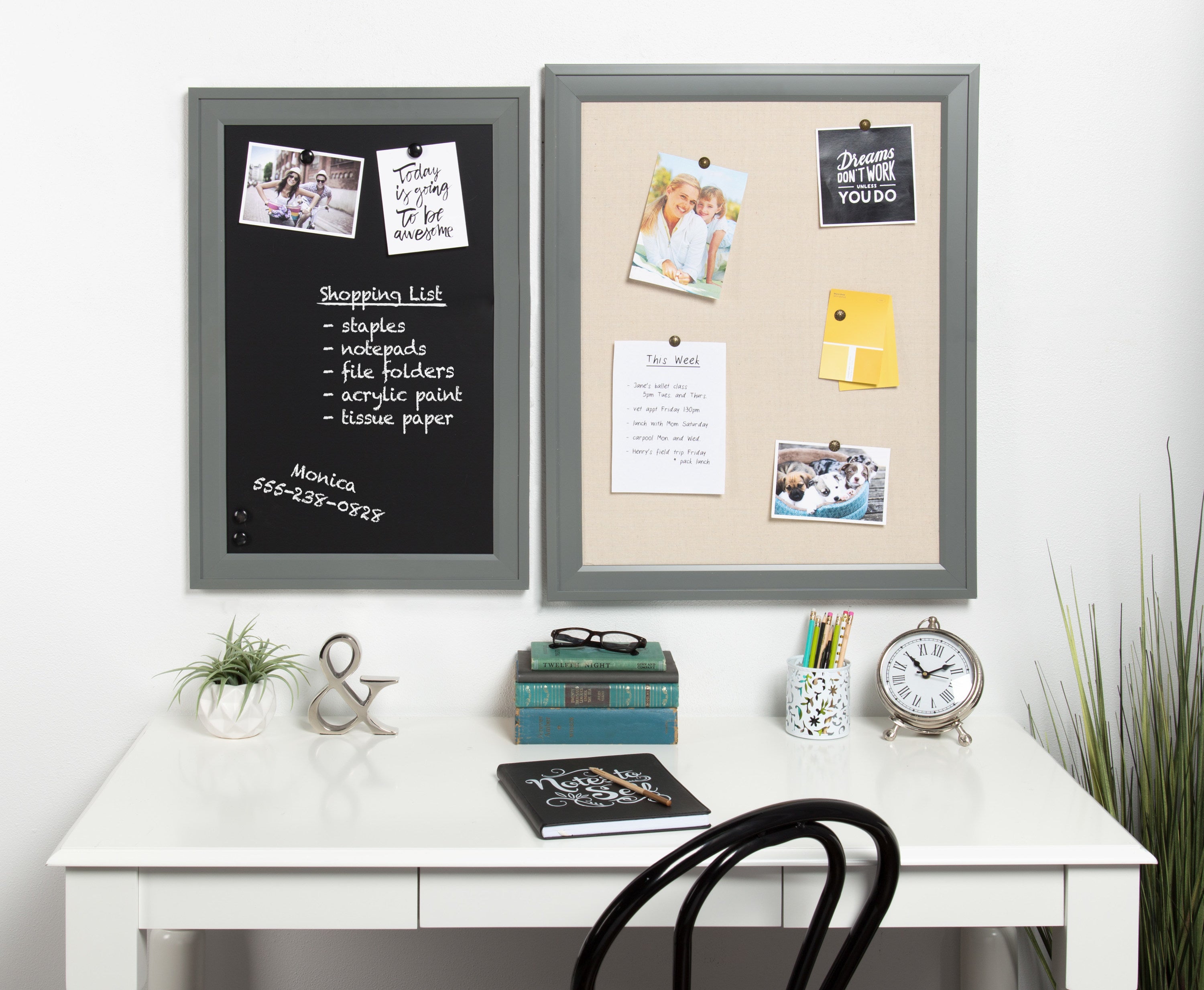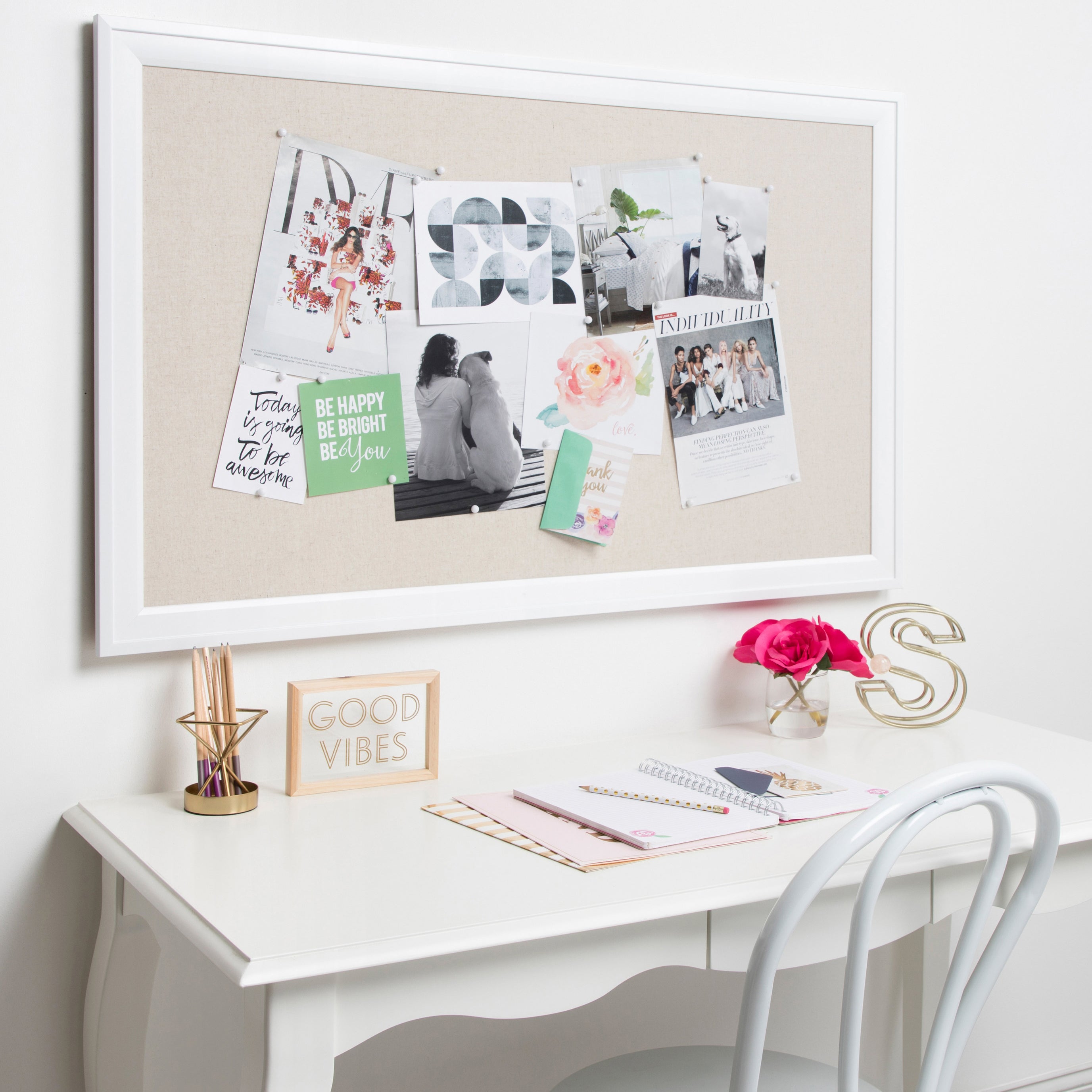 A transitional style frame surrounds the sturdy linen fabric pinboard to create home or office organization that's as decorative as it is functional. It's the wall-mounted memo board you didn't know you needed! With the casual look and the soft linen fabric padded pinboard area, it'll look fantastic in your entry way, kitchen, or home office.