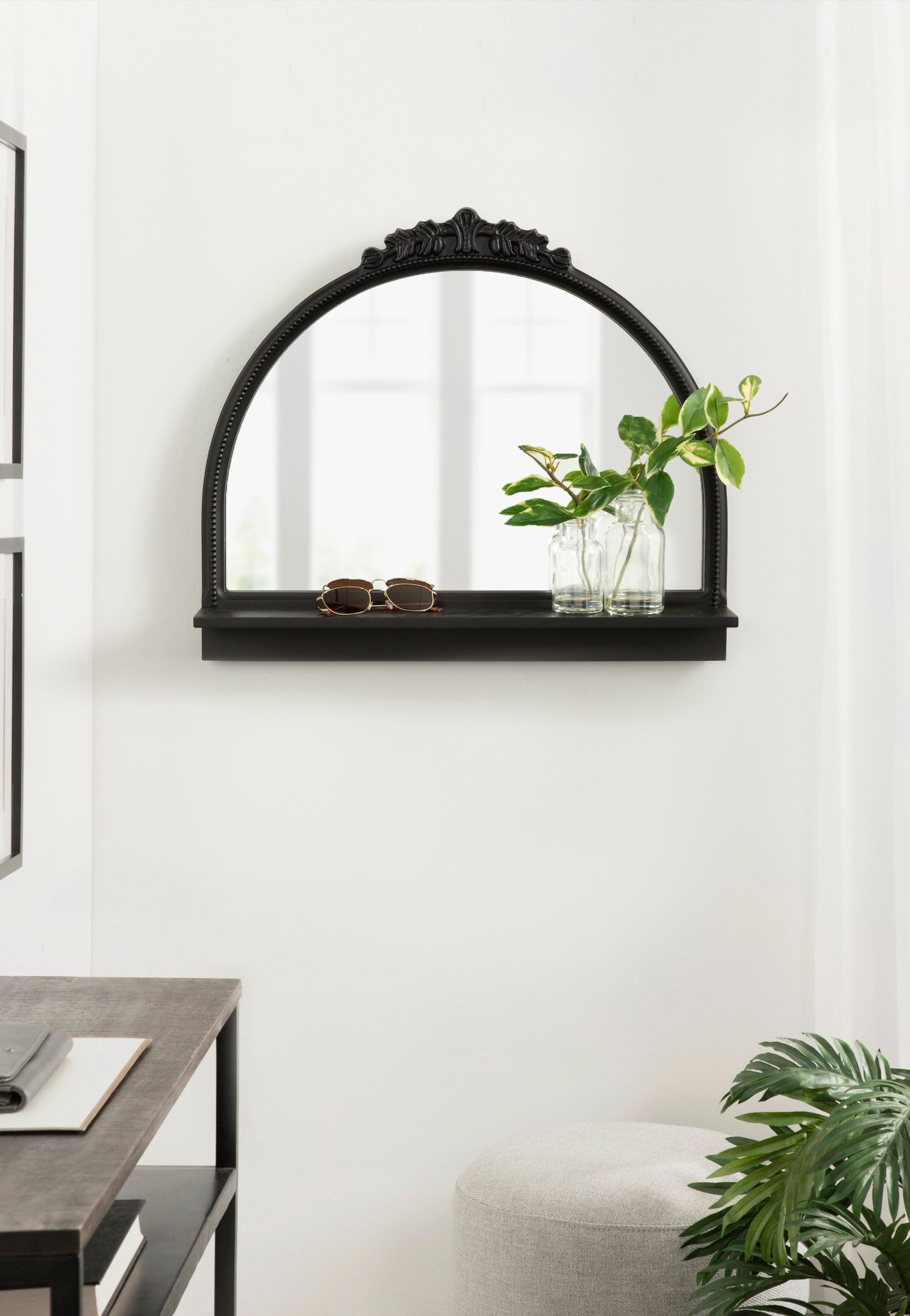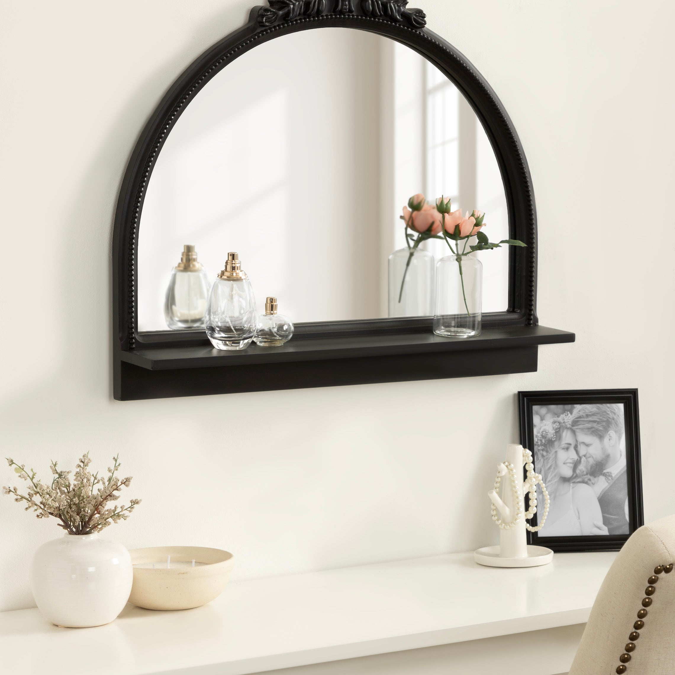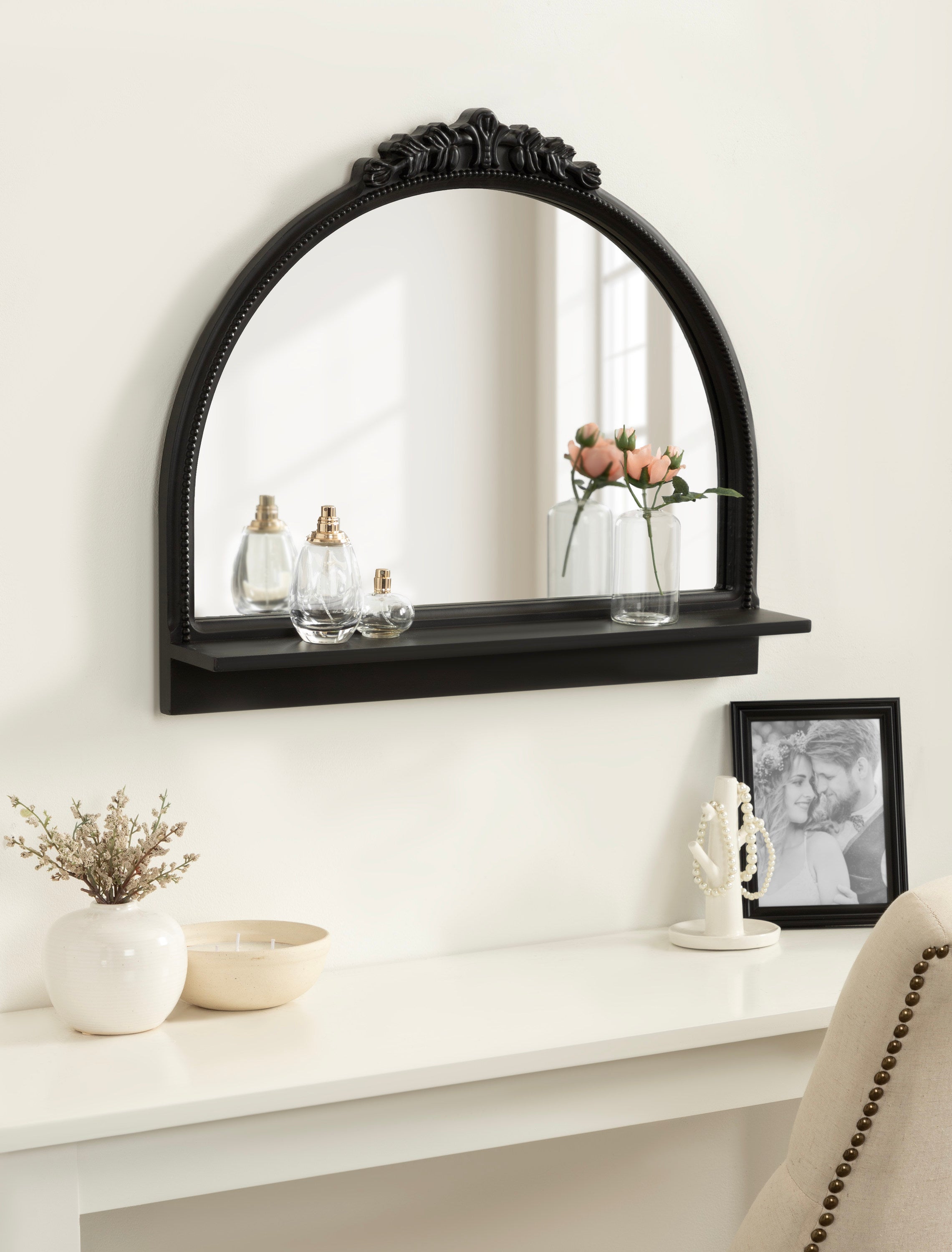 The Dellona wall mirror is here to bring a brilliant and decadent accent to your vintage home decor. This wall mirror features a baroque-inspired design, with an ornate crown and beaded detailing down its beautiful frame. It also boasts a useful shelf for either display or storage possibilities. Display the glamorous Dellona mirror as a bedroom dresser mirror or a decorative focal point amongst your living room, entryway, or bathroom decor.