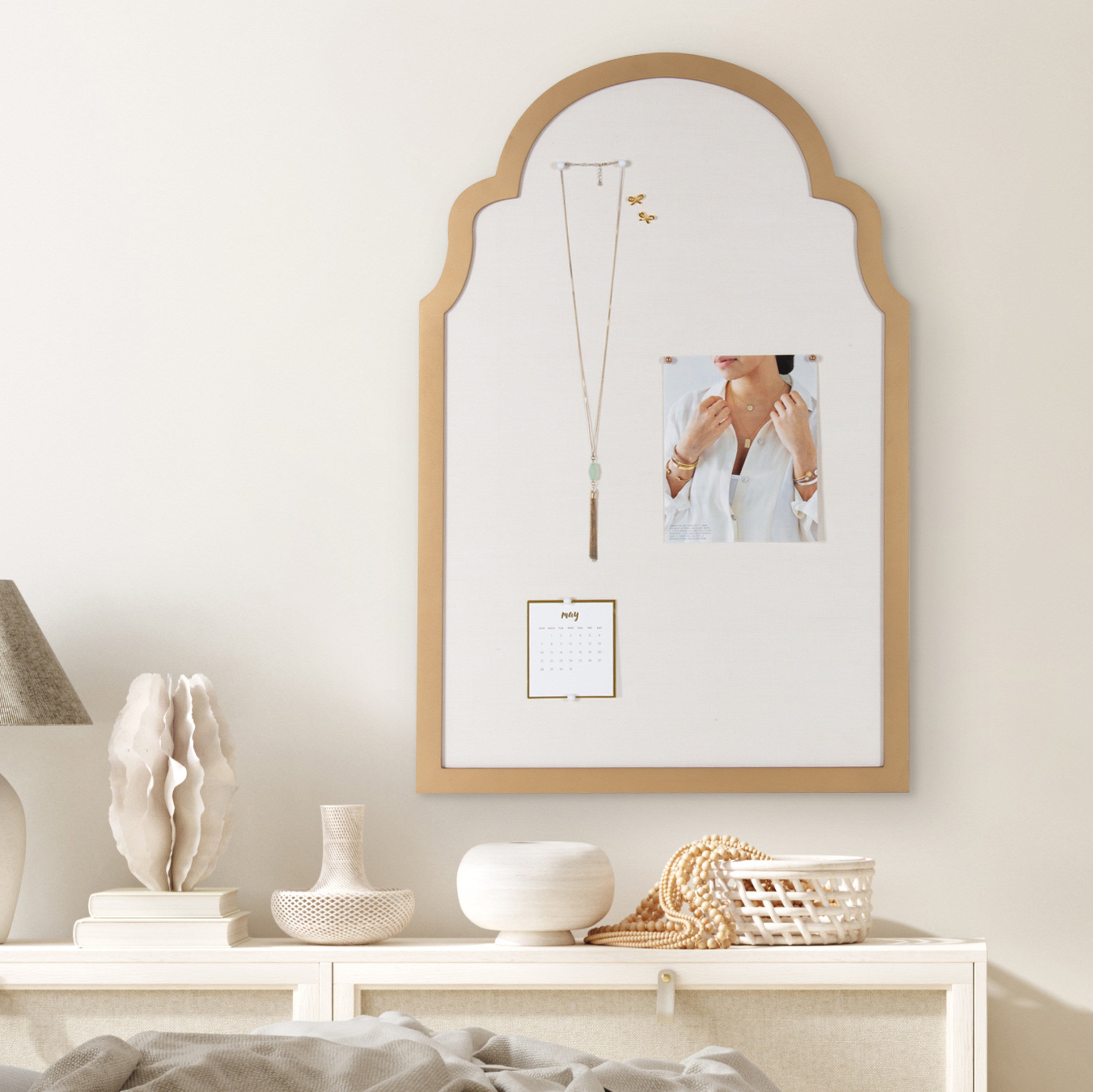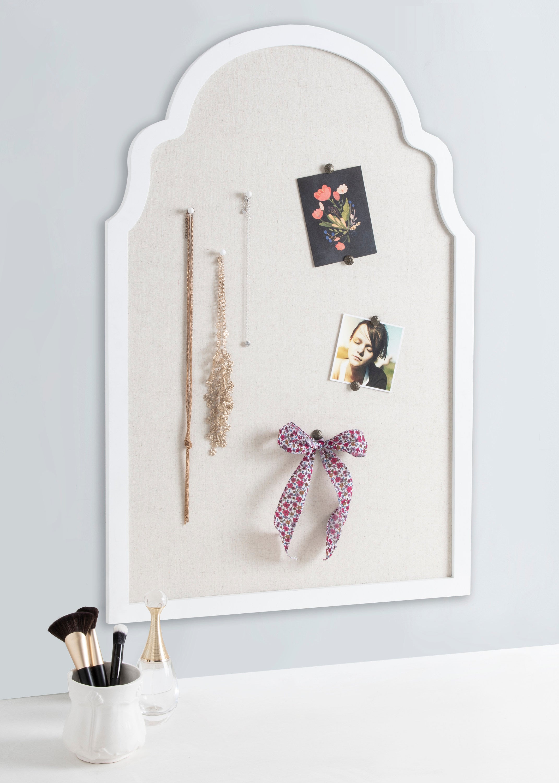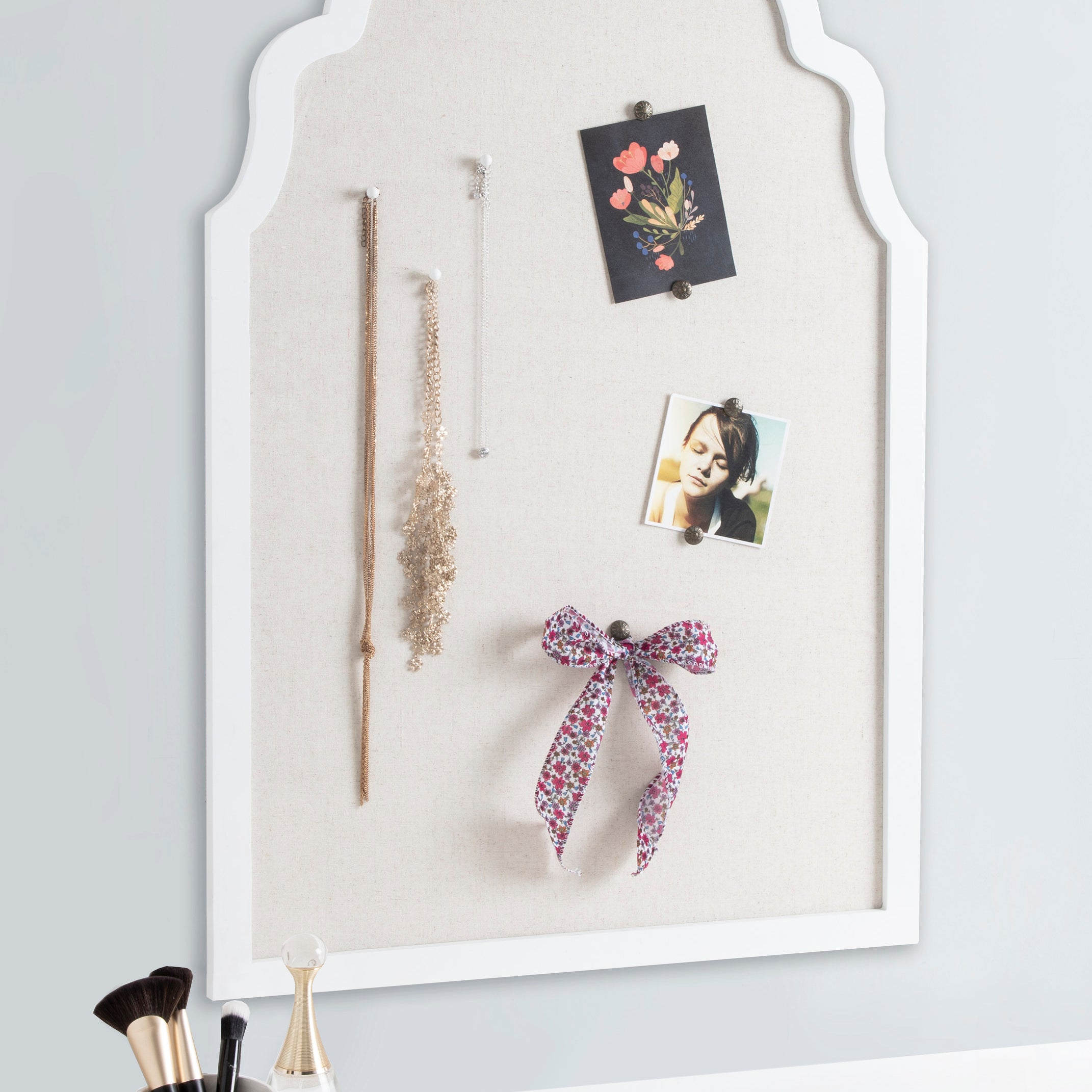 The Holbrook pinboard brings a lovely vintage aesthetic to your home organization. This sophisticated, elegant pinboard features a Moroccan-like scalloped shape with an attractive arched peak. Use the elegant fabric pinning surface for posting photos, holiday cards, invitations, and stellar report cards. It's a beautiful way to set up a family command center or create a vision or memory board.
