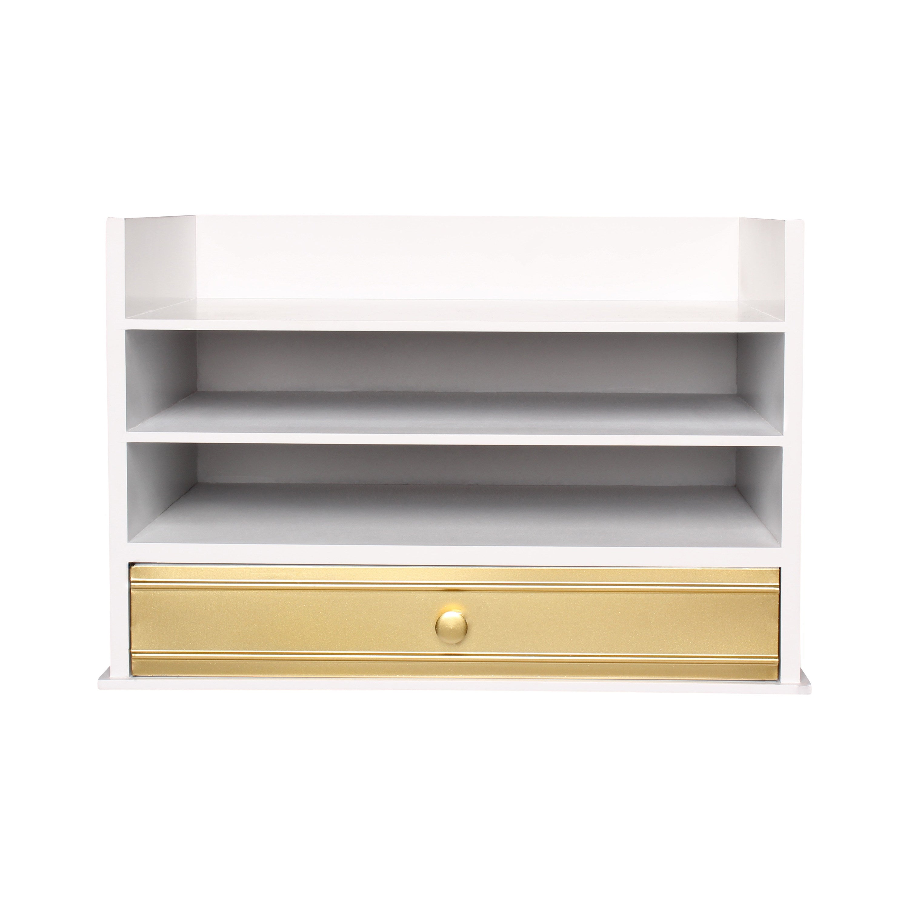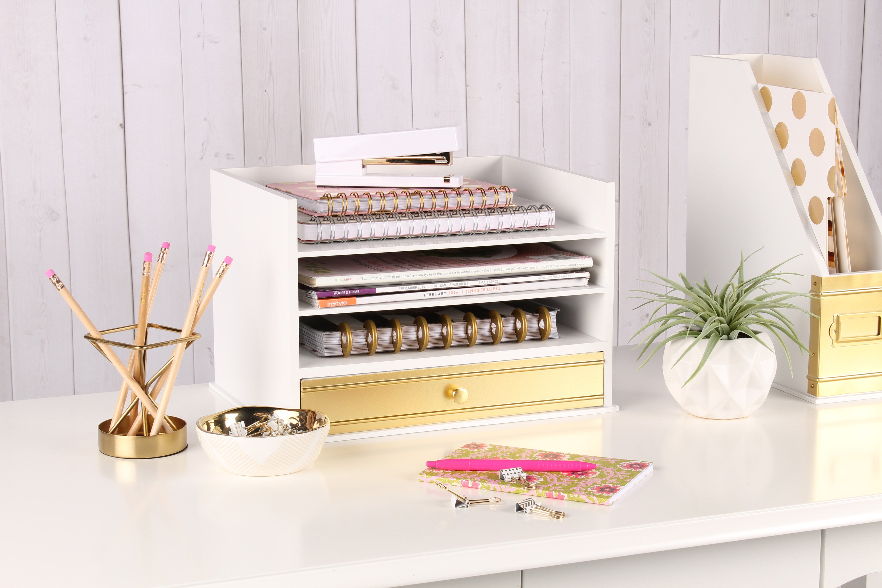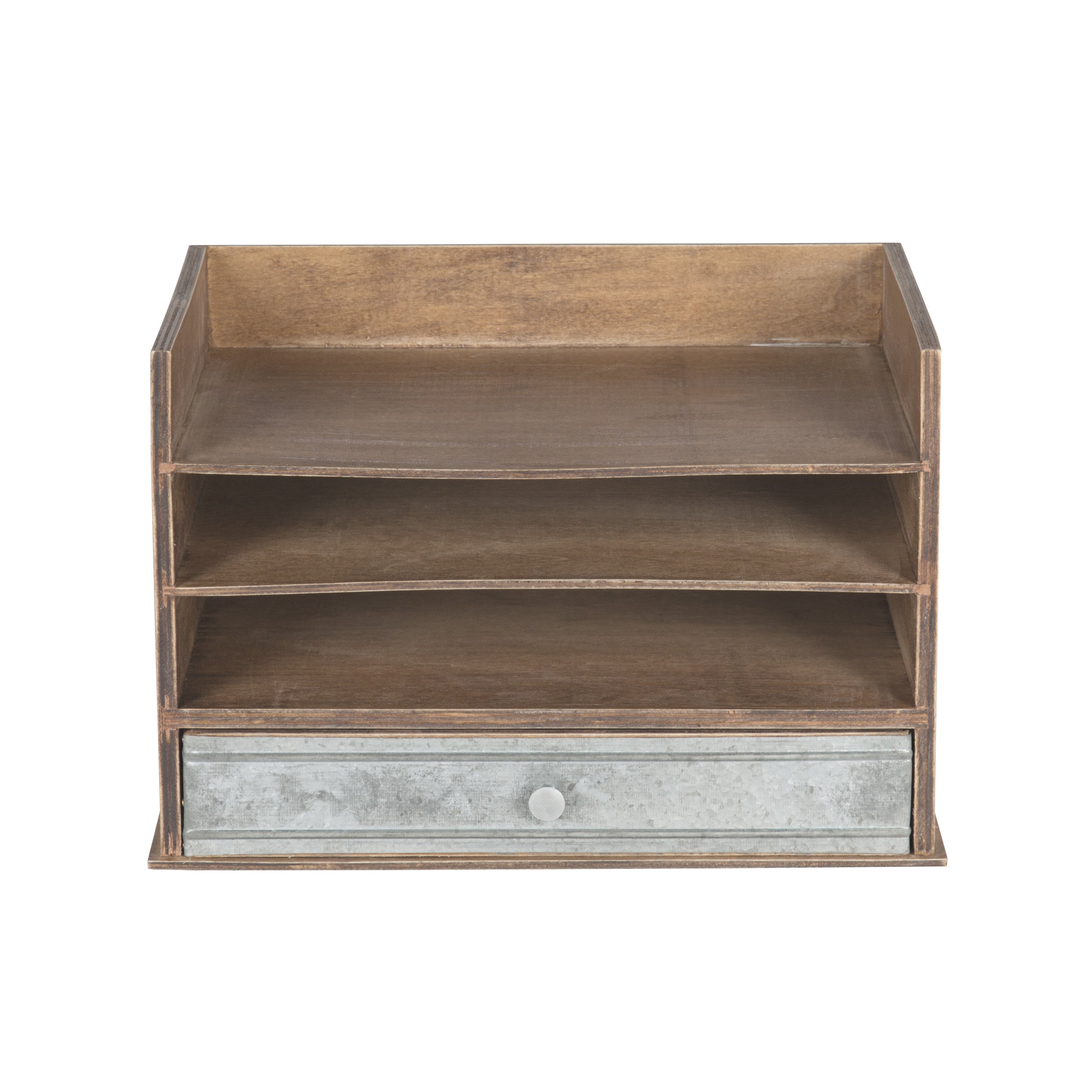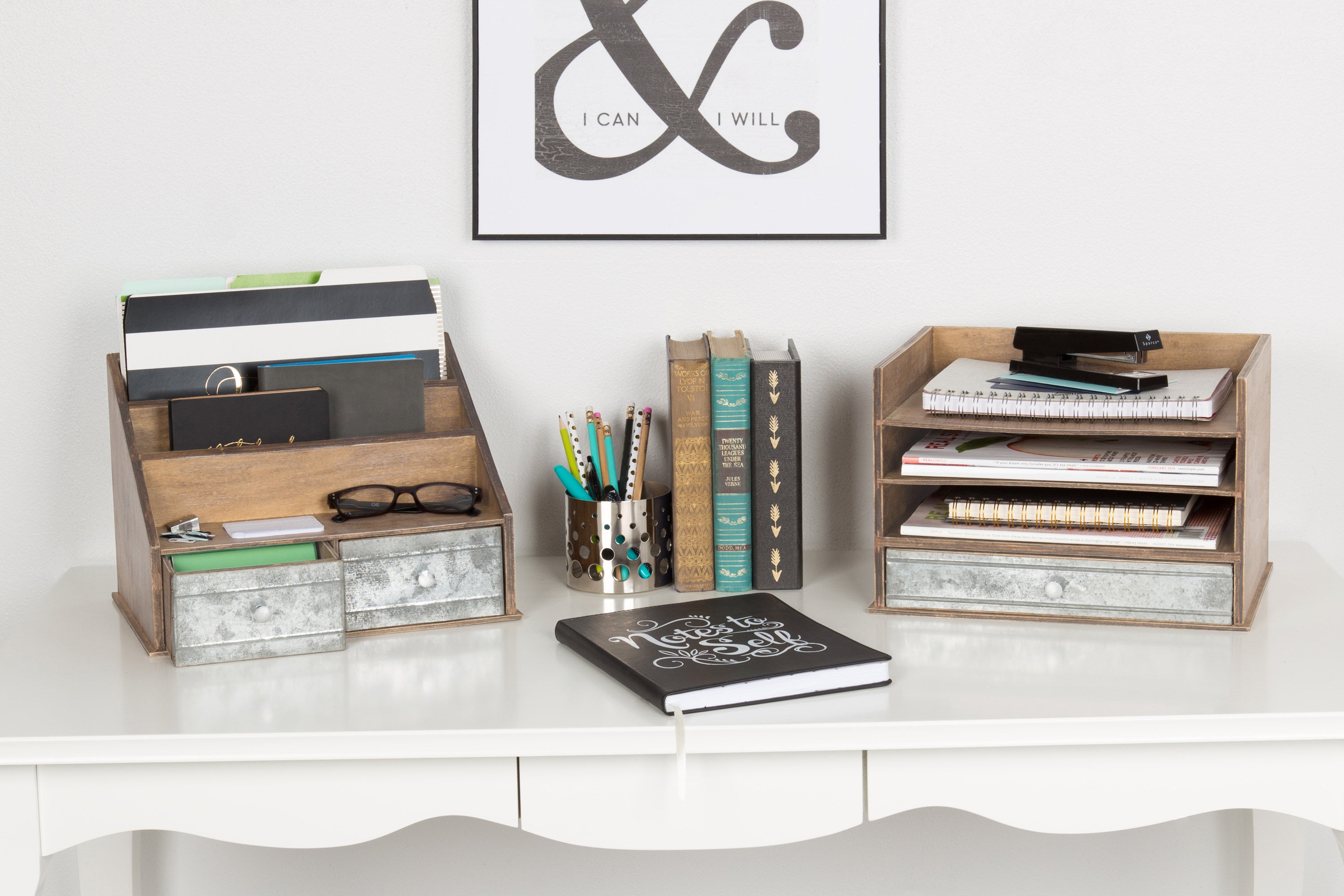Inspired by cool vintage style the look of the Industrious Desktop Letter Tray Organizer will keep papers and mail organized without taking up precious counter space. The letter trays create a stacked look with an open top tray for those items that you want to stack a bit higher. The bottom drawer pulls out smoothly and holds standard 8.5x11 paper.