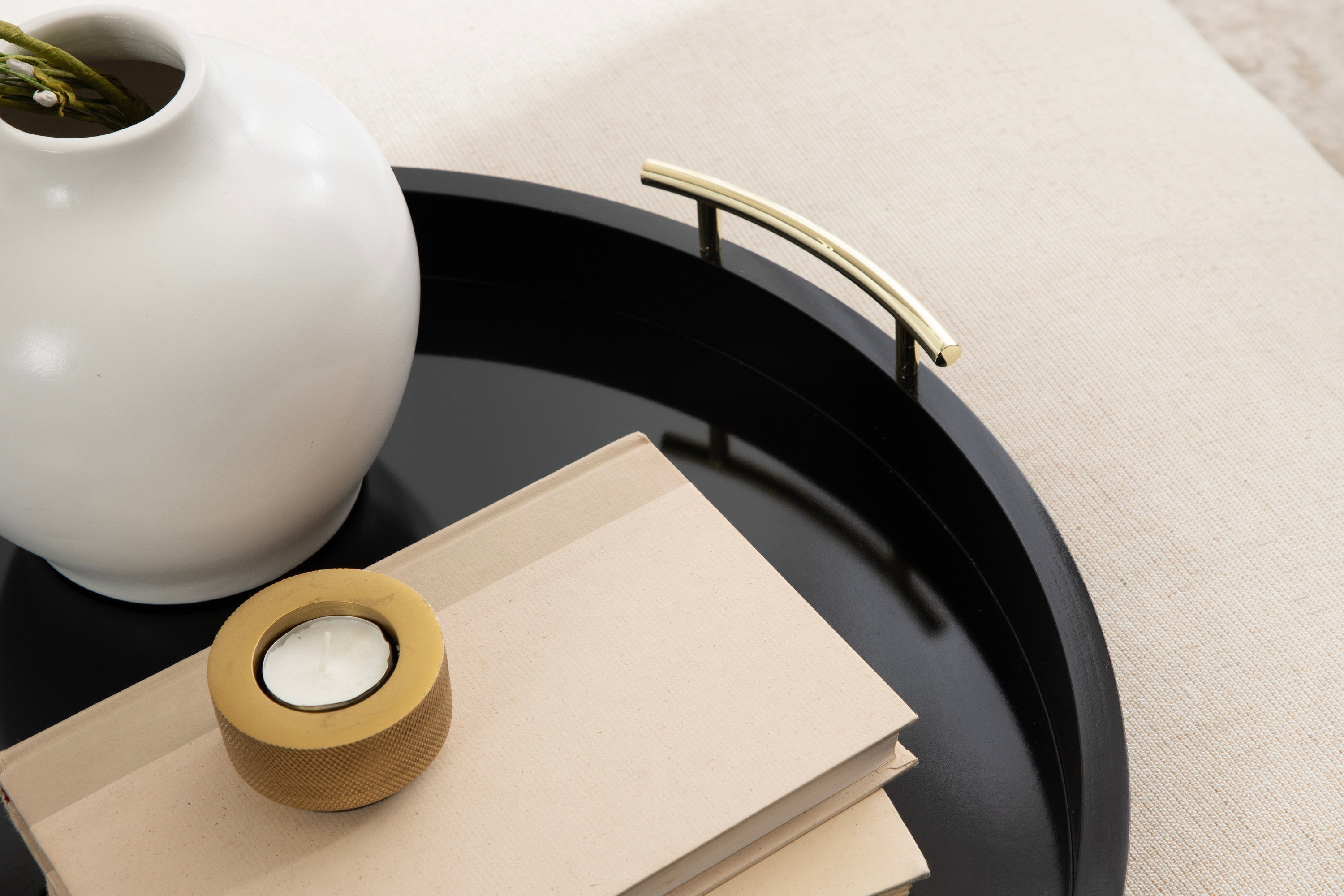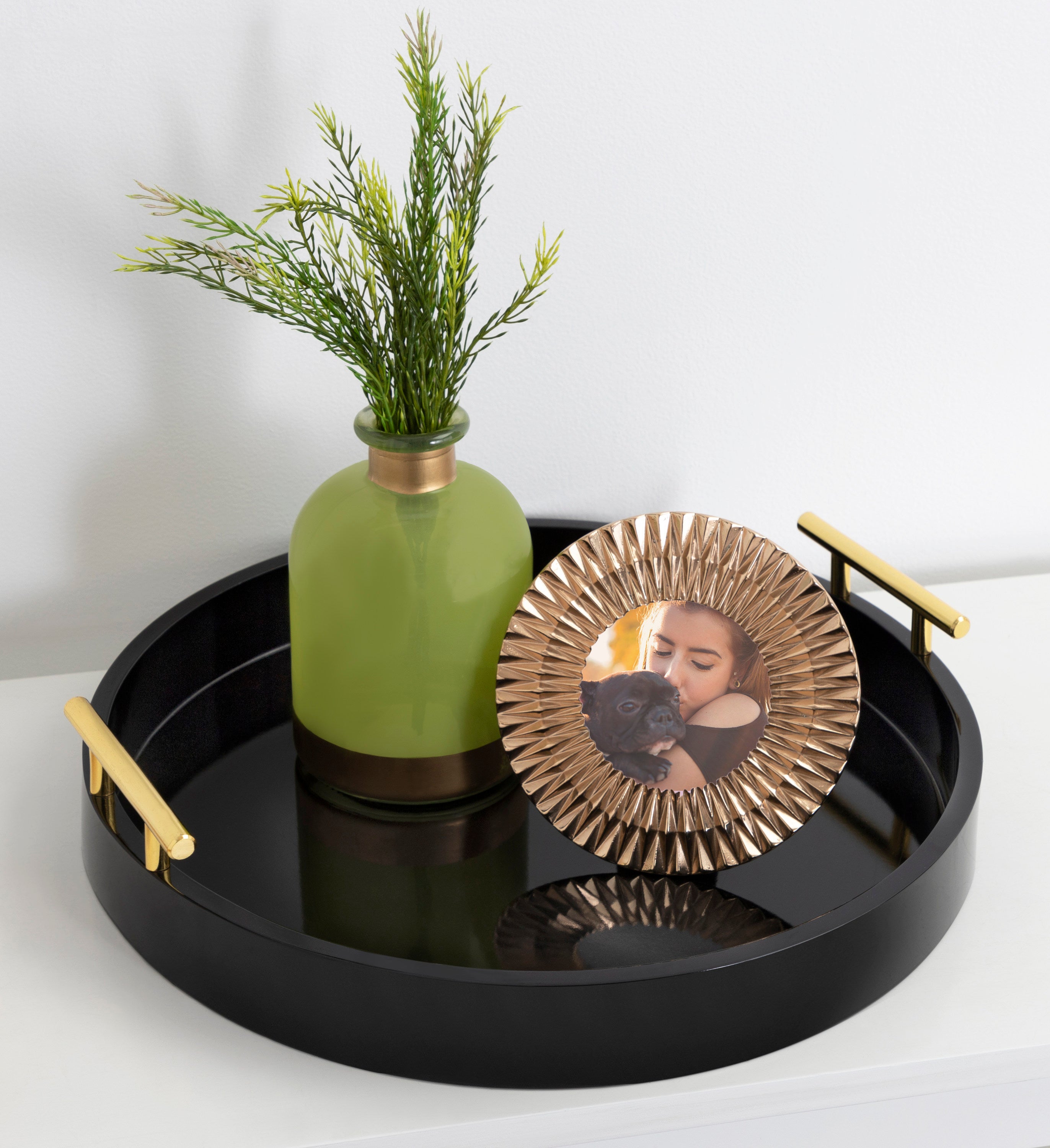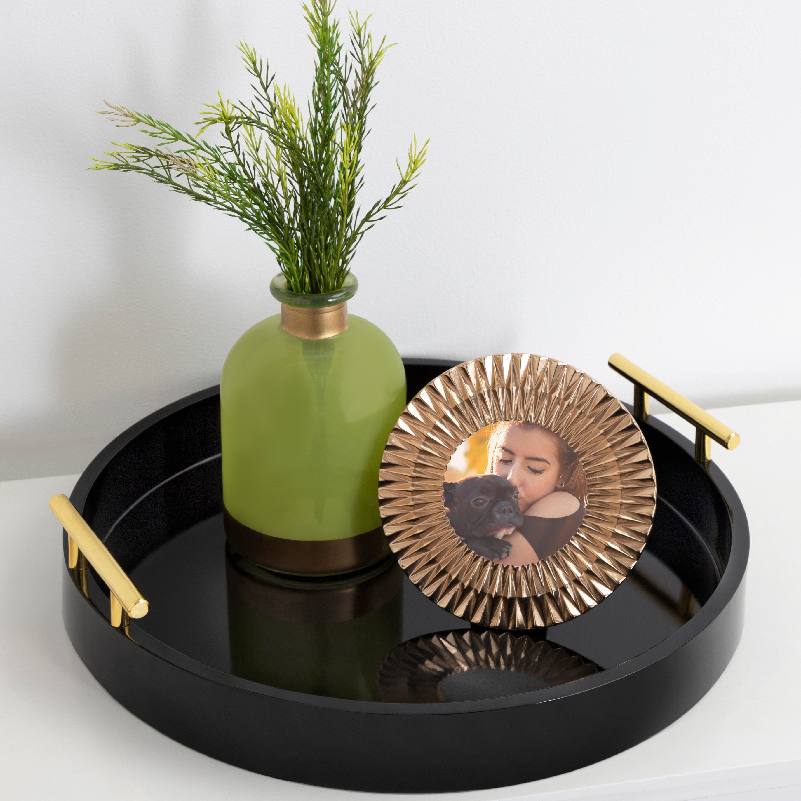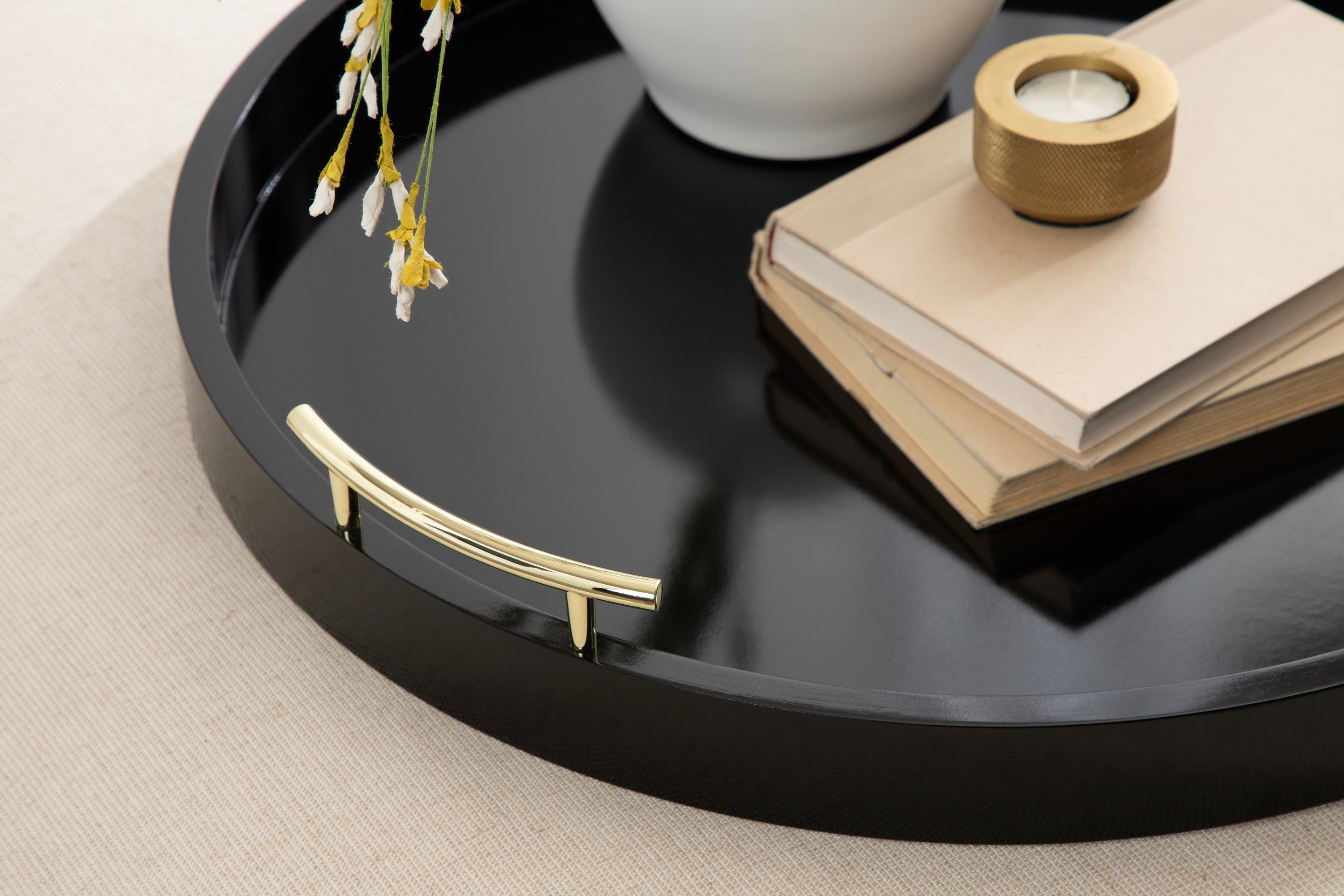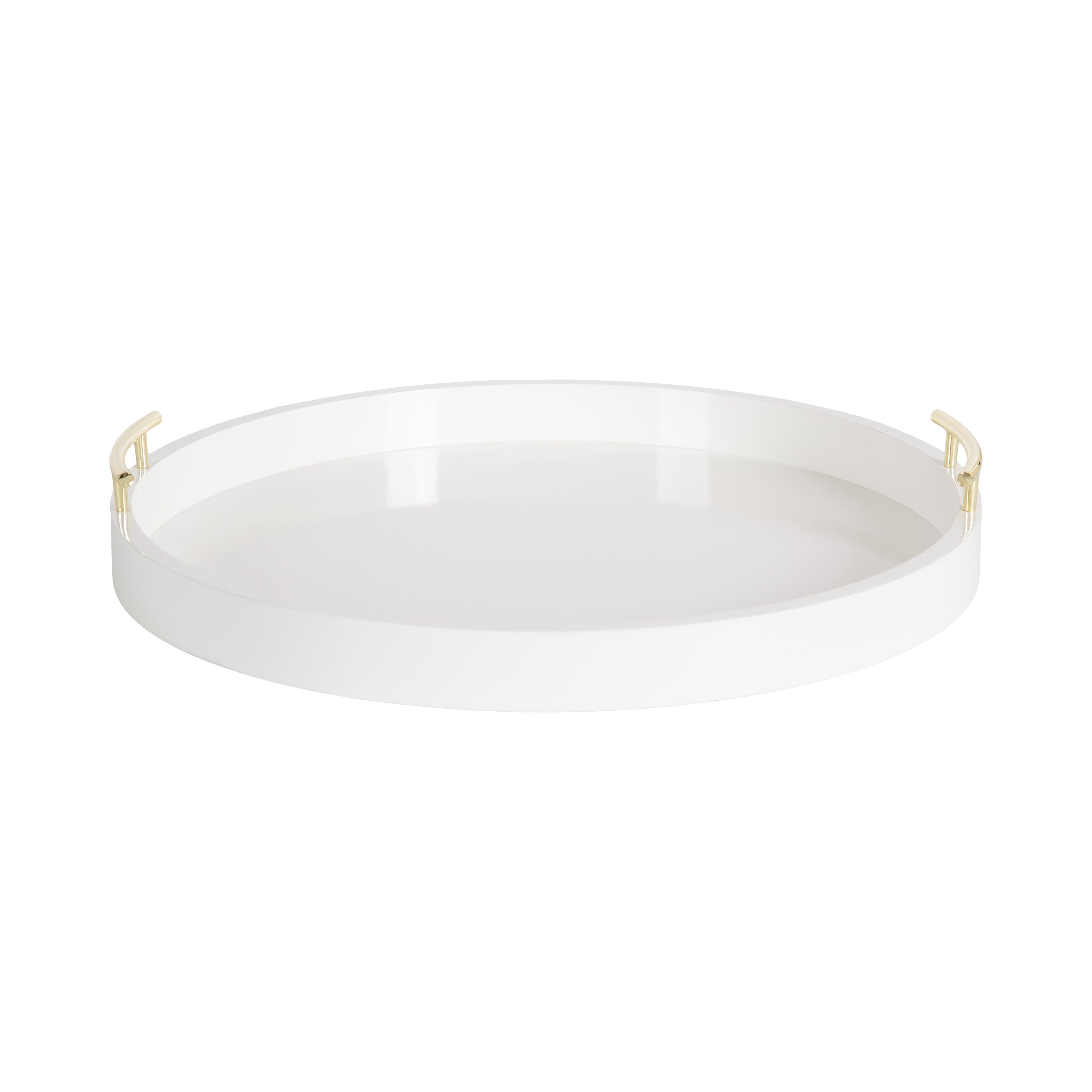 The modern round shape and metropolitan-chic style of the Lipton round tray creates an elegant accent for your home. The smaller surface size makes for a slightly demure presence but the lovely finish and metal handles splash out in all glam! Create a cosmopolitan vibe with this sophisticated accent for storage and display of keys, succulents, media remotes, books, and more!