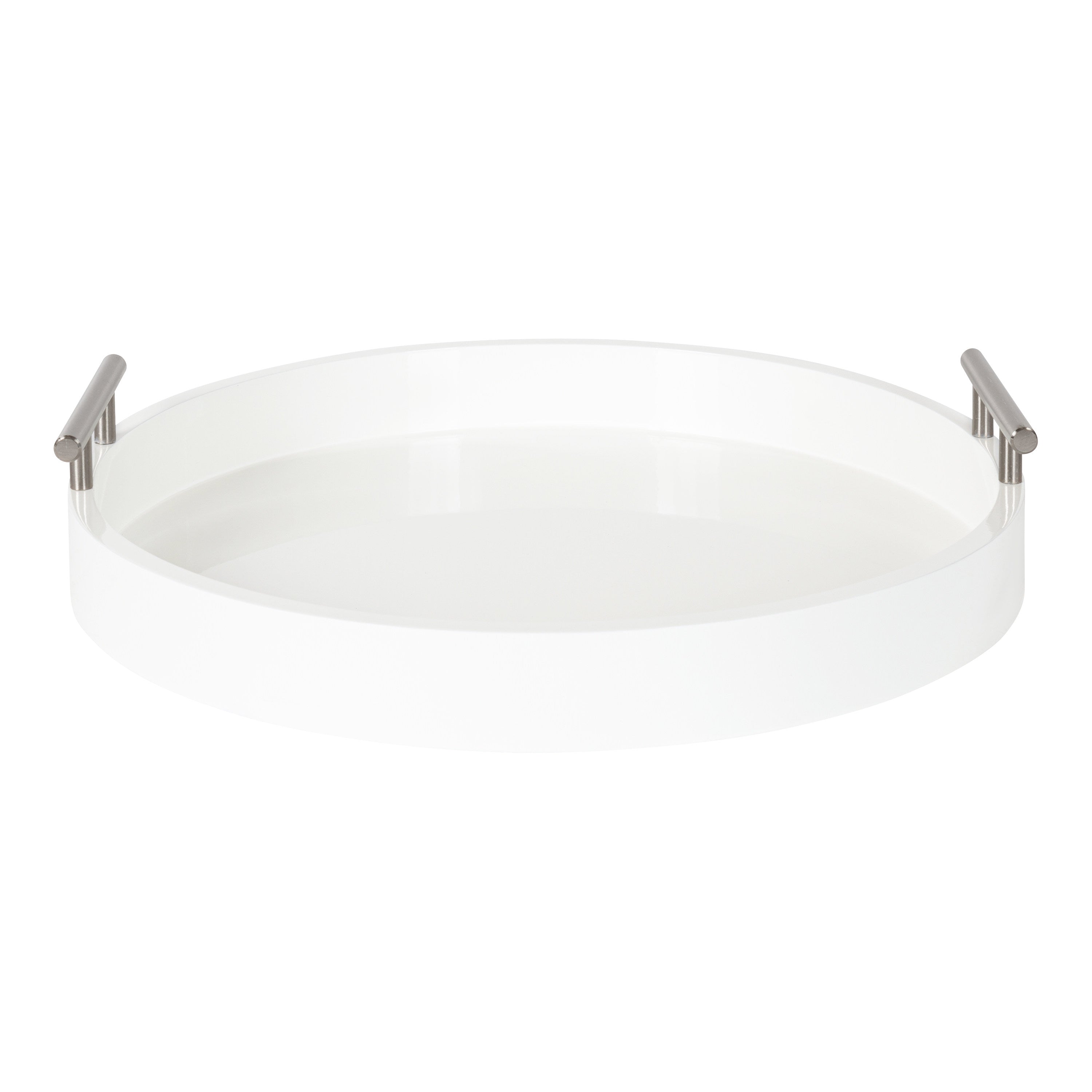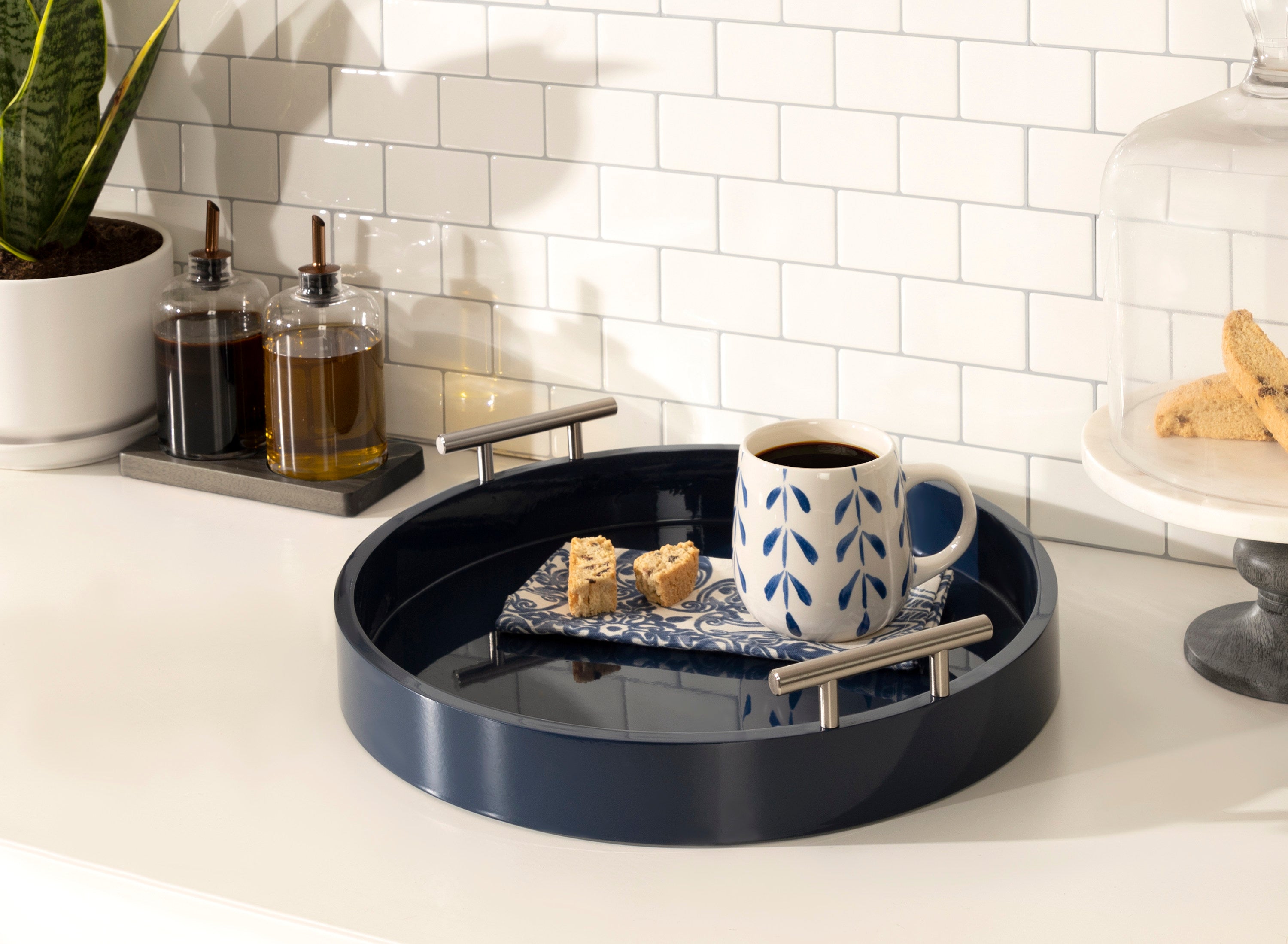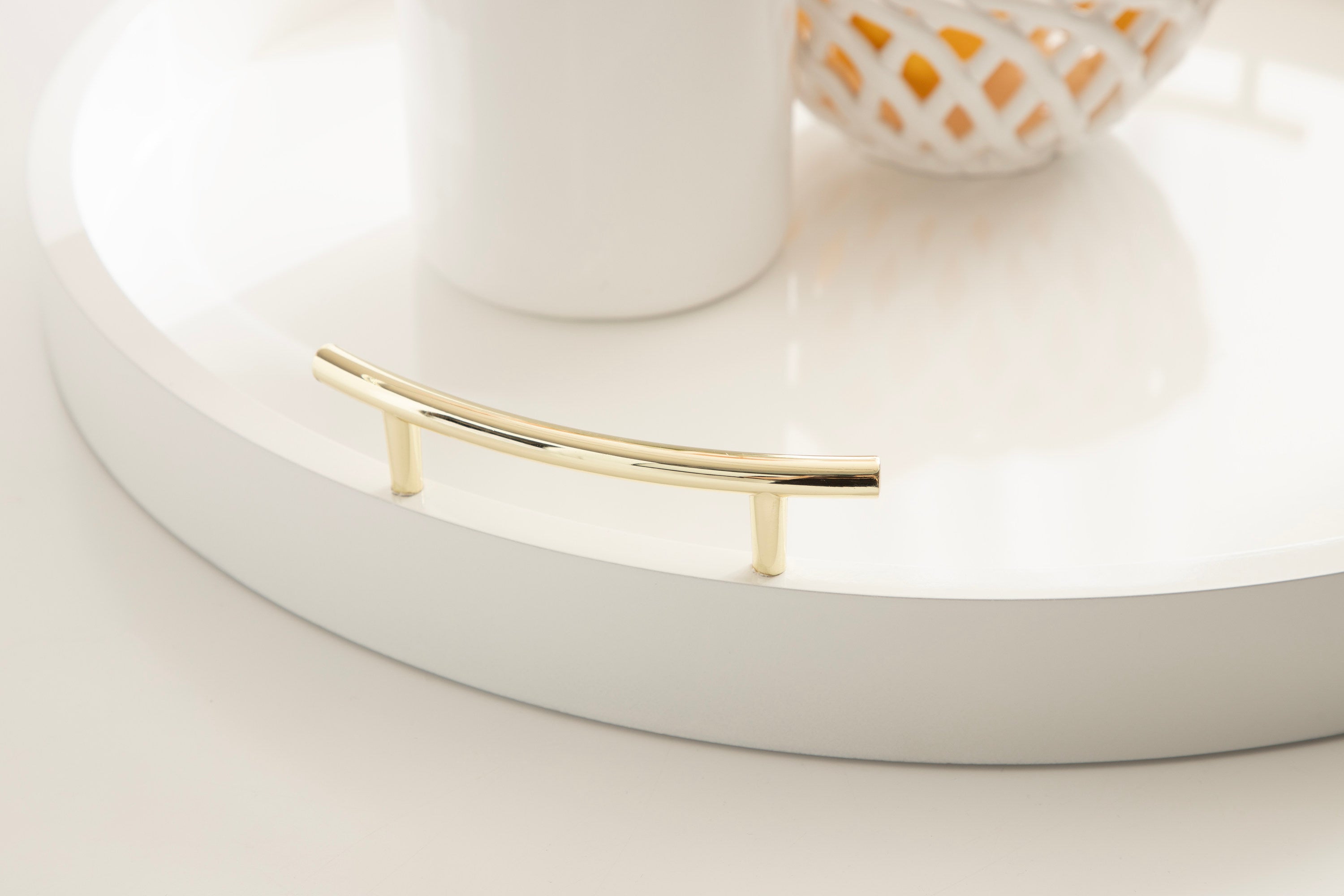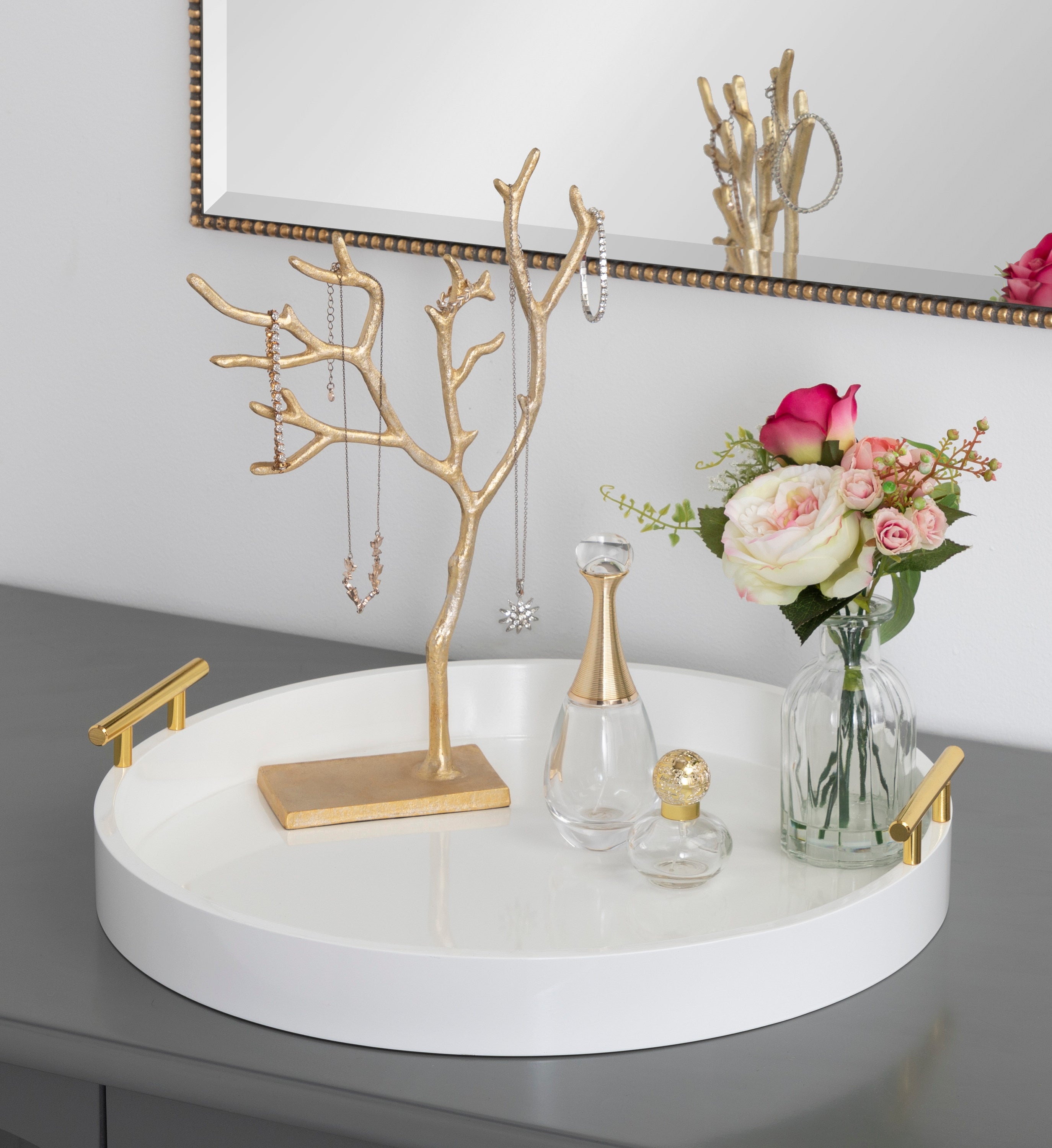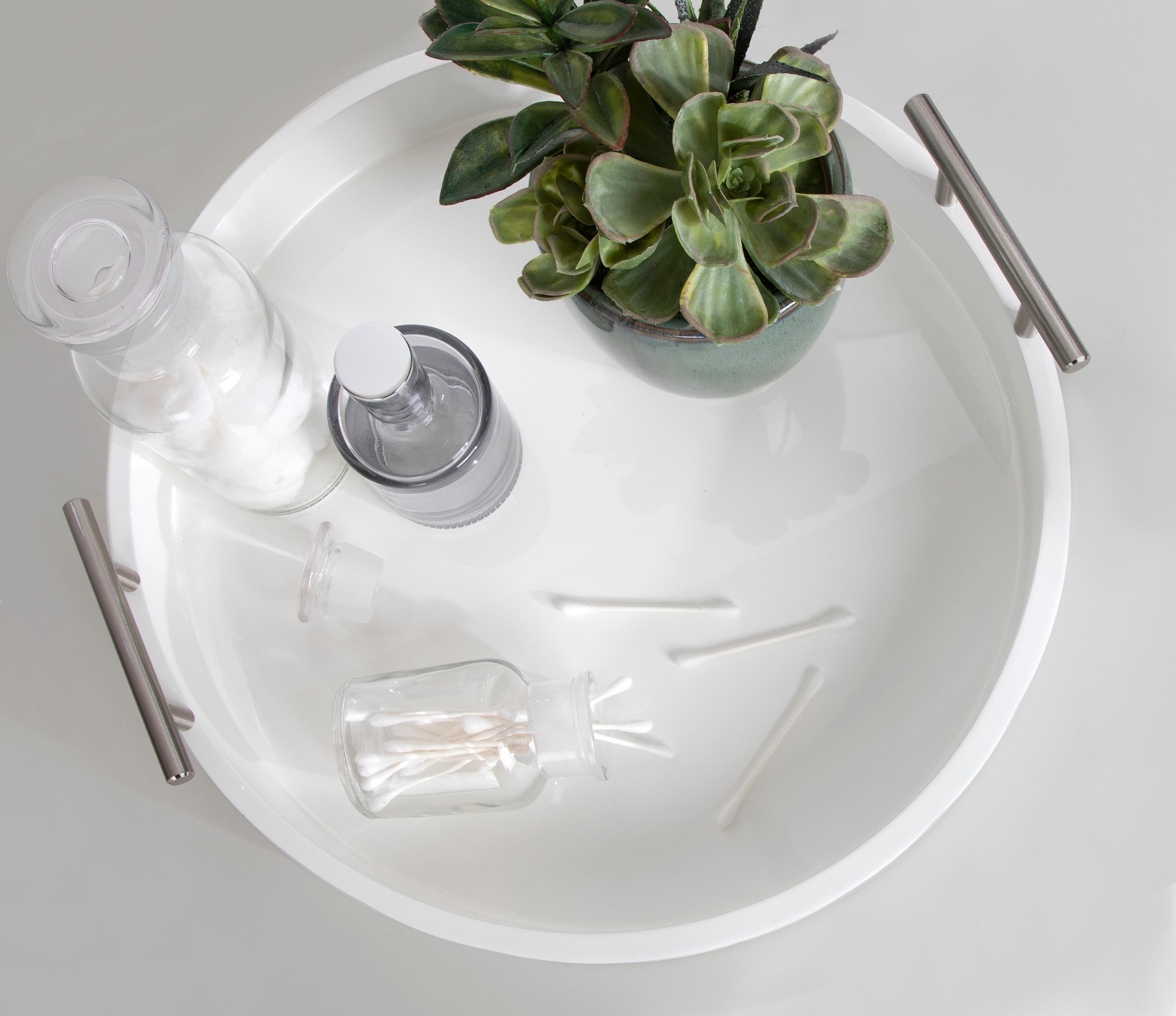 The modern round shape and metropolitan-chic style of the Lipton round tray creates an elegant accent for your home. The smaller surface size makes for a slightly demure presence but the lovely finish and metal handles splash out in all glam! Create a cosmopolitan vibe with this sophisticated accent for storage and display of keys, succulents, media remotes, books, and more!