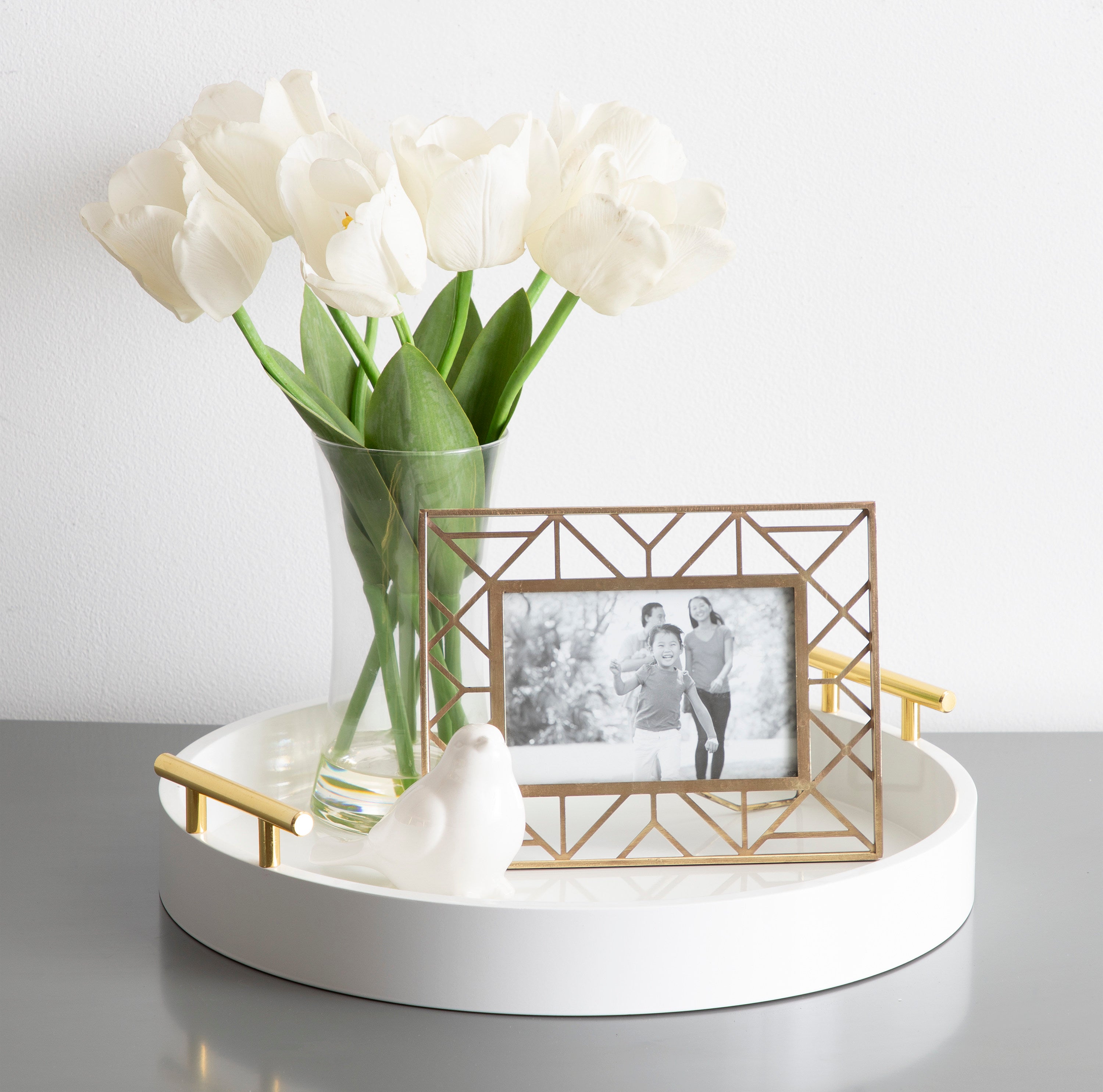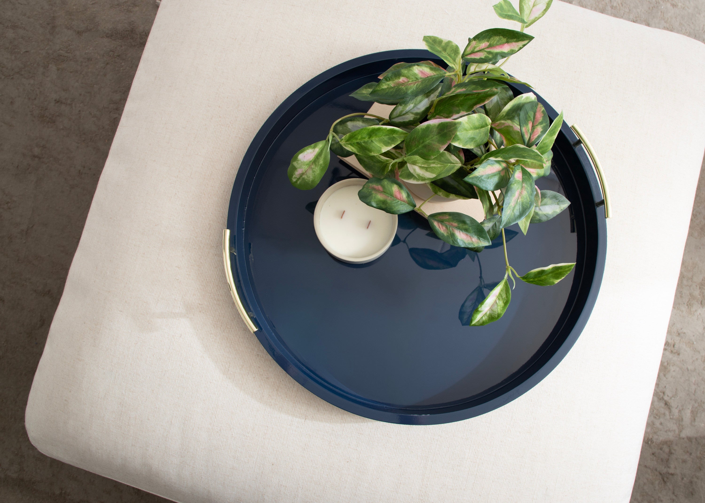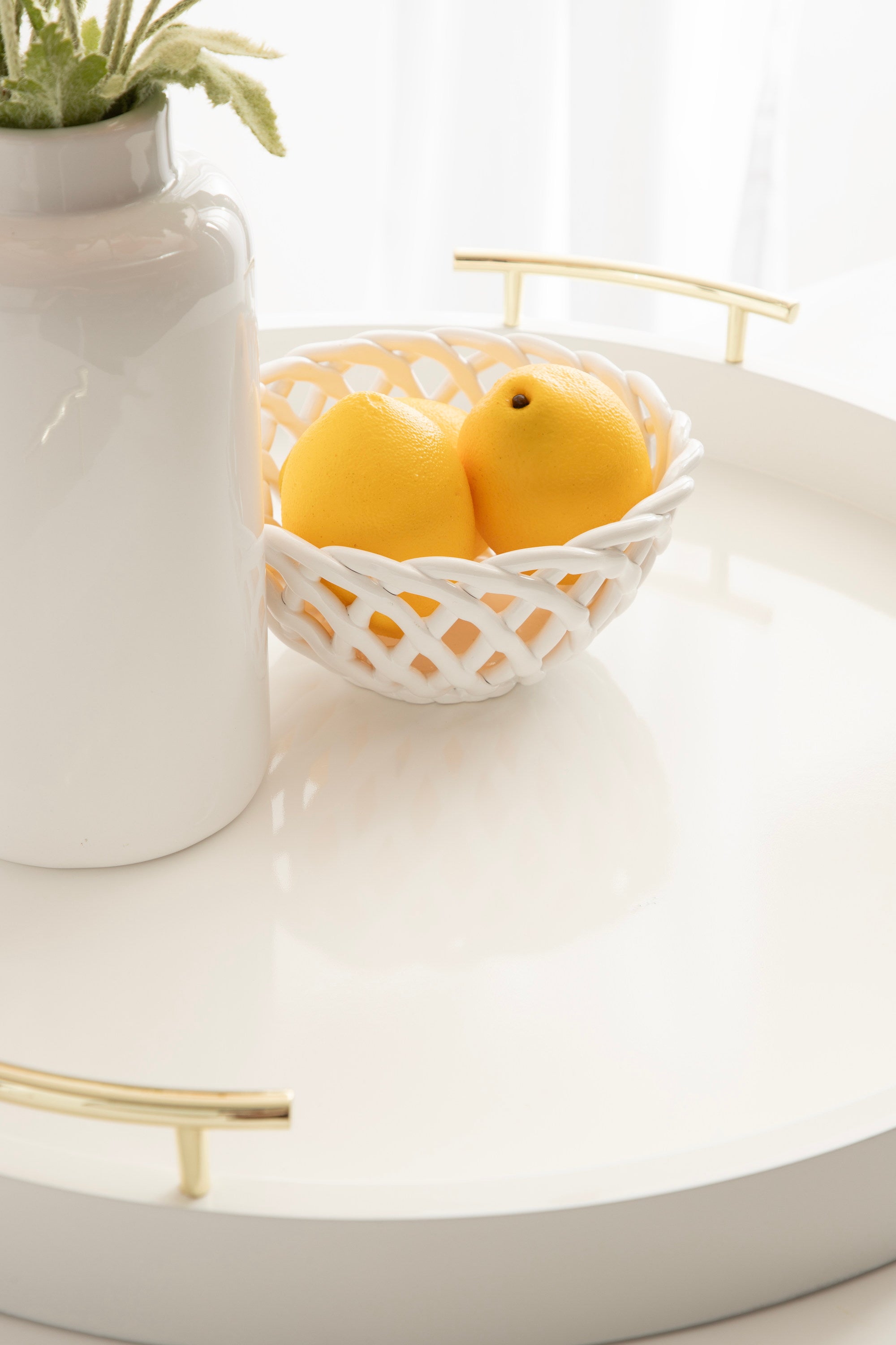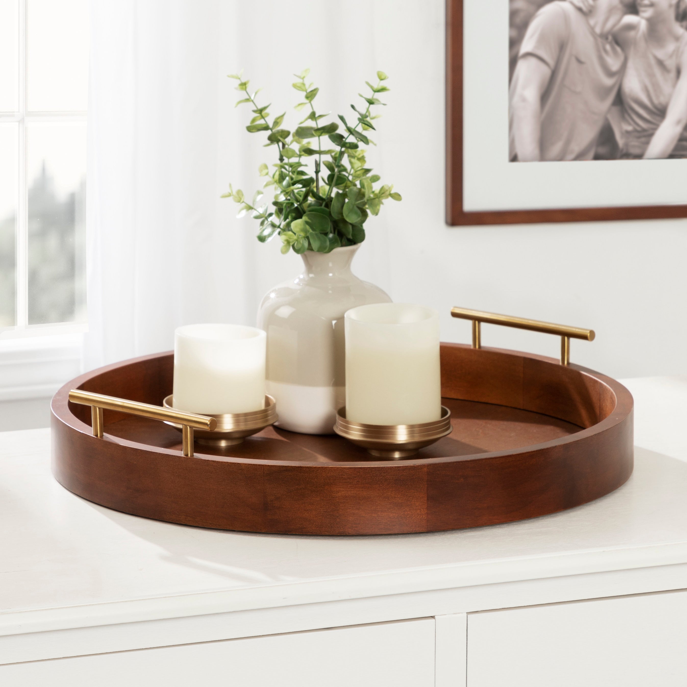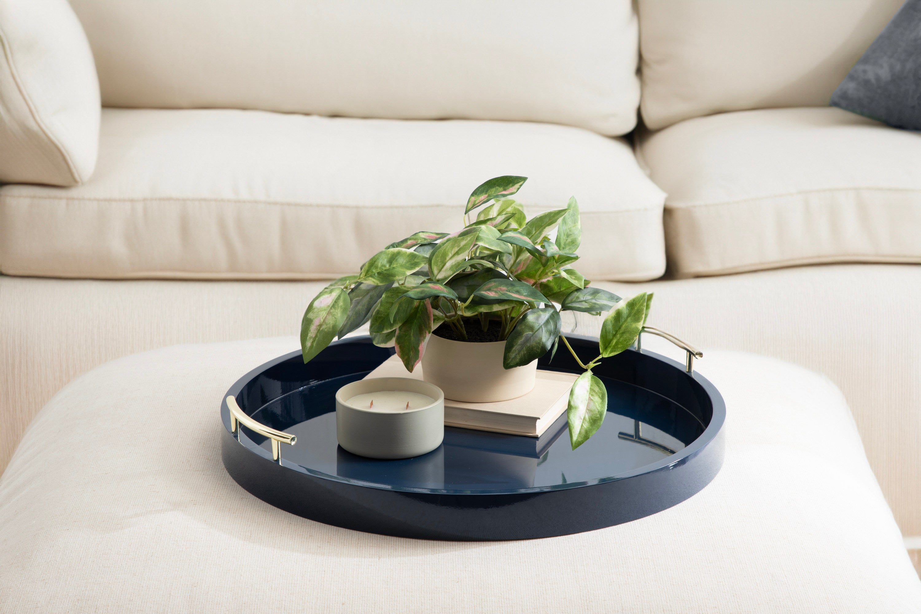 The modern round shape and metropolitan-chic style of the Lipton round tray creates an elegant accent for your home. The smaller surface size makes for a slightly demure presence but the lovely finish and metal handles splash out in all glam! Create a cosmopolitan vibe with this sophisticated accent for storage and display of keys, succulents, media remotes, books, and more!
