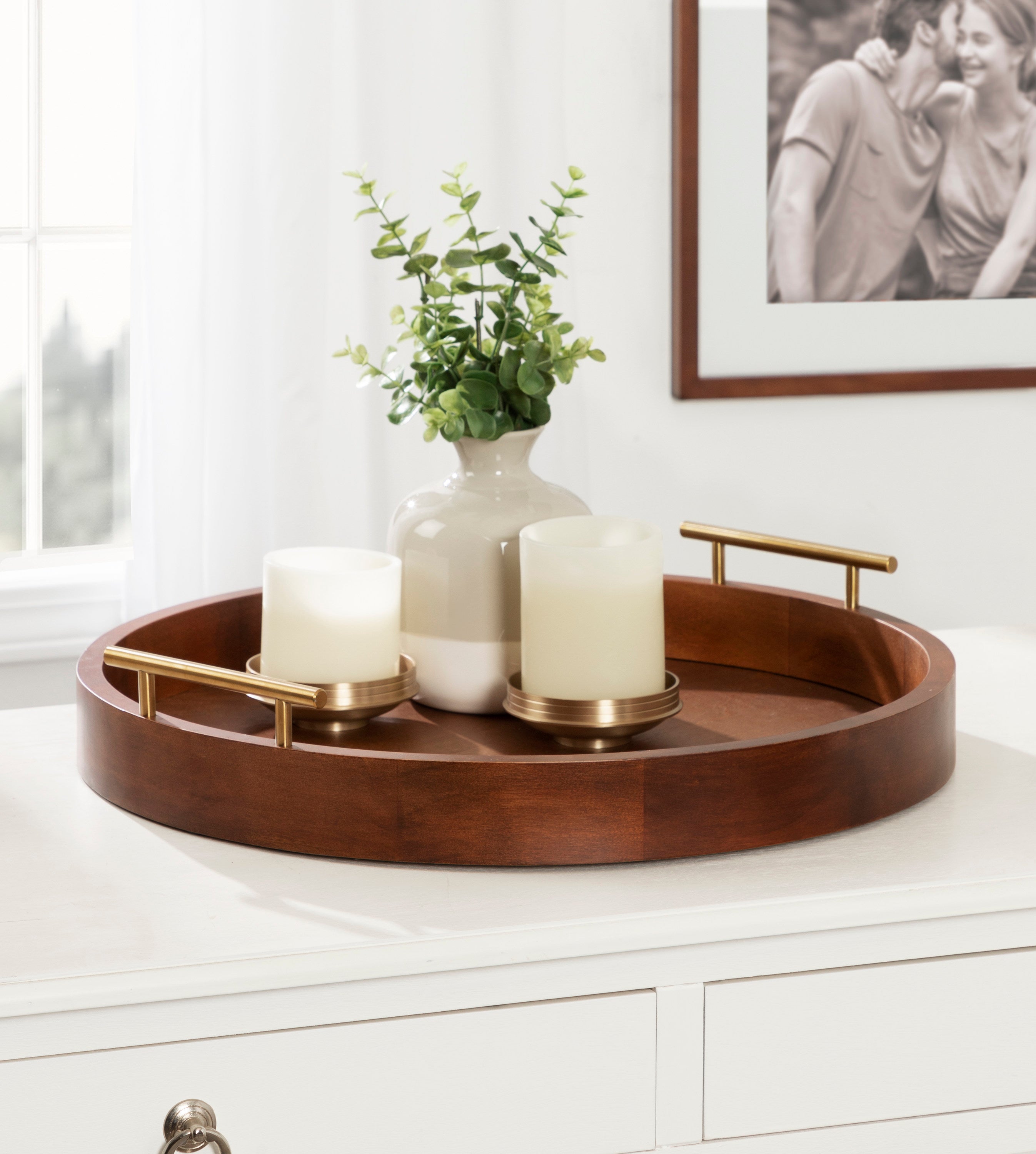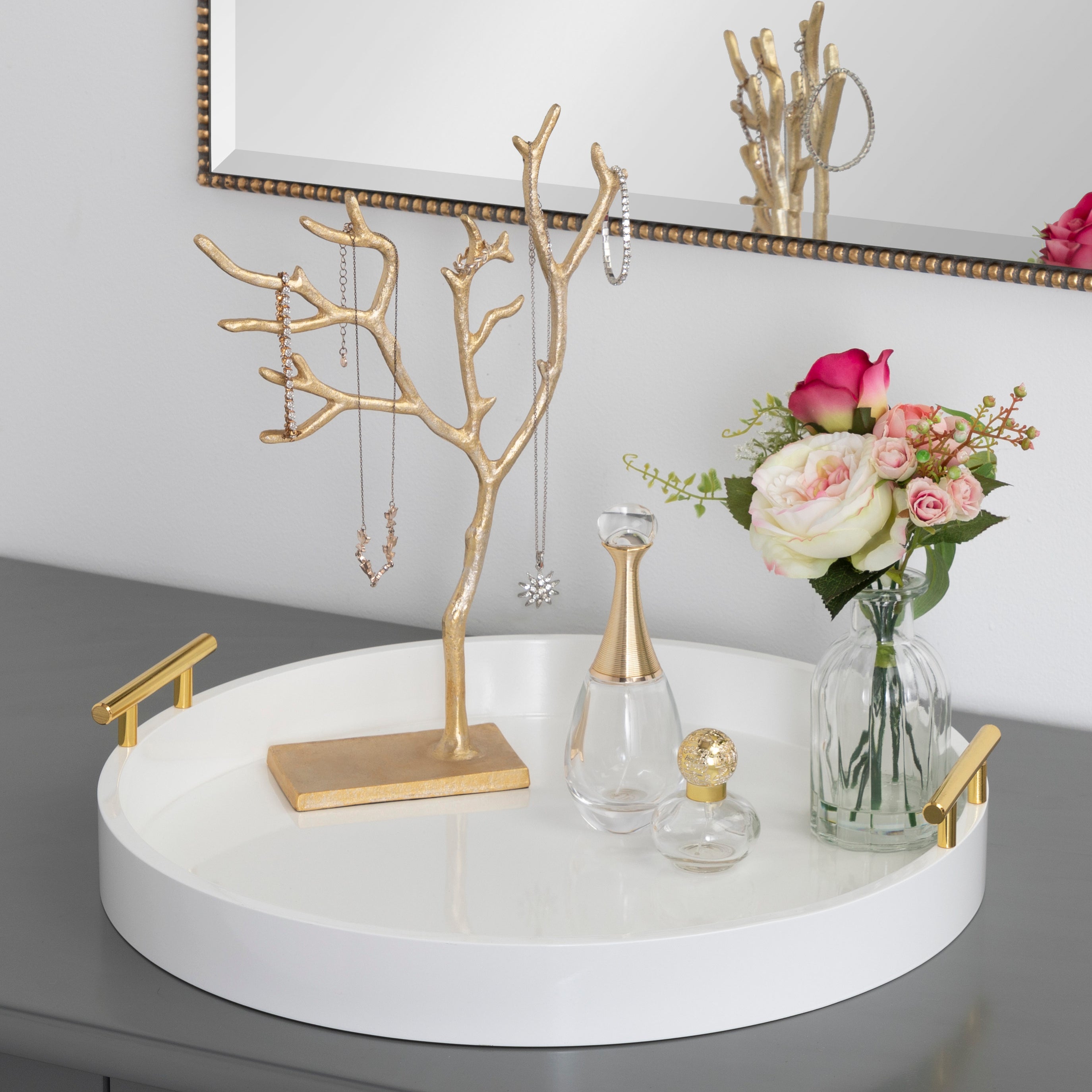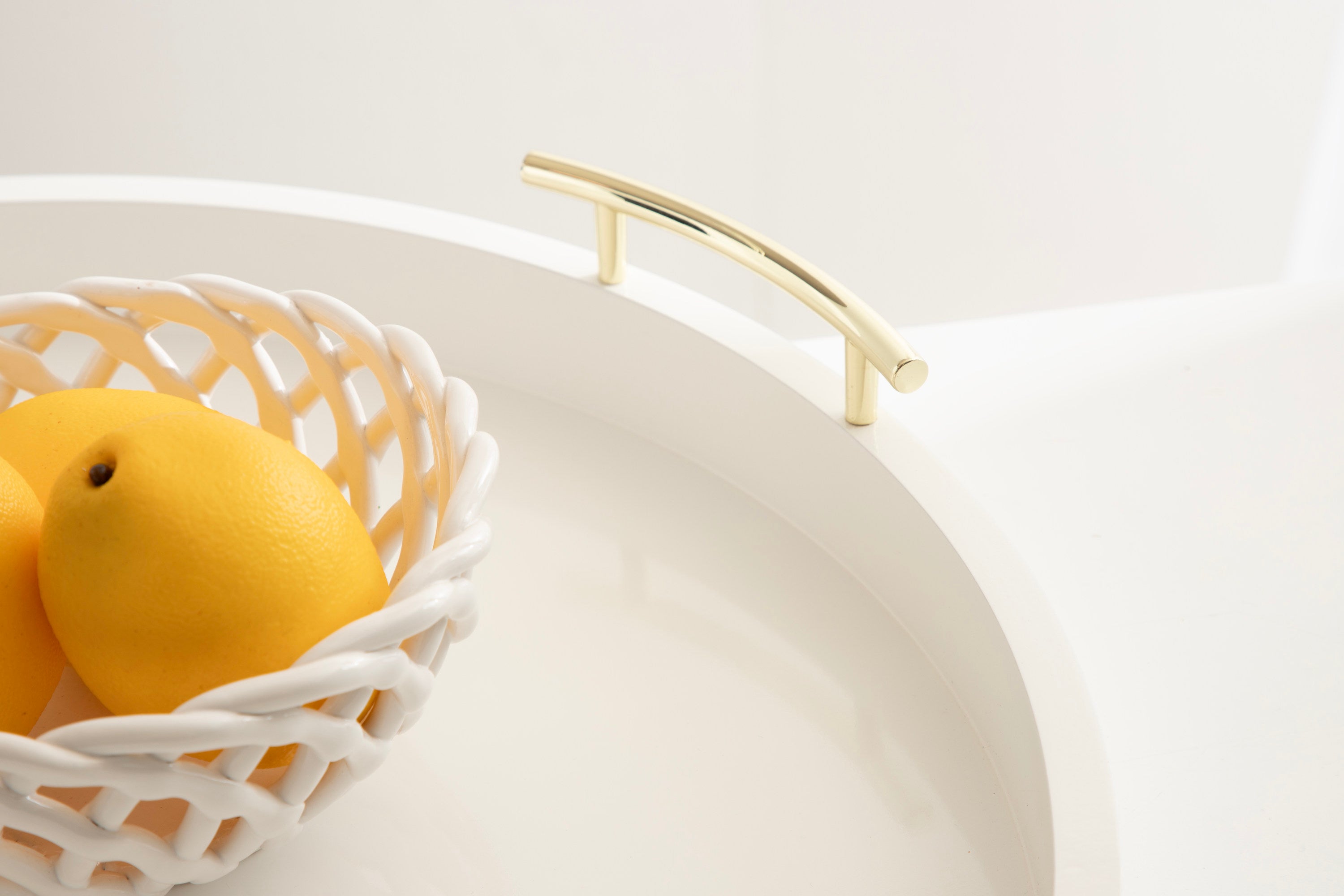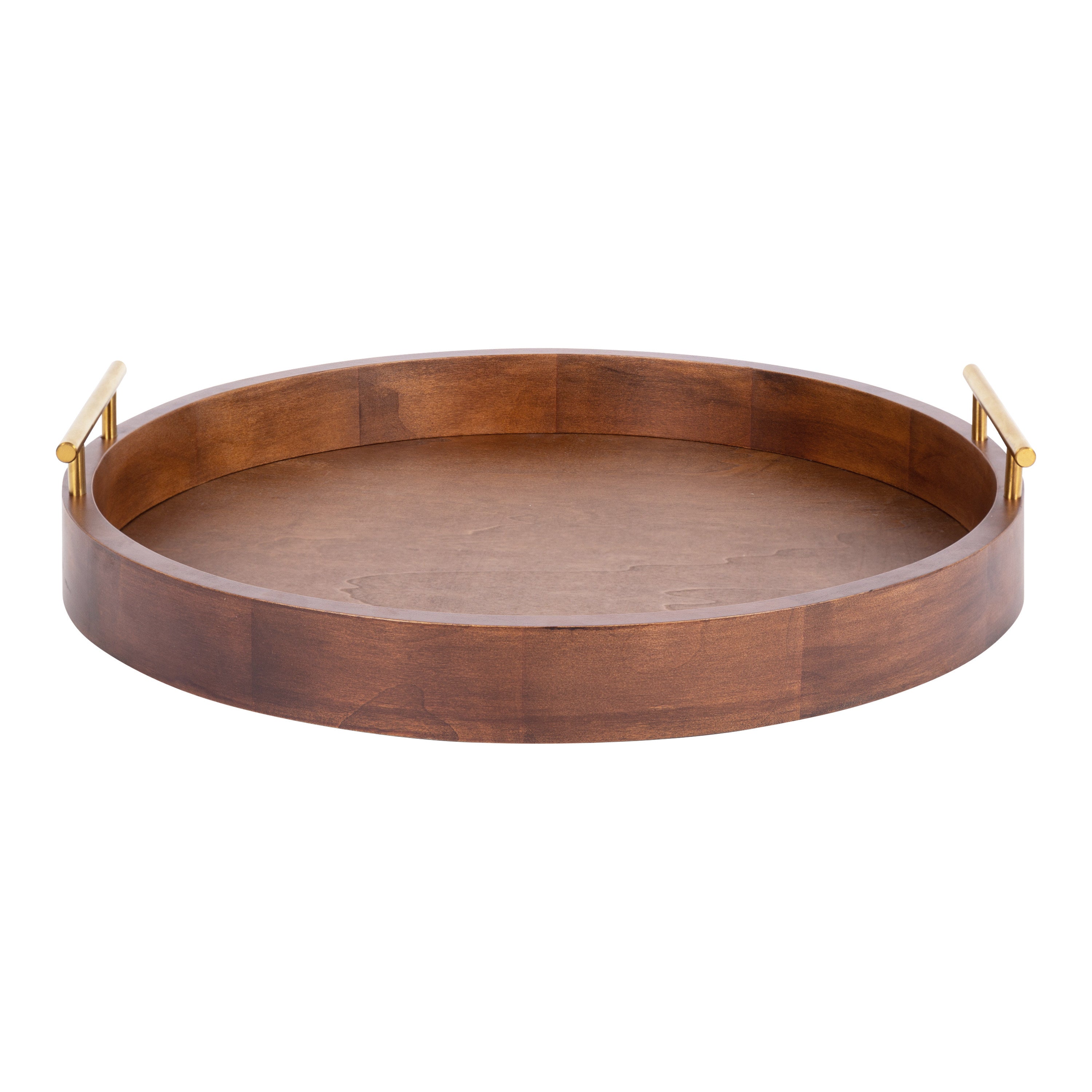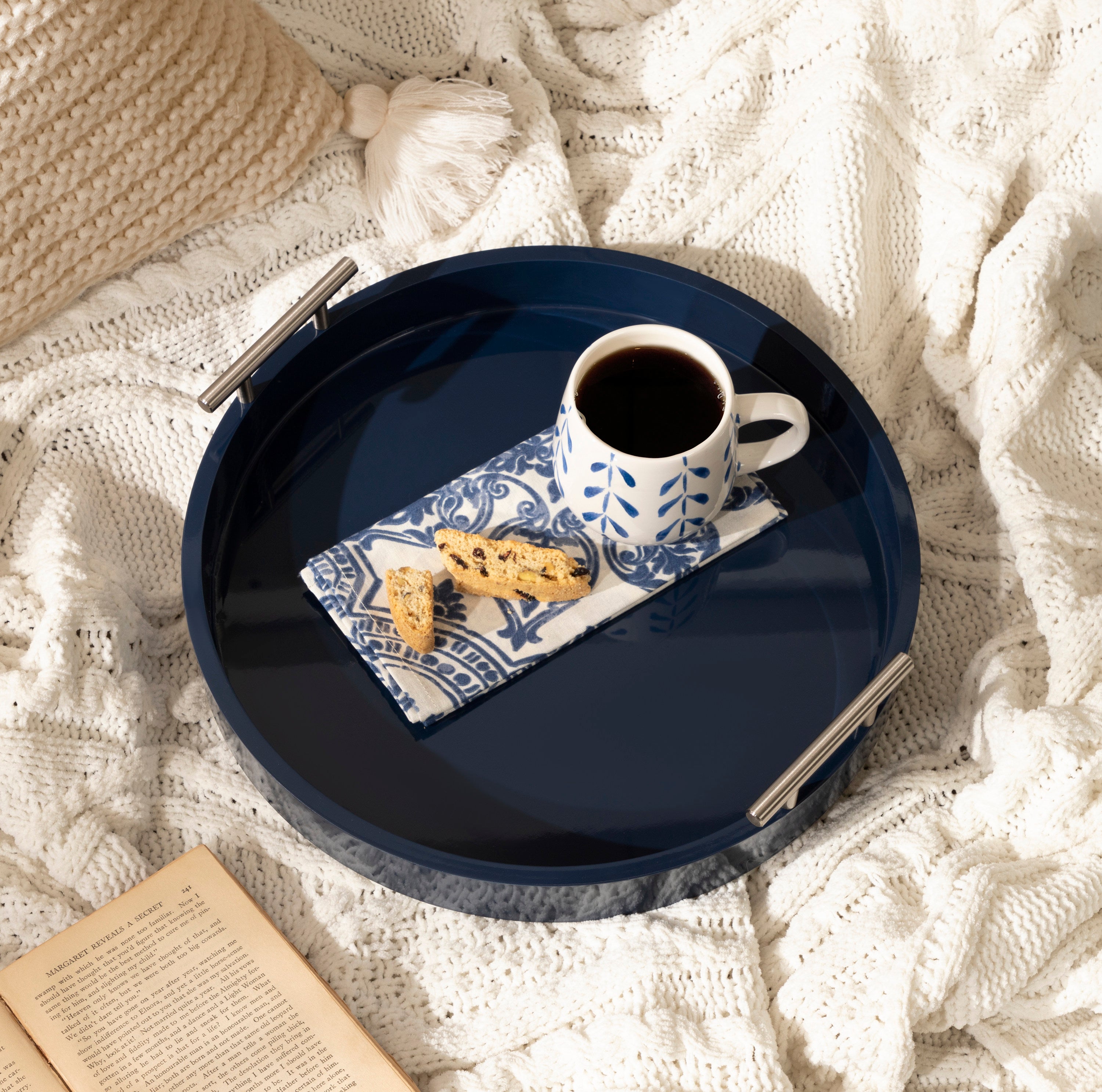 The modern round shape and metropolitan-chic style of the Lipton round tray creates an elegant accent for your home. The smaller surface size makes for a slightly demure presence but the lovely finish and metal handles splash out in all glam! Create a cosmopolitan vibe with this sophisticated accent for storage and display of keys, succulents, media remotes, books, and more!