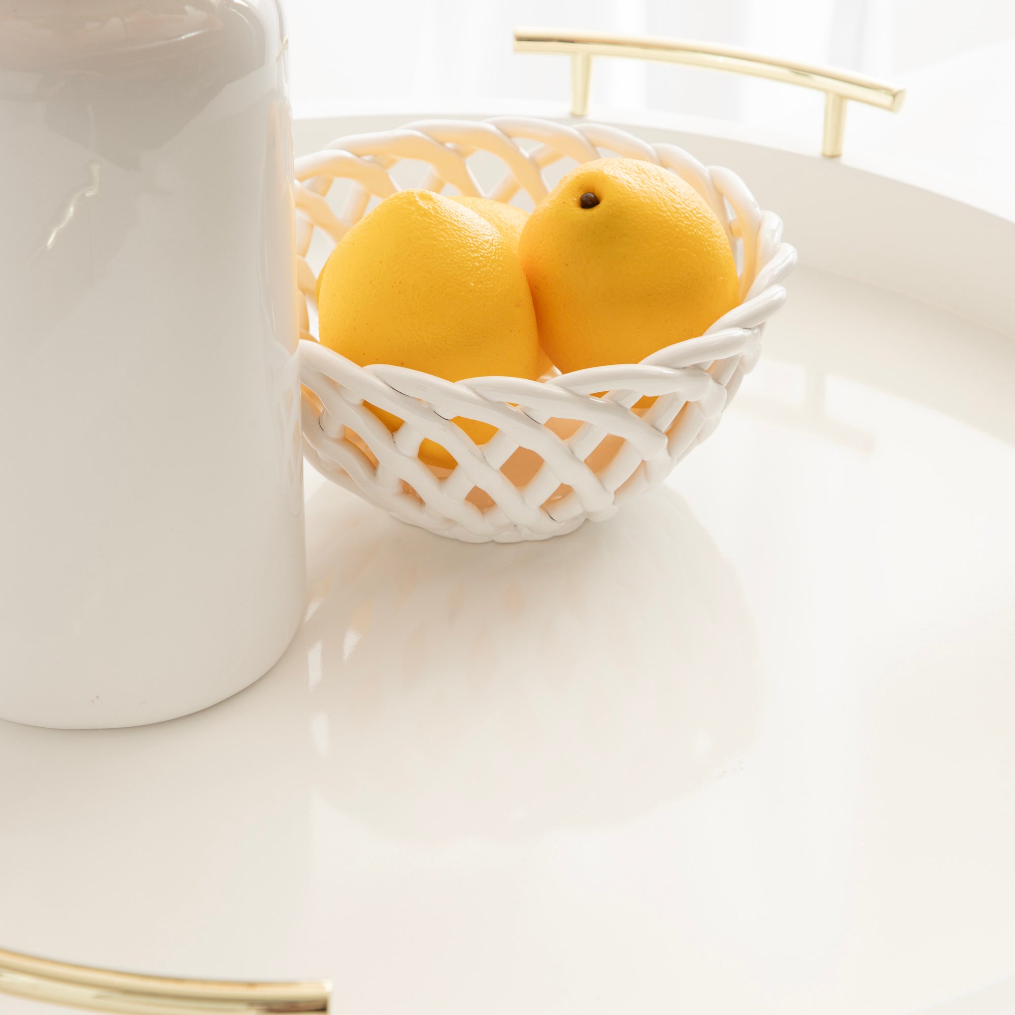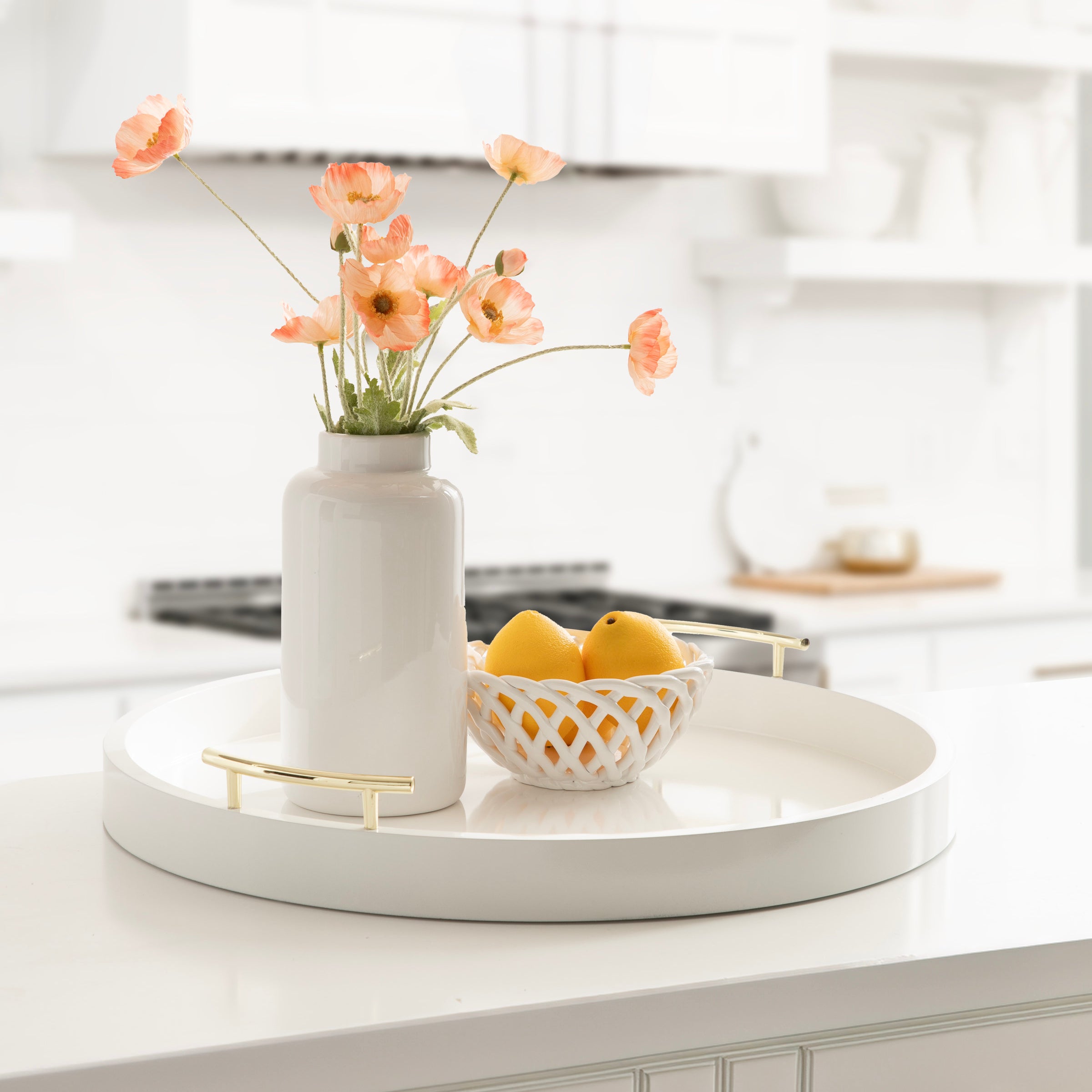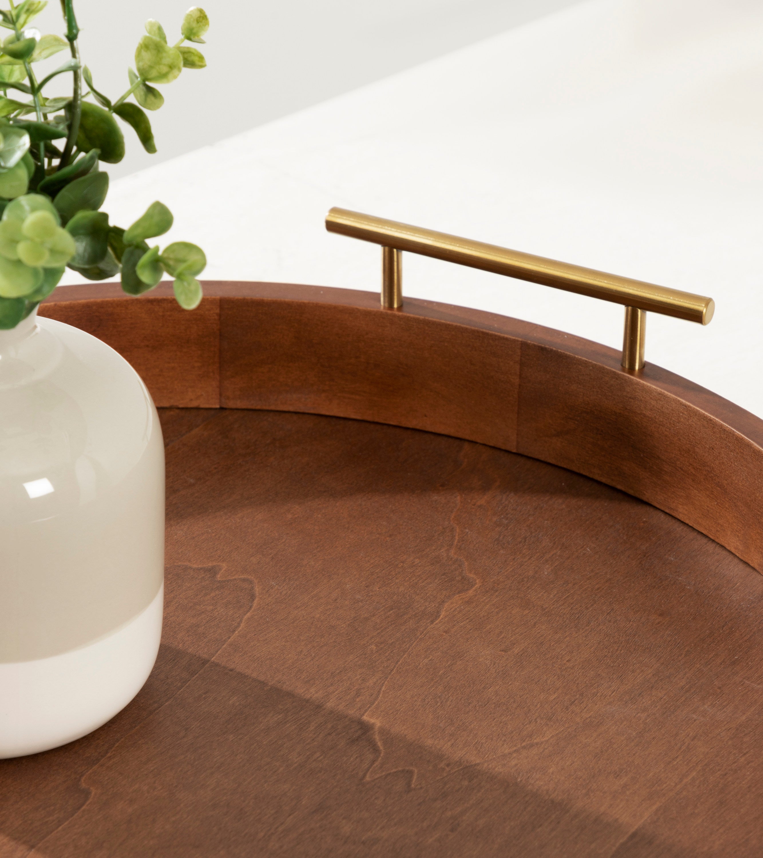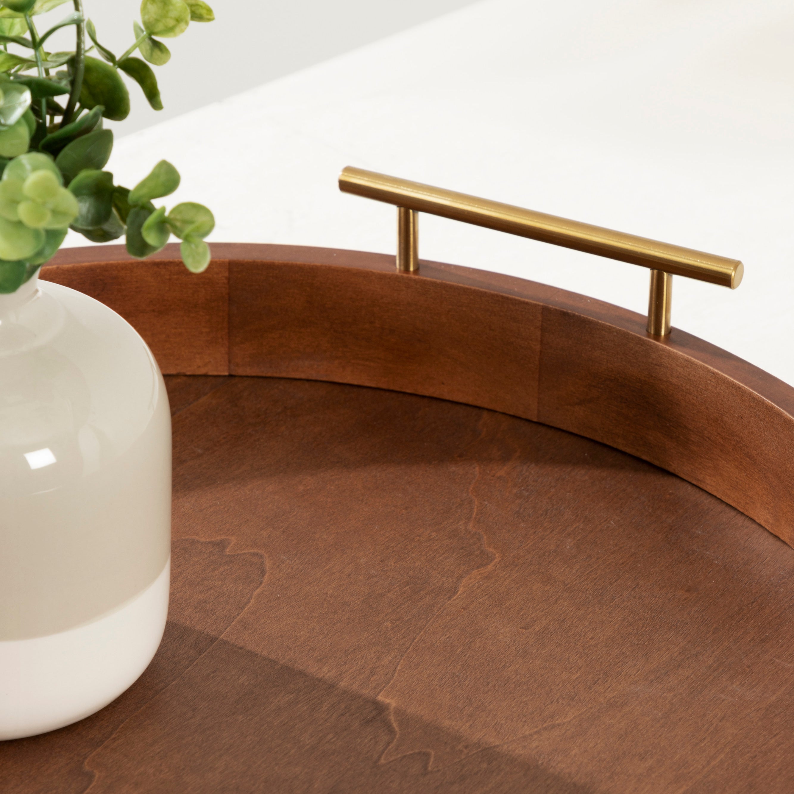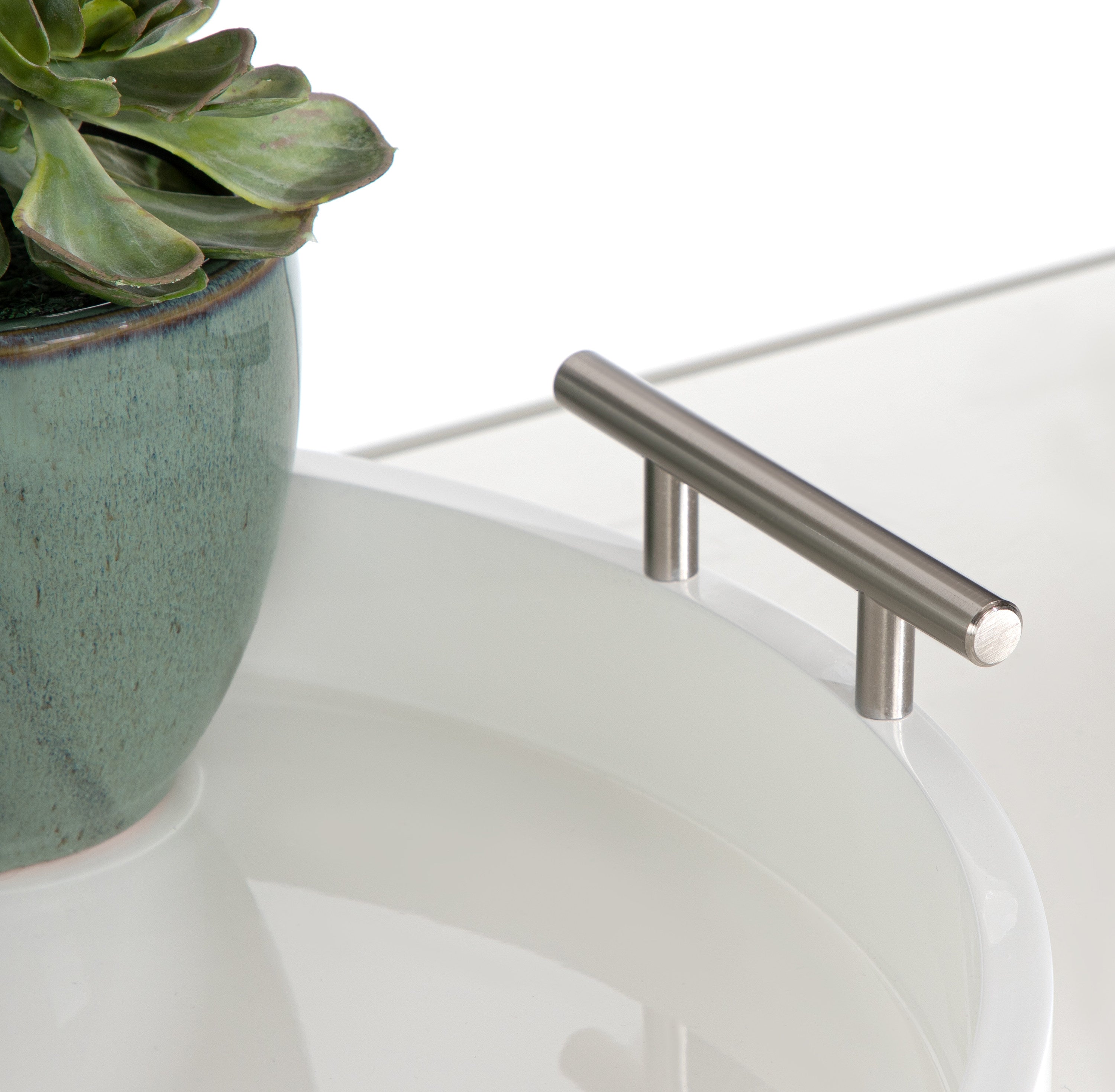The modern round shape and metropolitan-chic style of the Lipton round tray creates an elegant accent for your home. The smaller surface size makes for a slightly demure presence but the lovely finish and metal handles splash out in all glam! Create a cosmopolitan vibe with this sophisticated accent for storage and display of keys, succulents, media remotes, books, and more!