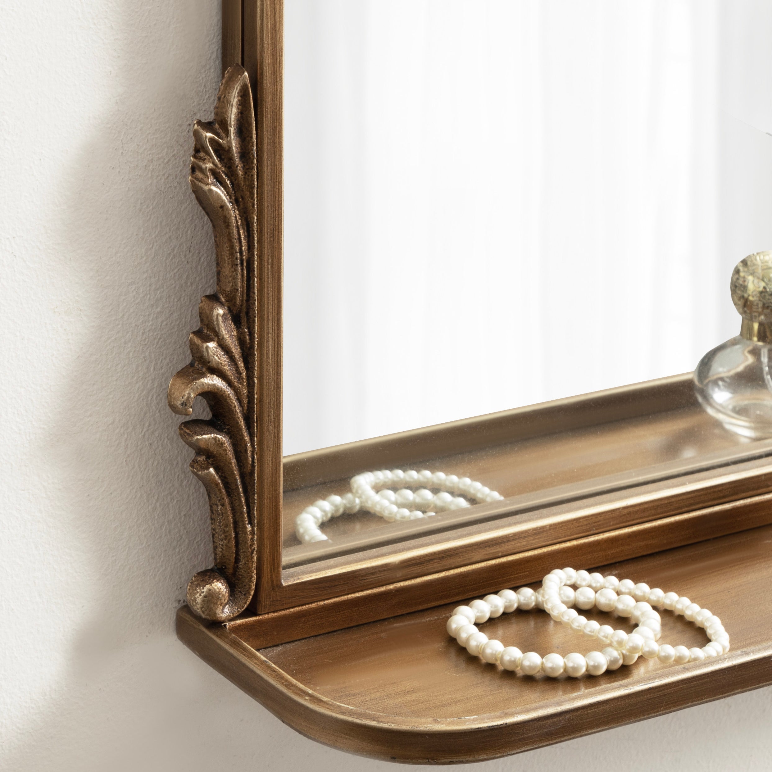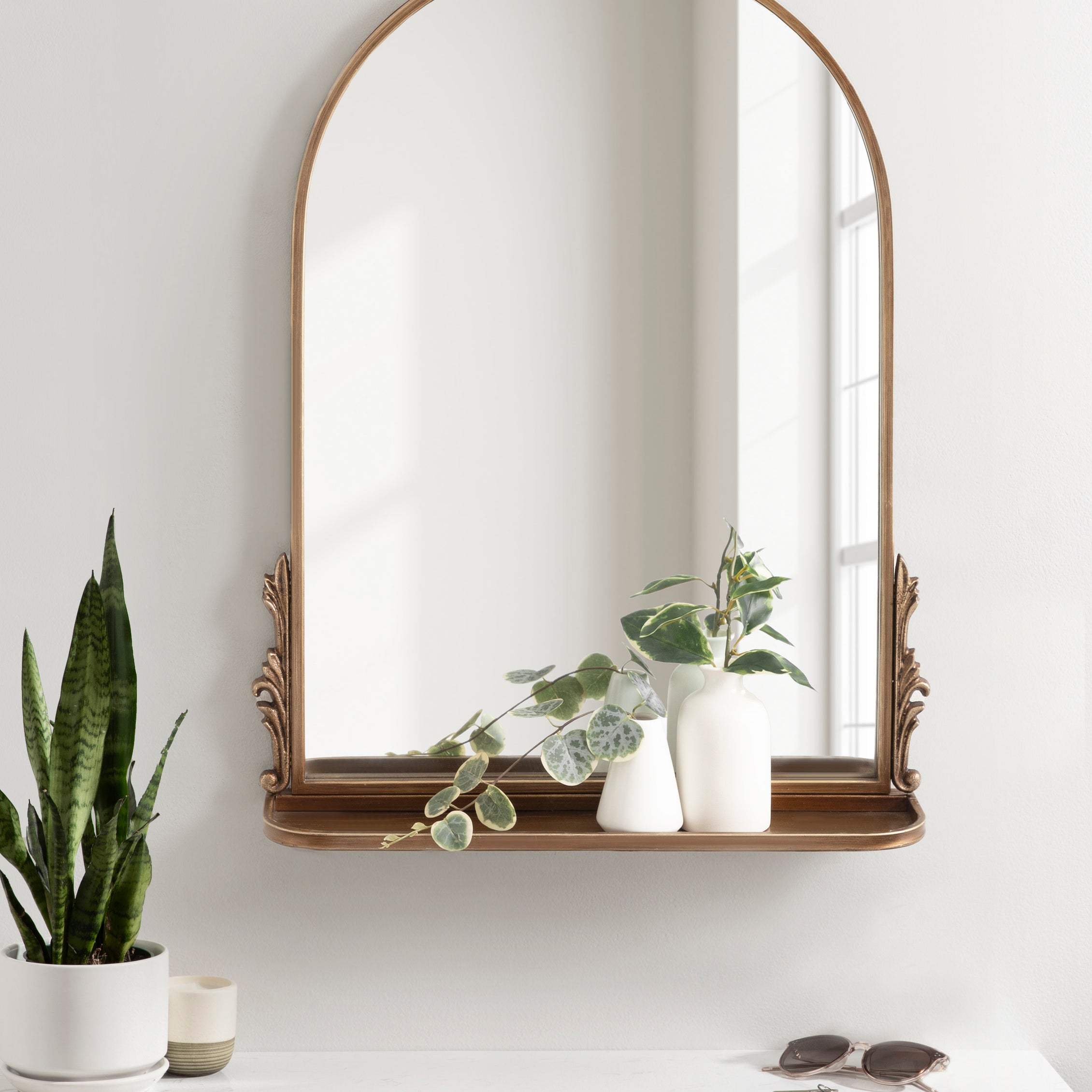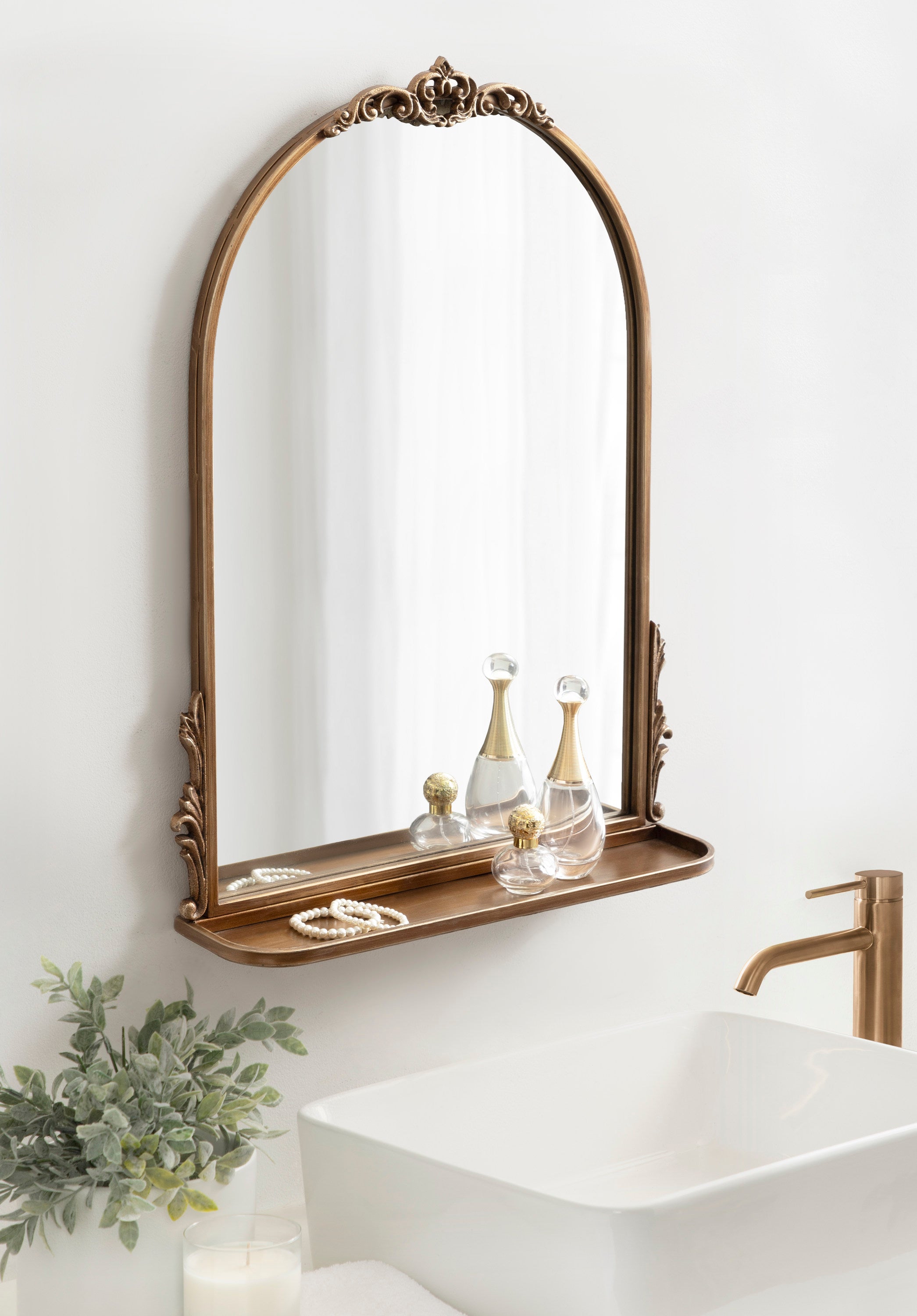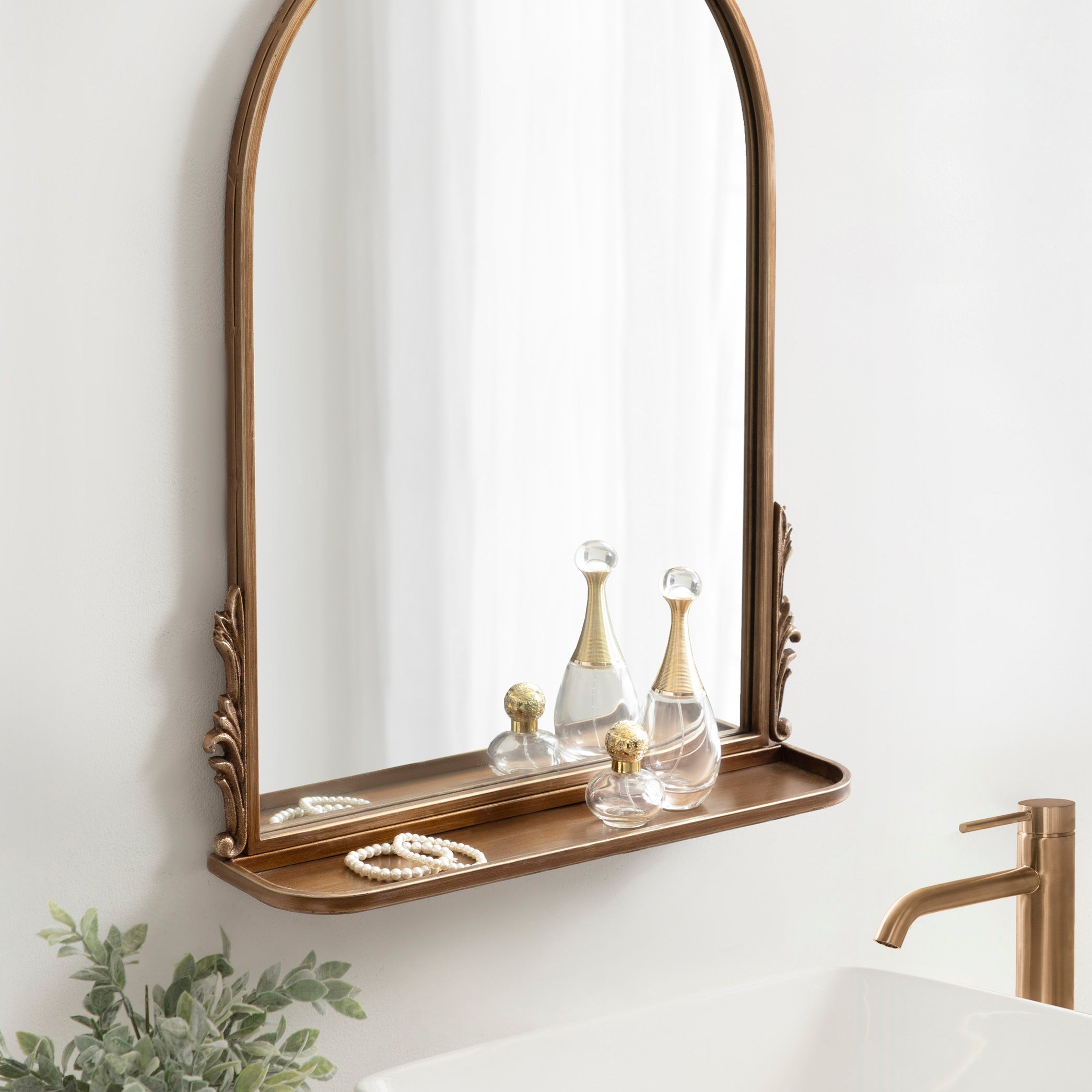 Bring the timeless beauty of French provincial design into your home with the lovely Myrcelle wall mirror. This beautiful accent piece features a sophisticated arched shape with ornate garland details along the edges and crown of the frame. Its antique finish captures the vintage look it strives for, providing a warm and storied visual that draws the eye and captures the imagination. This version of the Myrcelle boasts a shelf below the reflective surface, giving you space to display decorative items or store everyday essentials.