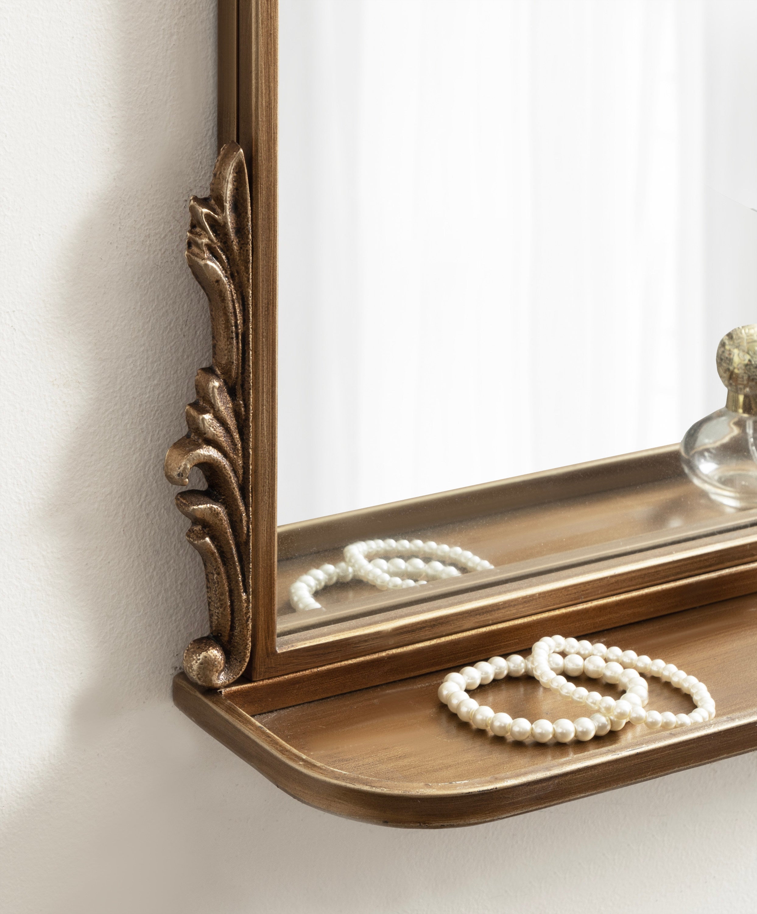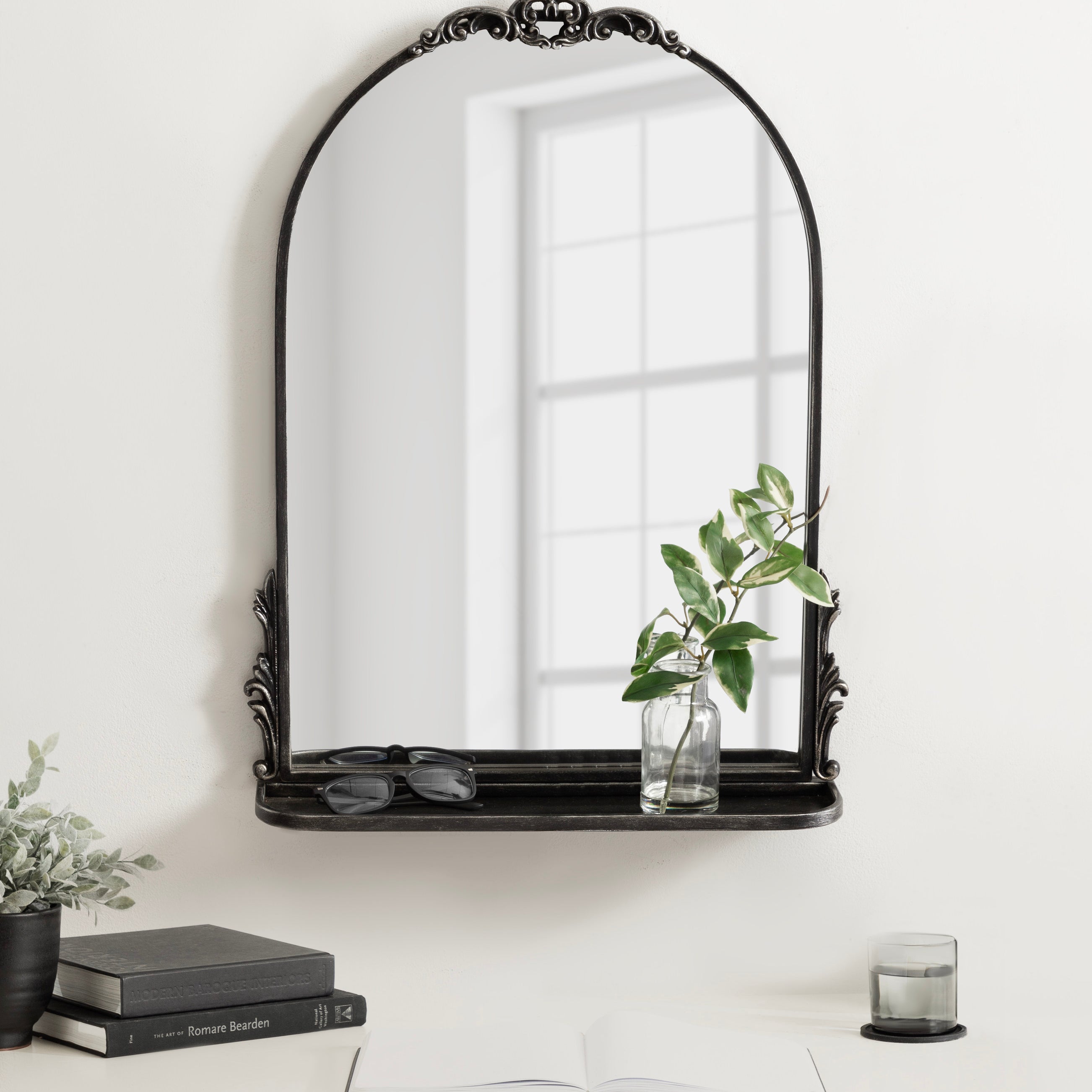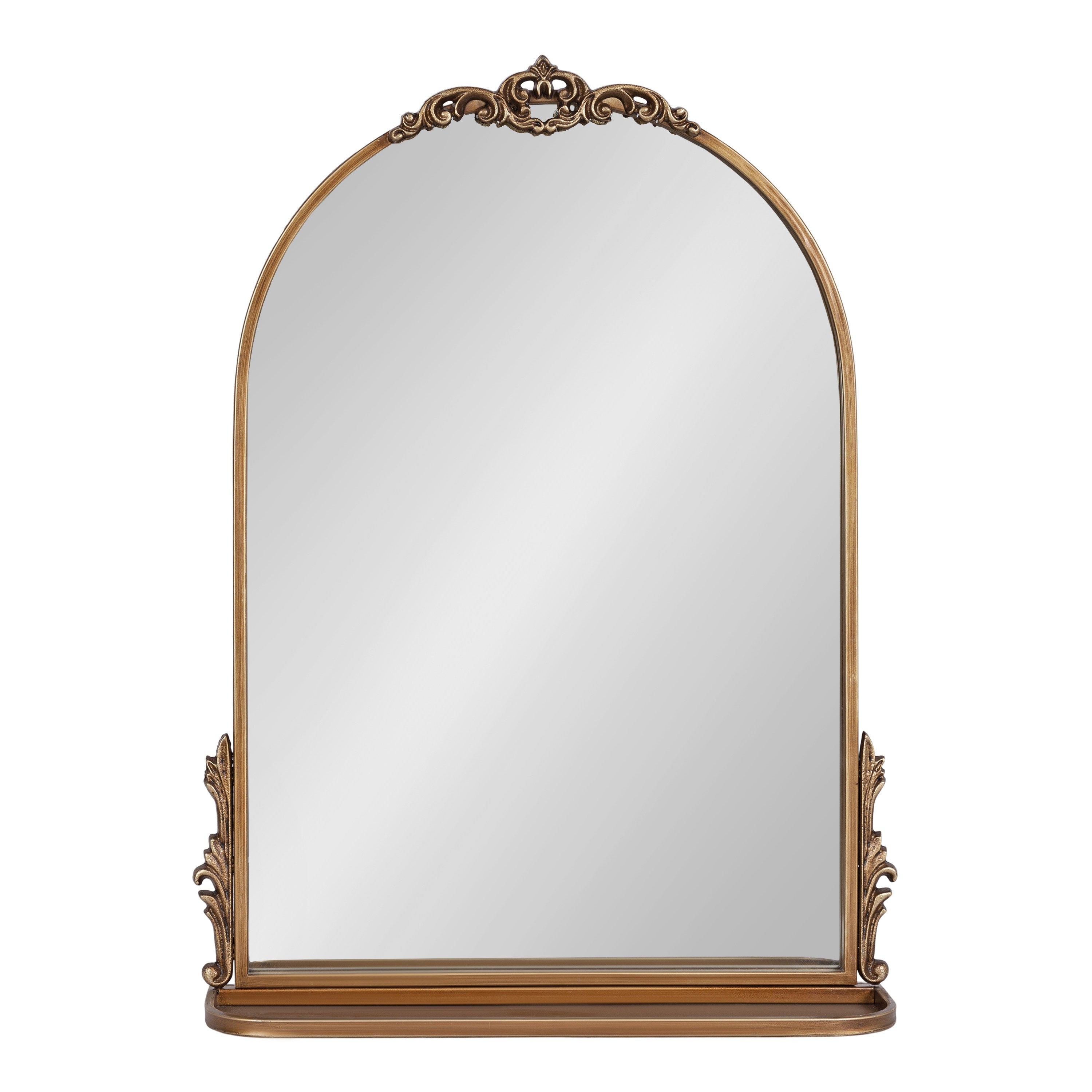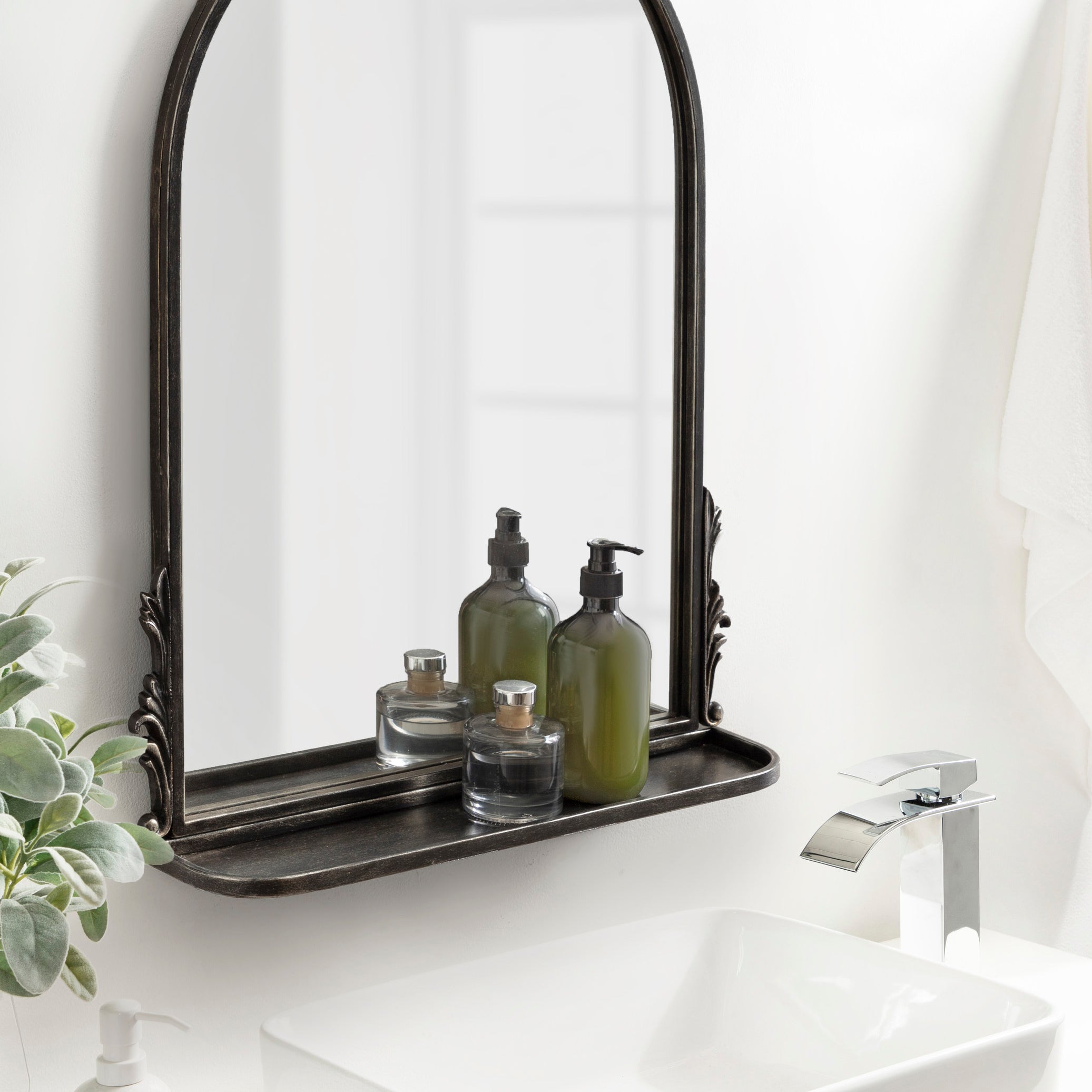 Bring the timeless beauty of French provincial design into your home with the lovely Myrcelle wall mirror. This beautiful accent piece features a sophisticated arched shape with ornate garland details along the edges and crown of the frame. Its antique finish captures the vintage look it strives for, providing a warm and storied visual that draws the eye and captures the imagination. This version of the Myrcelle boasts a shelf below the reflective surface, giving you space to display decorative items or store everyday essentials.