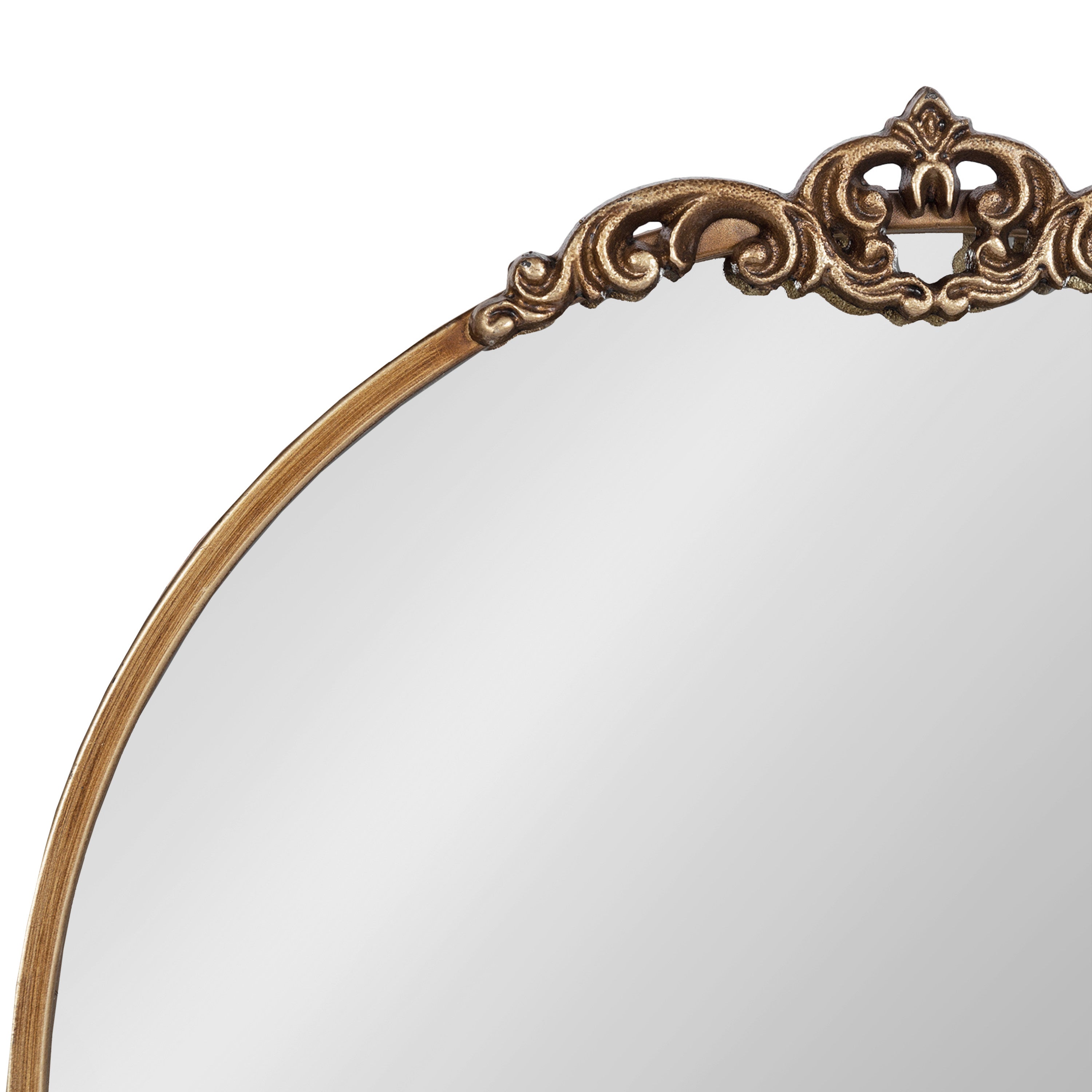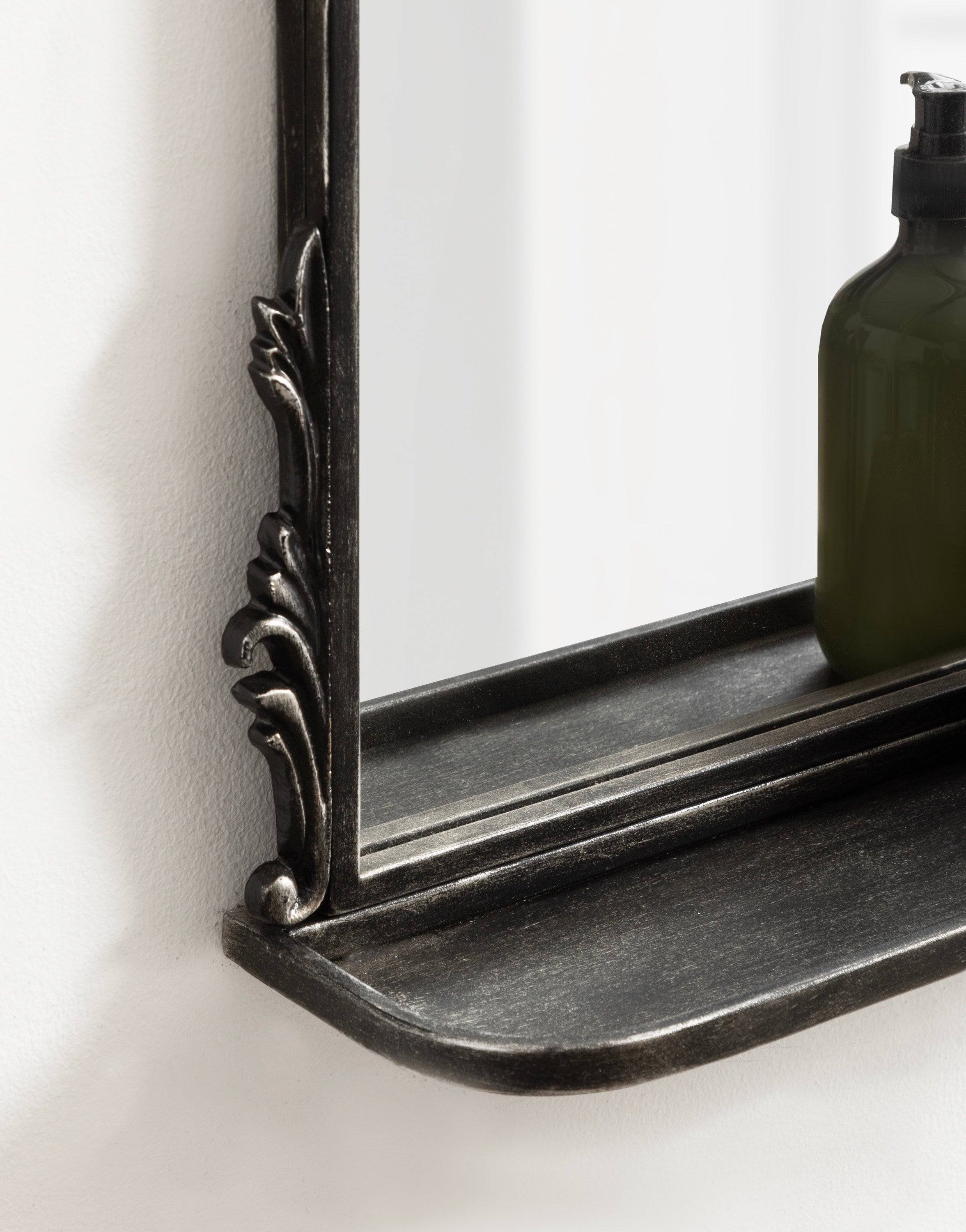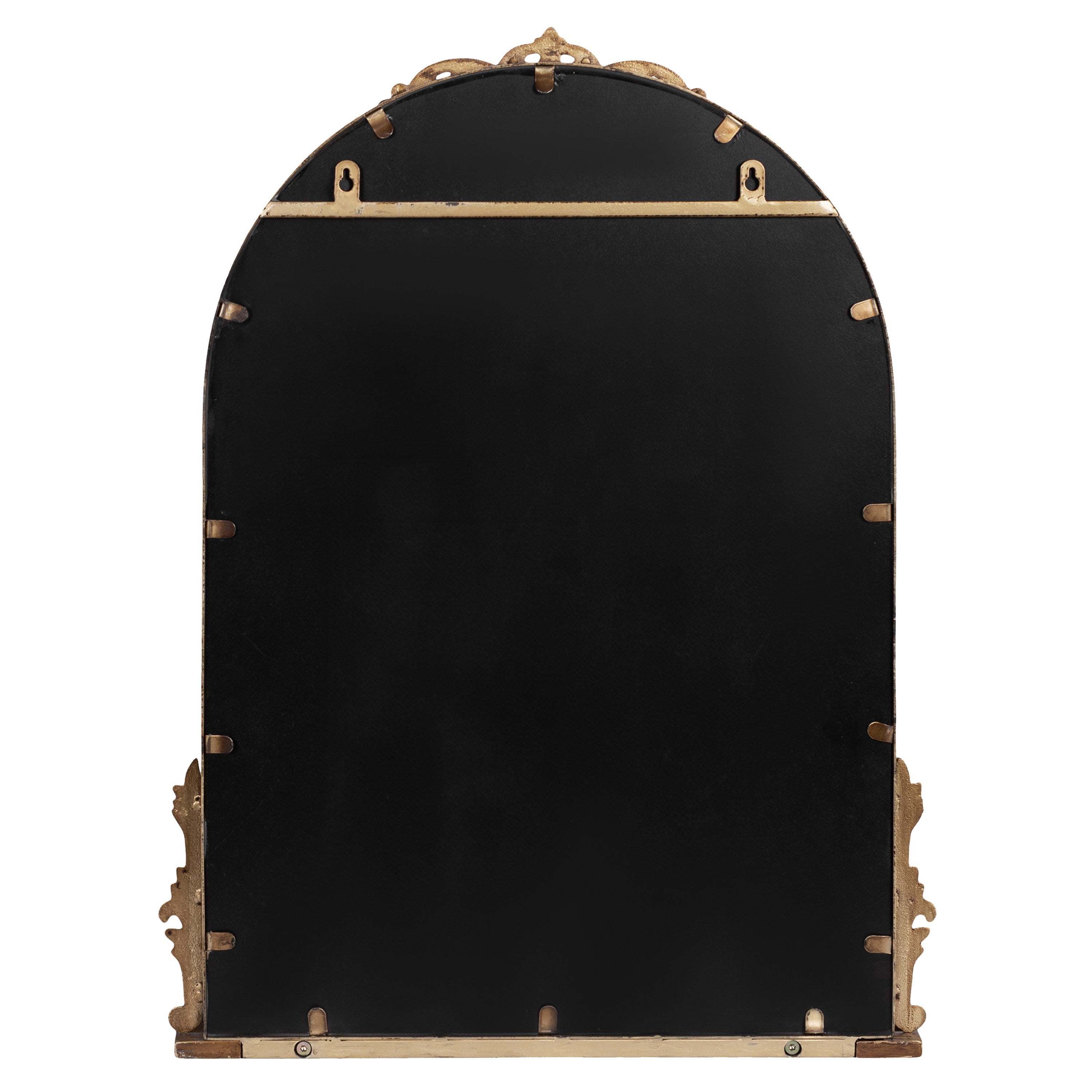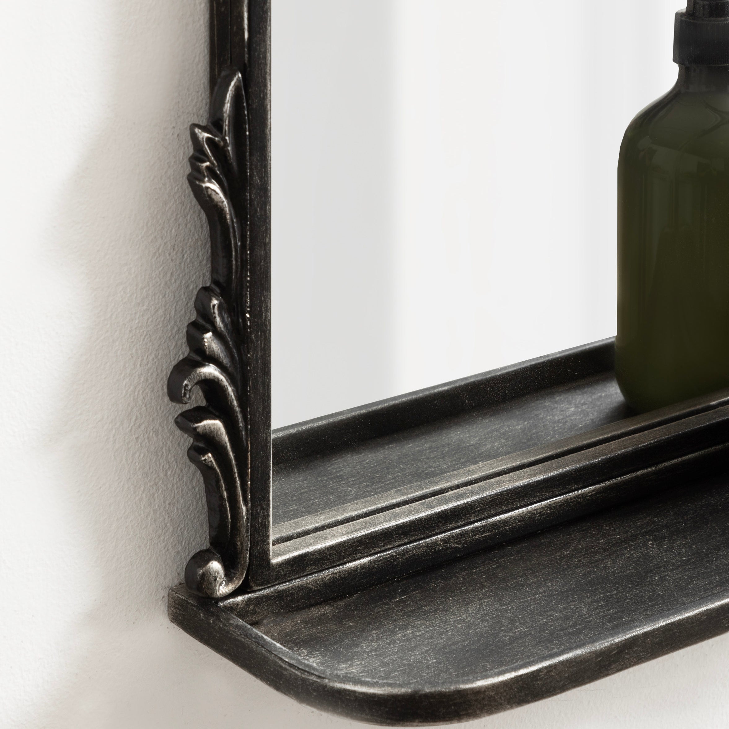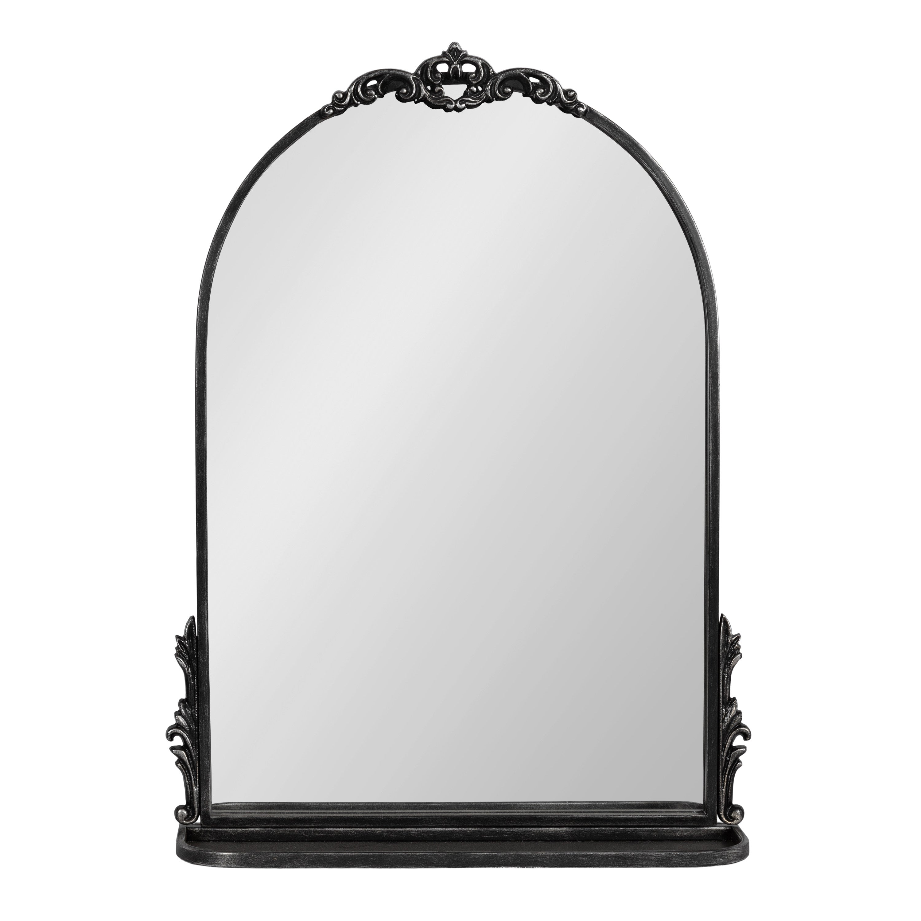 Bring the timeless beauty of French provincial design into your home with the lovely Myrcelle wall mirror. This beautiful accent piece features a sophisticated arched shape with ornate garland details along the edges and crown of the frame. Its antique finish captures the vintage look it strives for, providing a warm and storied visual that draws the eye and captures the imagination. This version of the Myrcelle boasts a shelf below the reflective surface, giving you space to display decorative items or store everyday essentials.