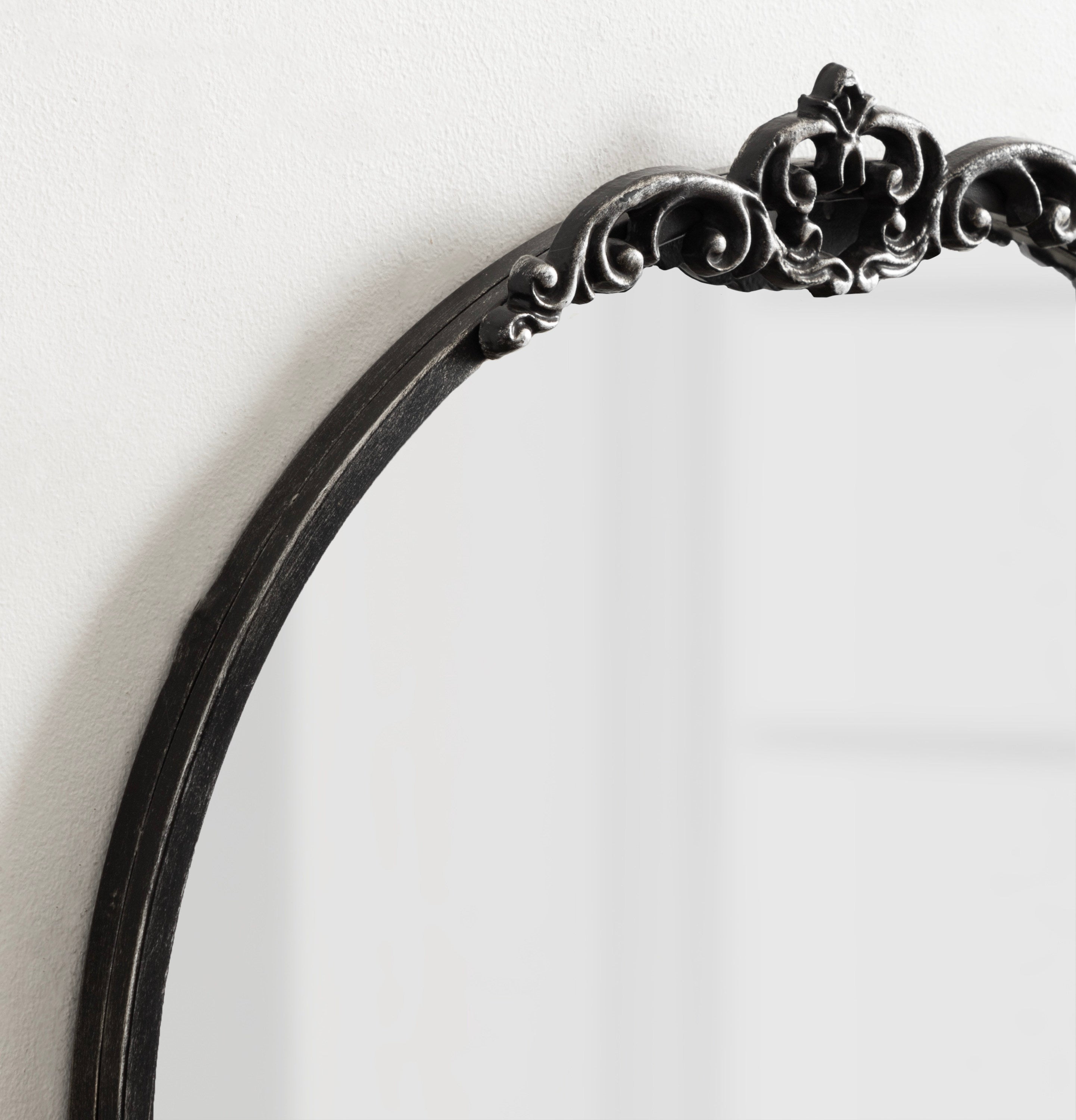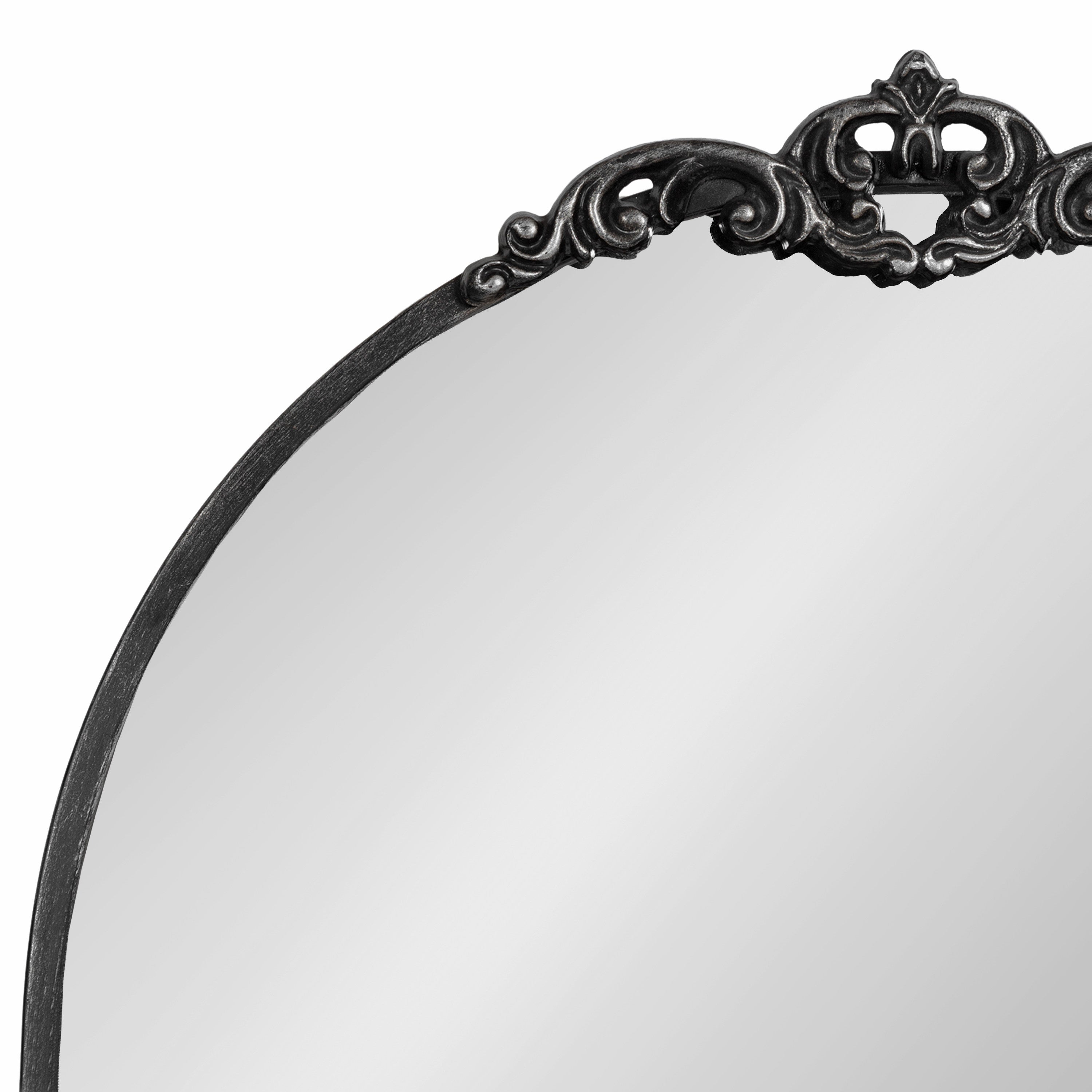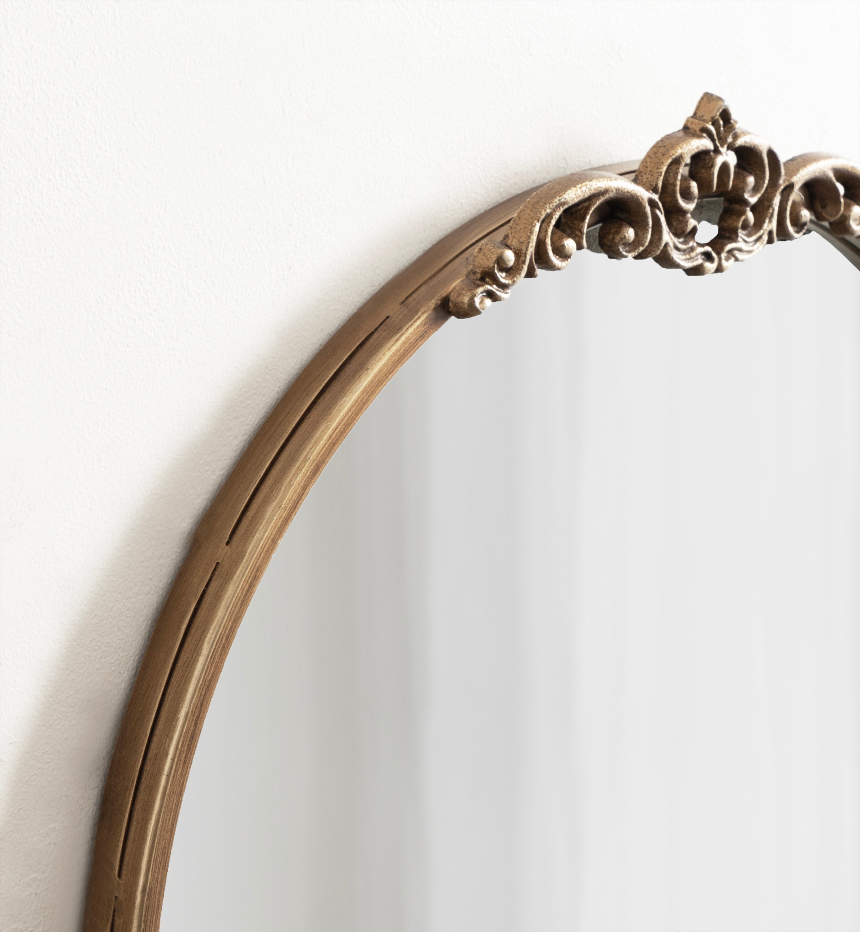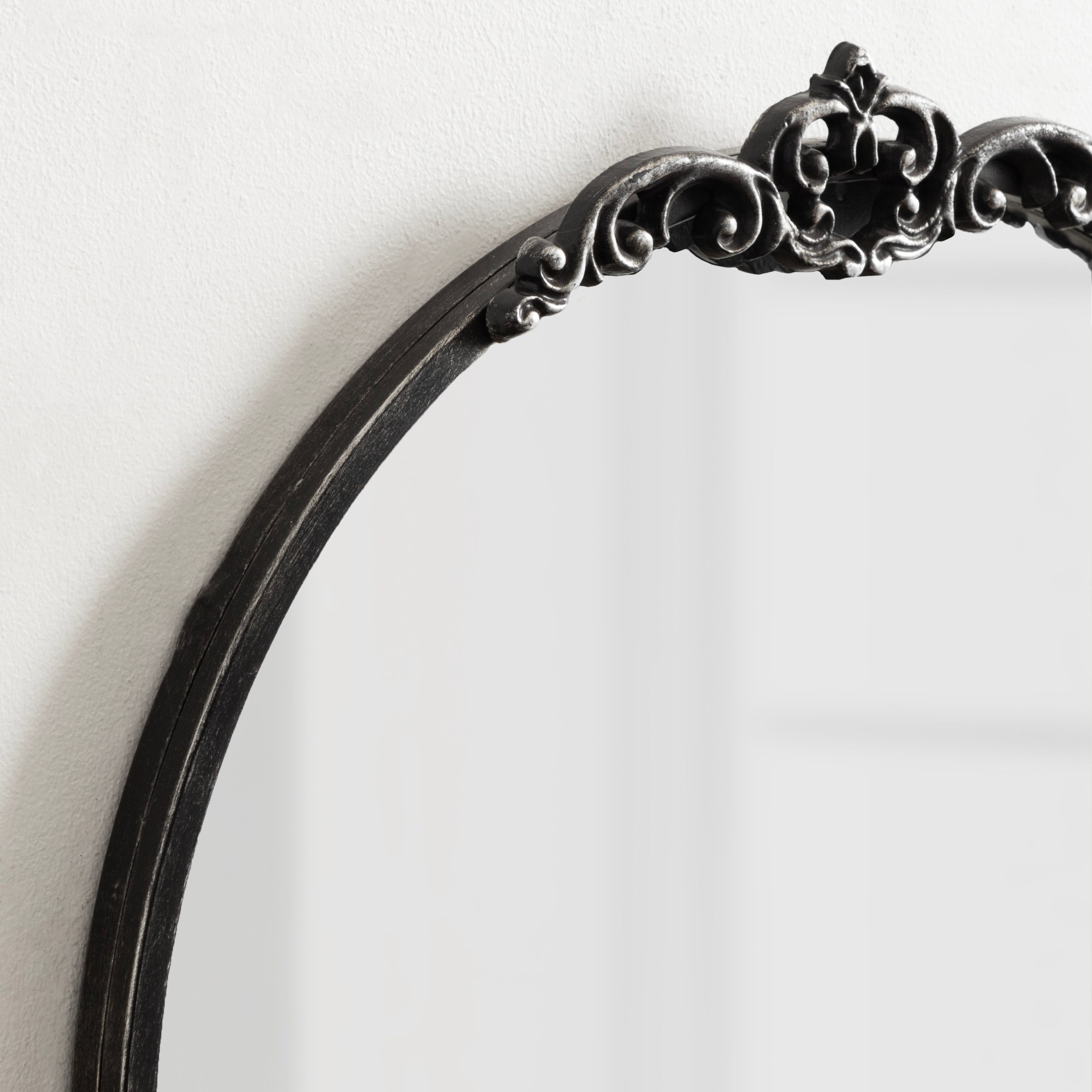 Bring the timeless beauty of French provincial design into your home with the lovely Myrcelle wall mirror. This beautiful accent piece features a sophisticated arched shape with ornate garland details along the edges and crown of the frame. Its antique finish captures the vintage look it strives for, providing a warm and storied visual that draws the eye and captures the imagination. This version of the Myrcelle boasts a shelf below the reflective surface, giving you space to display decorative items or store everyday essentials.