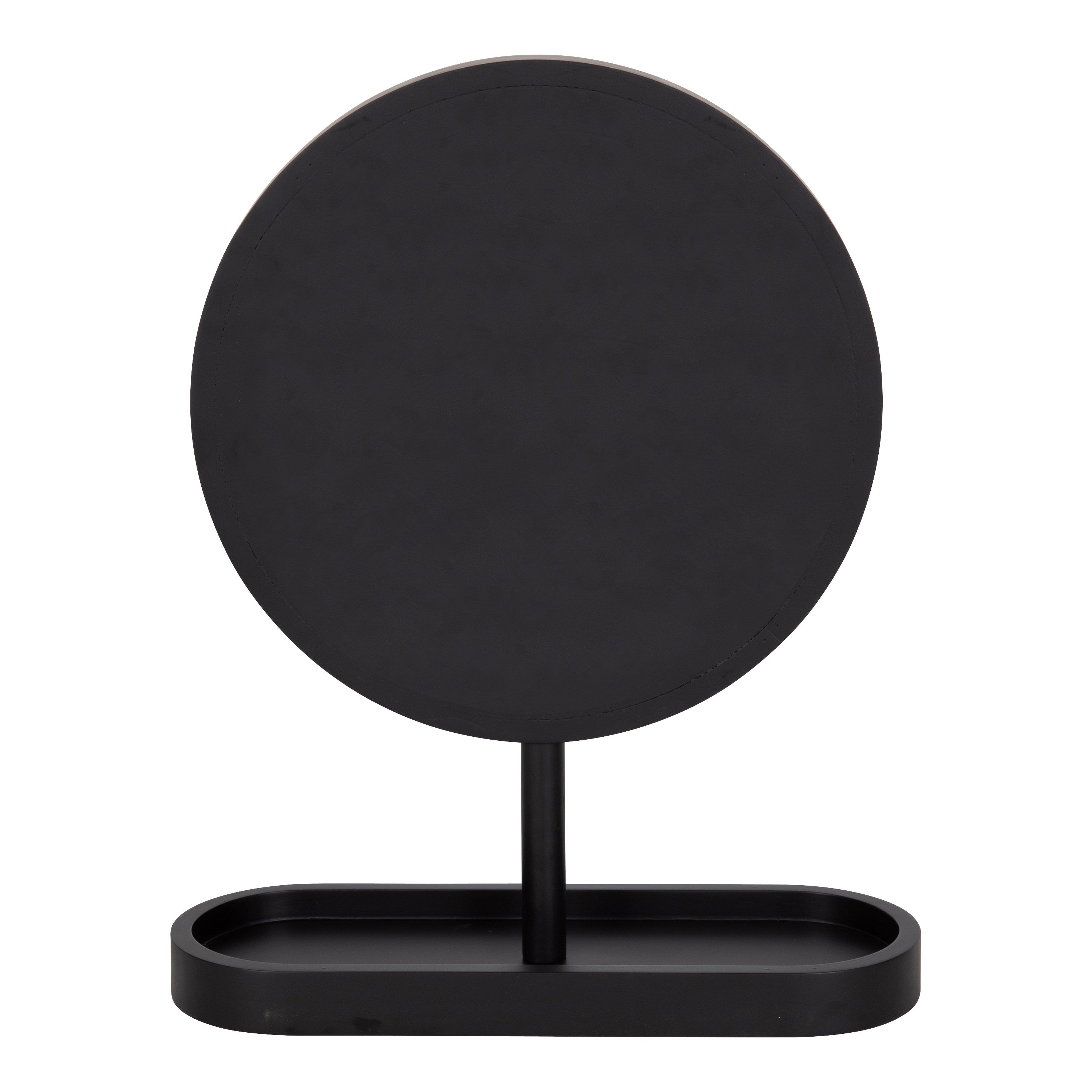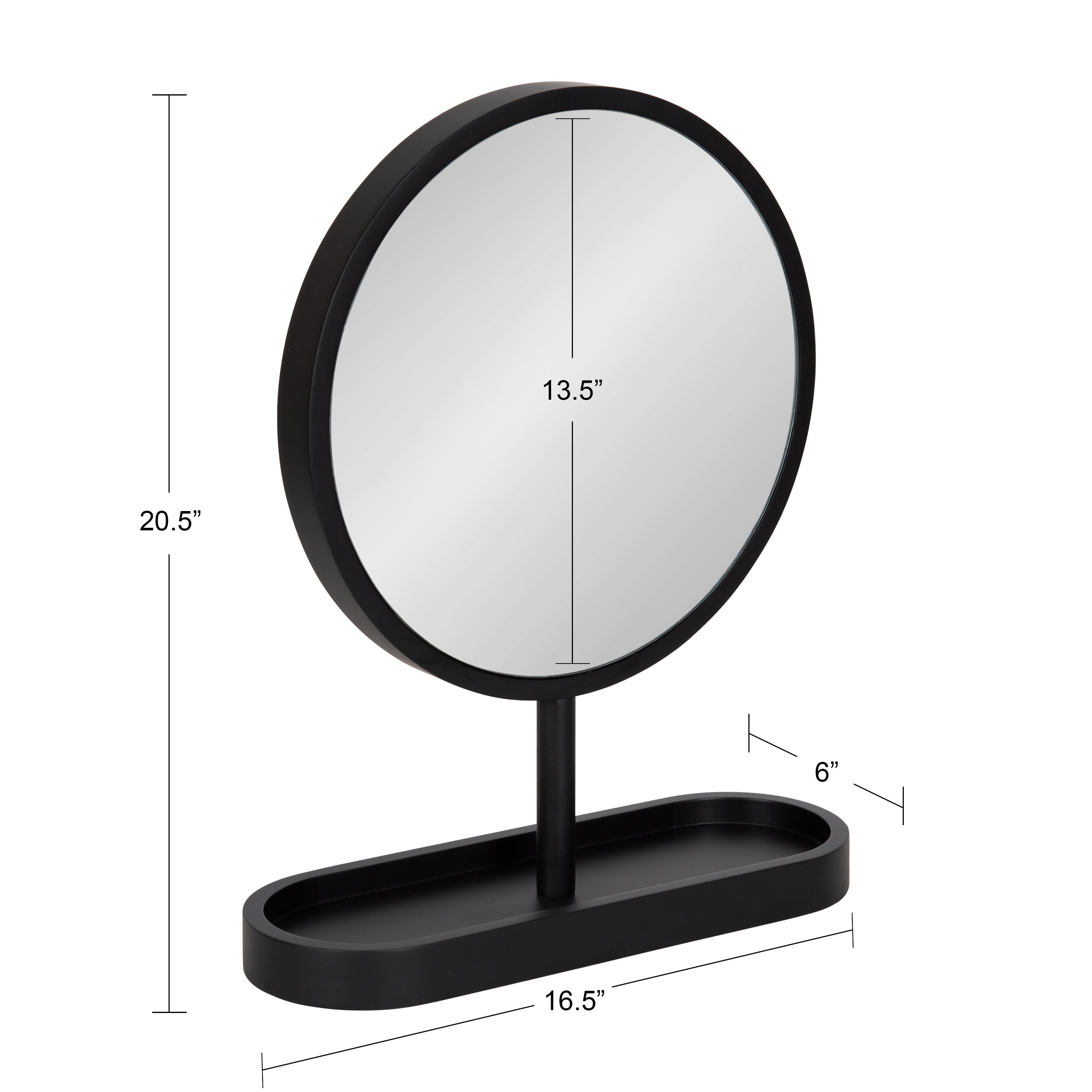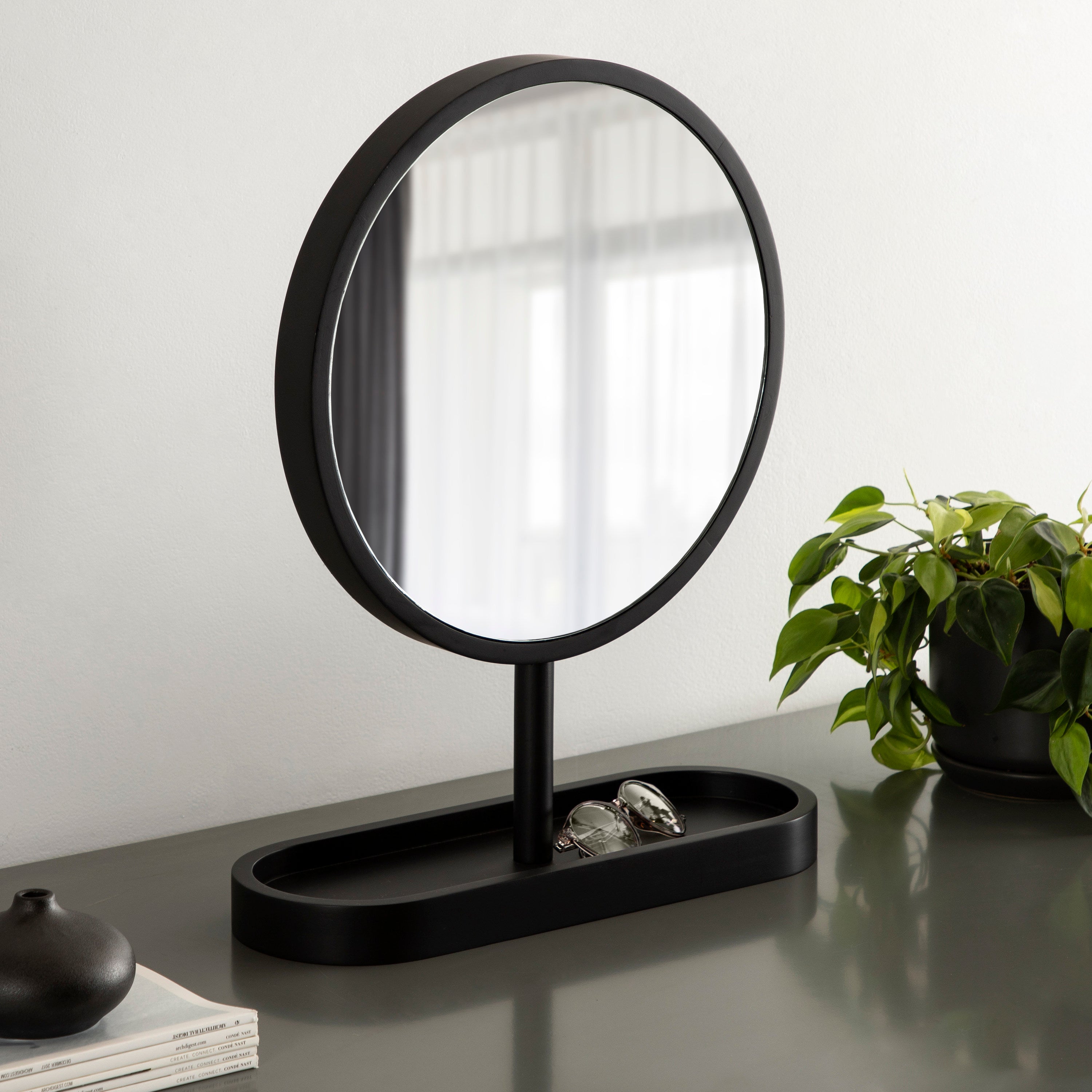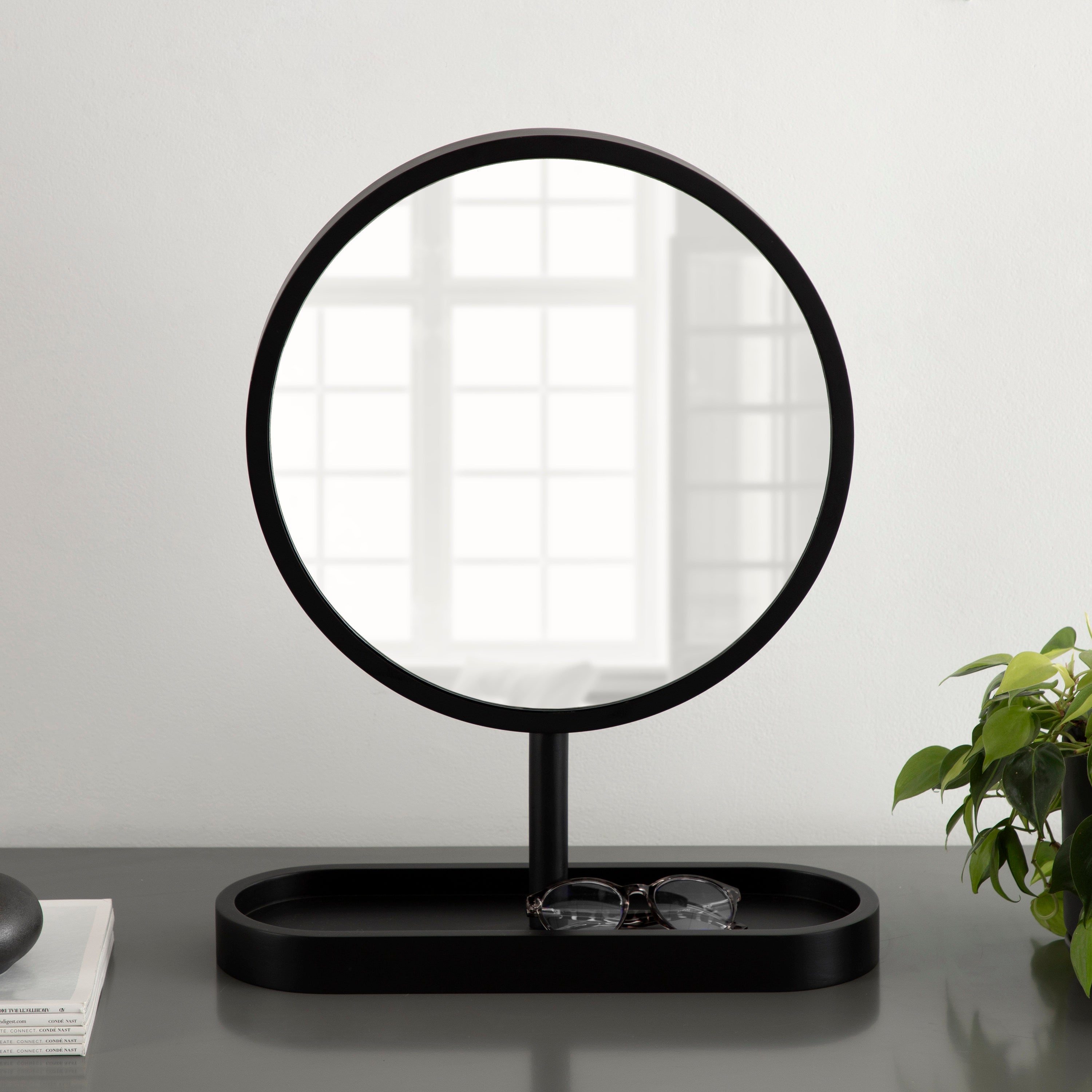 The refreshing Travis tabletop mirror offers a modern design and clean style for any surface of your home. This decor accent features a round, floating mirror connected to a capsule-shaped tray base, combining function with a stylish look. Its wide mirror is fantastic for when you need a last-minute touchup or add vibrancy to your space. The small tray base is open to create an area to catch items like jewelry, makeup, watches, and more. This stylish table accent is fantastic for honing your decorative aesthetic while adding more function to your display areas.