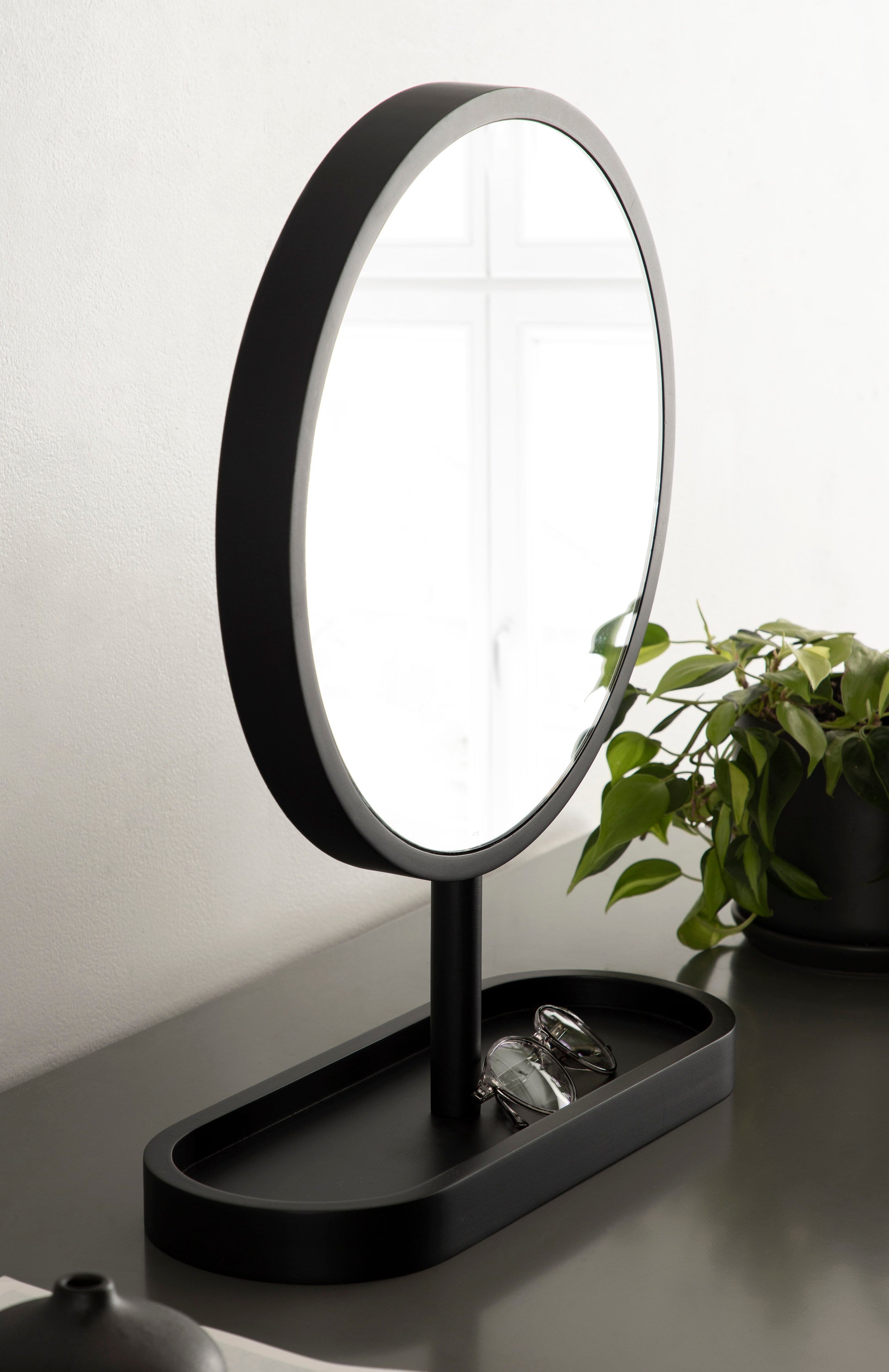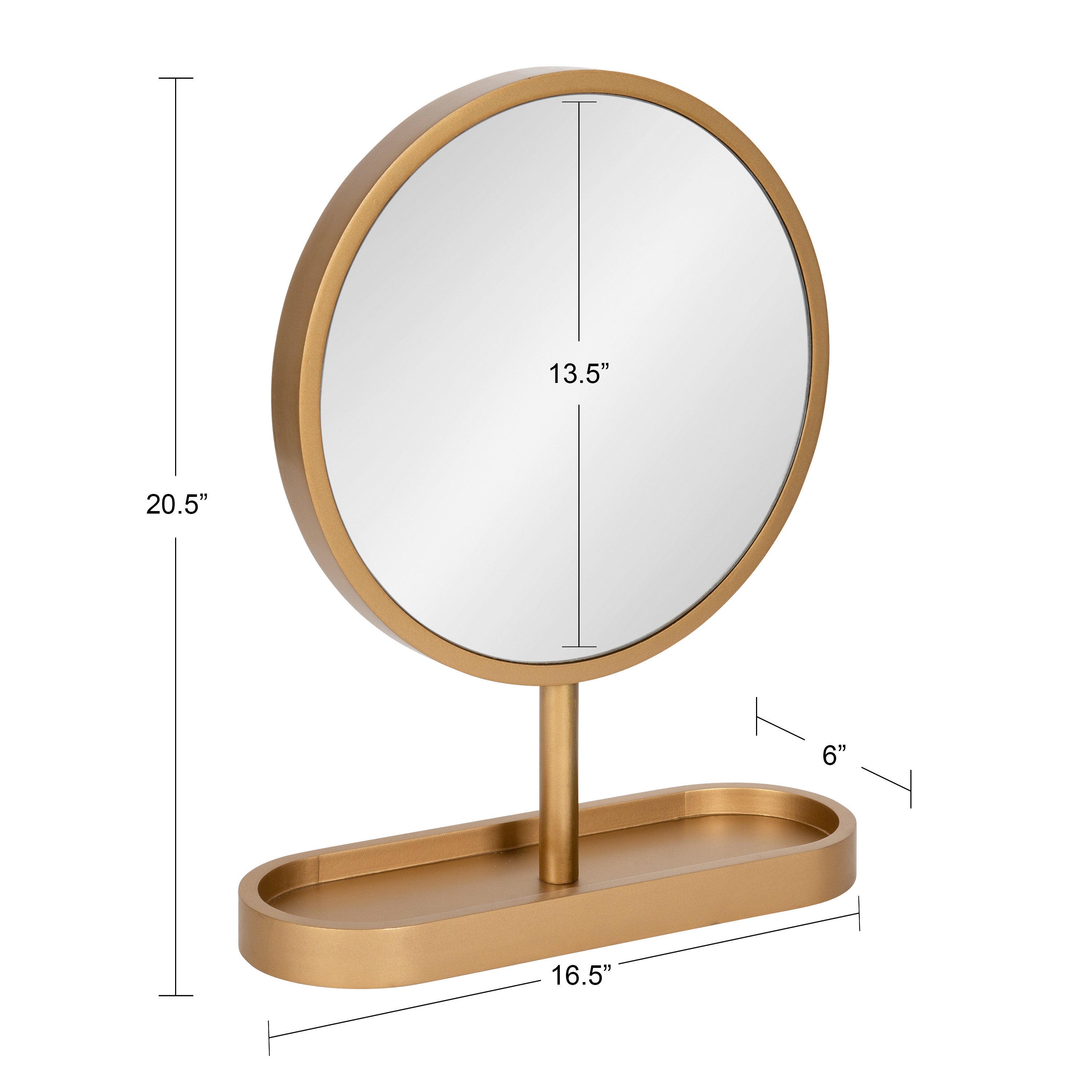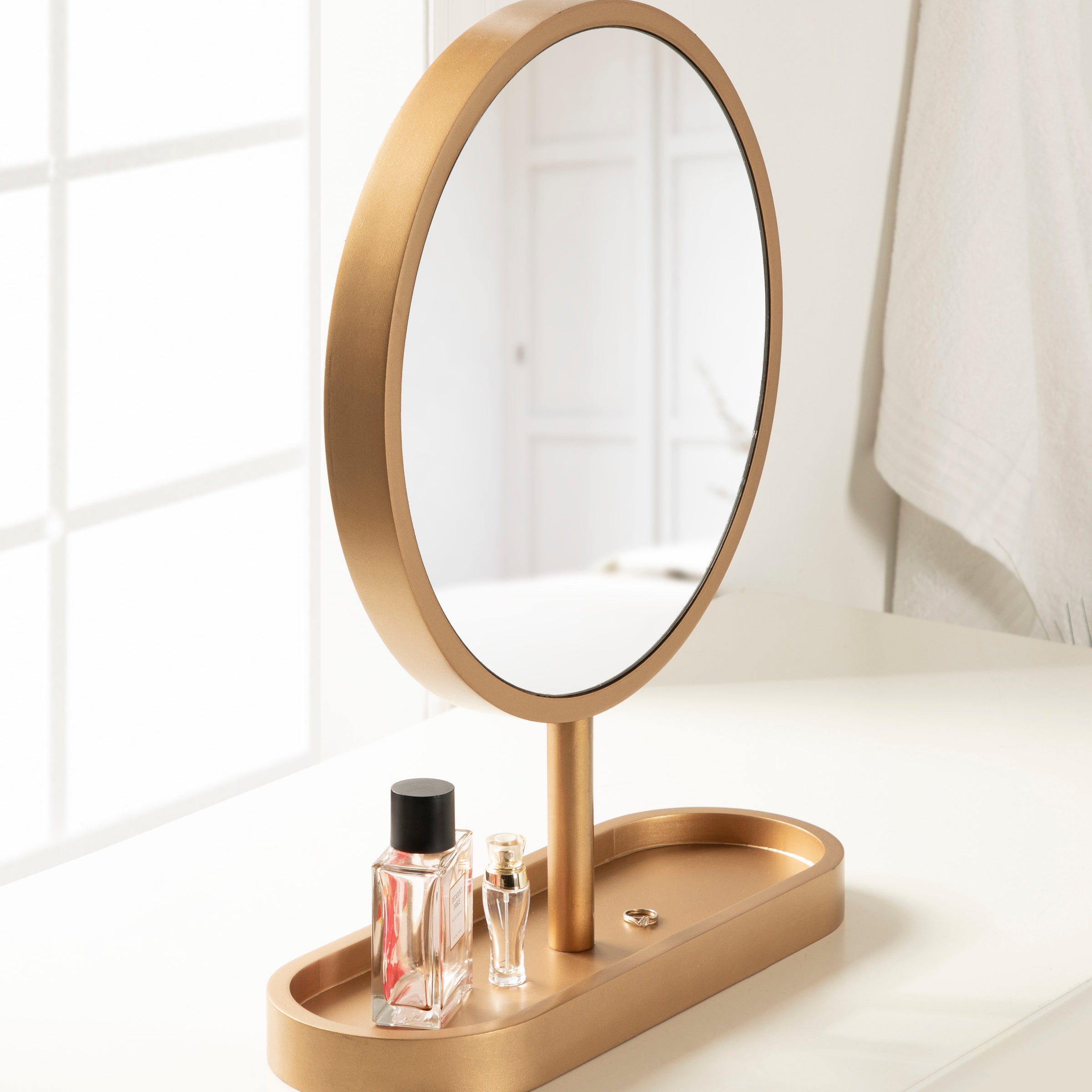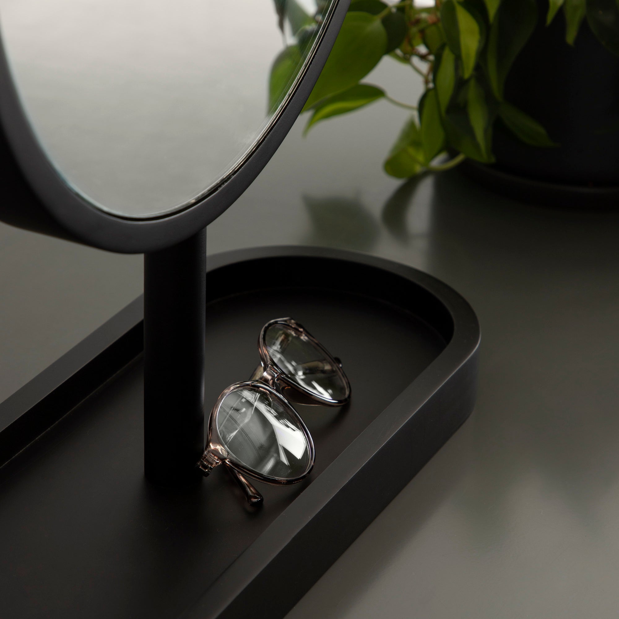 The refreshing Travis tabletop mirror offers a modern design and clean style for any surface of your home. This decor accent features a round, floating mirror connected to a capsule-shaped tray base, combining function with a stylish look. Its wide mirror is fantastic for when you need a last-minute touchup or add vibrancy to your space. The small tray base is open to create an area to catch items like jewelry, makeup, watches, and more. This stylish table accent is fantastic for honing your decorative aesthetic while adding more function to your display areas.
