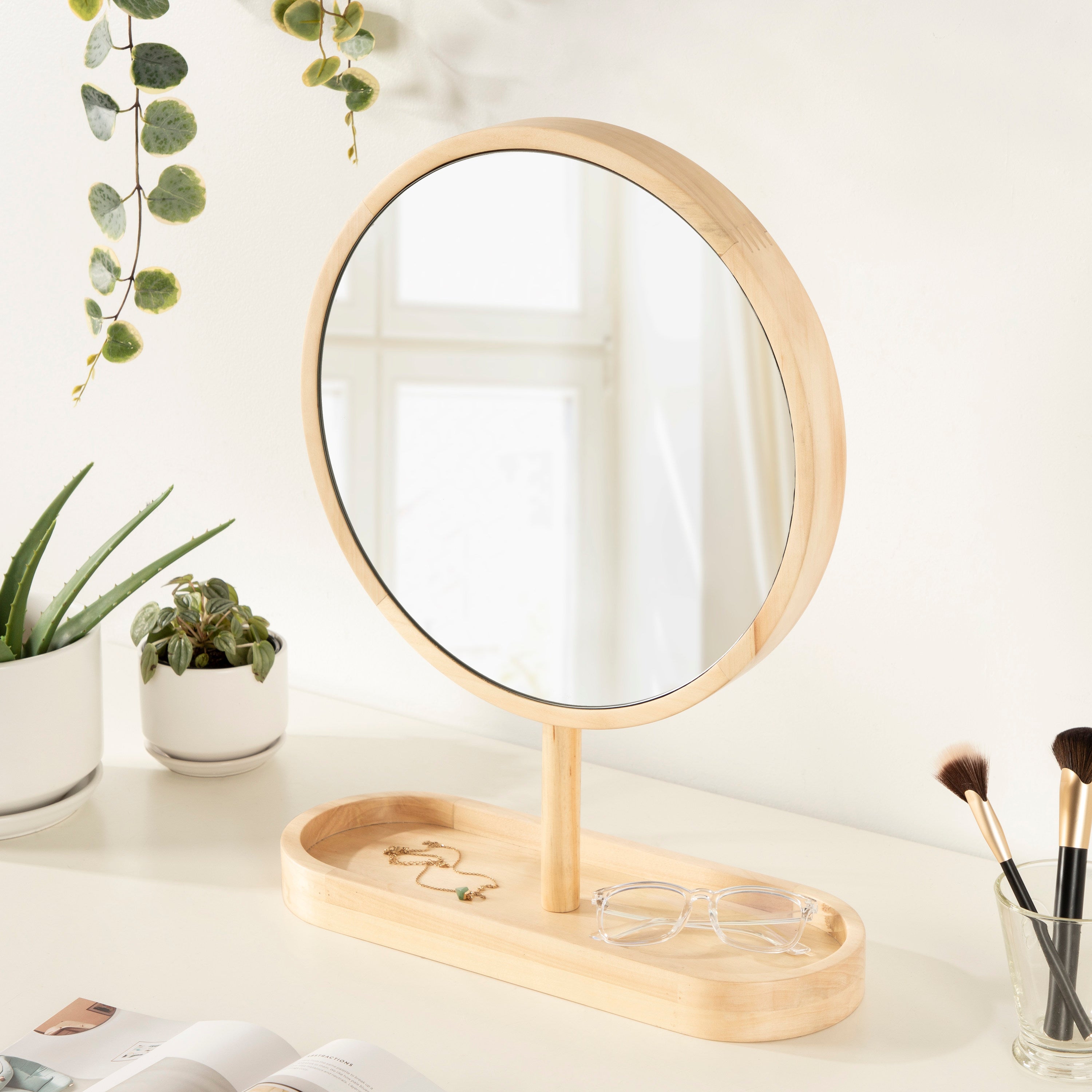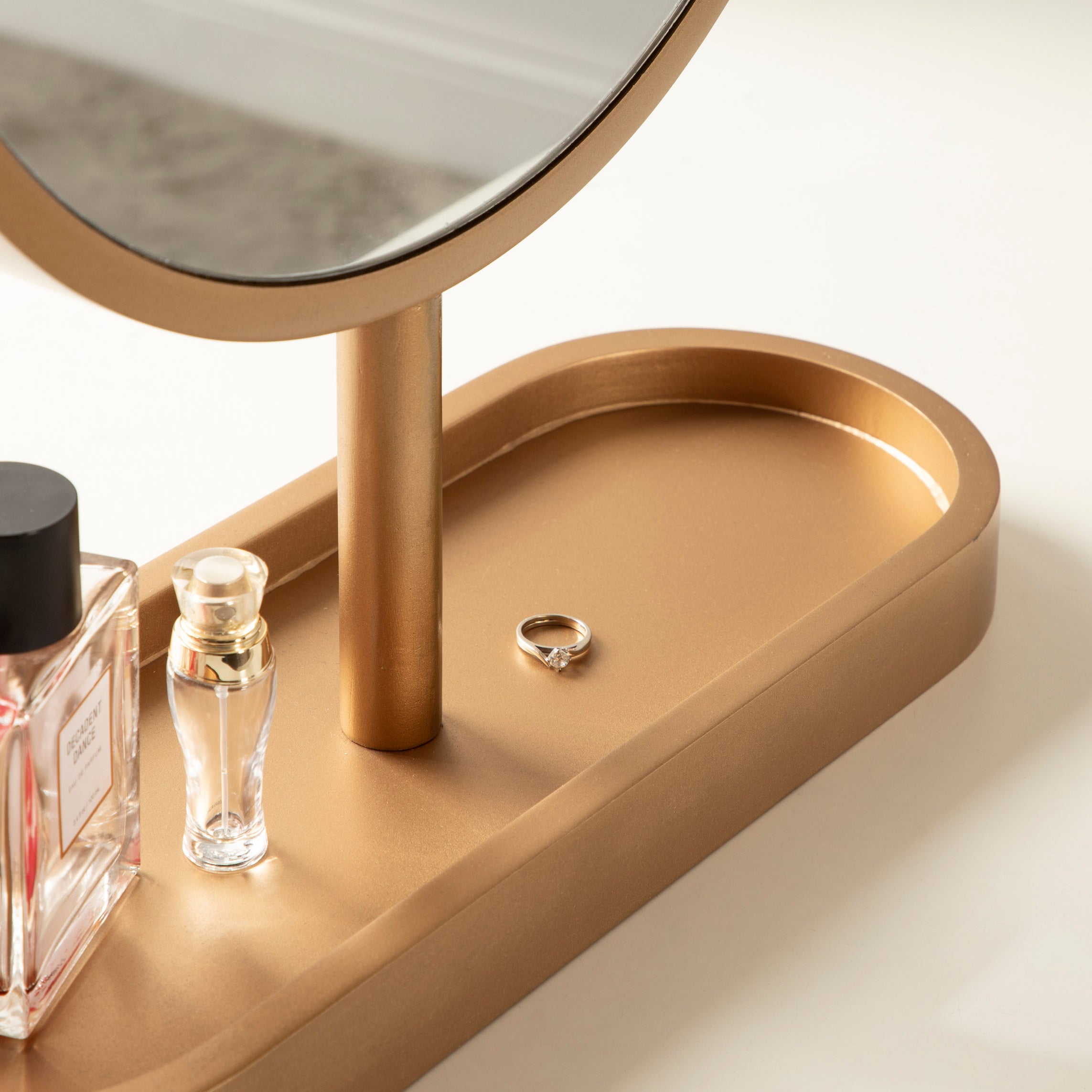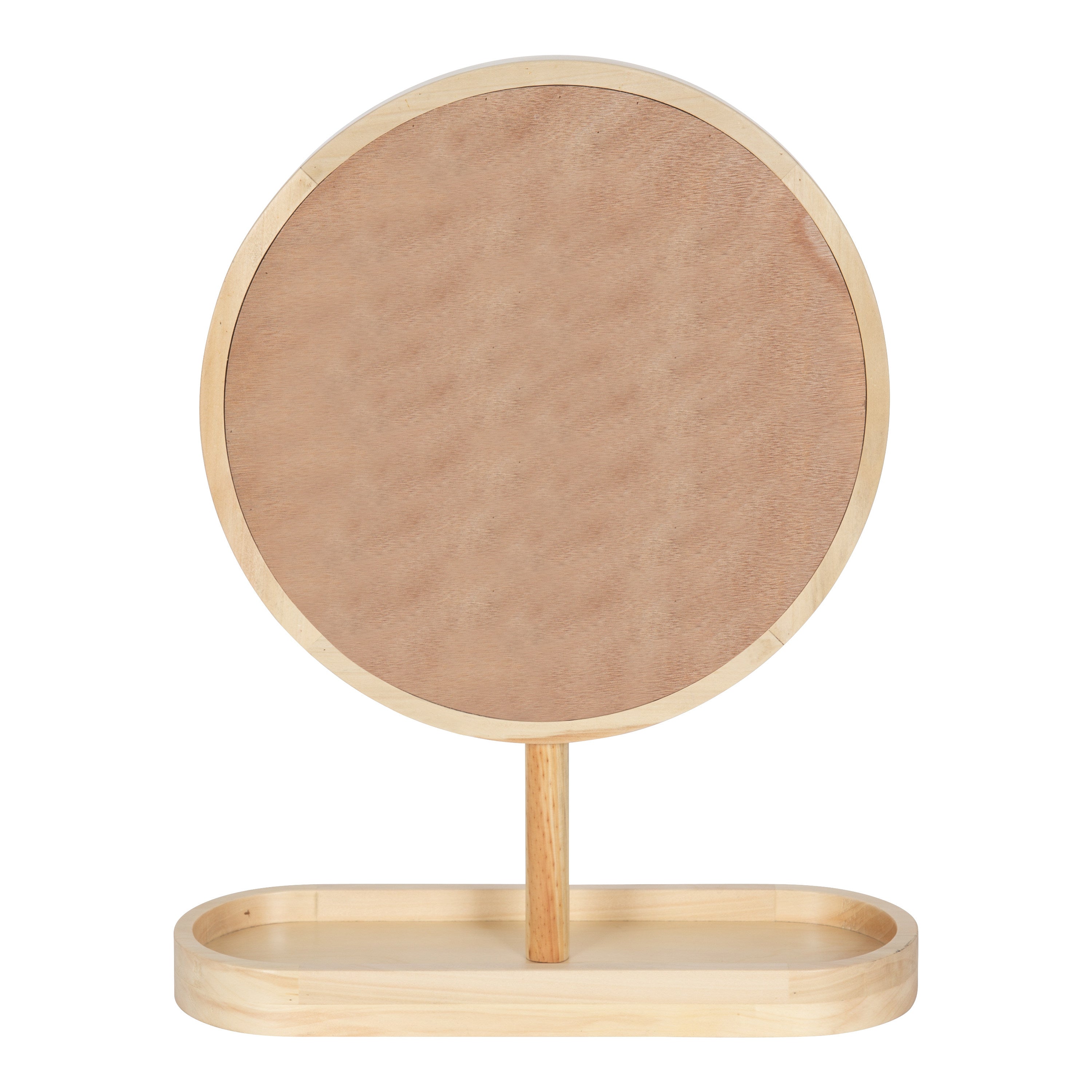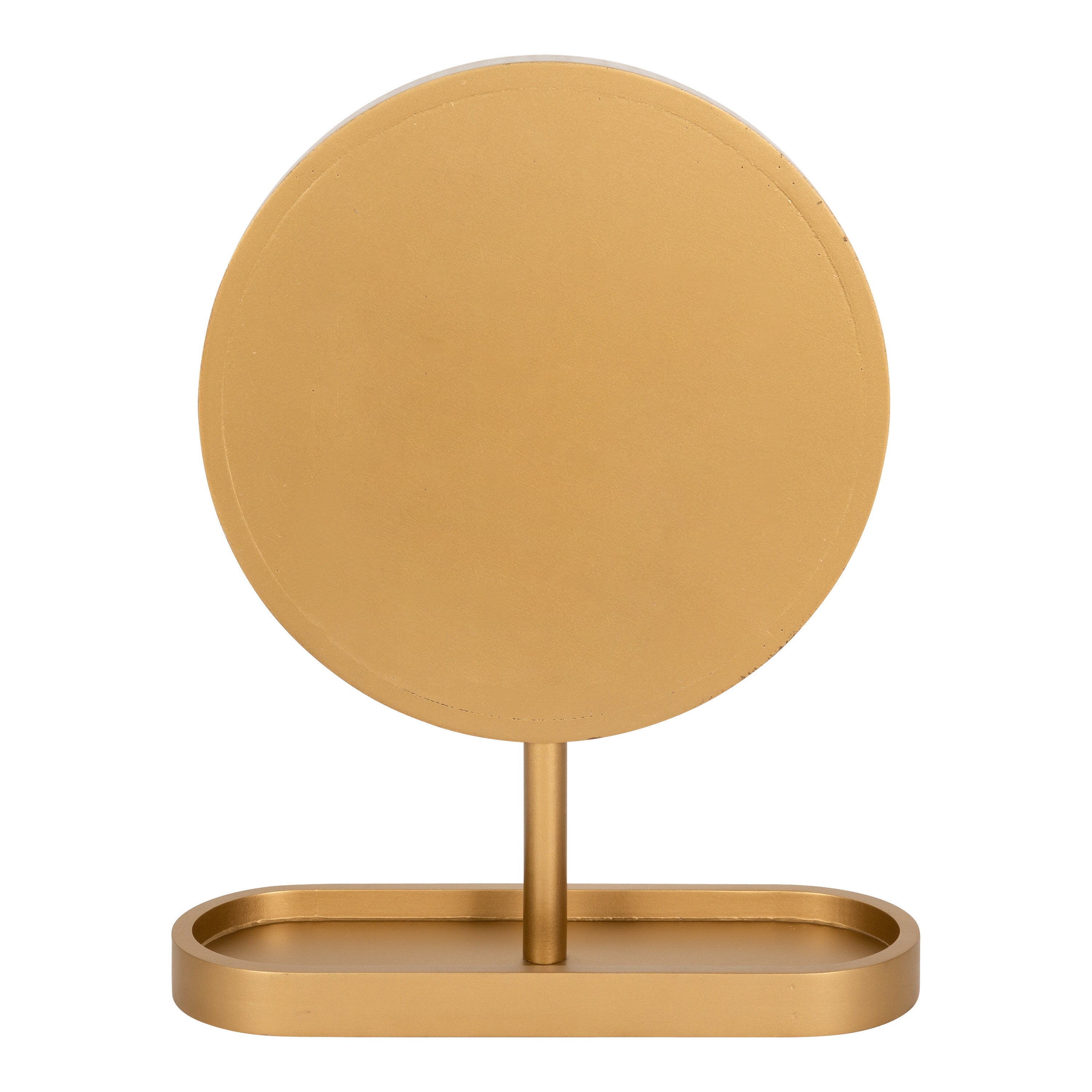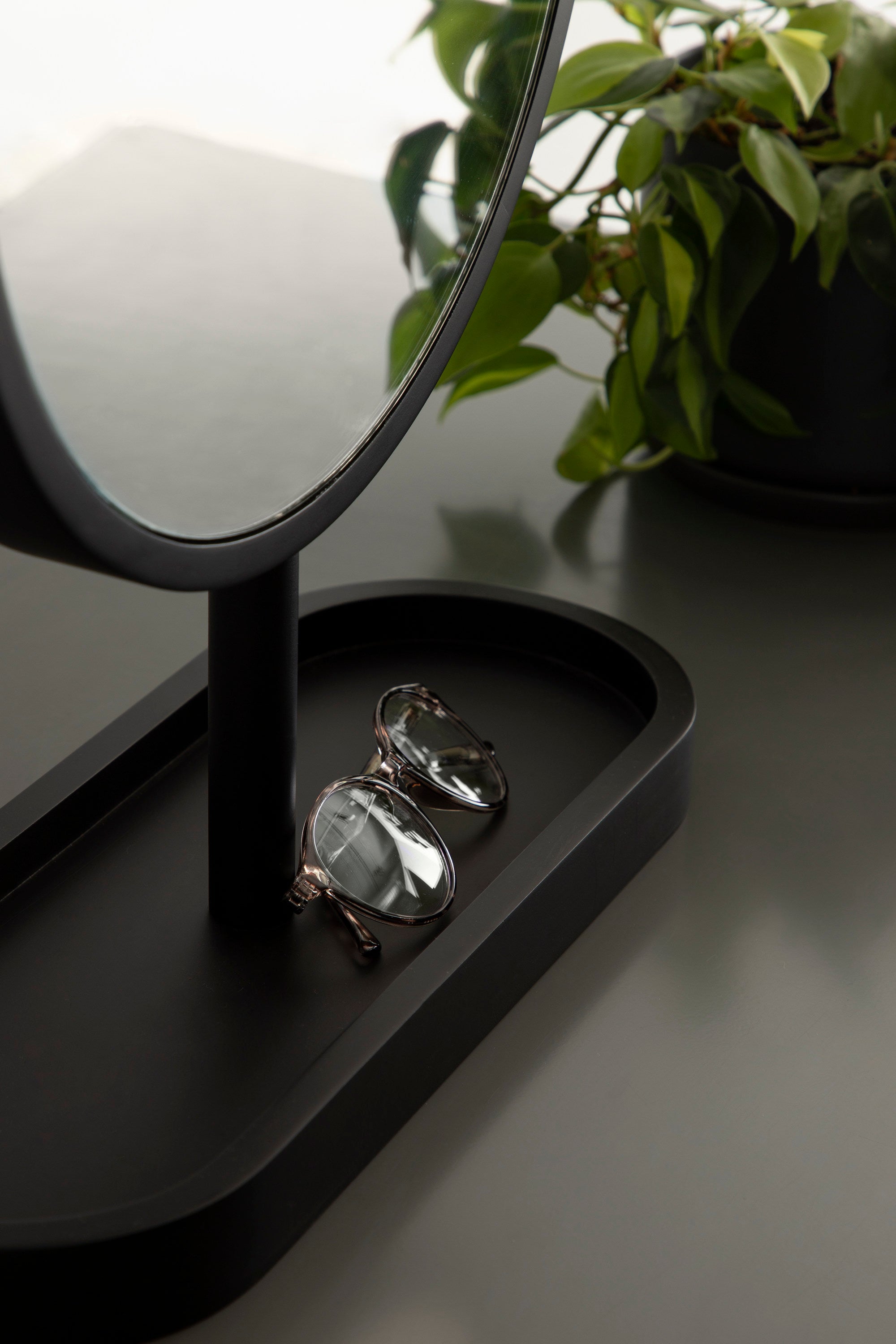 The refreshing Travis tabletop mirror offers a modern design and clean style for any surface of your home. This decor accent features a round, floating mirror connected to a capsule-shaped tray base, combining function with a stylish look. Its wide mirror is fantastic for when you need a last-minute touchup or add vibrancy to your space. The small tray base is open to create an area to catch items like jewelry, makeup, watches, and more. This stylish table accent is fantastic for honing your decorative aesthetic while adding more function to your display areas.