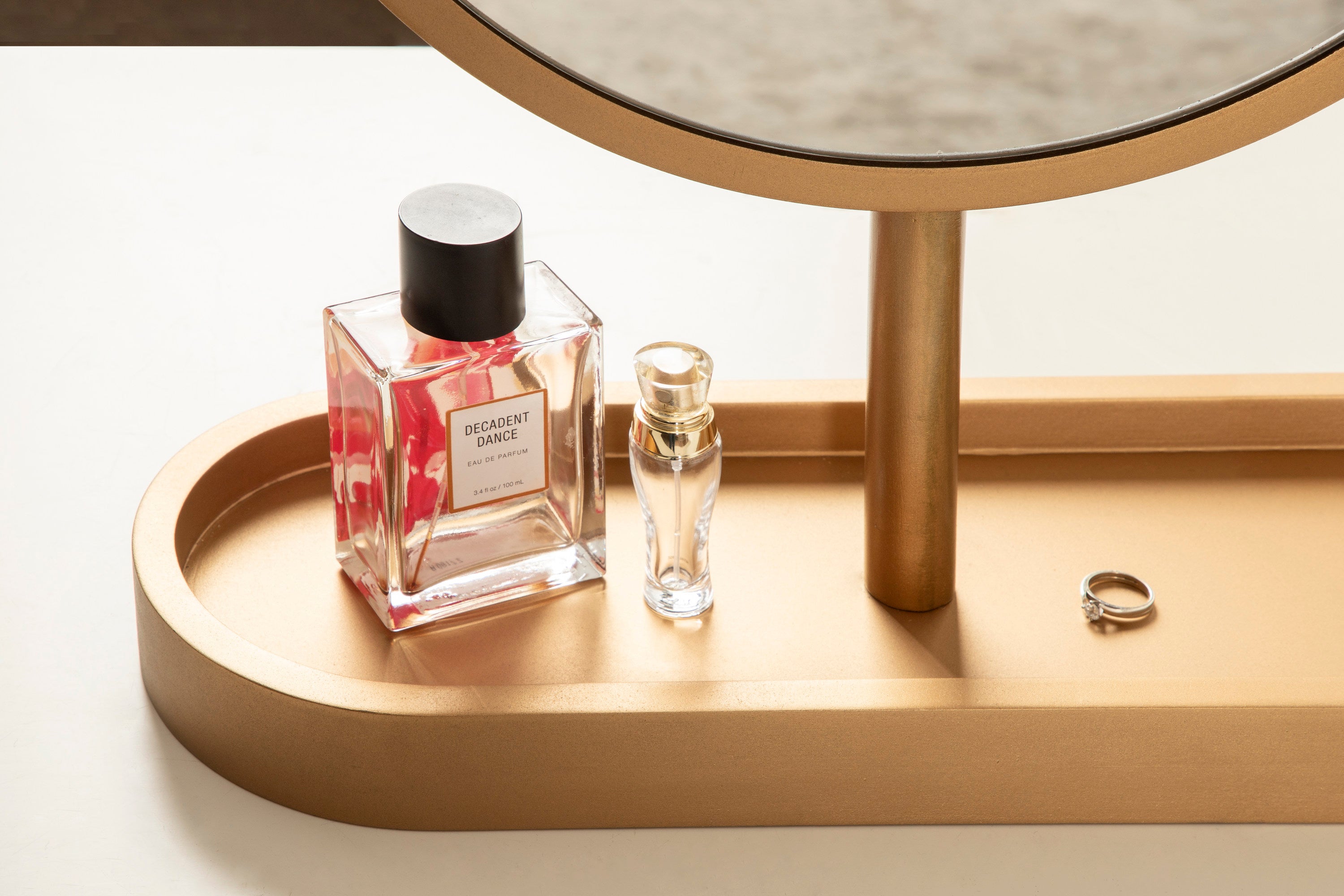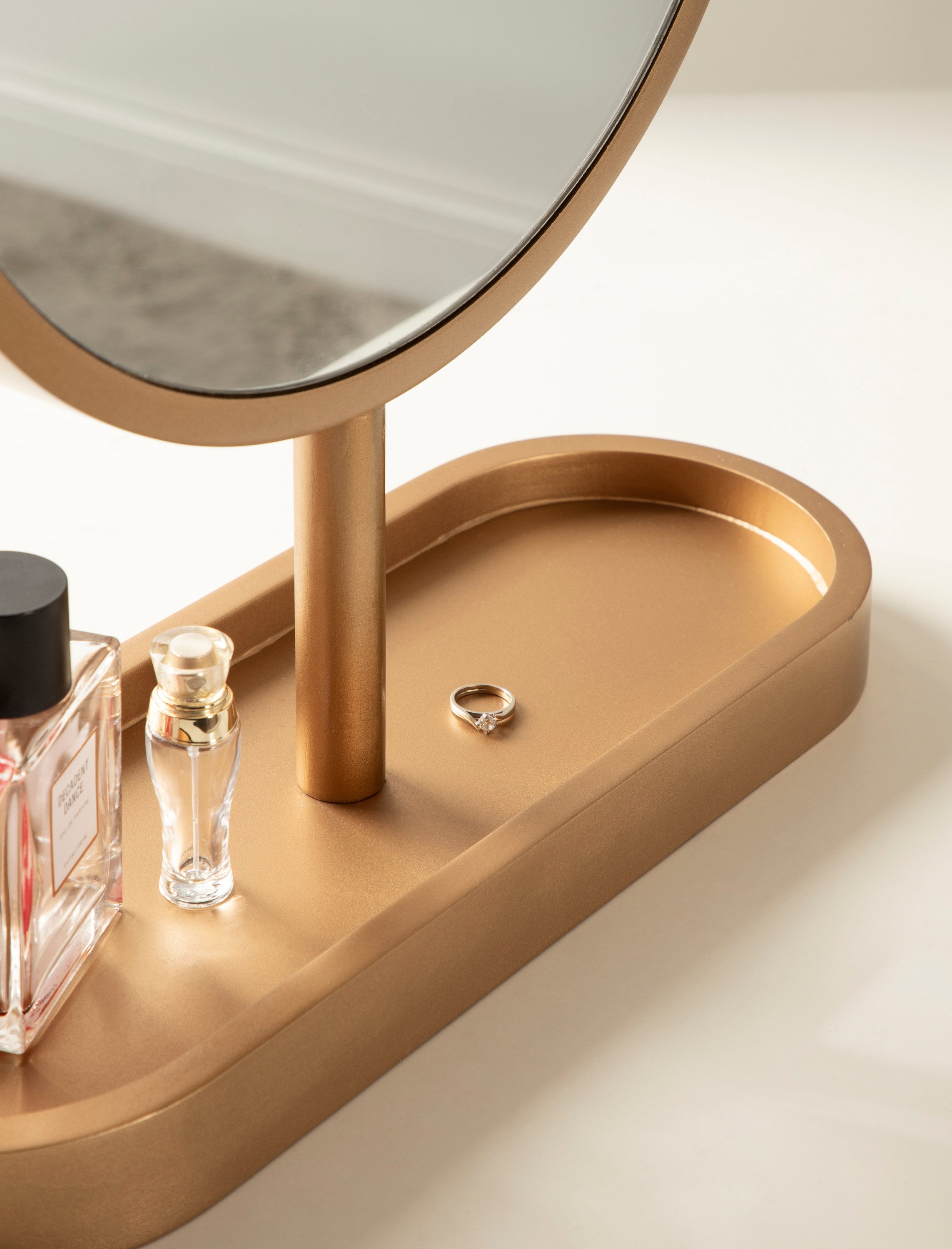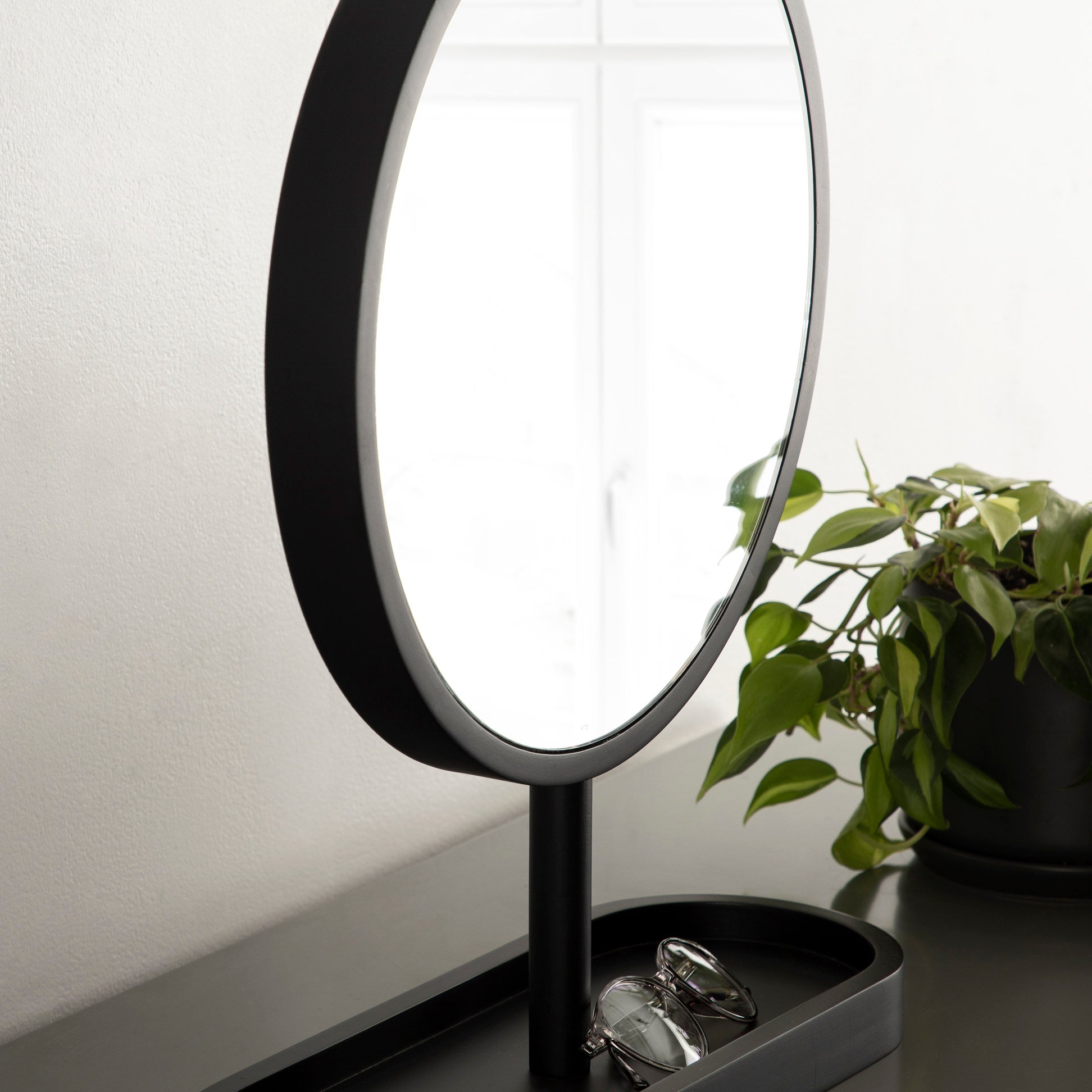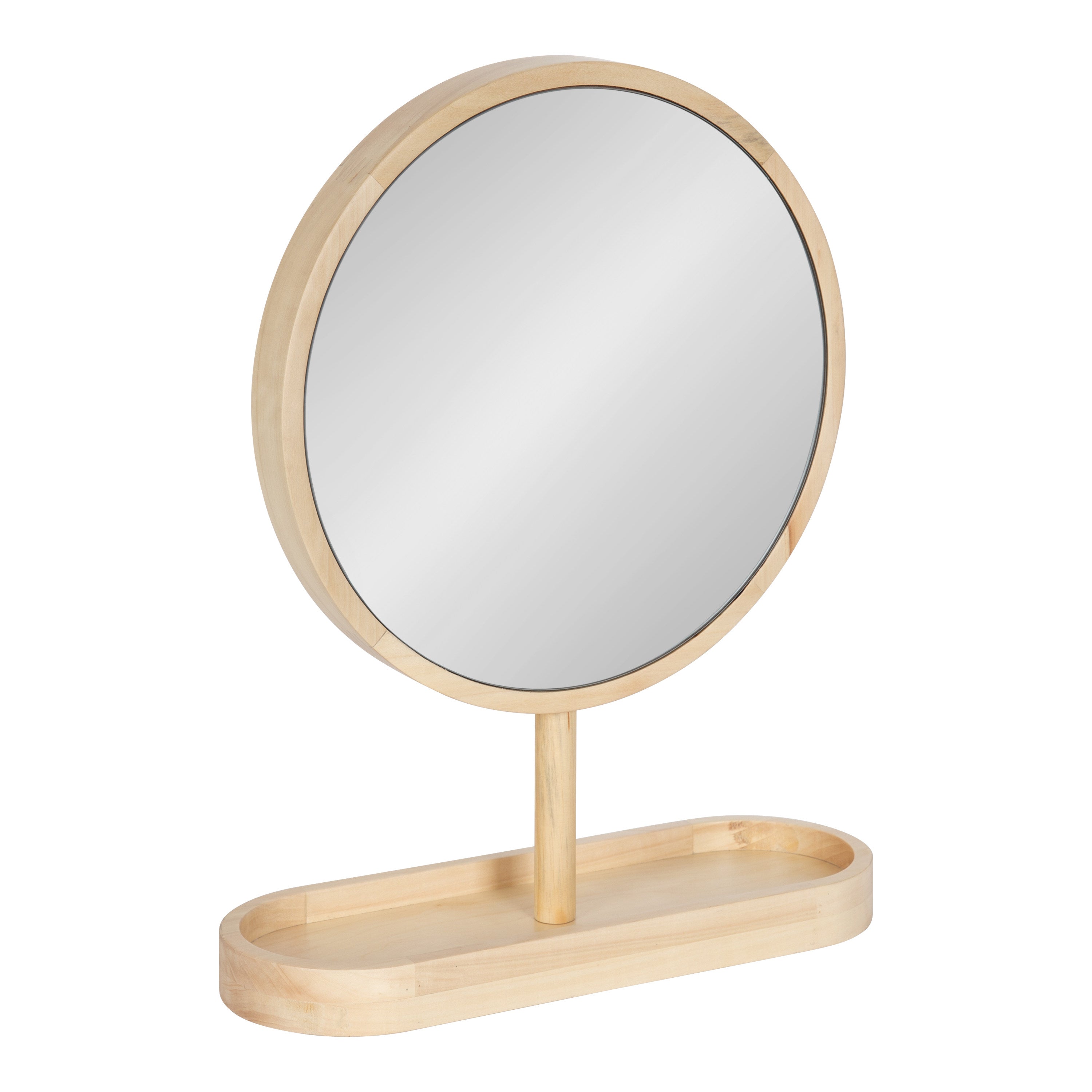The refreshing Travis tabletop mirror offers a modern design and clean style for any surface of your home. This decor accent features a round, floating mirror connected to a capsule-shaped tray base, combining function with a stylish look. Its wide mirror is fantastic for when you need a last-minute touchup or add vibrancy to your space. The small tray base is open to create an area to catch items like jewelry, makeup, watches, and more. This stylish table accent is fantastic for honing your decorative aesthetic while adding more function to your display areas.