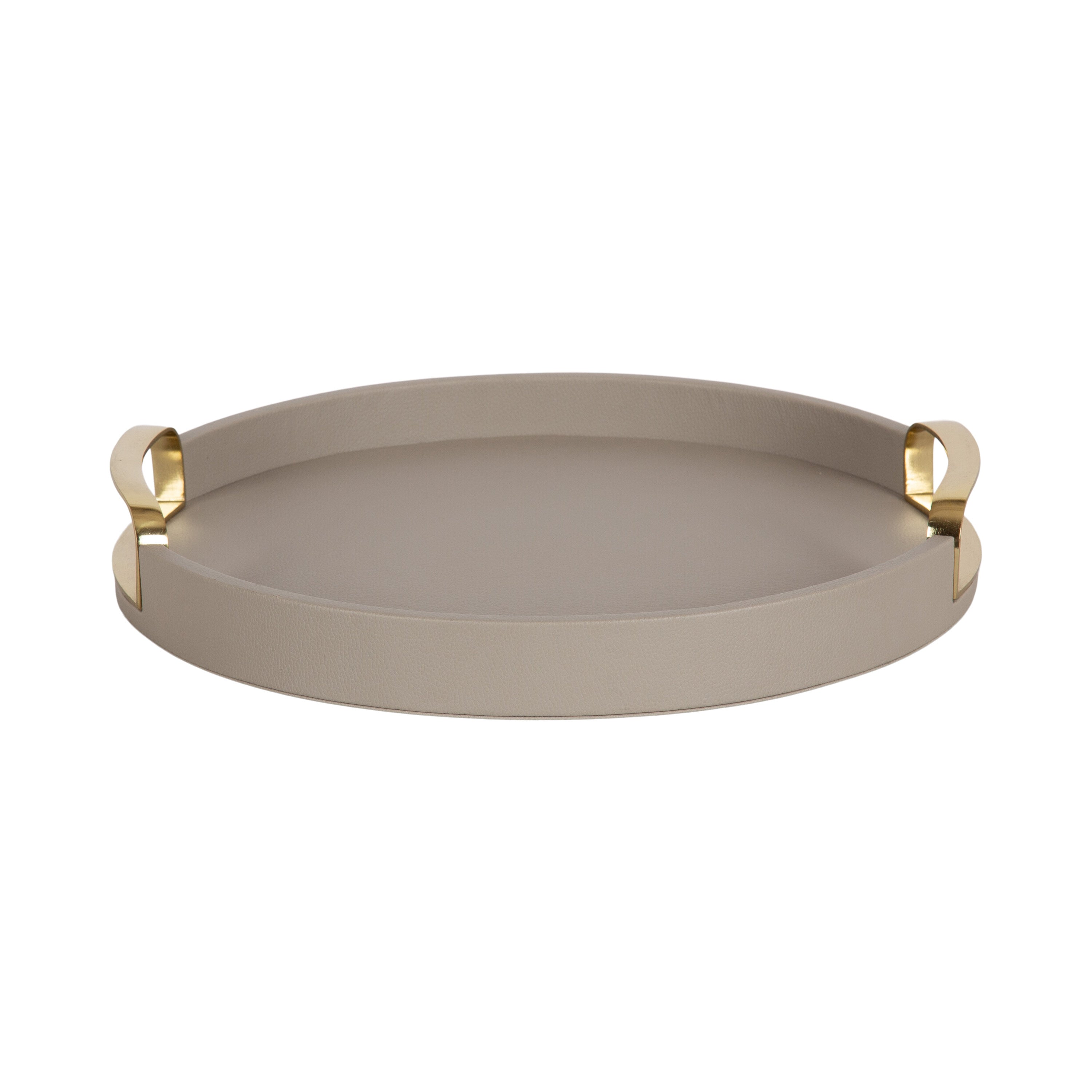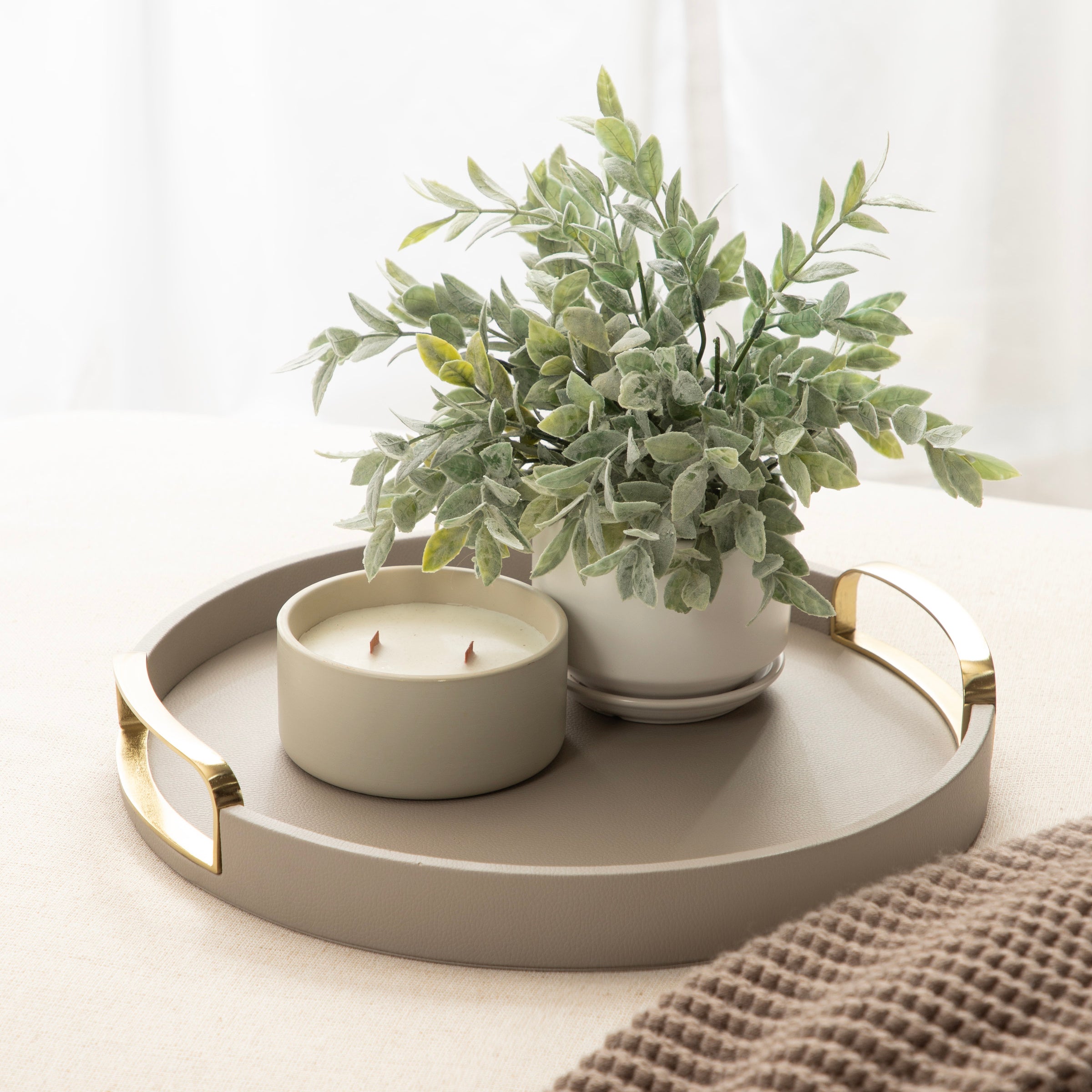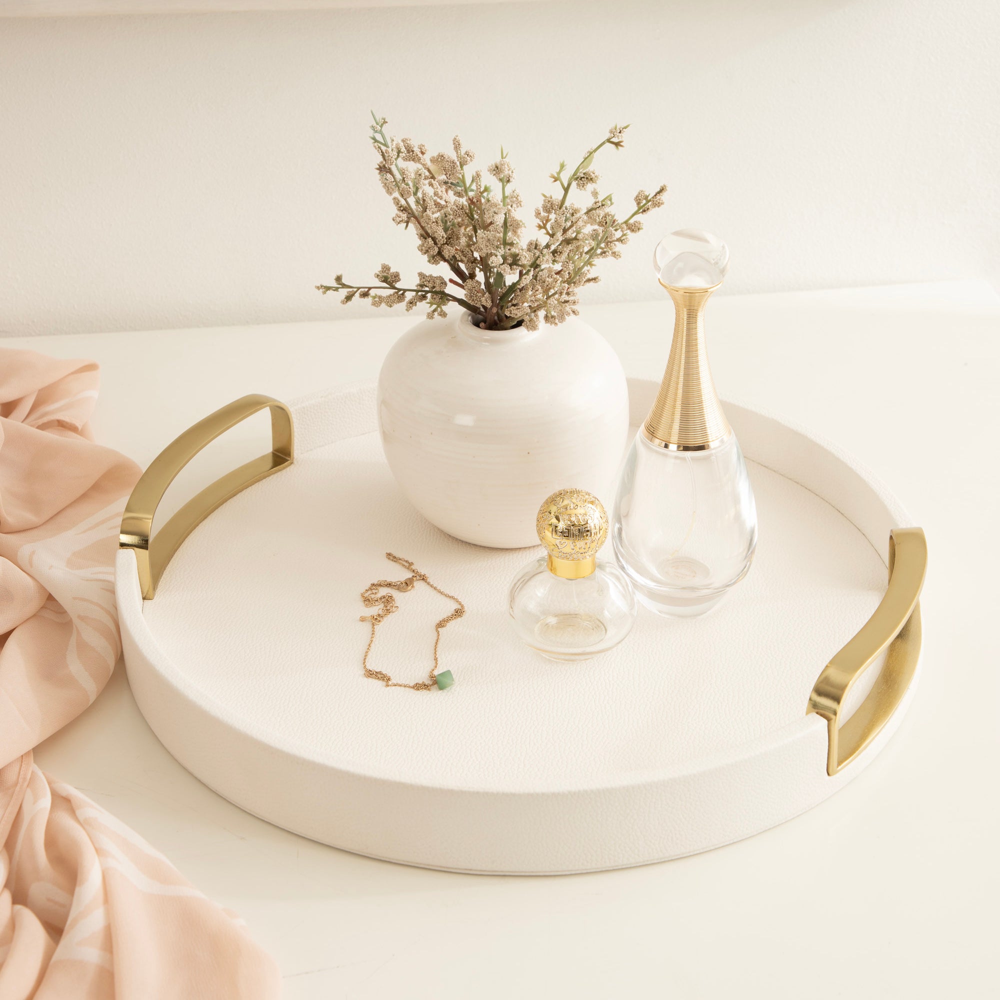 Craft a gorgeous living room ottoman scene with this Valeska vegan leather-wrapped round tray from Kate and Laurel. This marvelous decorative tray boasts a sturdy wooden construction underneath the pebble-textured vegan leather, giving your space a high-quality accent piece that was built to last. The stunning metal handles on the Valeska are both decorative and functional to provide everyday use while still elevating its gorgeous design. Utilize the tray throughout your home in a variety of settings. It provides function as a charming drink station in a kitchen or dining area, a practical catch-all atop an entryway console table, or a coffee table accent tray. Or, showcase it atop your master bedroom vanity for the perfect display tray housing your skincare items, perfumes, or soaps.