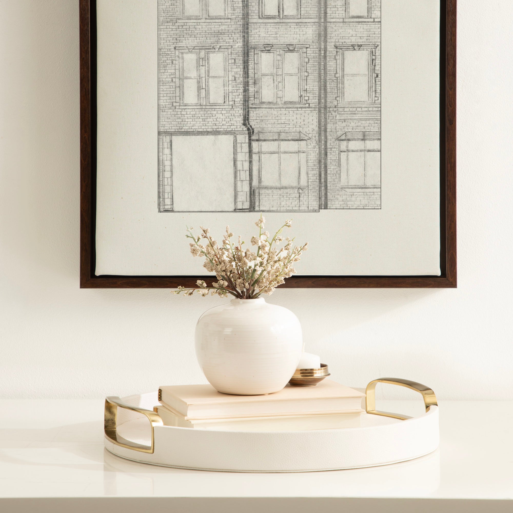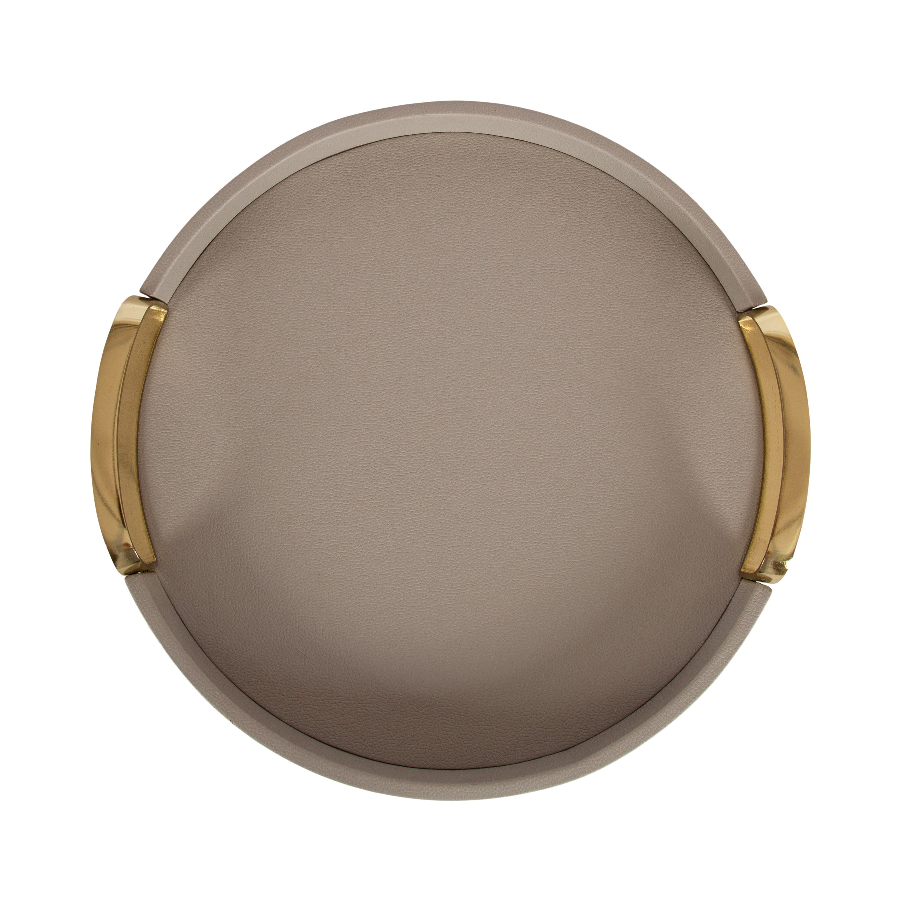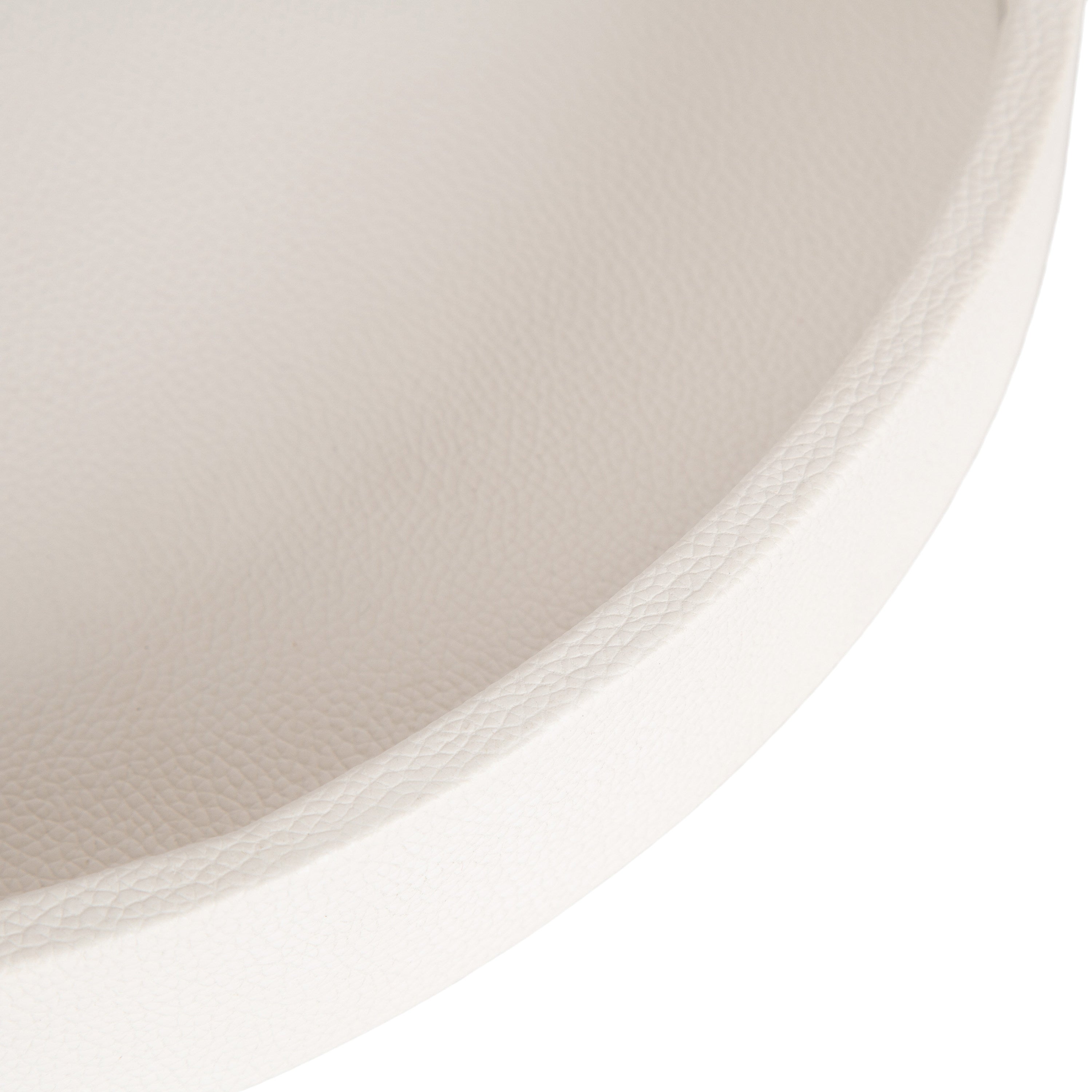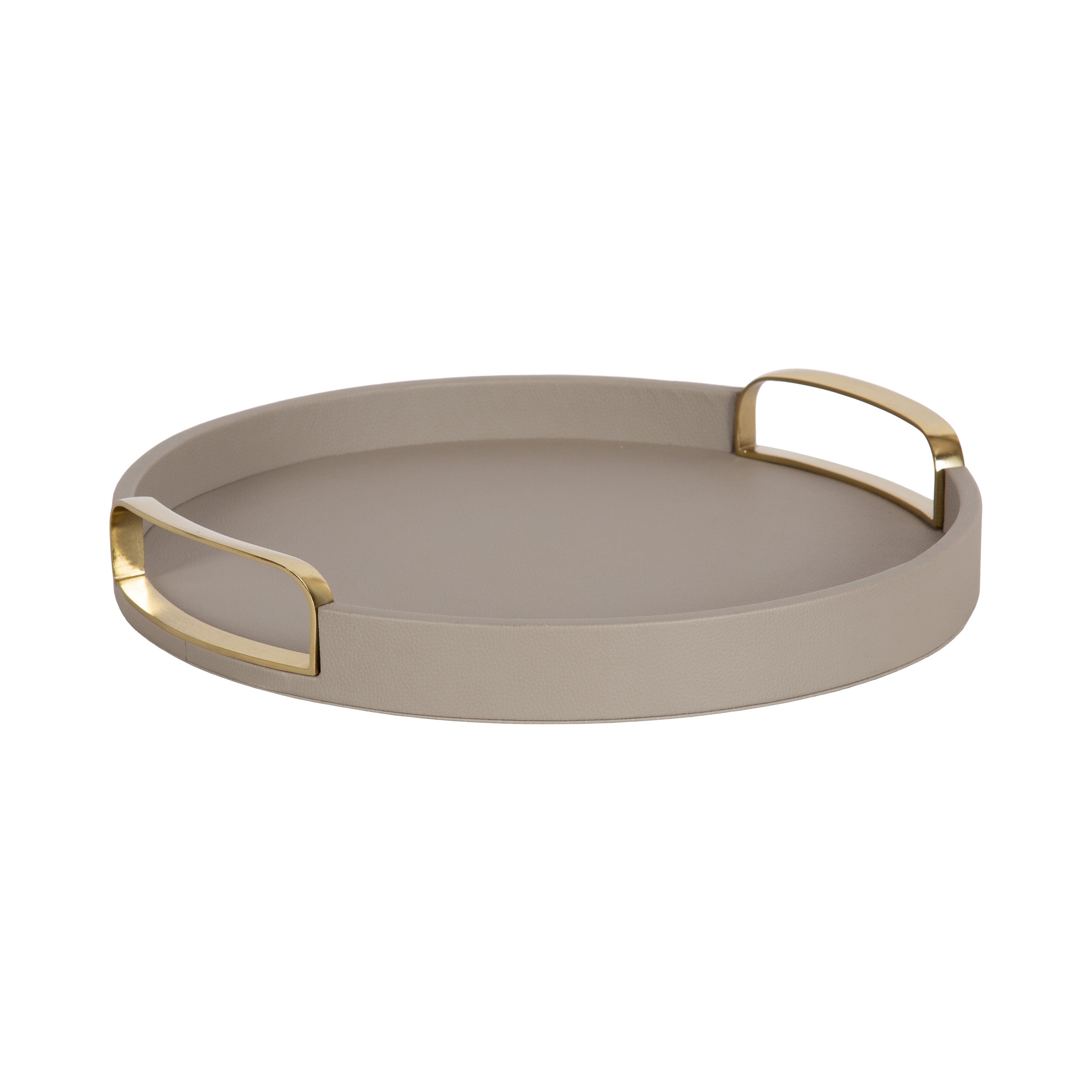 Craft a gorgeous living room ottoman scene with this Valeska vegan leather-wrapped round tray from Kate and Laurel. This marvelous decorative tray boasts a sturdy wooden construction underneath the pebble-textured vegan leather, giving your space a high-quality accent piece that was built to last. The stunning metal handles on the Valeska are both decorative and functional to provide everyday use while still elevating its gorgeous design. Utilize the tray throughout your home in a variety of settings. It provides function as a charming drink station in a kitchen or dining area, a practical catch-all atop an entryway console table, or a coffee table accent tray. Or, showcase it atop your master bedroom vanity for the perfect display tray housing your skincare items, perfumes, or soaps.