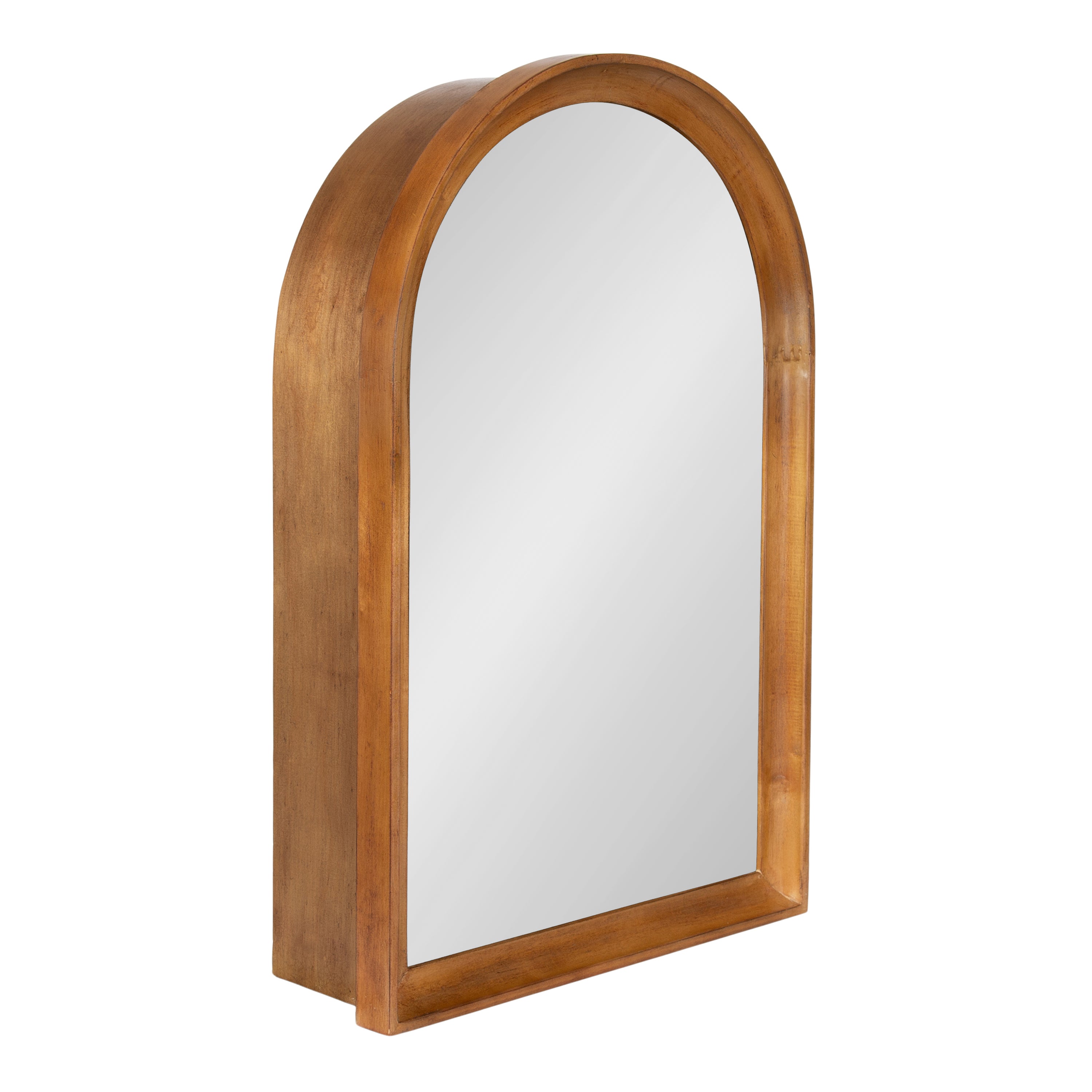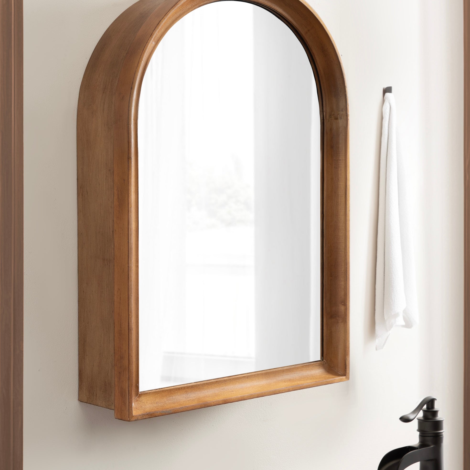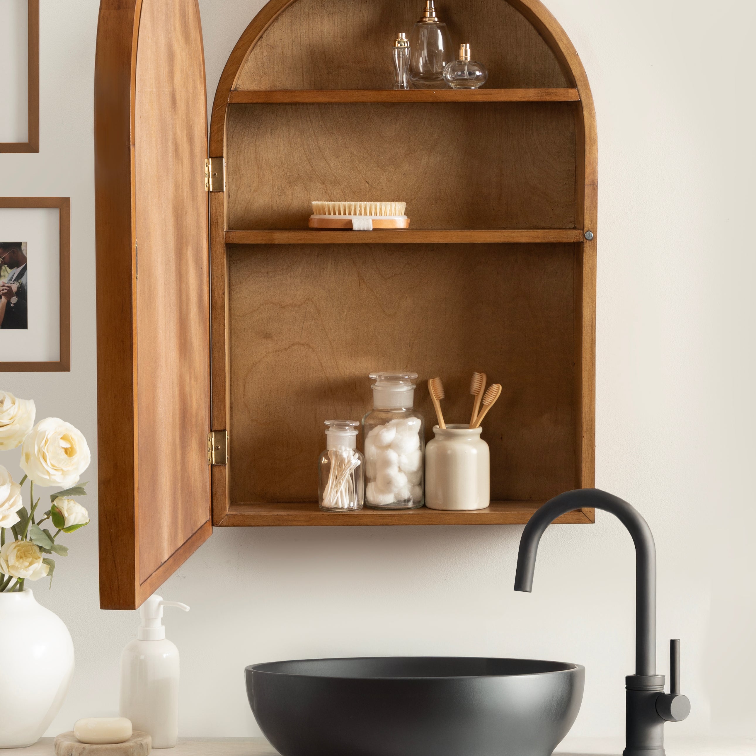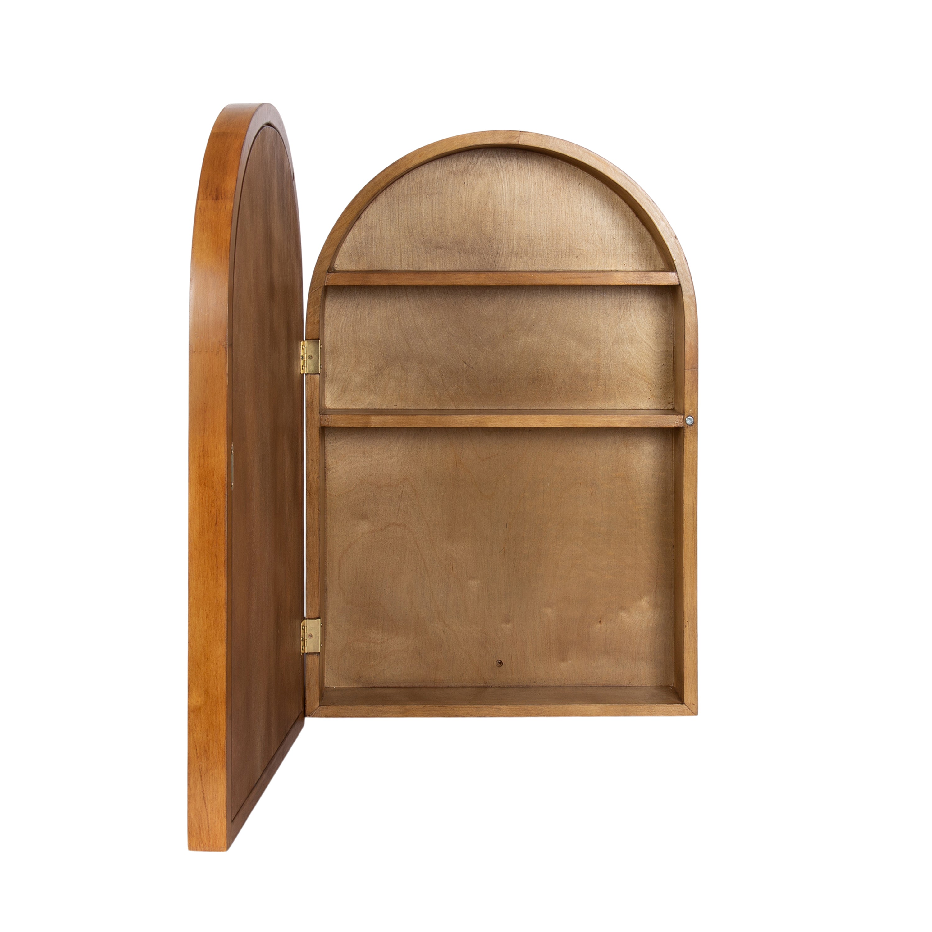 This stunning Hatherleigh wooden medicine cabinet is the perfect blend of style and functionality for your bathroom. The cabinet features a high-quality mirror on its front and a charming arched shape. Inside, you'll find ample storage space, perfect for organizing toiletries, medications, and other essentials. This functional vanity cabinet is crafted from durable wooden materials with natural birch veneer for a refined look. The cabinet's compact design allows it to be mounted above your sink or over the toilet, maximizing your bathroom's space without sacrificing style. It also includes magnetic closures on the doors to ensure that it stays closed. Crafted with durability in mind, the frame of the Hatherleigh cabinet is crafted from sturdy wooden material for an organic look and feel. Elevate your bathroom's functionality and aesthetic with this beautiful, practical cabinet.