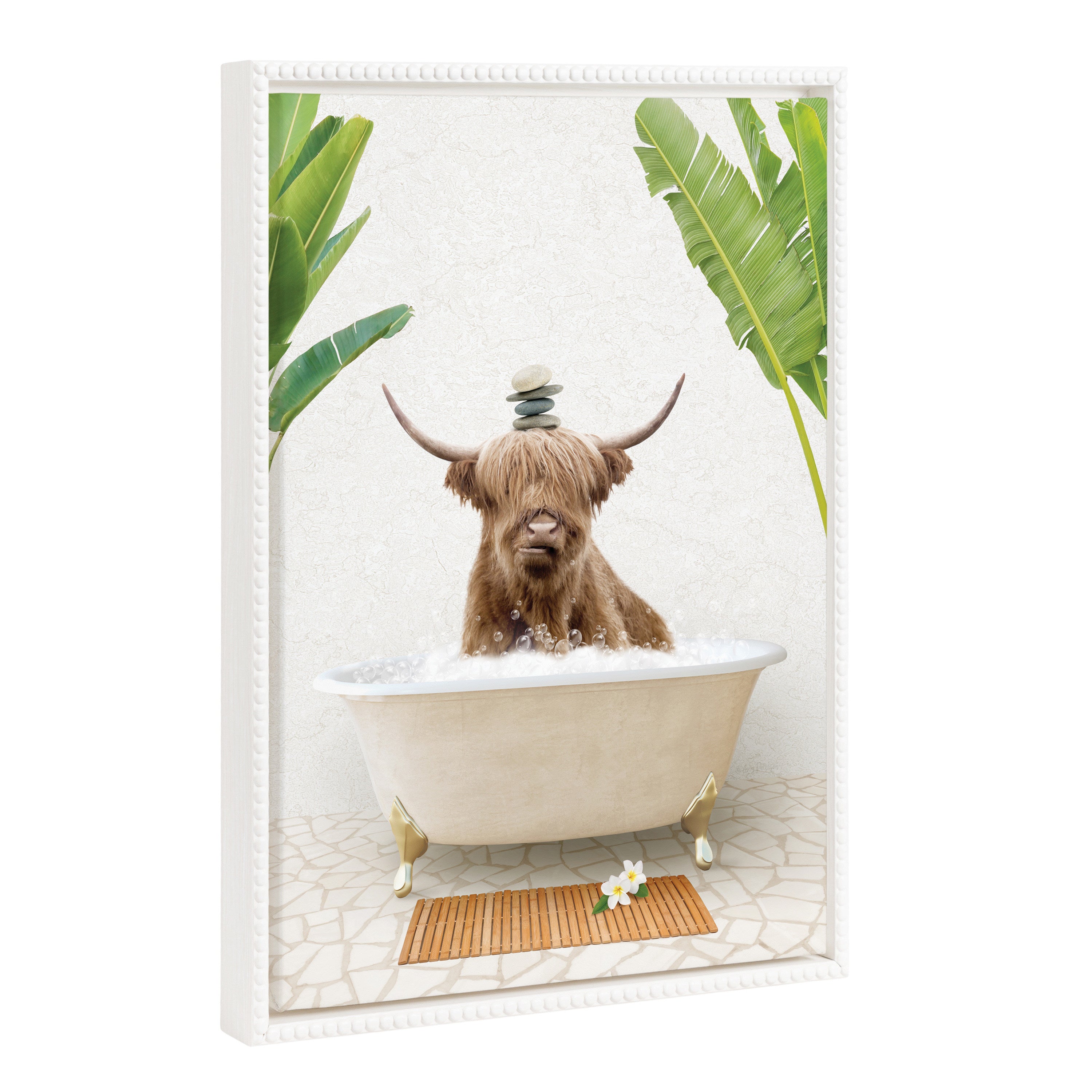 This artwork features a cute cow in a bathtub surrounded by stacked rocks, adding a touch of whimsy and contemporary charm to your space. Printed and framed in the USA in Waunakee, Wisconsin, this vintage beaded framed floating canvas art will be a pleasure to look at every day in your living room, bedroom, office, or any room in the home. This art also makes an excellent gift for birthdays, holidays, or house-warming parties. Printed on gallery-wrapped canvas and framed with a lightweight polystyrene frame, this wall art is easy to display on the wall.