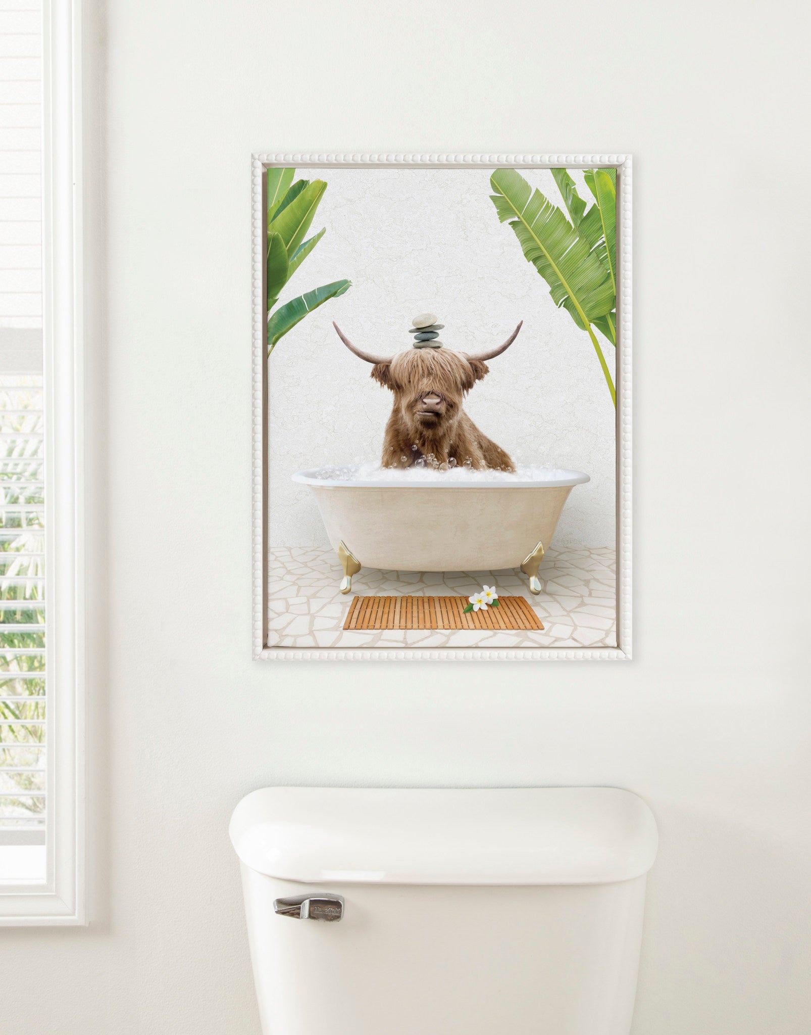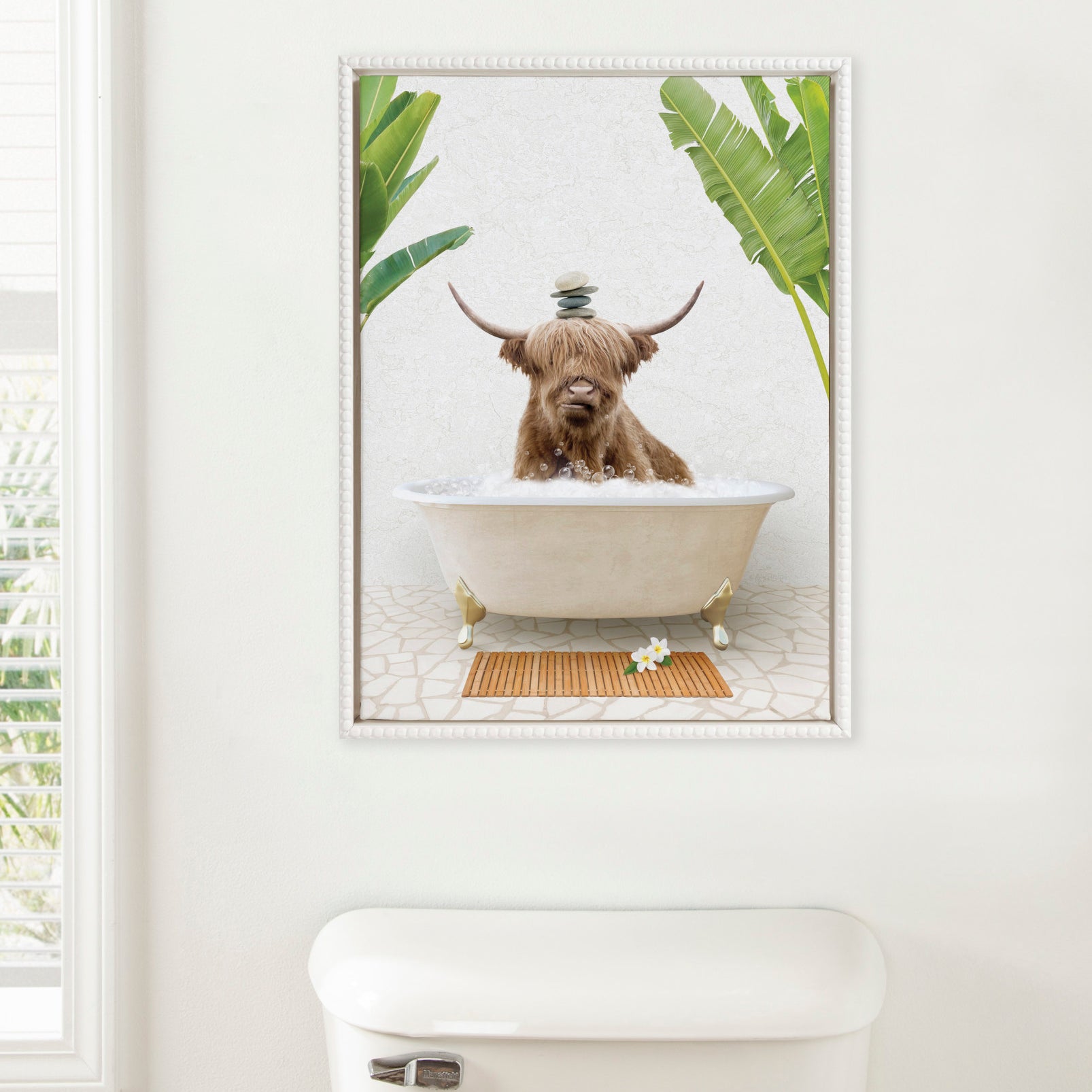 Sylvie Beaded Highland Cow and Stacked Rocks Bali Bath Framed Canvas by Amy Peterson