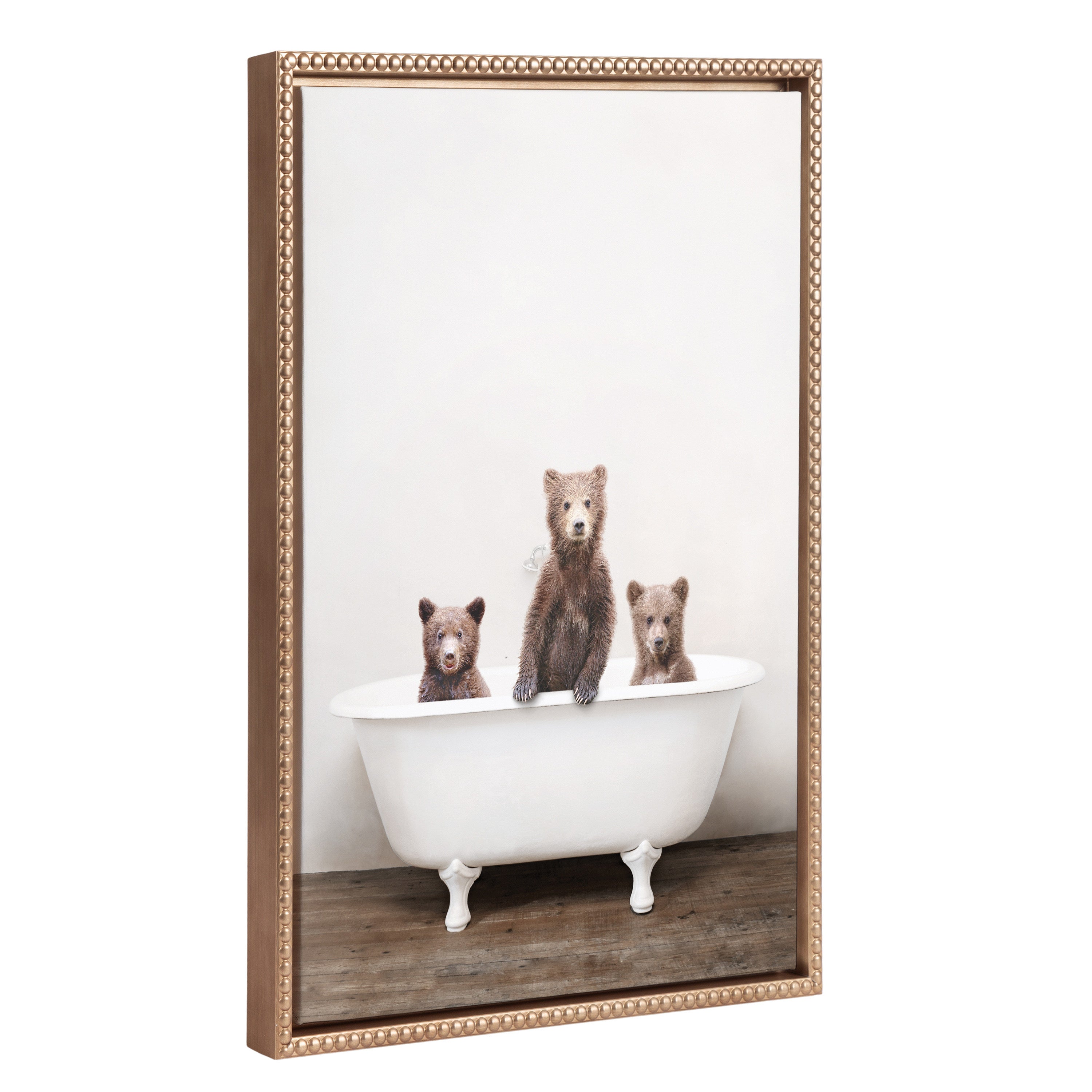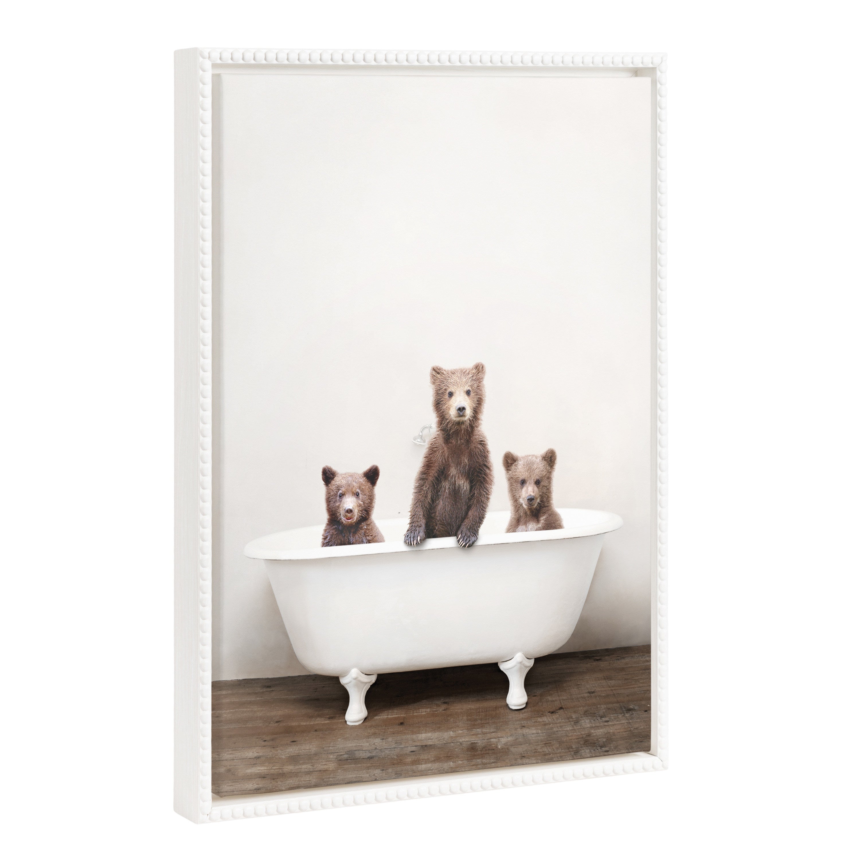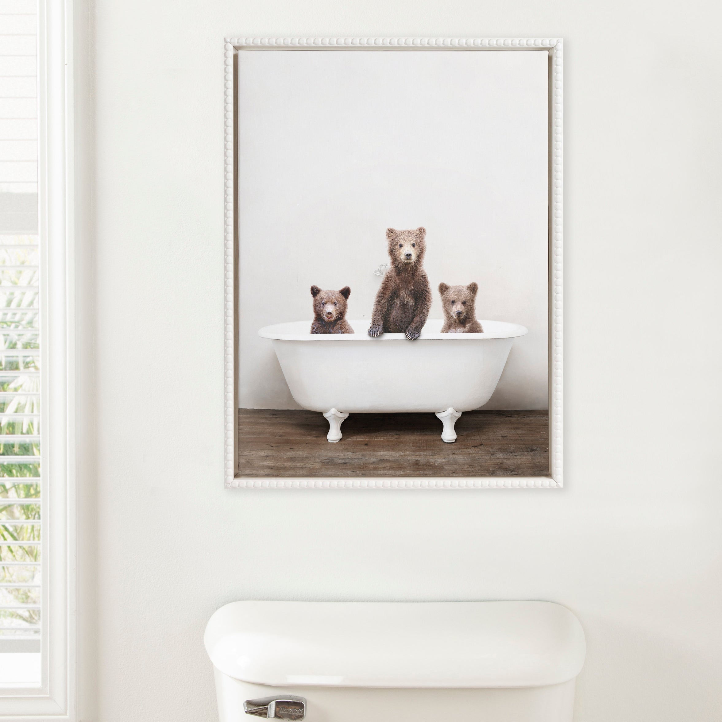 Show off your love of animals and make your guests smile with this humorous portrait of 3 baby bear cubs in a bubble bath. Printed and framed in the USA in Waunakee, Wisconsin, this vintage beaded framed floating canvas art will be a pleasure to look at every day in your living room, bedroom, office, or any room in the home. This art also makes an excellent gift for birthdays, holidays, or house-warming parties. Printed on gallery-wrapped canvas and framed with a lightweight polystyrene frame, this wall art is easy to display on the wall.