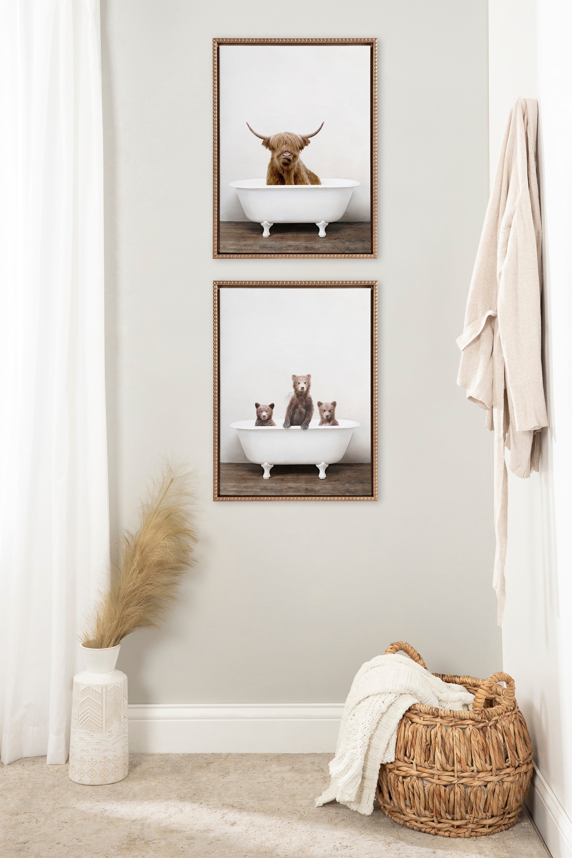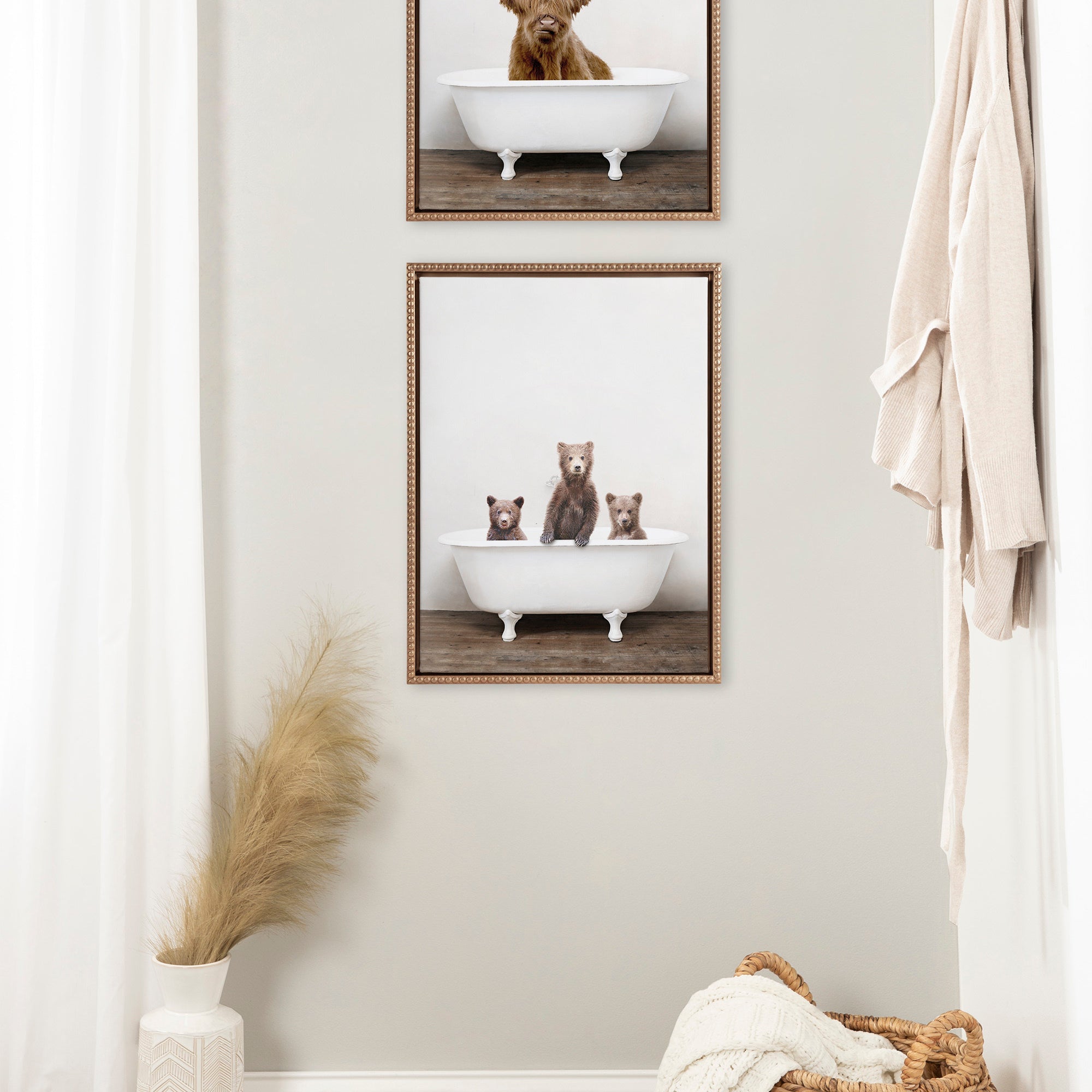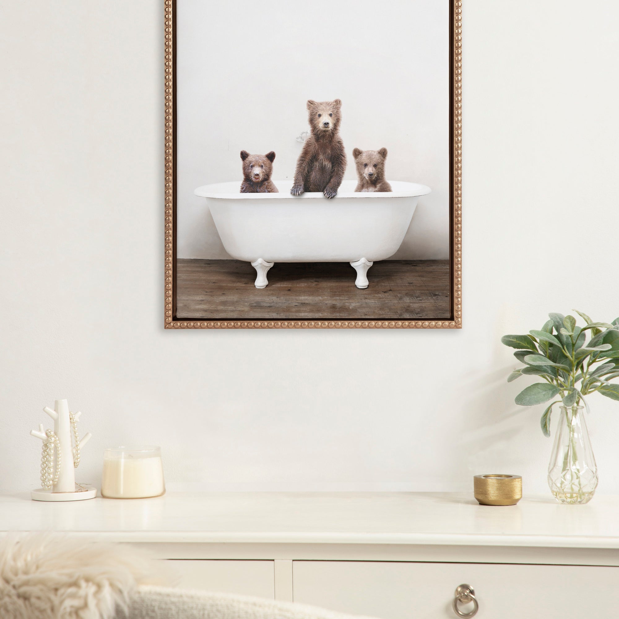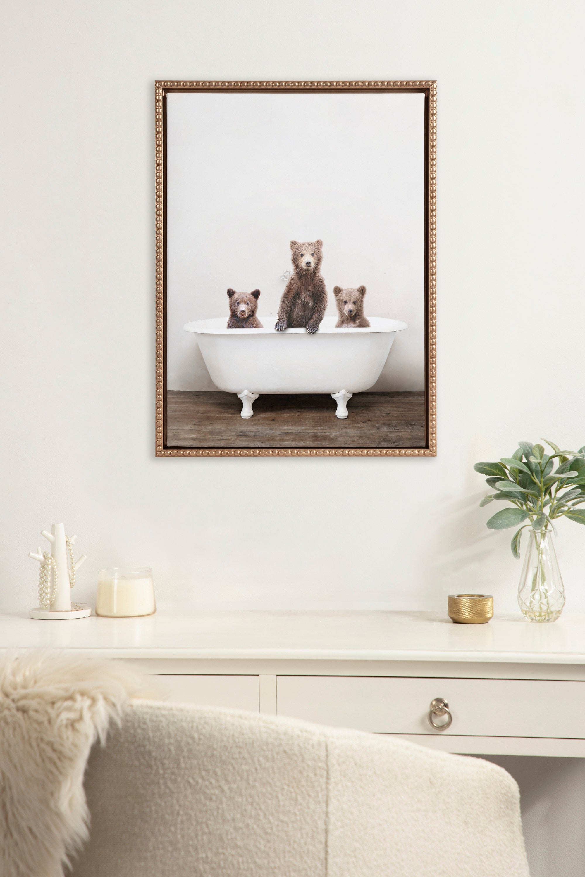 Show off your love of animals and make your guests smile with this humorous portrait of 3 baby bear cubs in a bubble bath. Printed and framed in the USA in Waunakee, Wisconsin, this vintage beaded framed floating canvas art will be a pleasure to look at every day in your living room, bedroom, office, or any room in the home. This art also makes an excellent gift for birthdays, holidays, or house-warming parties. Printed on gallery-wrapped canvas and framed with a lightweight polystyrene frame, this wall art is easy to display on the wall.