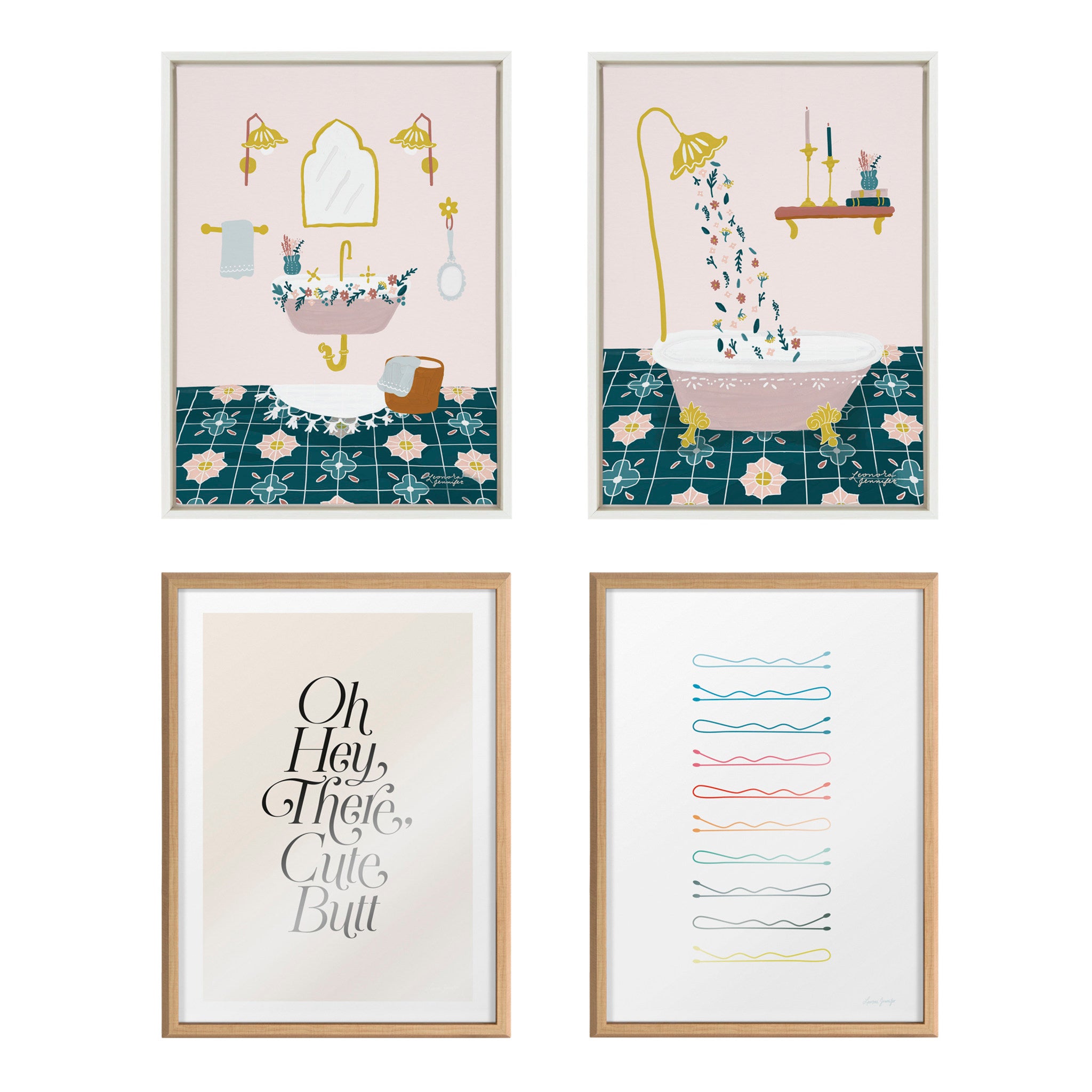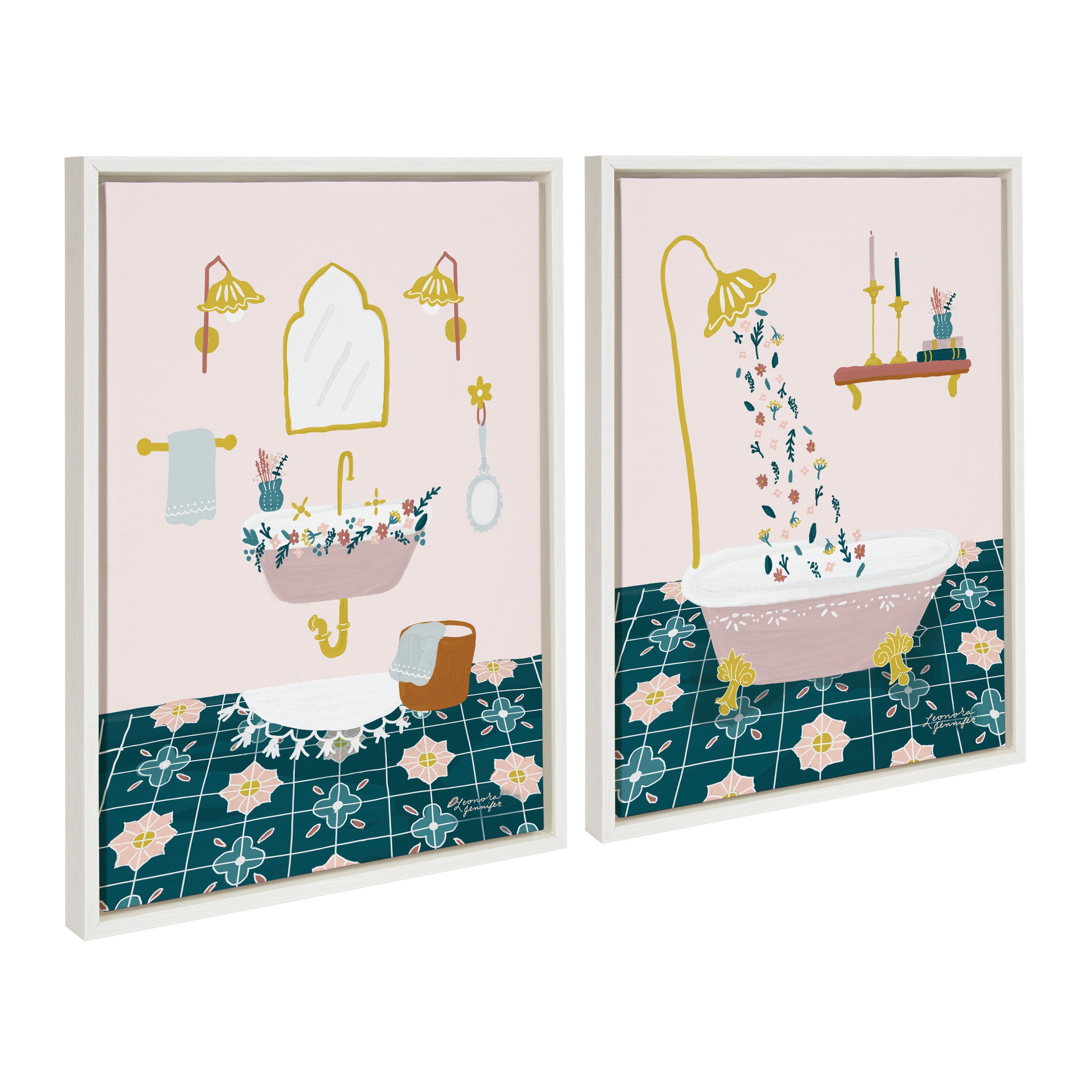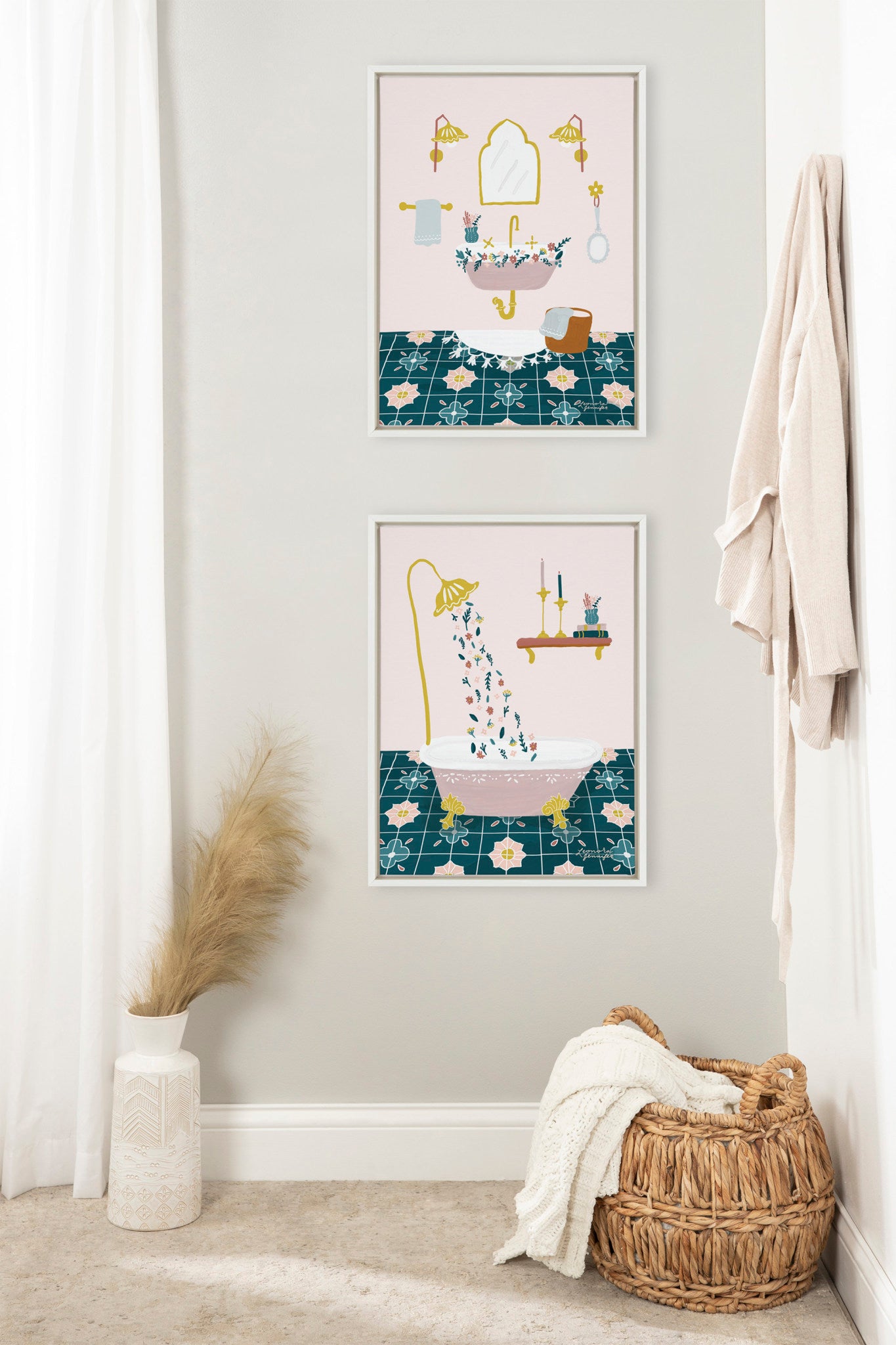 Provide your space with a unique floral bathroom scene with this lovely art set by Leonora Jennifer Benza of Yellow Heart Art. Printed and framed in the USA in Waunakee, Wisconsin, this framed floating canvas art set will be a pleasure to look at every day in your living room, bedroom, office, or any room in the home. This curated set also makes an excellent gift for birthdays, holidays, or house-warming parties. Printed on gallery-wrapped canvas and framed with a lightweight polystyrene frame, this wall art set is easy to display on the wall.