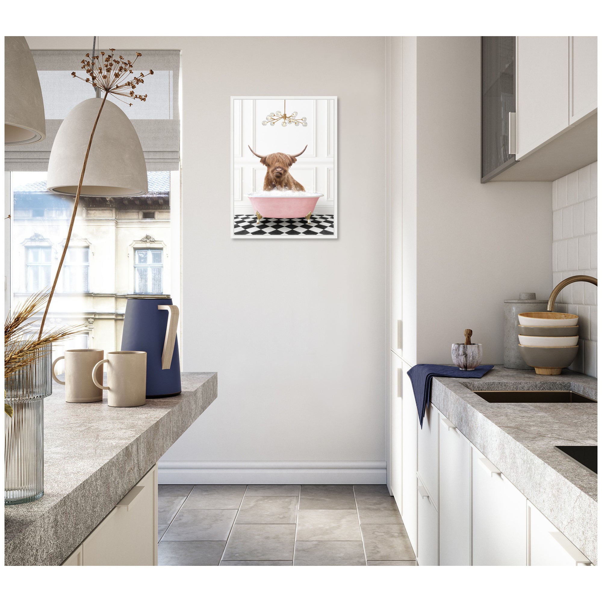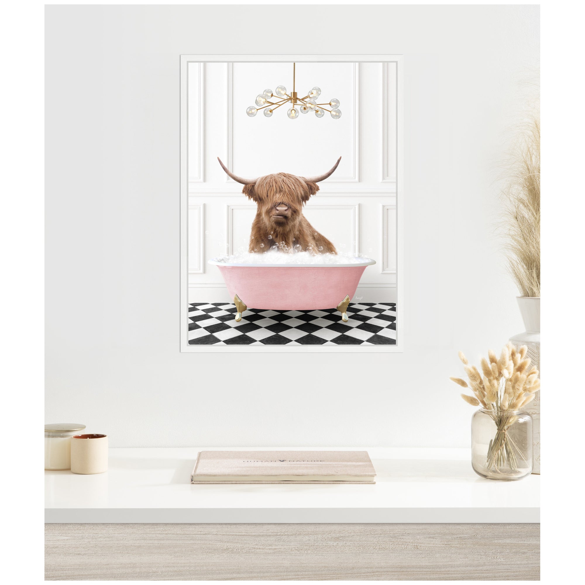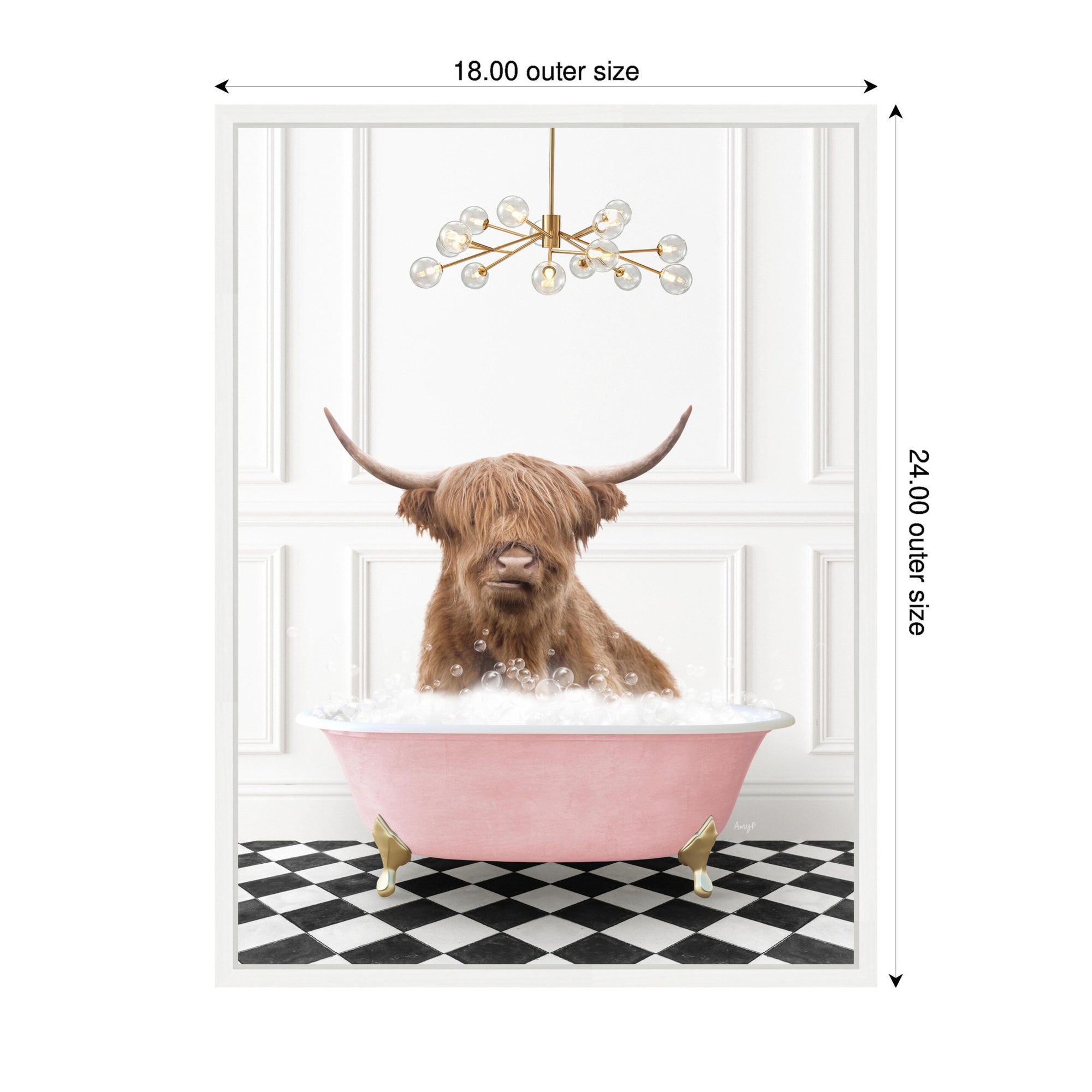 Sylvie Highland Cow in Pink Bathtub on Checker Floor Framed Canvas by Amy Peterson