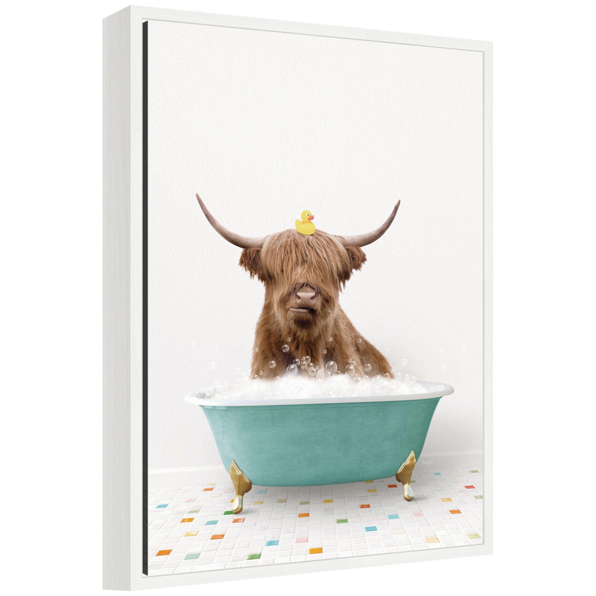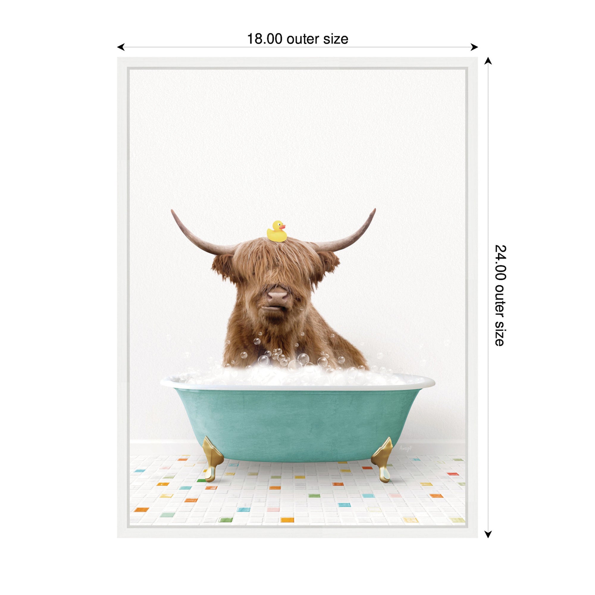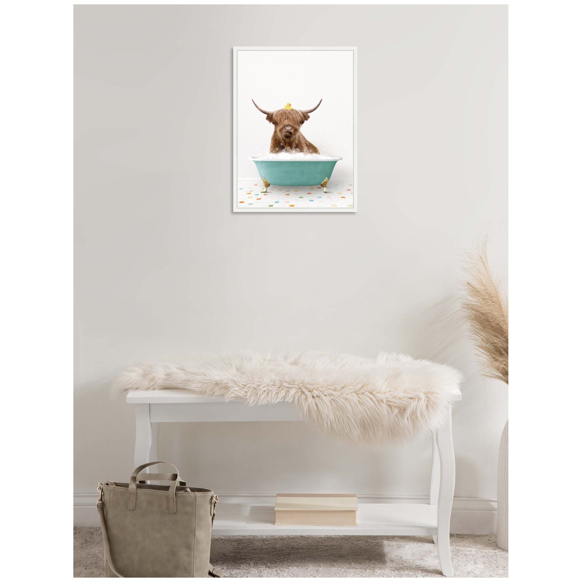 Sylvie Highland Cow in Teal Bathtub on Colored Tile Framed Canvas by Amy Peterson