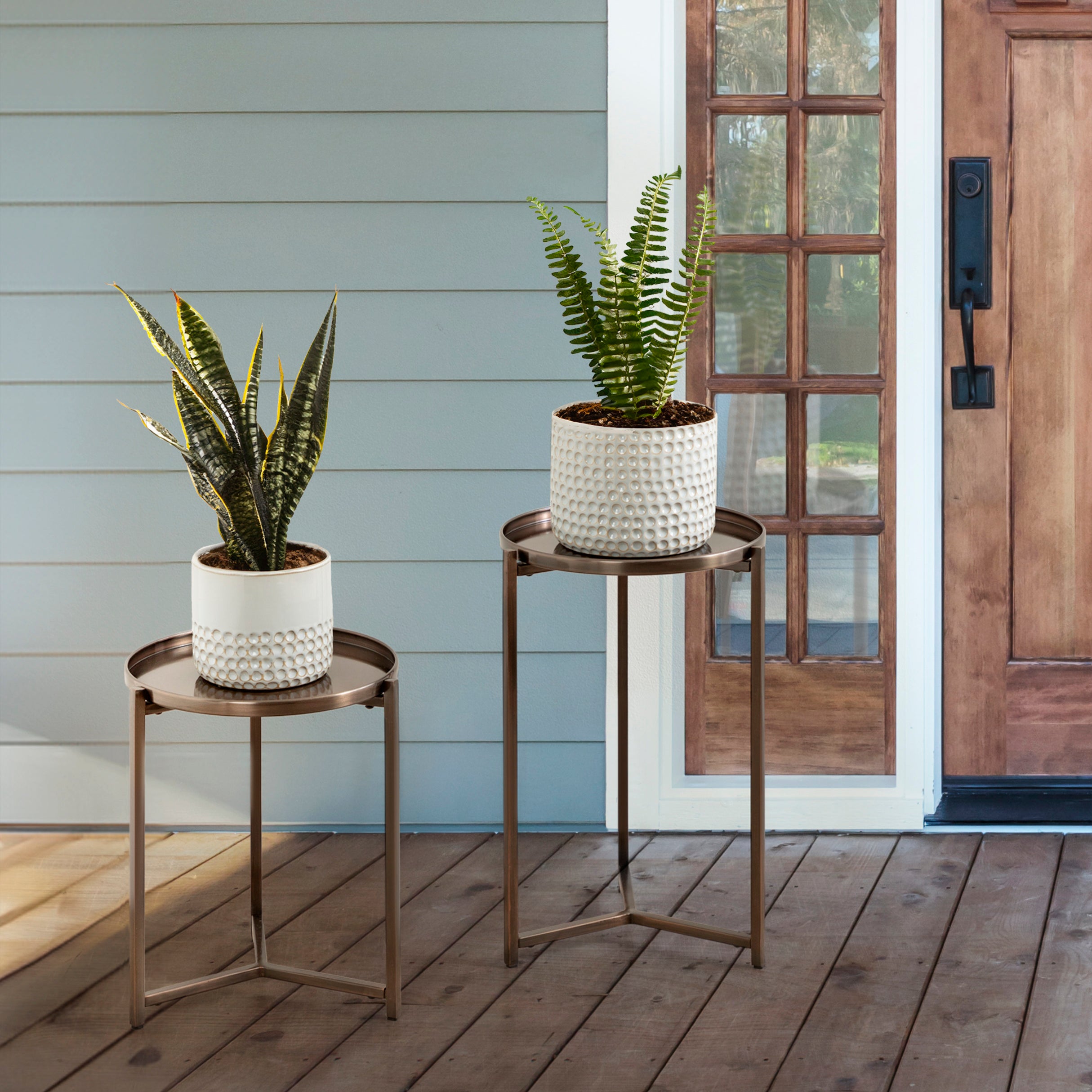 Discover a beautiful way to showcase your decorative house plants and other household items with the charming Aguilar plant stand set. The Aguilar plant stands take inspiration from the sophisticated aesthetics of modern design, featuring simple yet secure bases and graduated sizes. Both of the Aguilar plant risers feature an outdoor-grade finish for use on your patio, porch, or balcony. While these planter stands were designed primarily for outdoor use, they are also excellent plant stands for indoor plants or as small accent tables throughout your home.