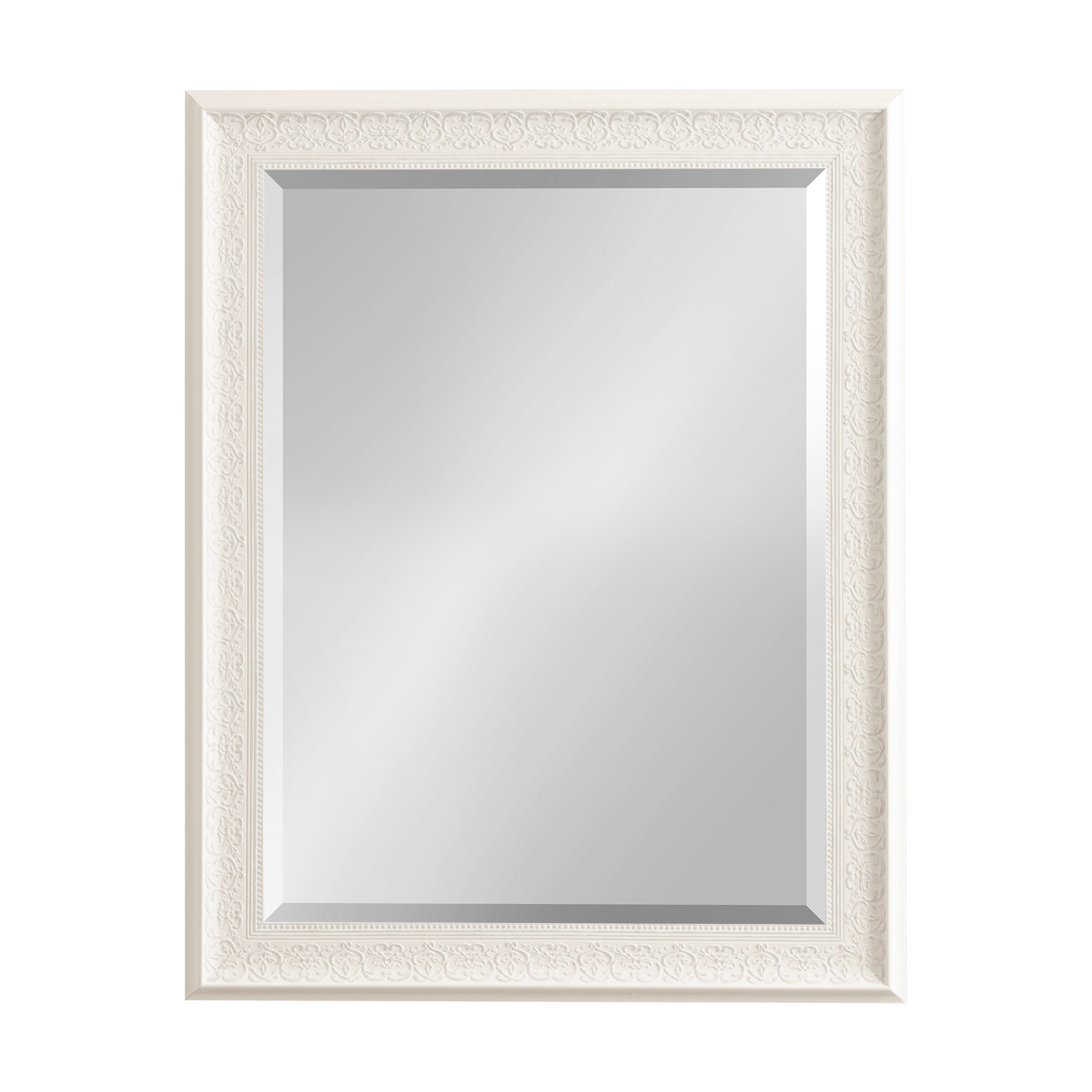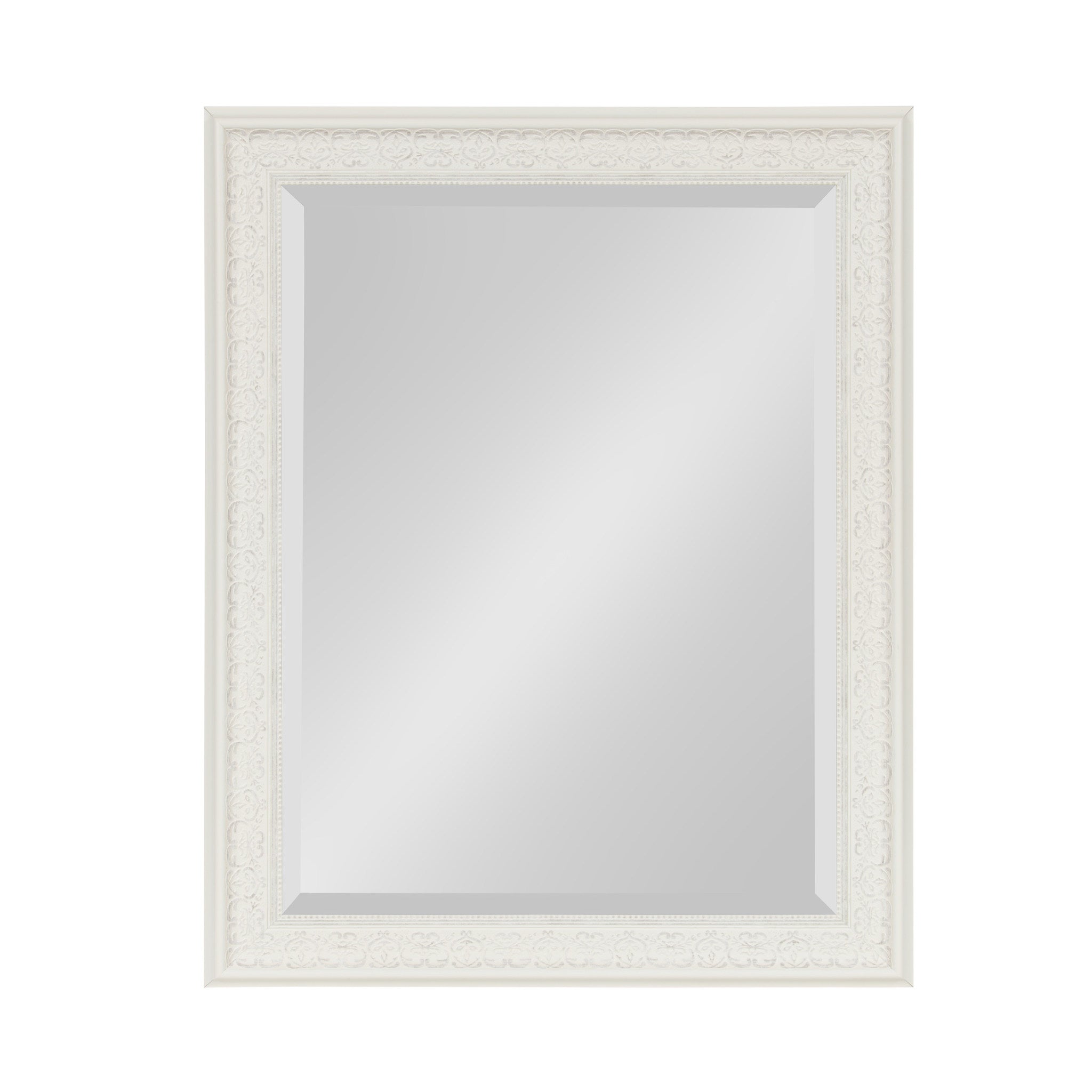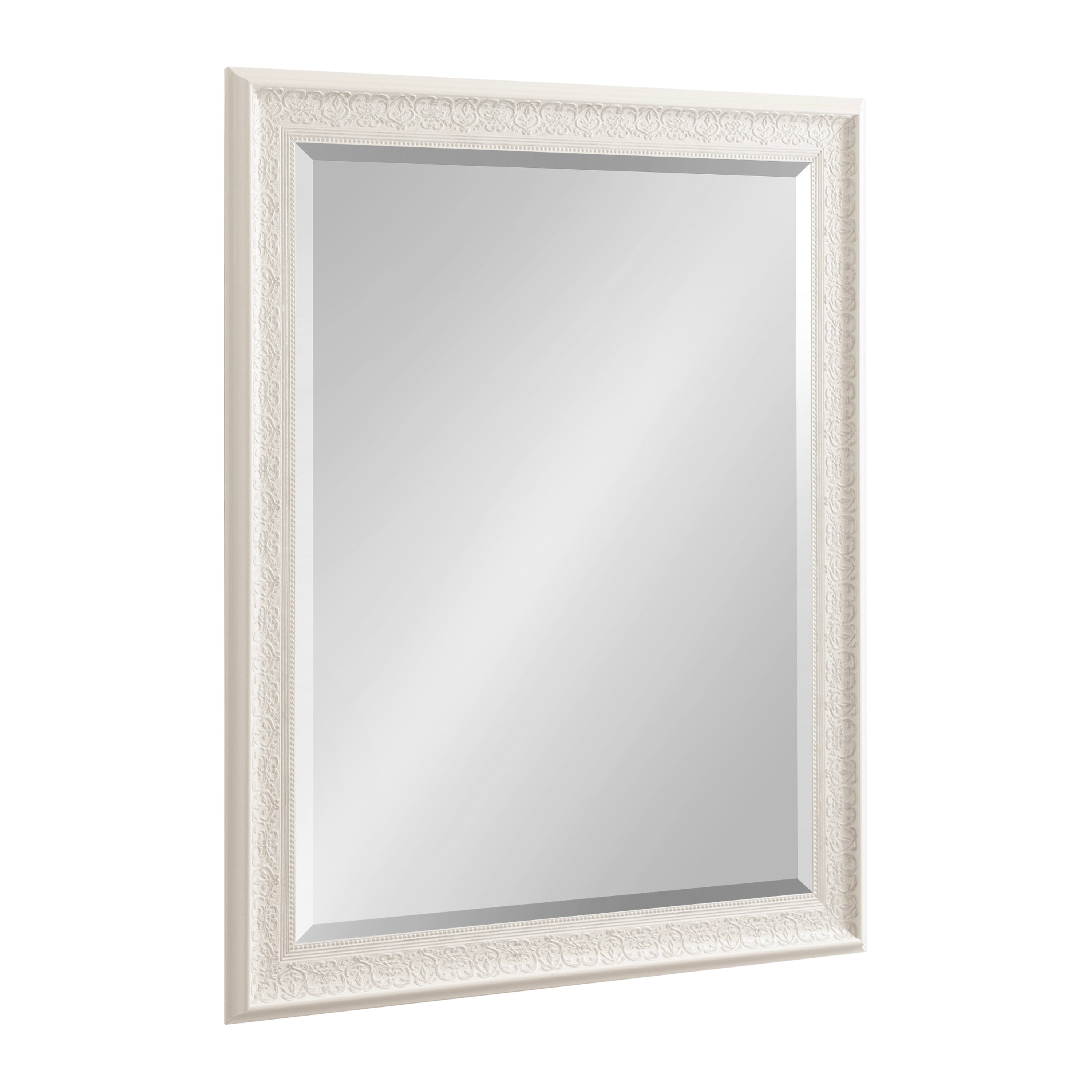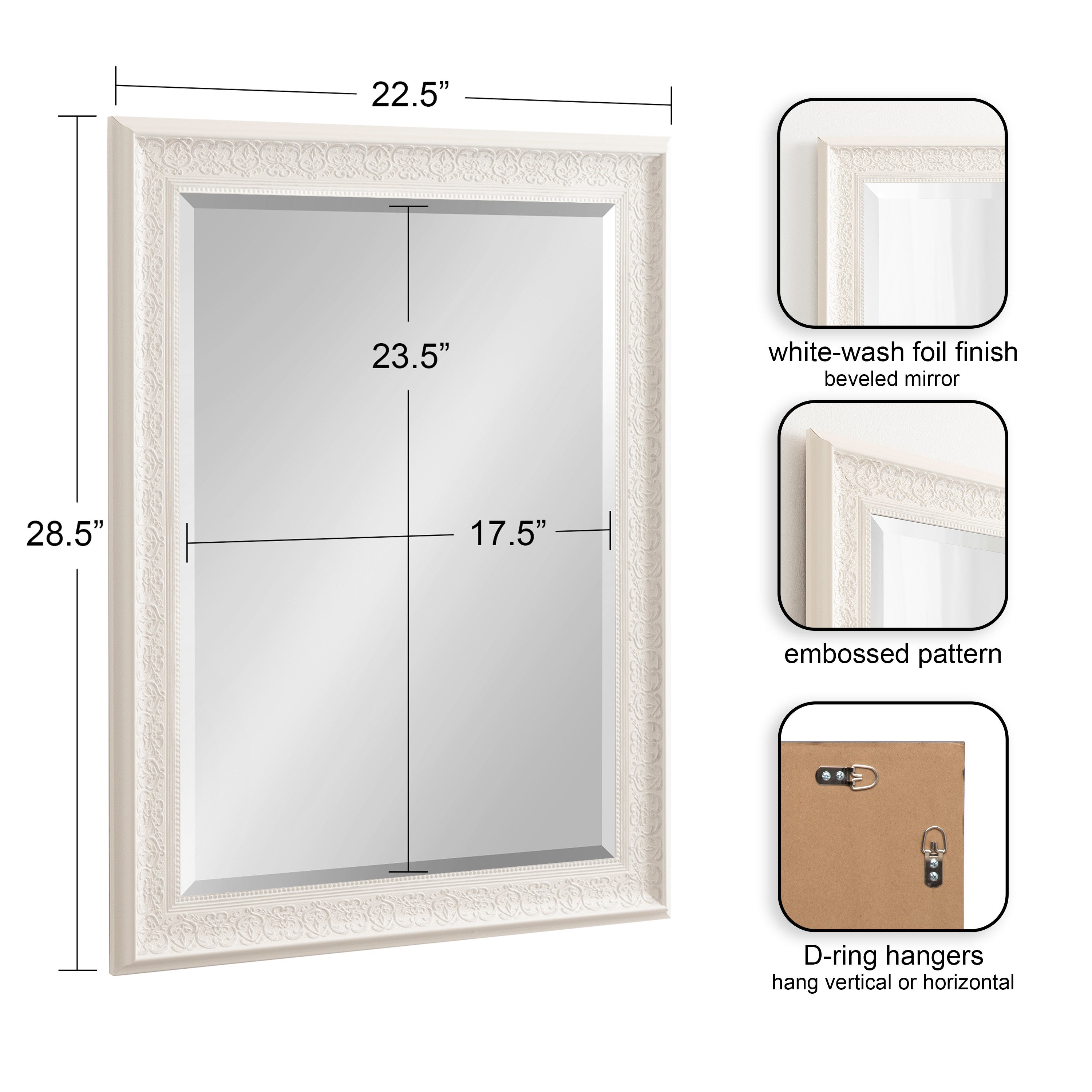 - Inset beveled glass mirror surface creates the illusion of more light and depth