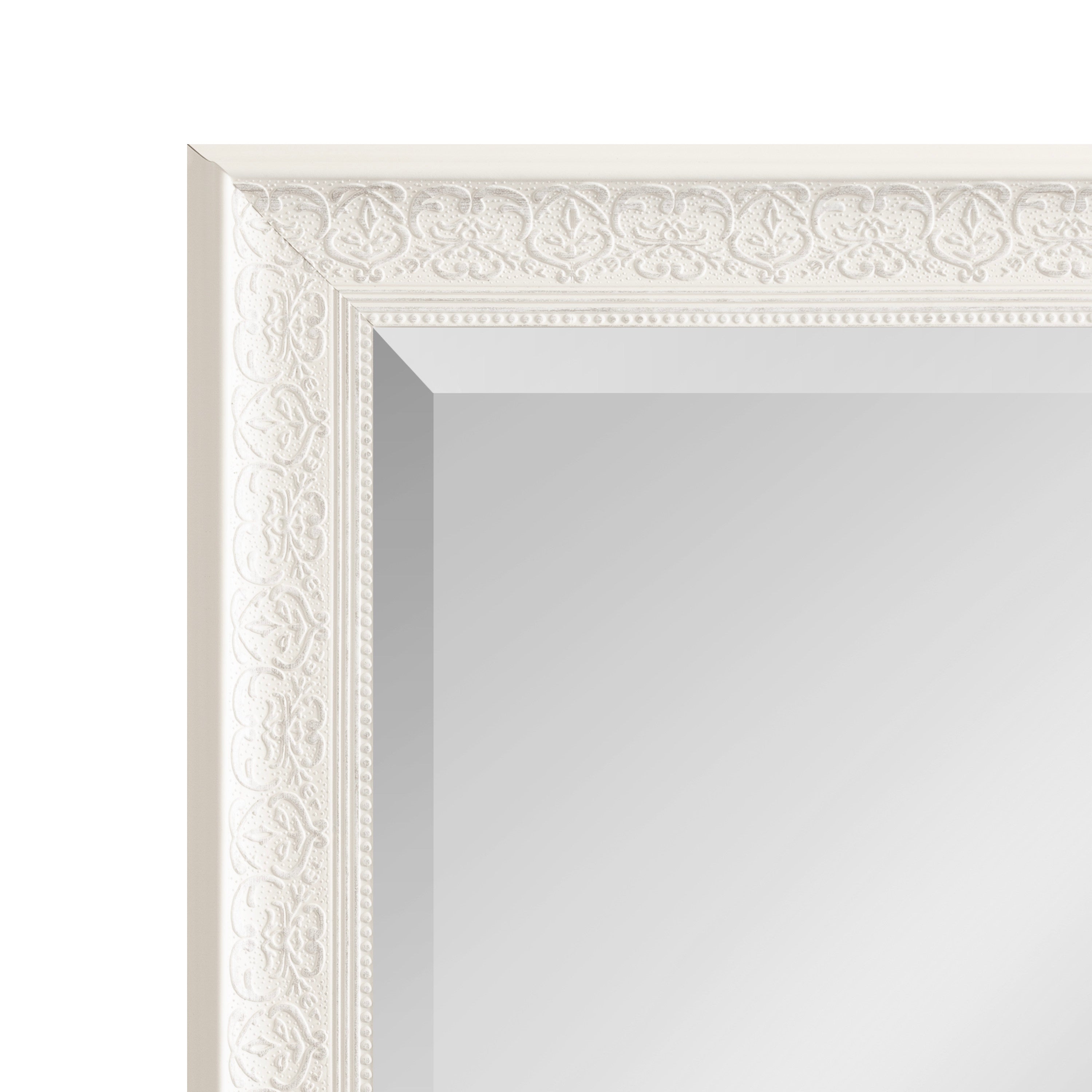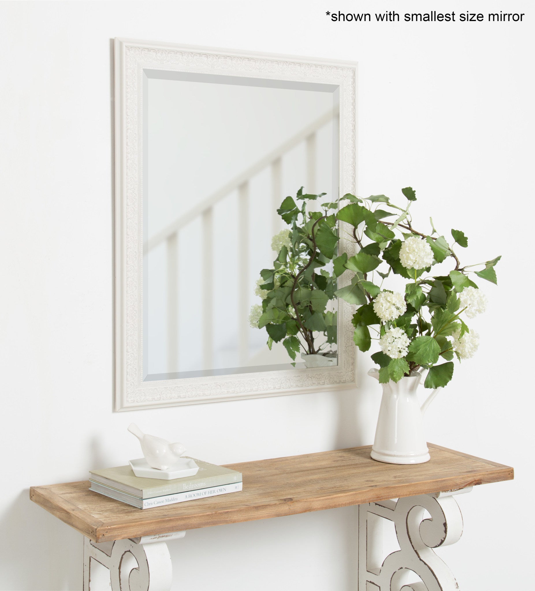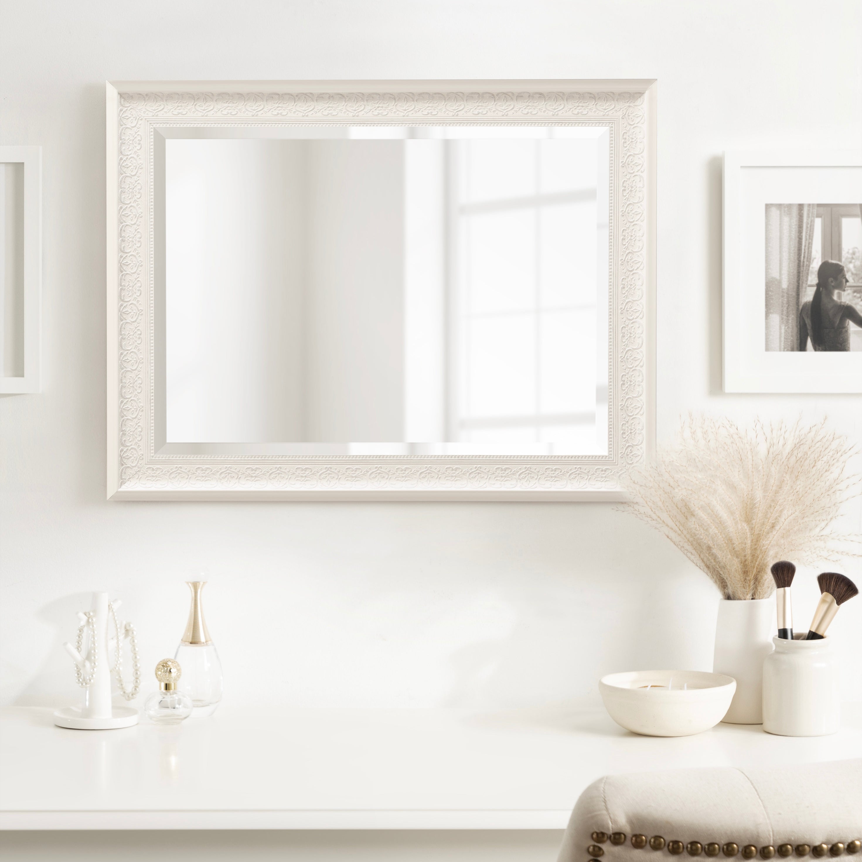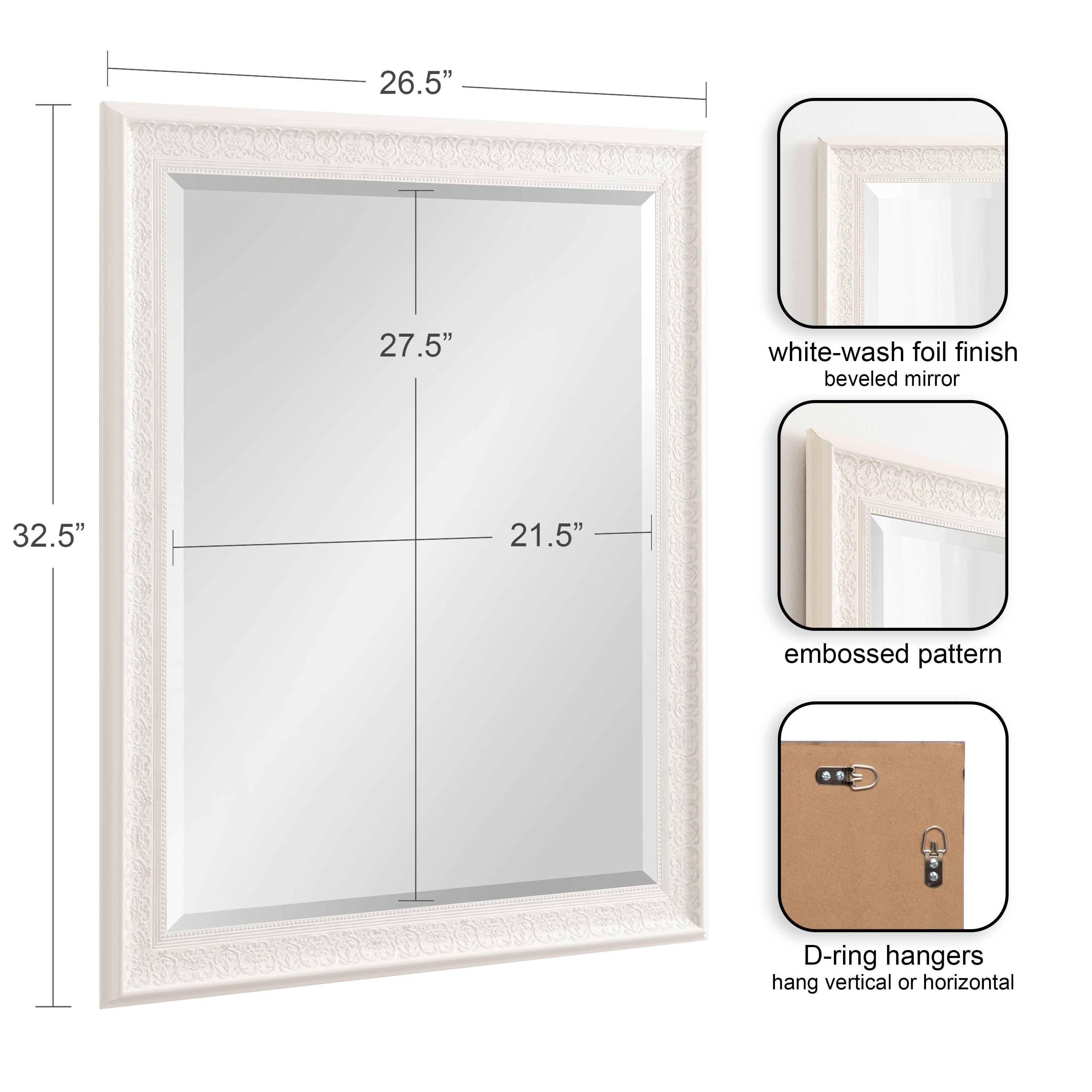 - Inset beveled glass mirror surface creates the illusion of more light and depth