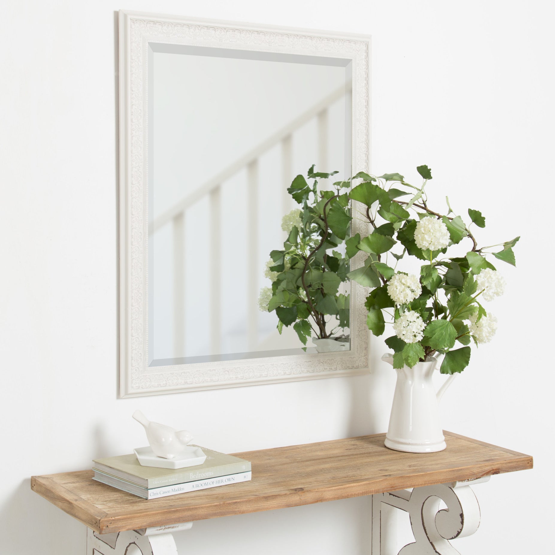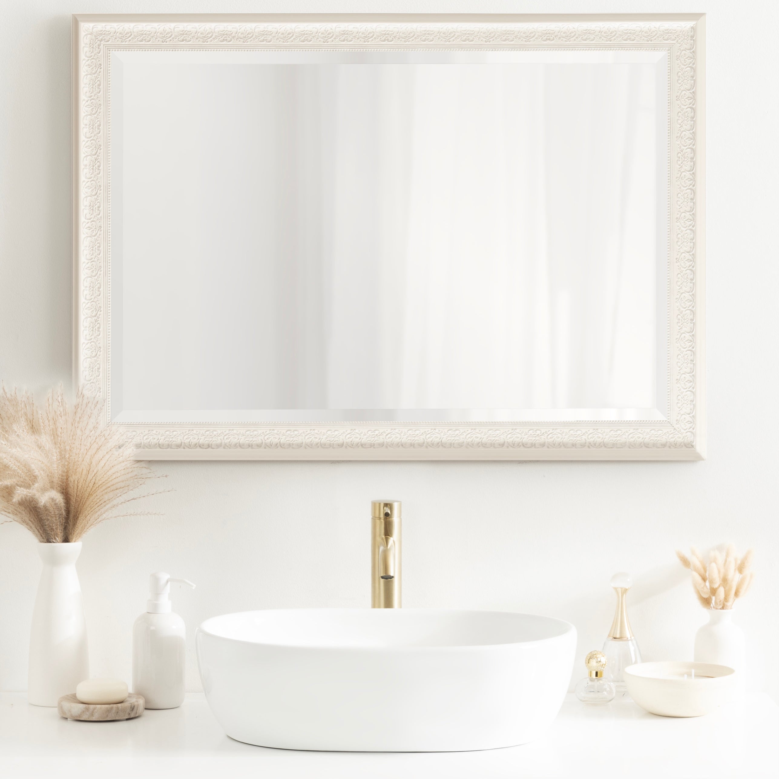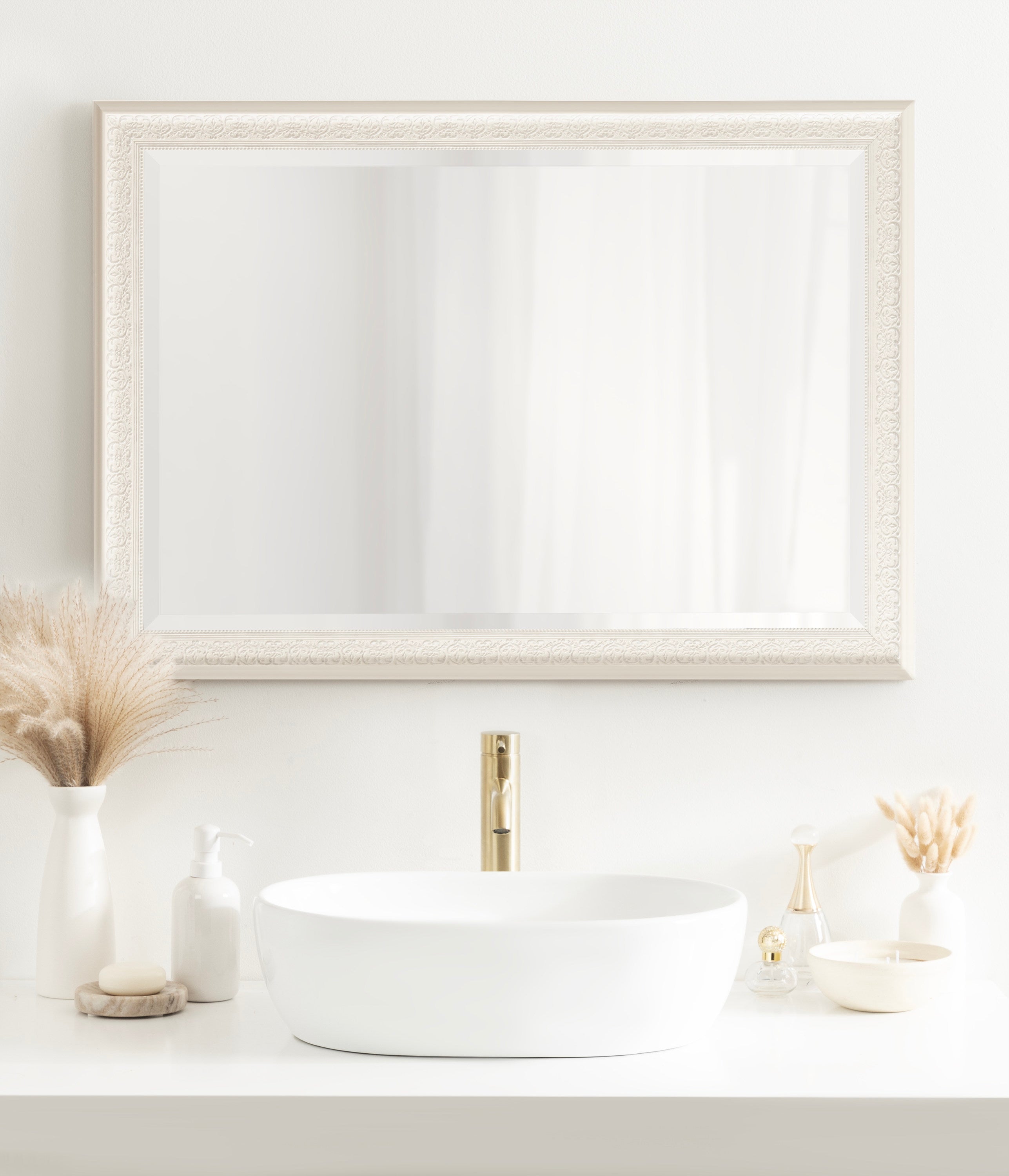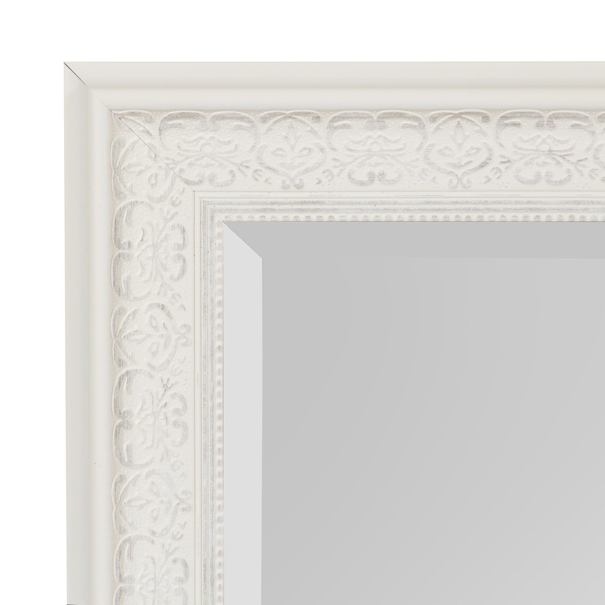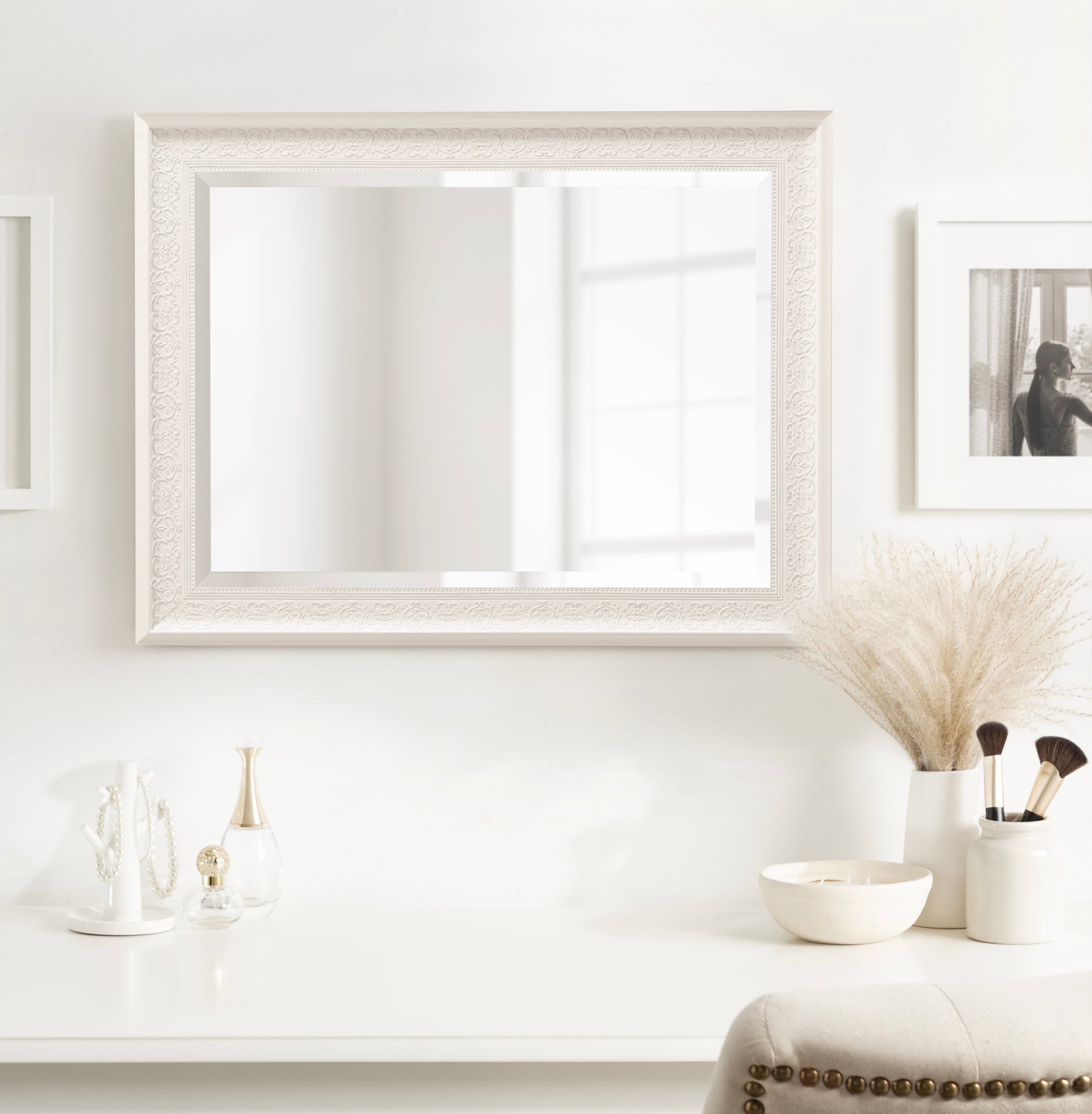 - Inset beveled glass mirror surface creates the illusion of more light and depth