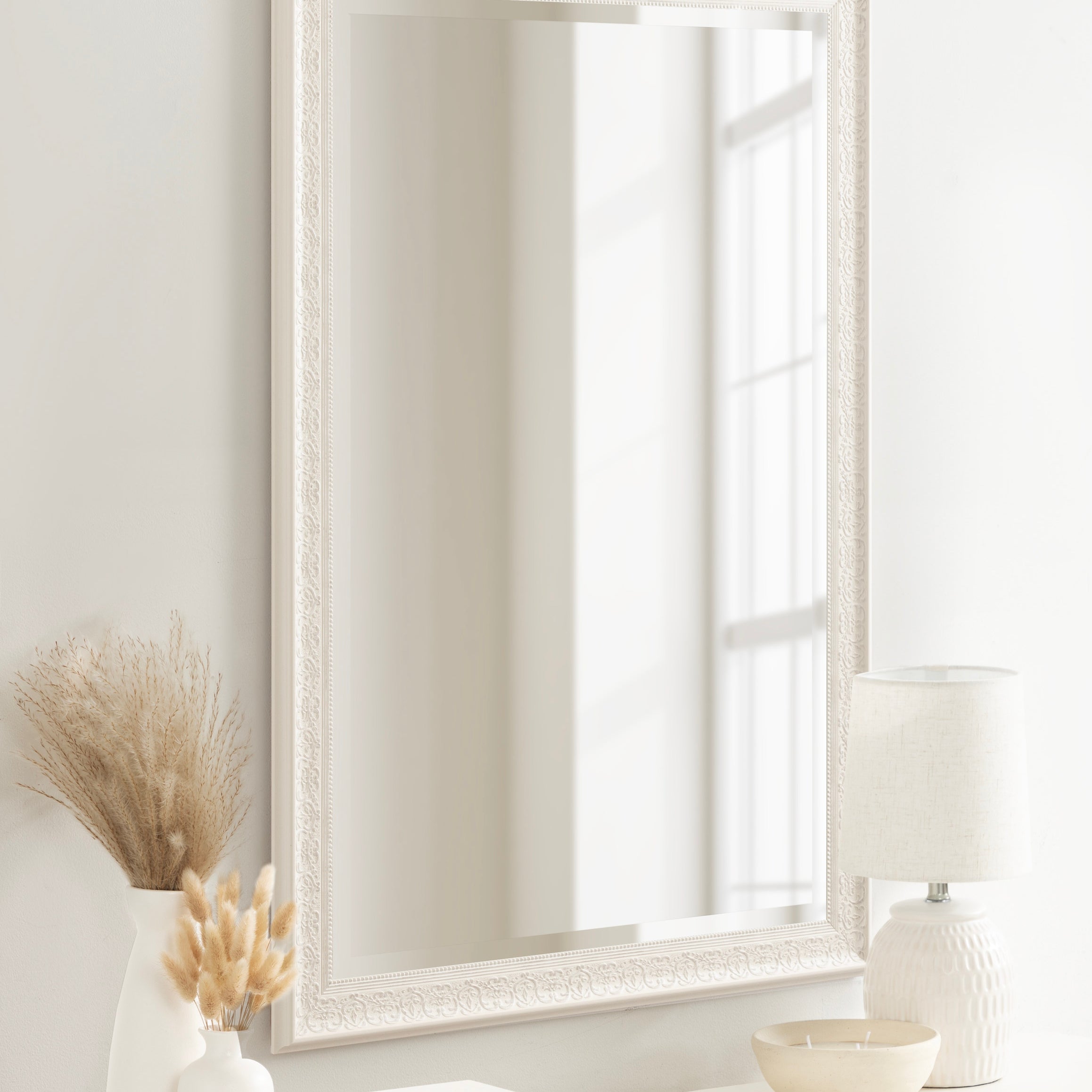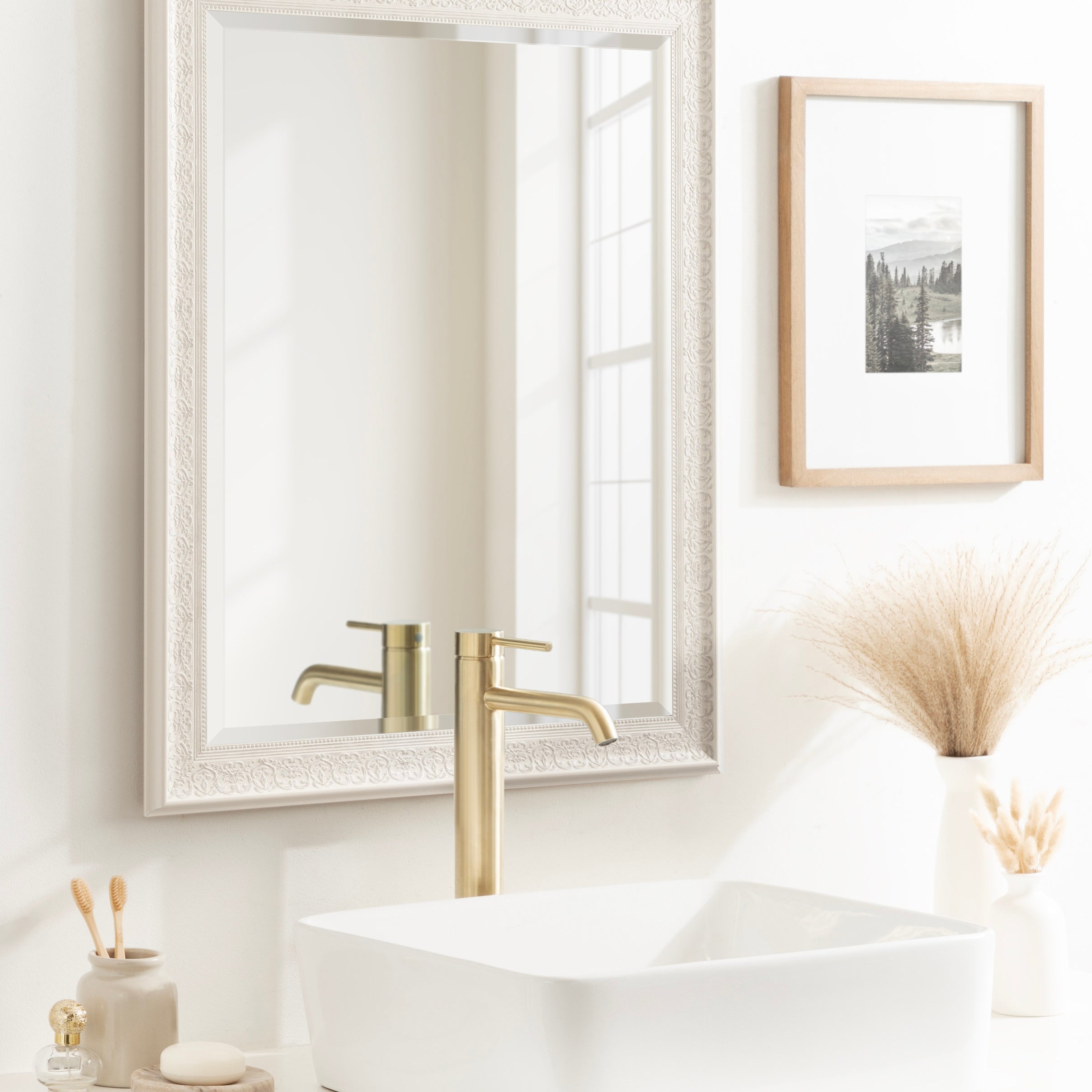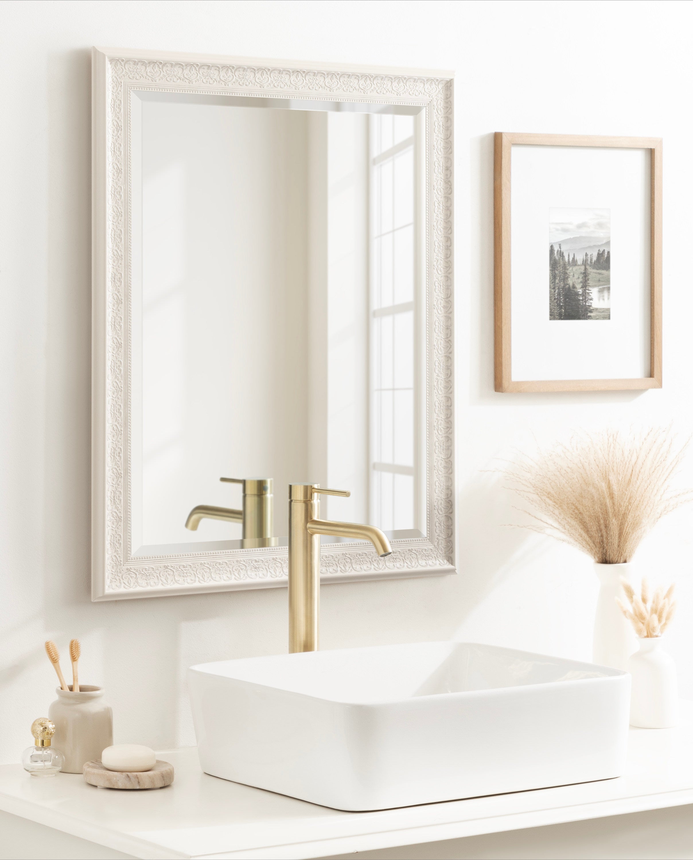 The wide profile and the white-washed foil finish of the Alysia framed wall mirror is a meld of traditional with contemporary. A flexible accent like this offers an easy to place wall décor for your home.