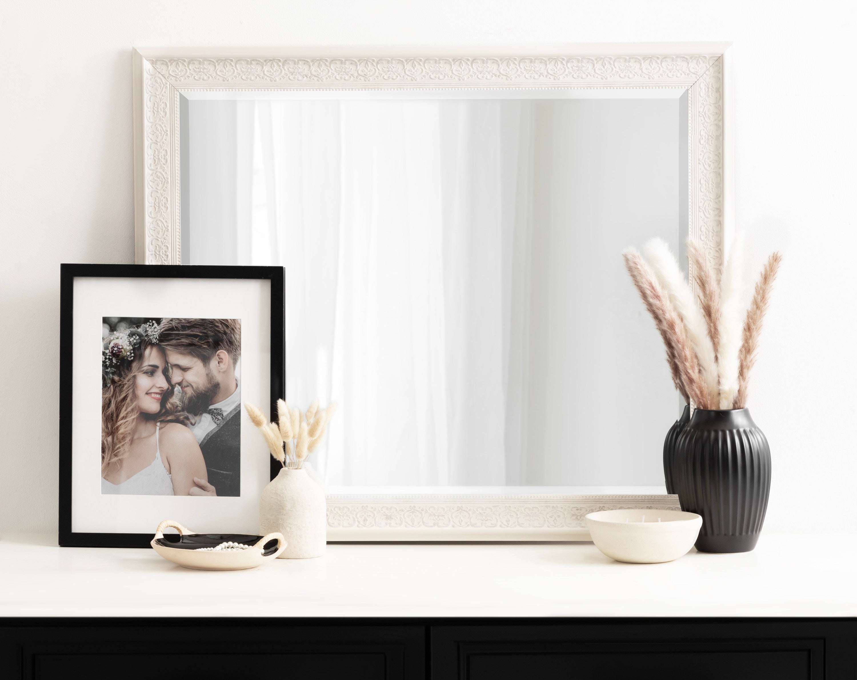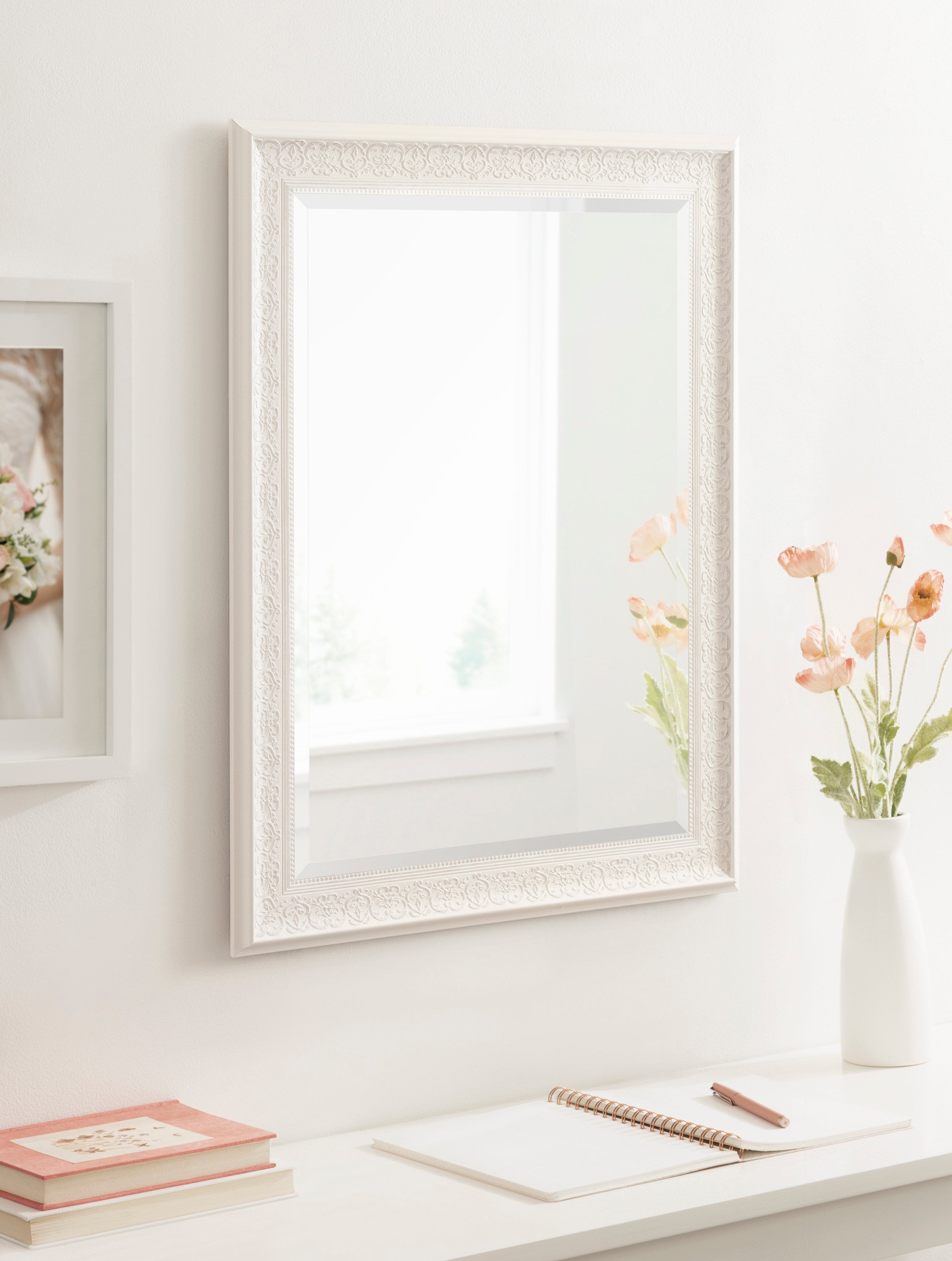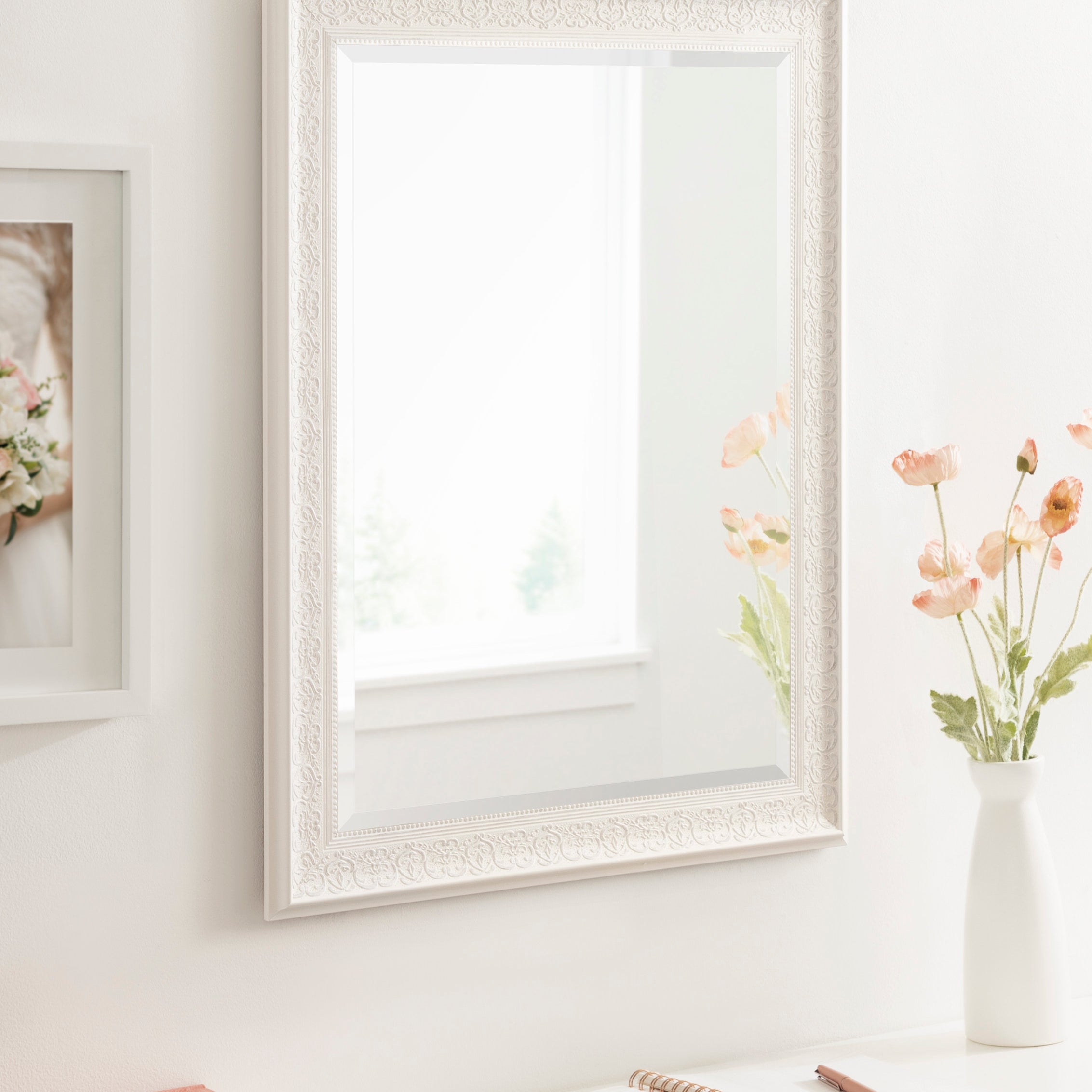 The wide profile and the white-washed foil finish of the Alysia framed wall mirror is a meld of traditional with contemporary. A flexible accent like this offers an easy to place wall décor for your home.