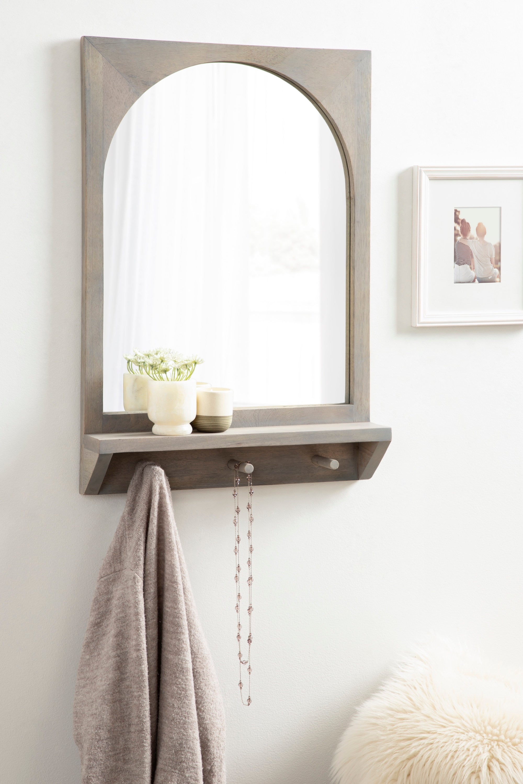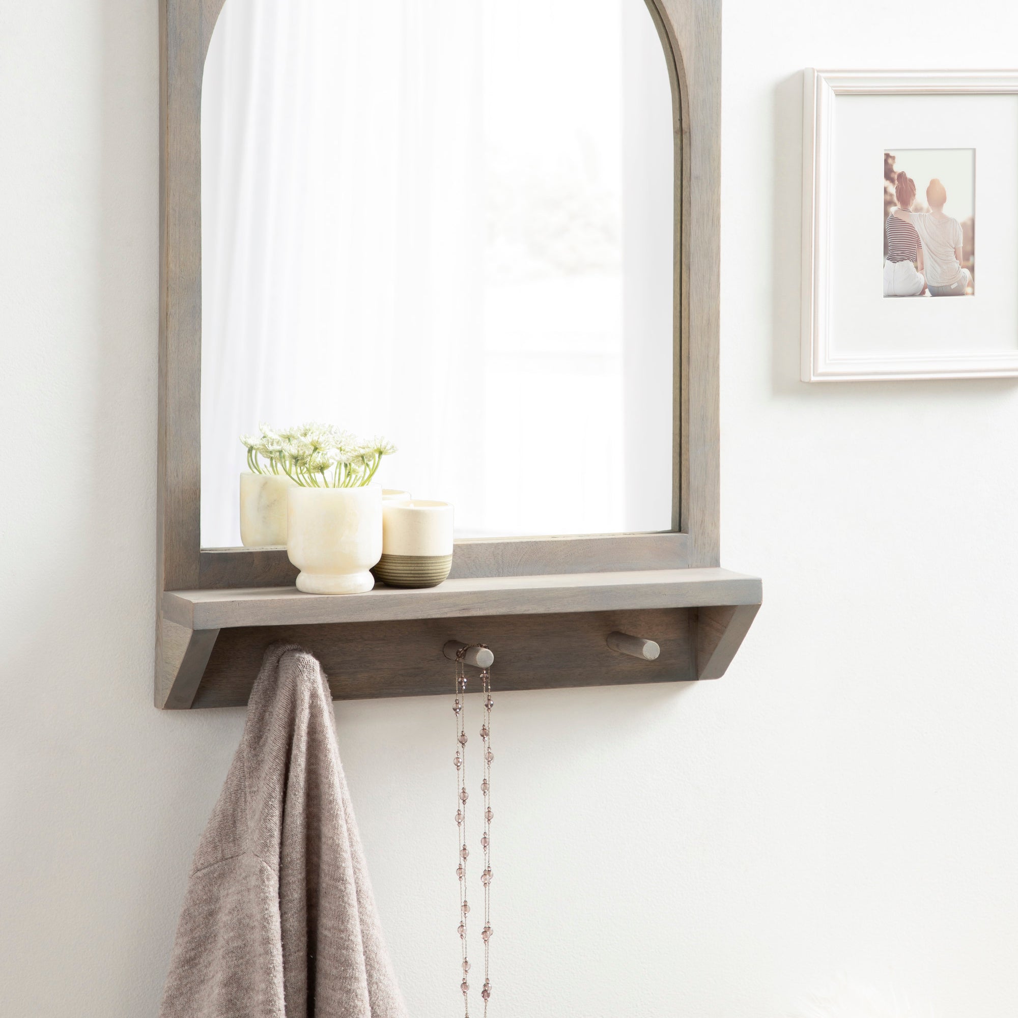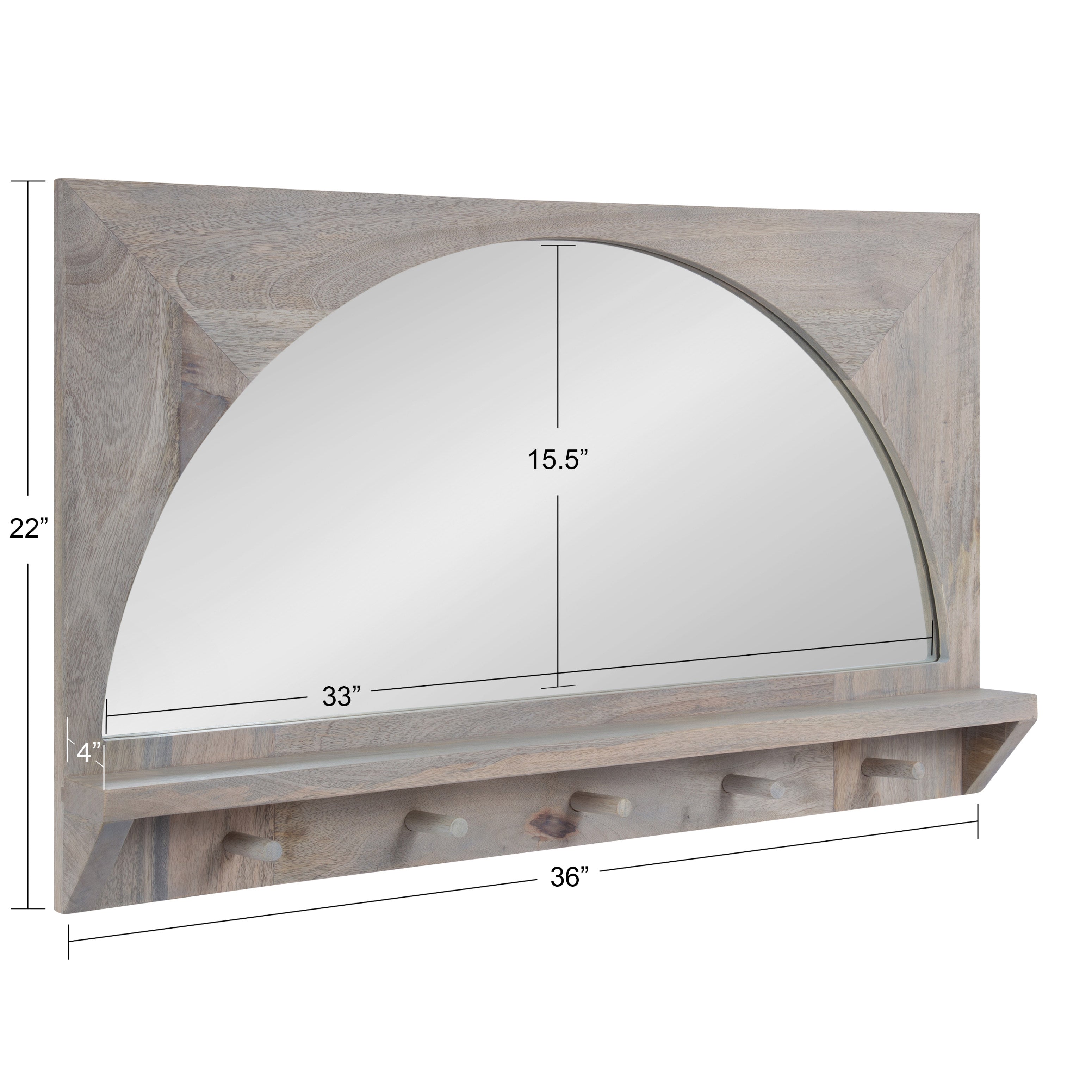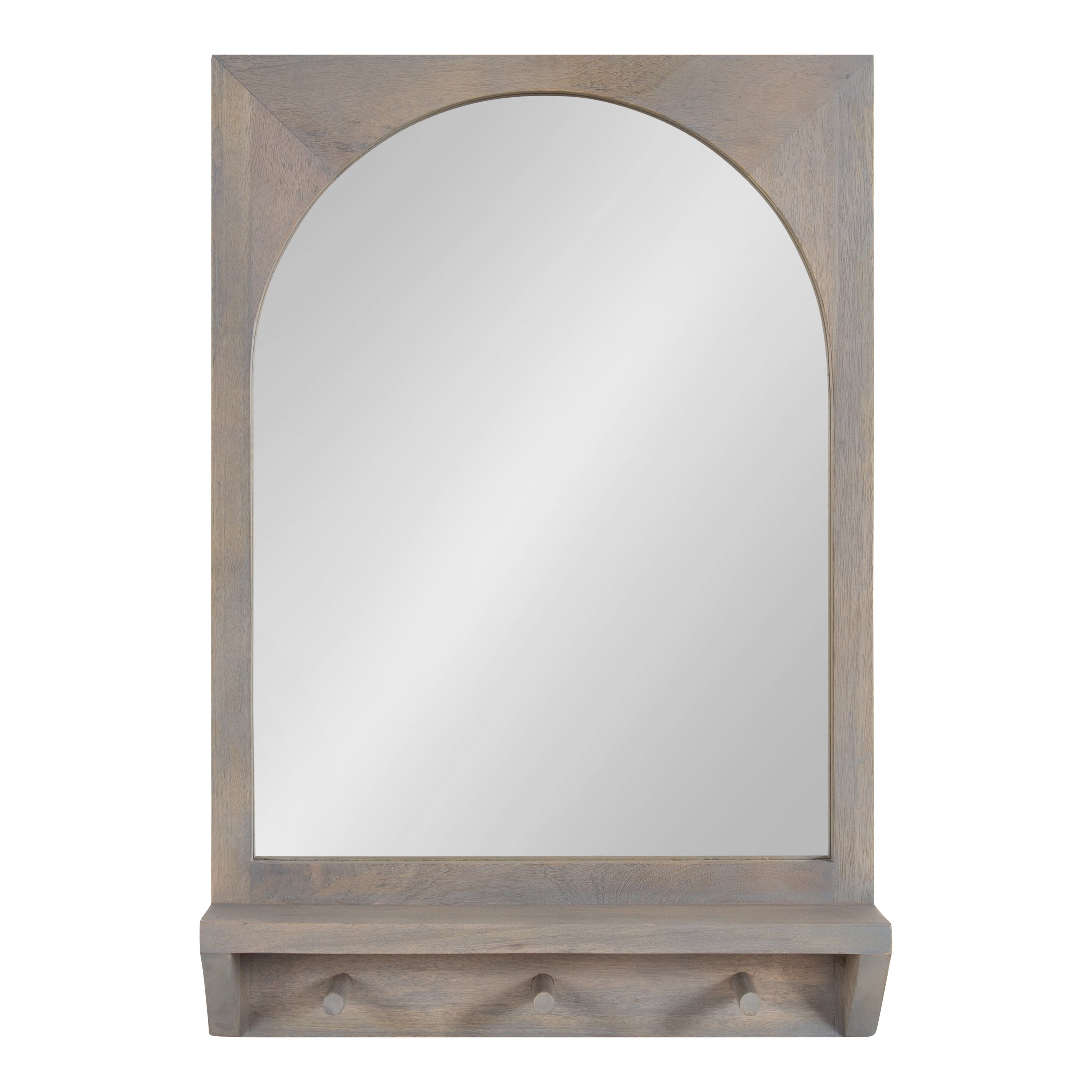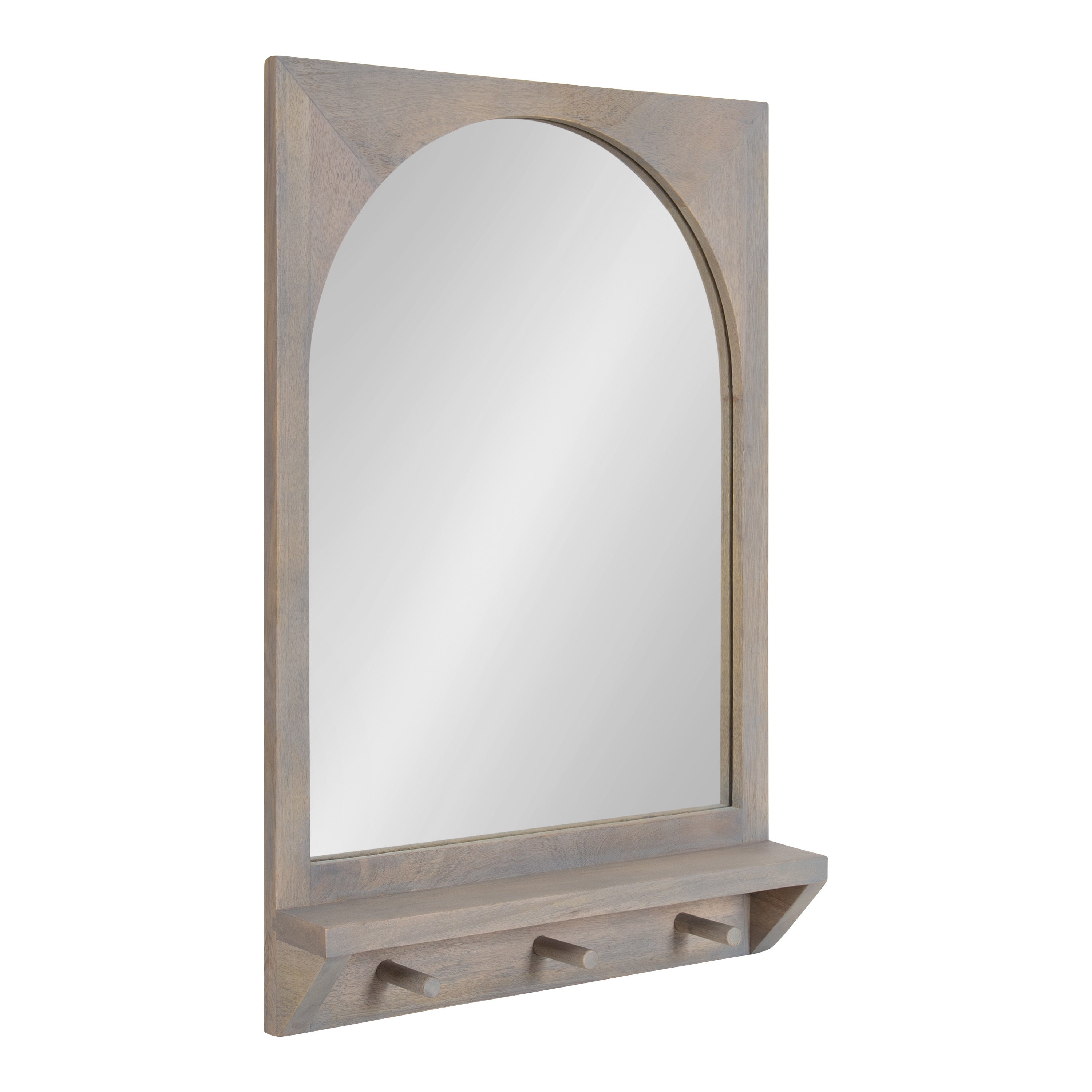 This transitional wall mirror brings functionality to your home decor. The Andover is a fantastic element that combines an arched mirror with a display ledge and hanging pegs, creating an accent piece that is as useful as it is beautiful. It's a fantastic showcase of your mature style that saves space in your home with its practical storage solutions. Use the 3-inch ledge to display mini decor accents or act as catch-all for mail and housekeys. It's excellent for the entryway, freeing up your hands and adding a space to hang your jacket and purse after a long day. This mirror is crafted to be both a decor and storage solution, adding vibrancy and practicality to any room.