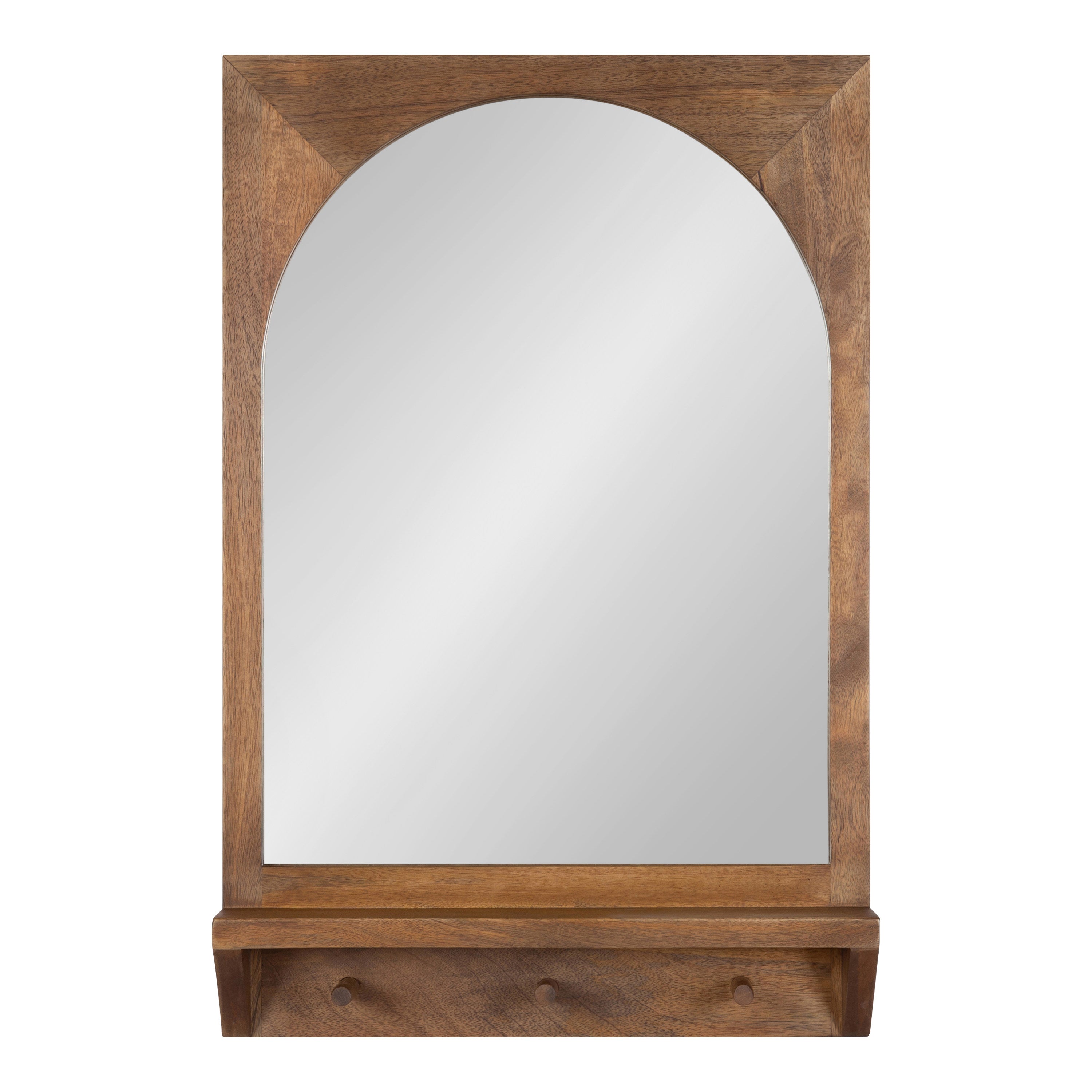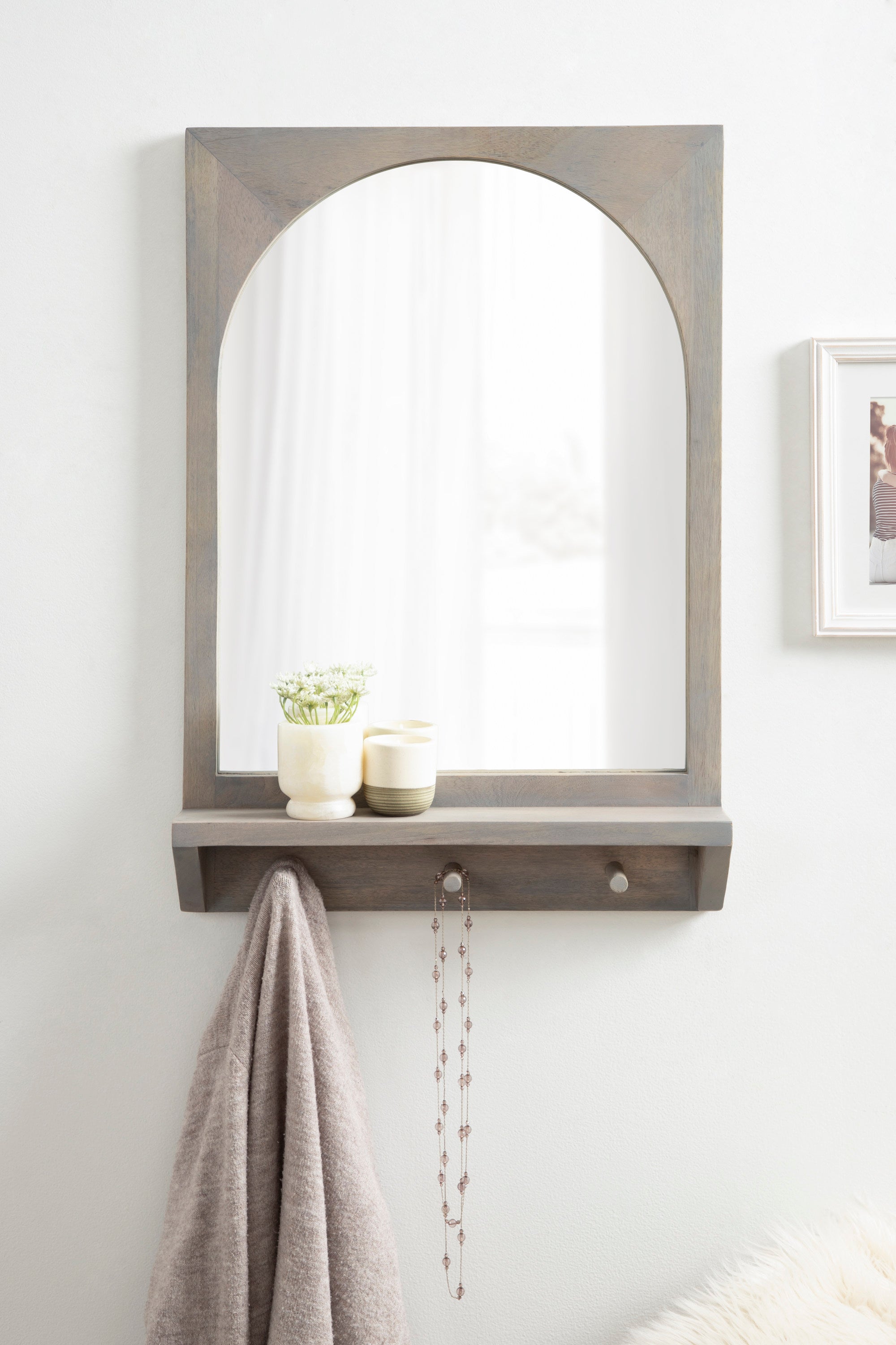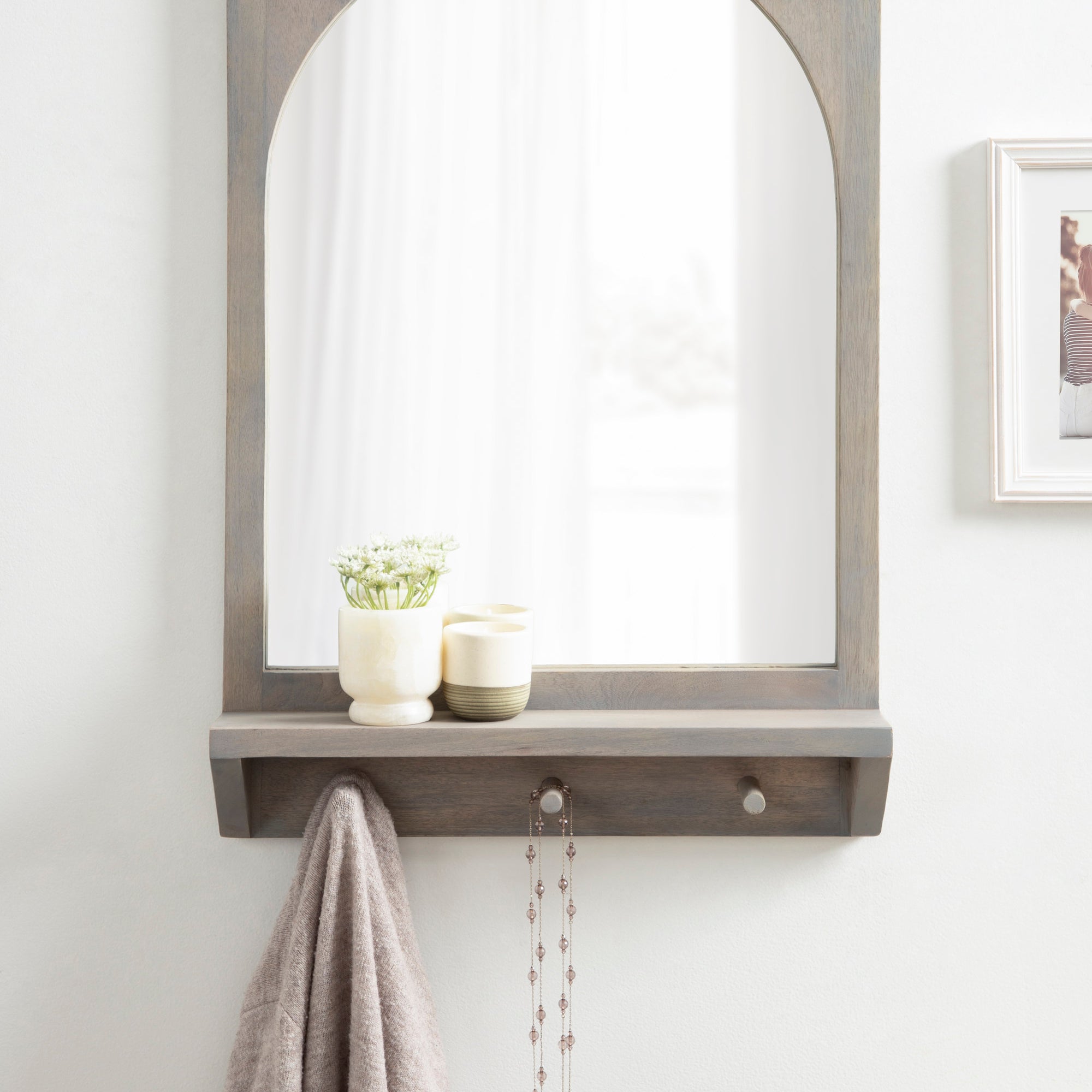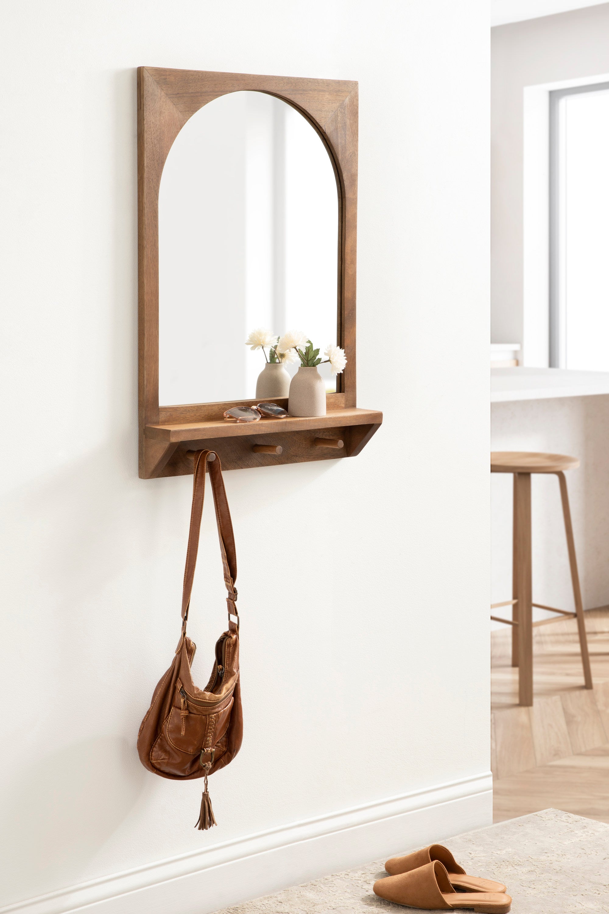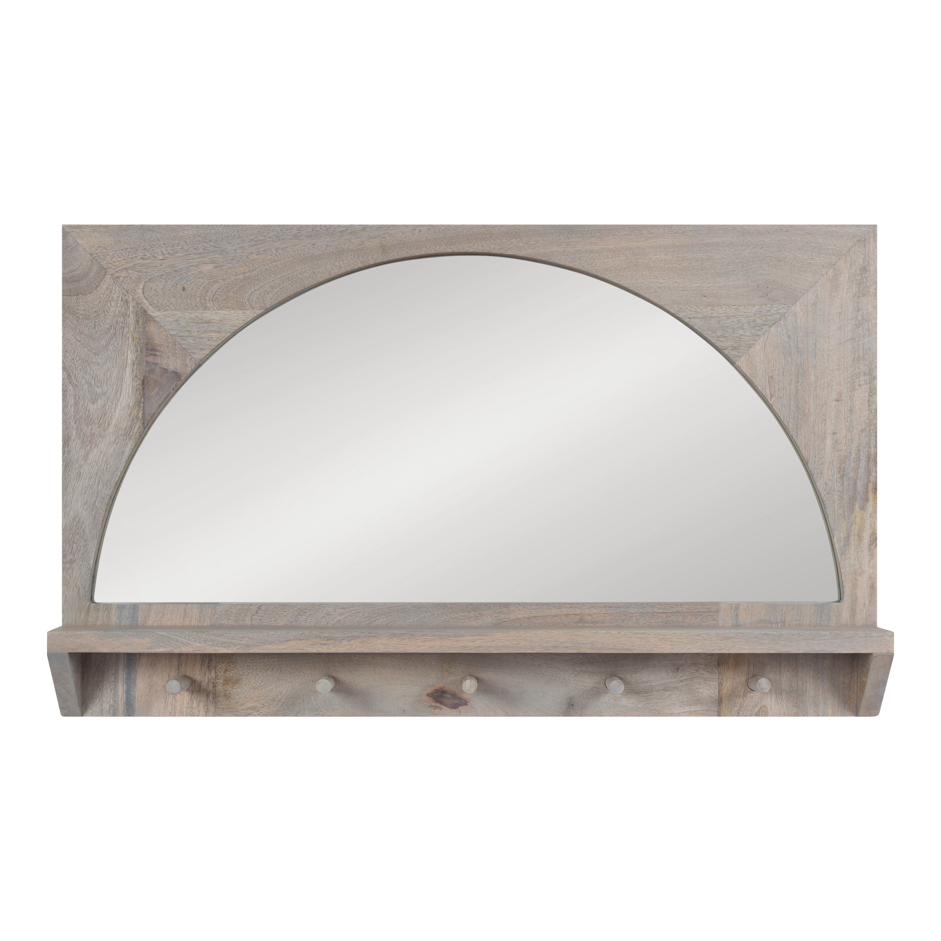 This transitional wall mirror brings functionality to your home decor. The Andover is a fantastic element that combines an arched mirror with a display ledge and hanging pegs, creating an accent piece that is as useful as it is beautiful. It's a fantastic showcase of your mature style that saves space in your home with its practical storage solutions. Use the 3-inch ledge to display mini decor accents or act as catch-all for mail and housekeys. It's excellent for the entryway, freeing up your hands and adding a space to hang your jacket and purse after a long day. This mirror is crafted to be both a decor and storage solution, adding vibrancy and practicality to any room.