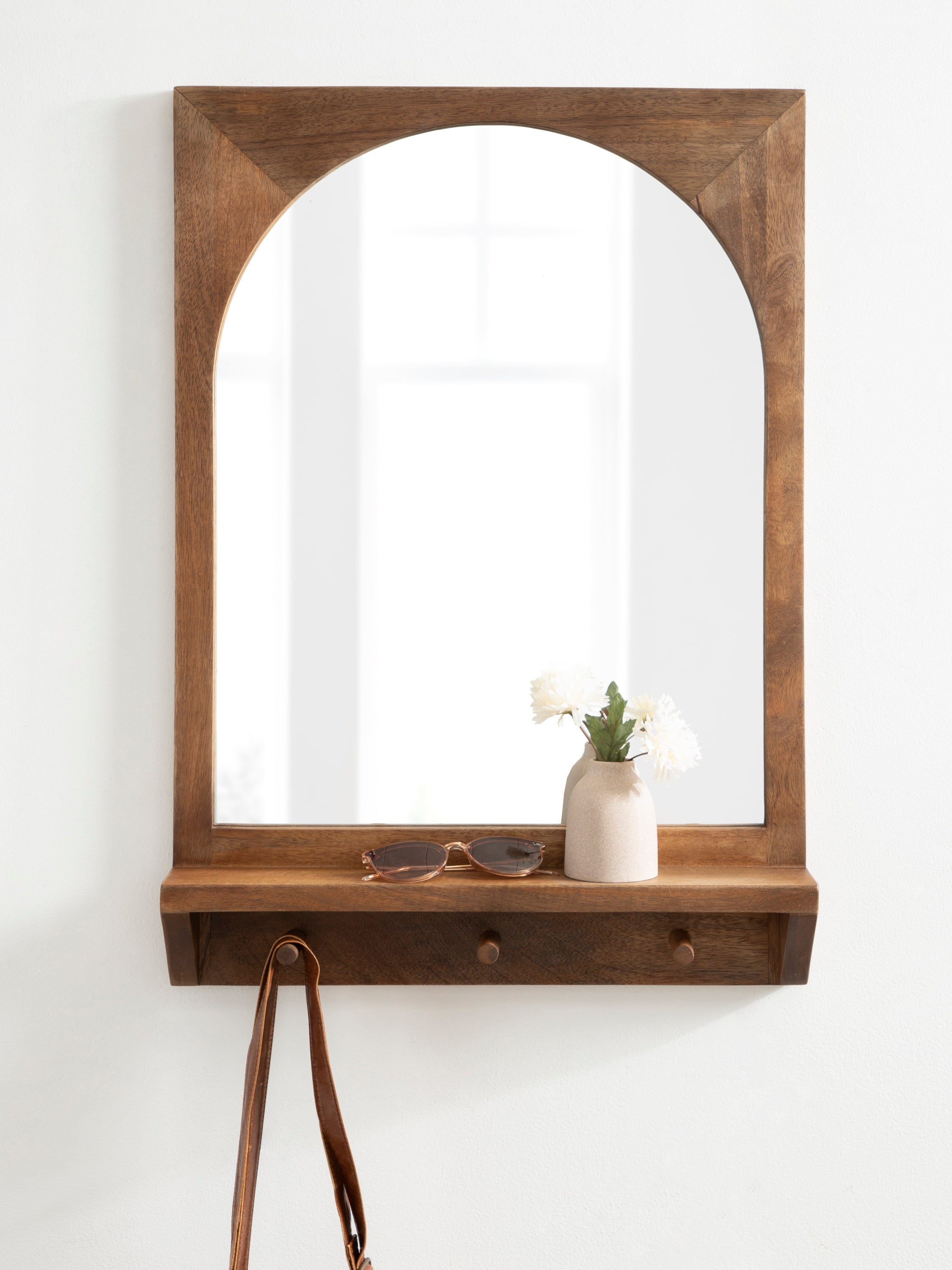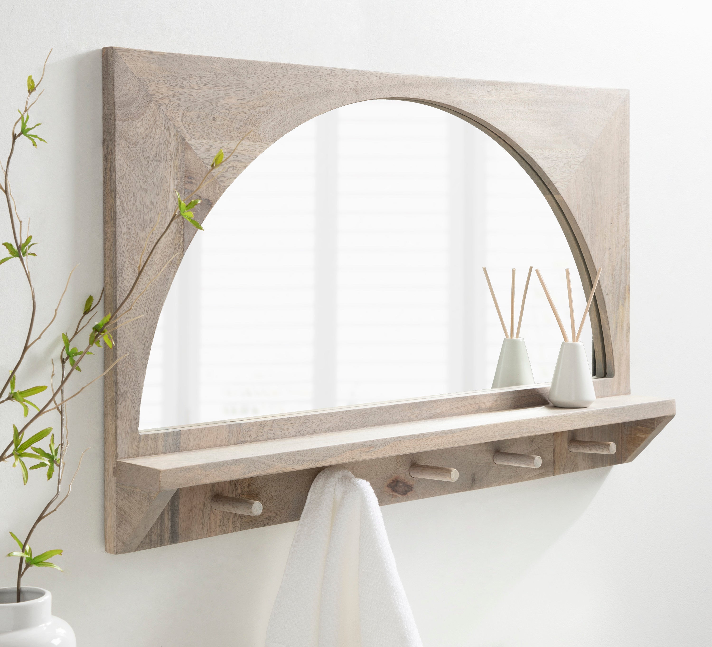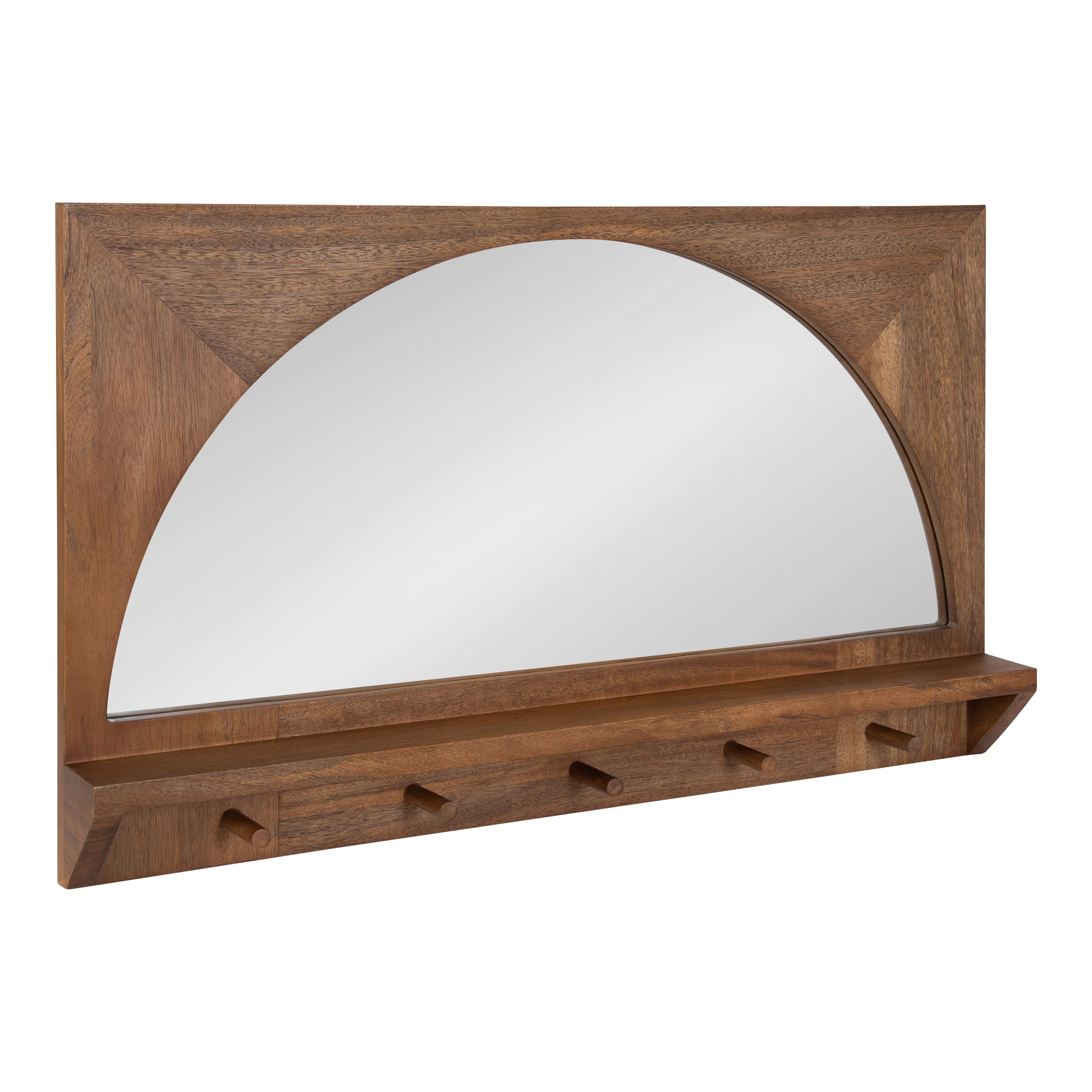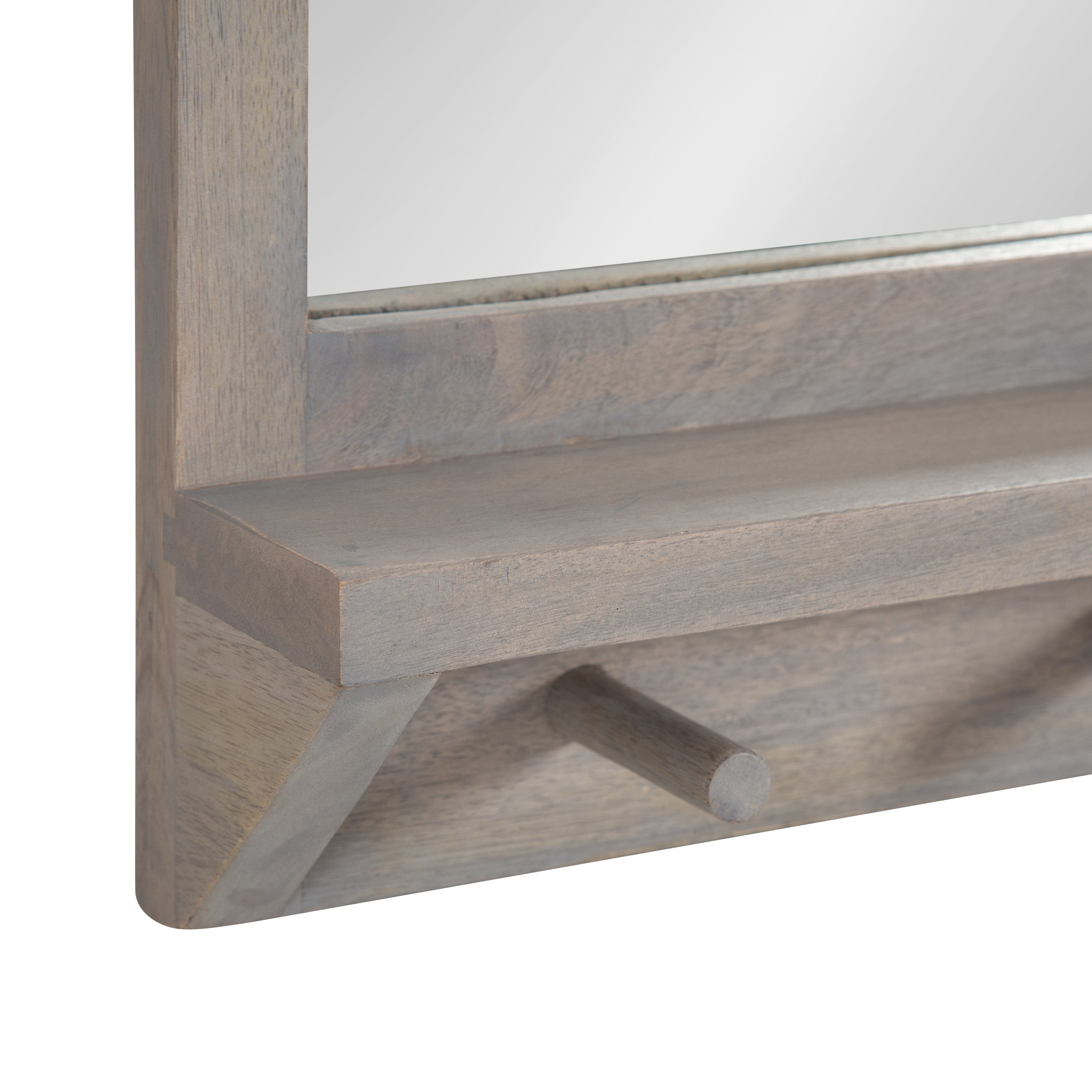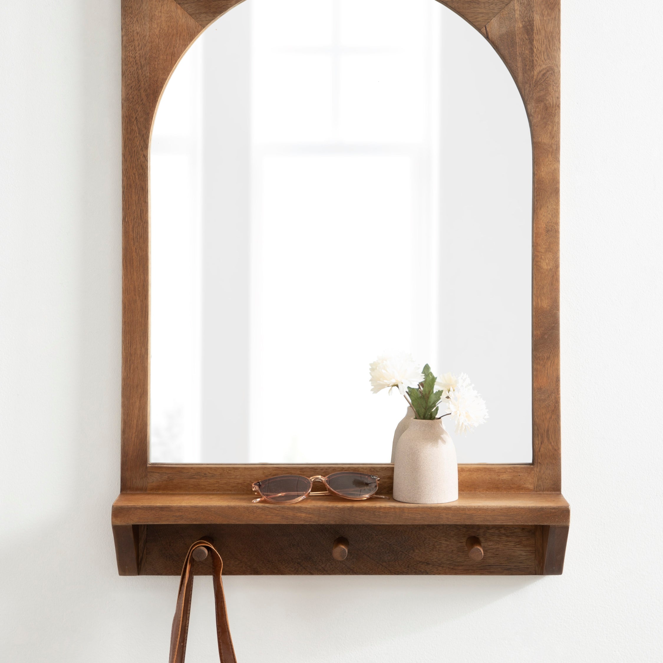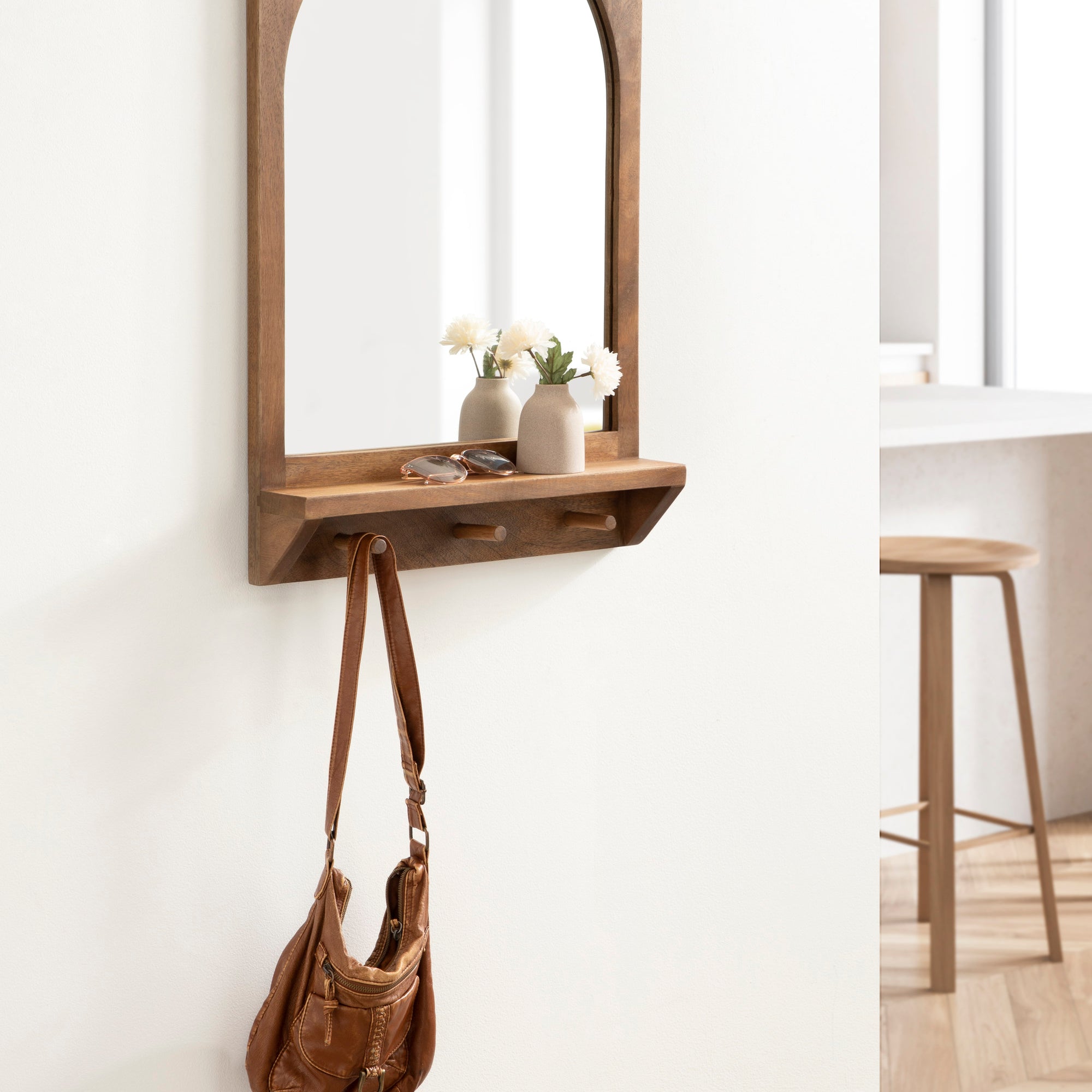 This transitional wall mirror brings functionality to your home decor. The Andover is a fantastic element that combines an arched mirror with a display ledge and hanging pegs, creating an accent piece that is as useful as it is beautiful. It's a fantastic showcase of your mature style that saves space in your home with its practical storage solutions. Use the 3-inch ledge to display mini decor accents or act as catch-all for mail and housekeys. It's excellent for the entryway, freeing up your hands and adding a space to hang your jacket and purse after a long day. This mirror is crafted to be both a decor and storage solution, adding vibrancy and practicality to any room.