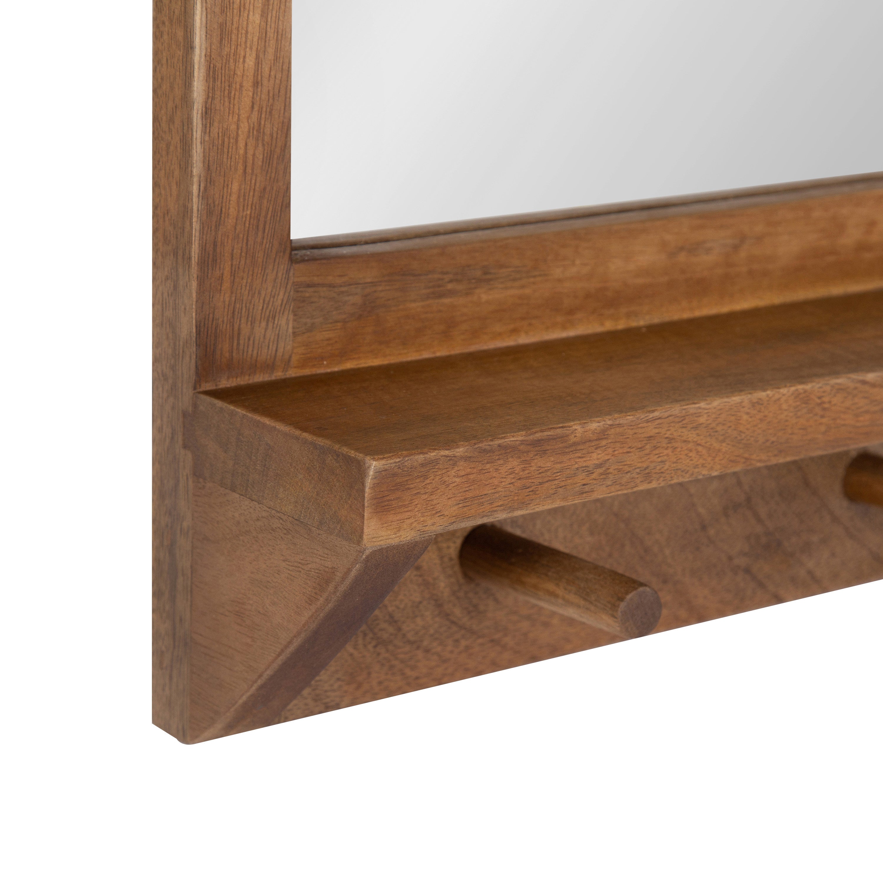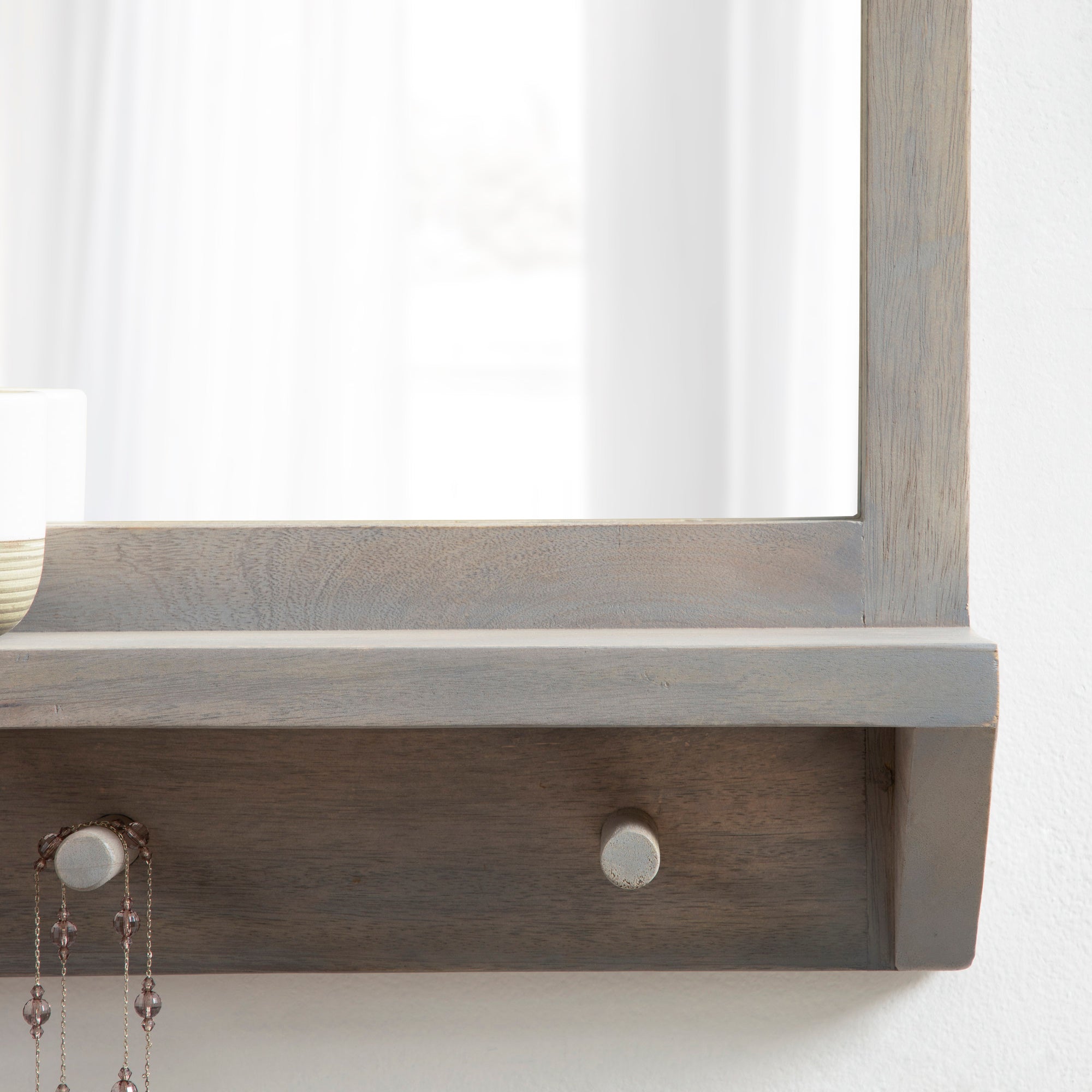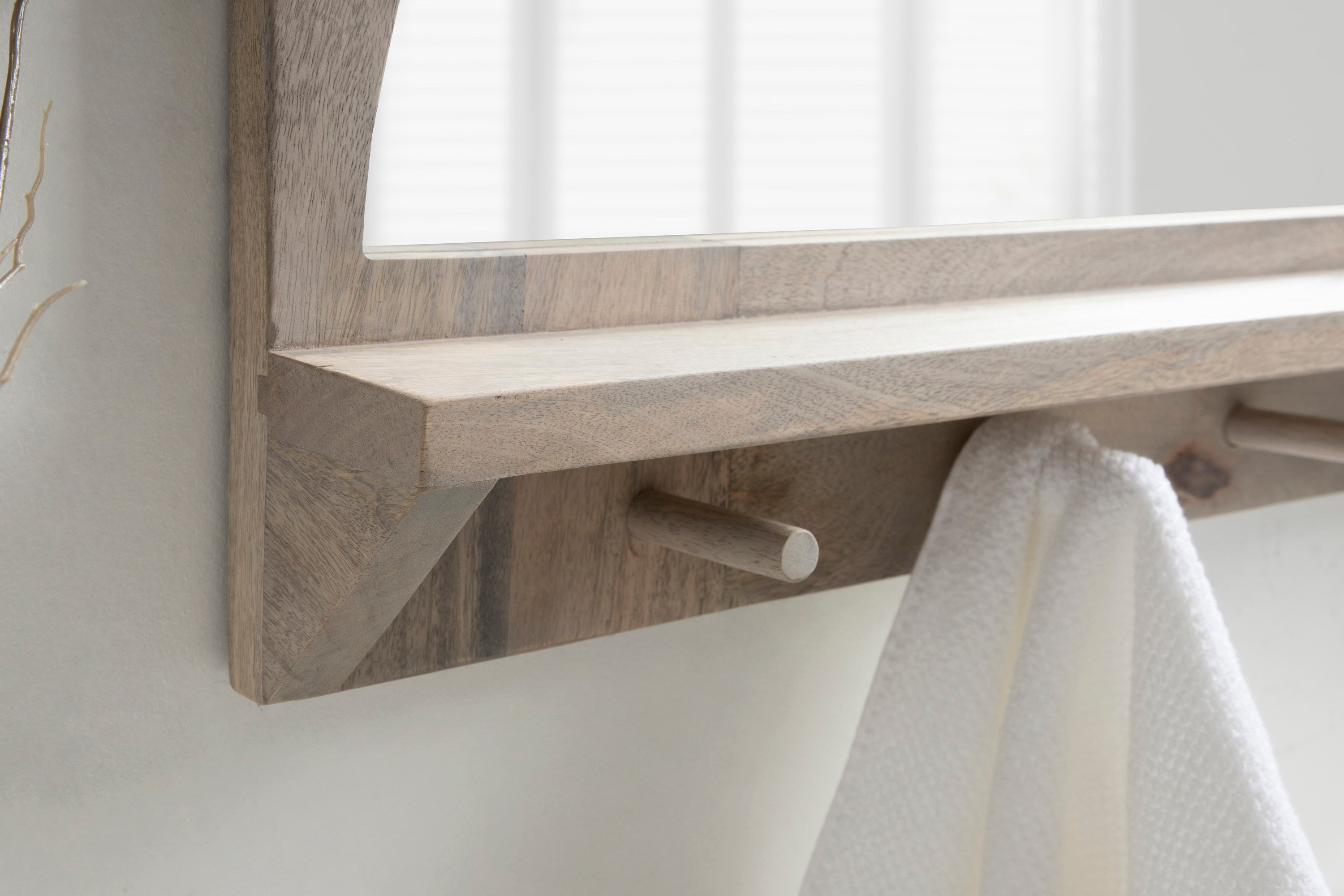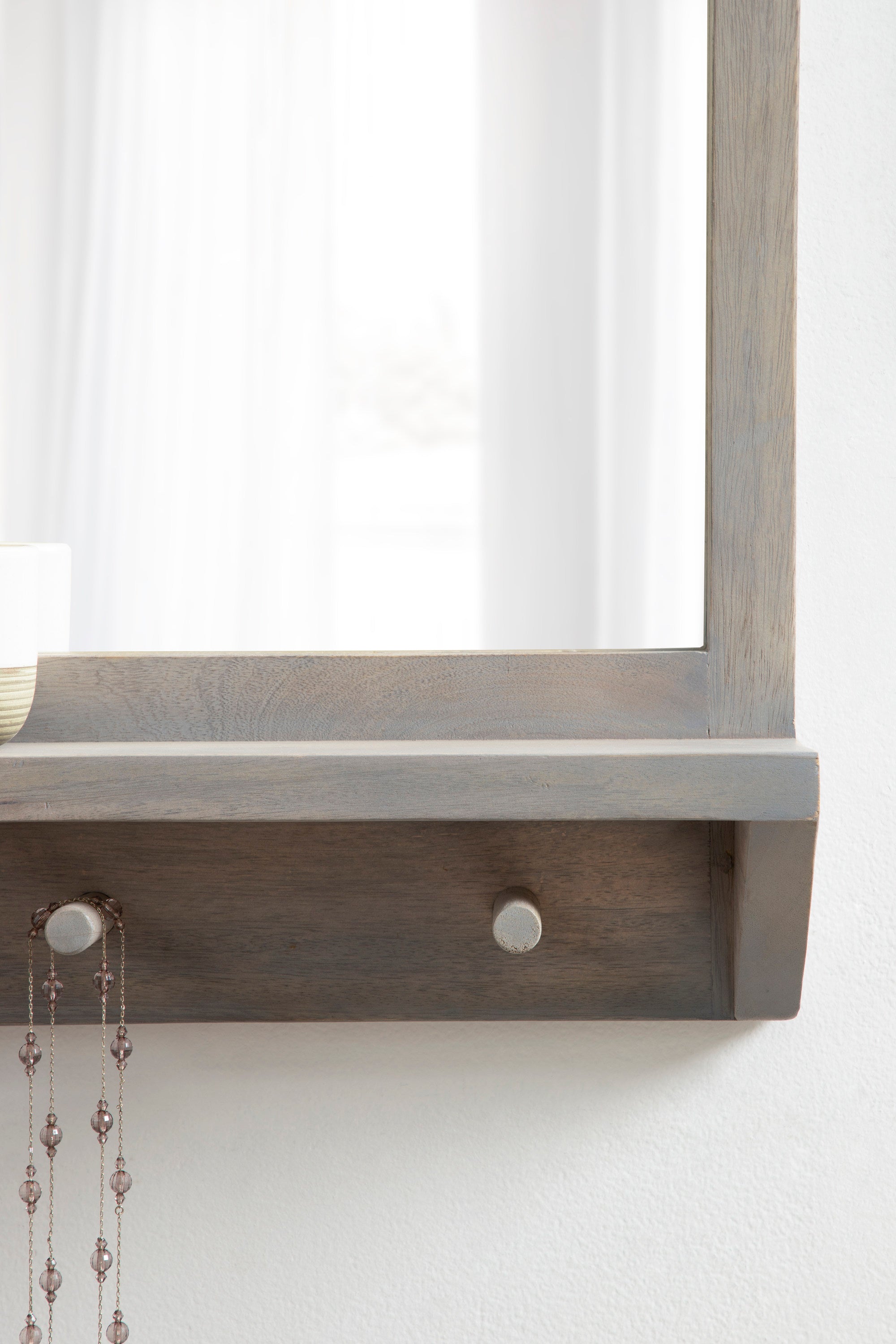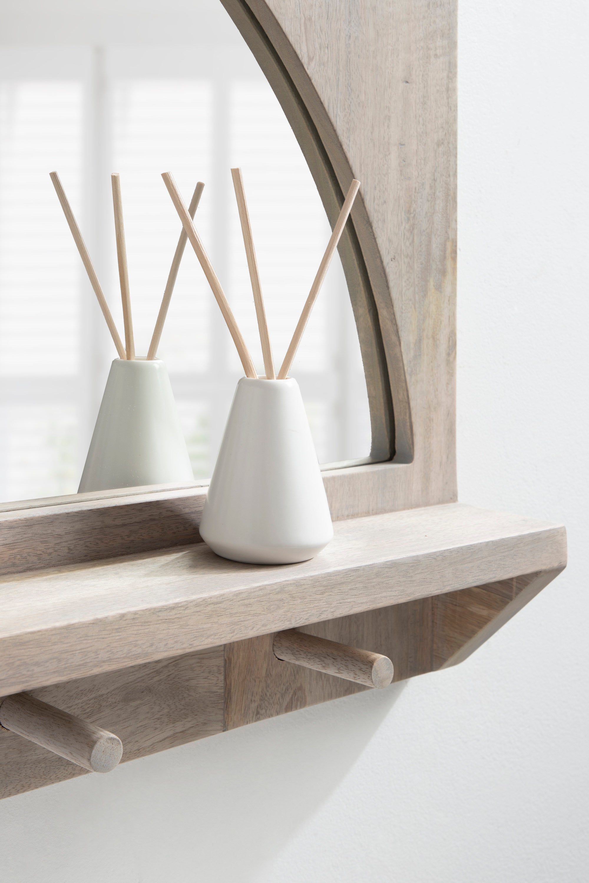 This transitional wall mirror brings functionality to your home decor. The Andover is a fantastic element that combines an arched mirror with a display ledge and hanging pegs, creating an accent piece that is as useful as it is beautiful. It's a fantastic showcase of your mature style that saves space in your home with its practical storage solutions. Use the 3-inch ledge to display mini decor accents or act as catch-all for mail and housekeys. It's excellent for the entryway, freeing up your hands and adding a space to hang your jacket and purse after a long day. This mirror is crafted to be both a decor and storage solution, adding vibrancy and practicality to any room.