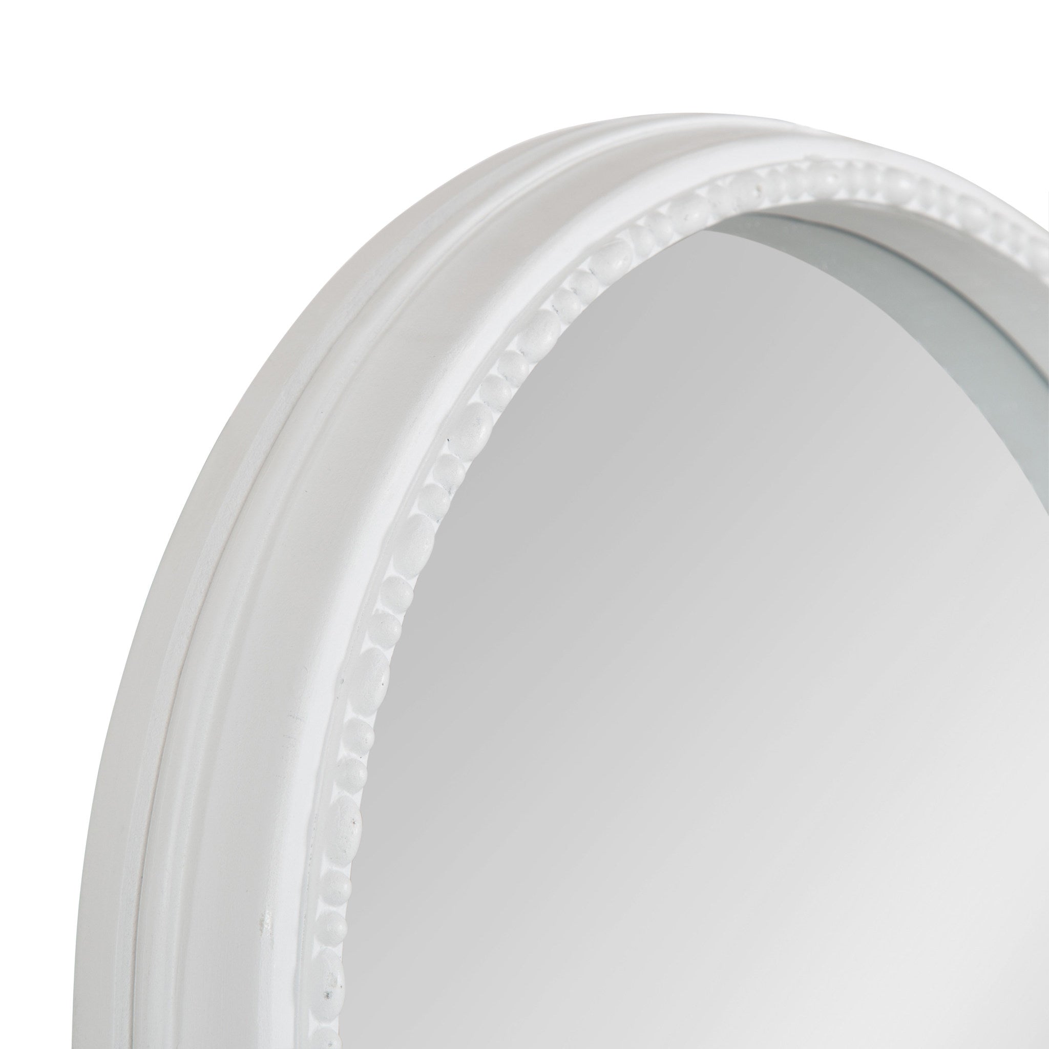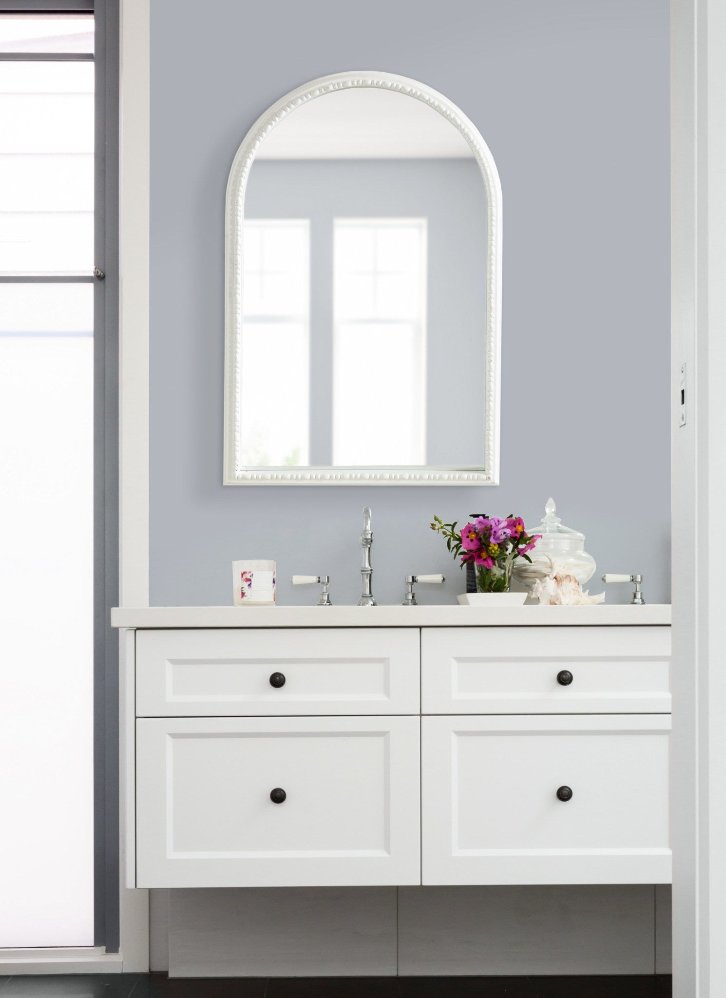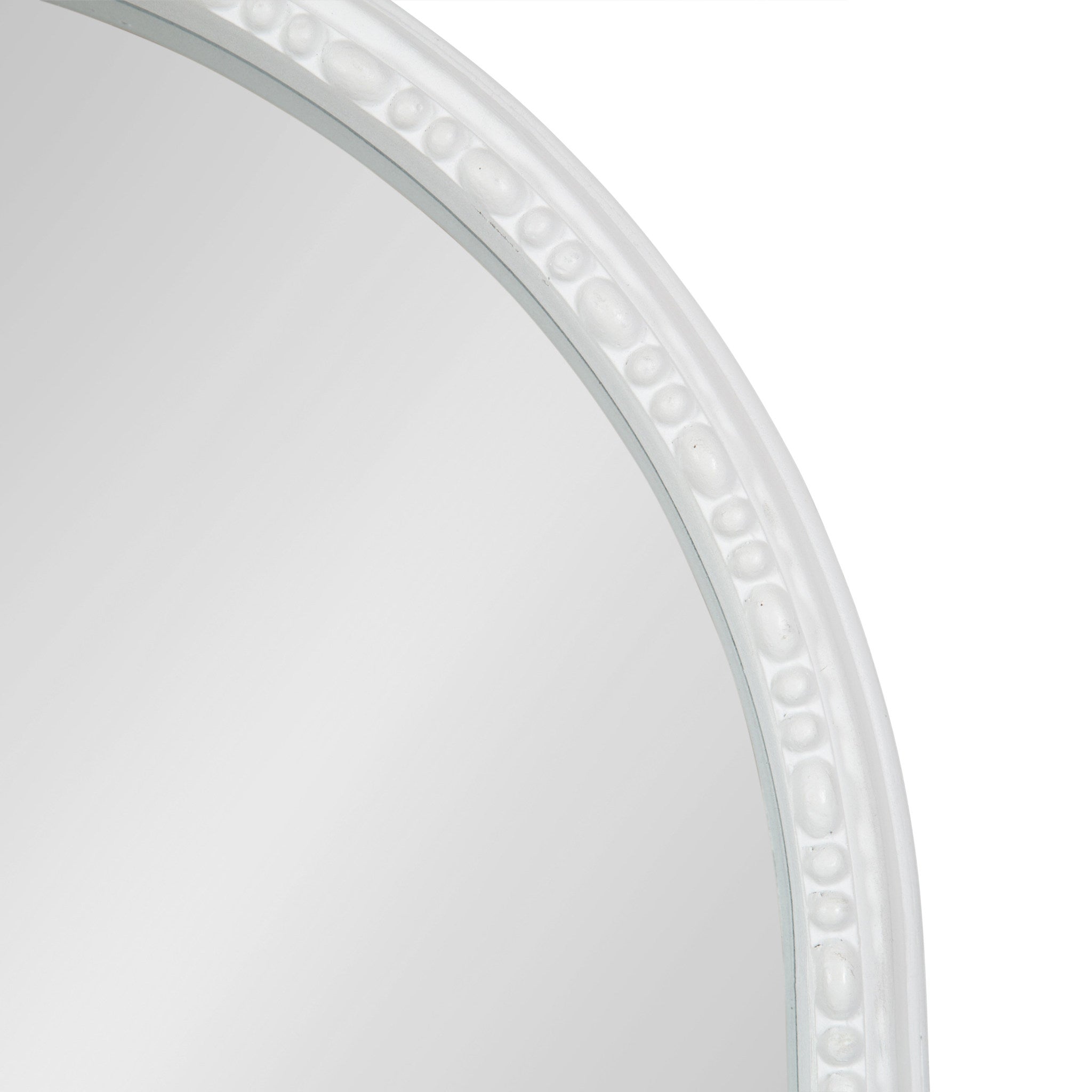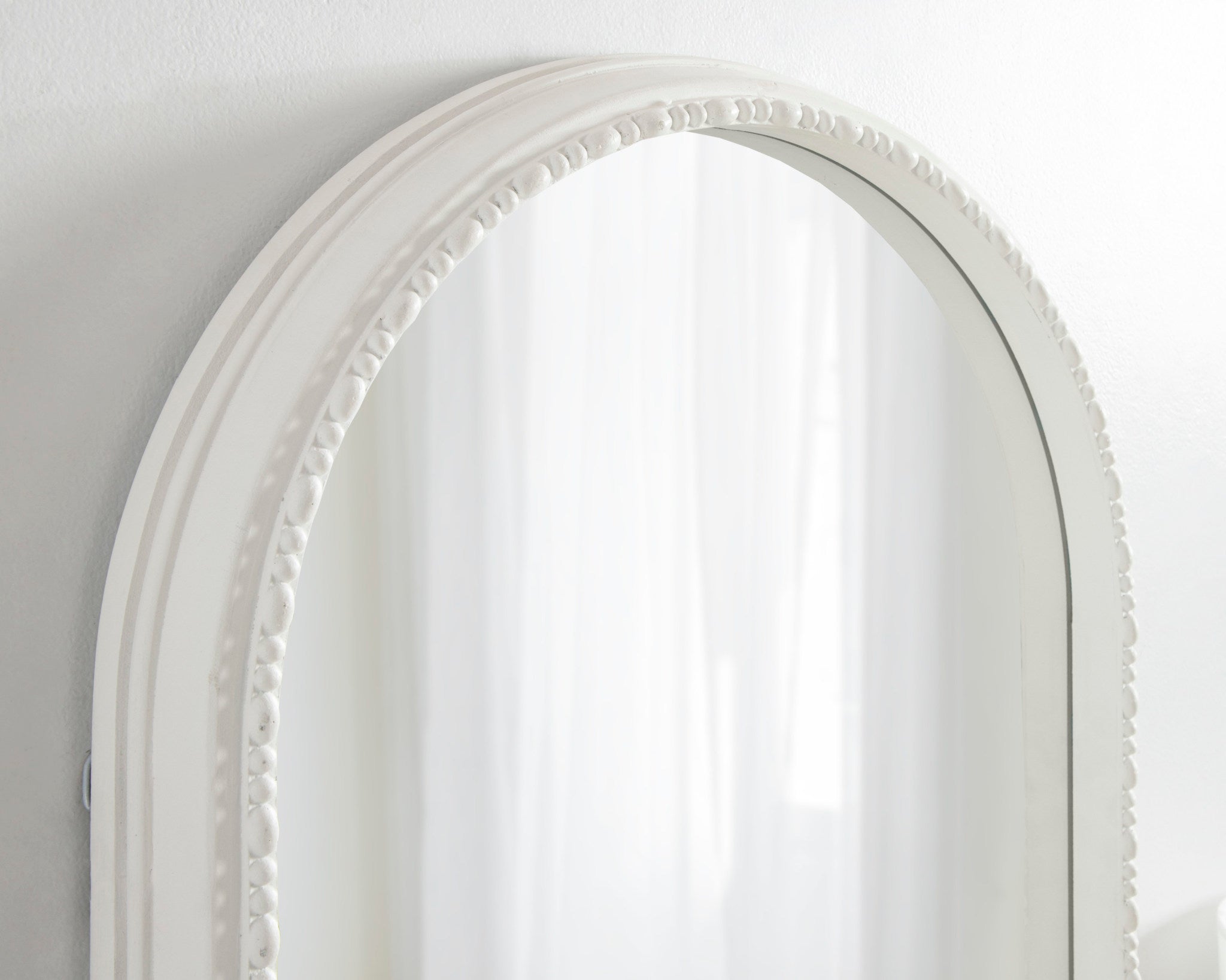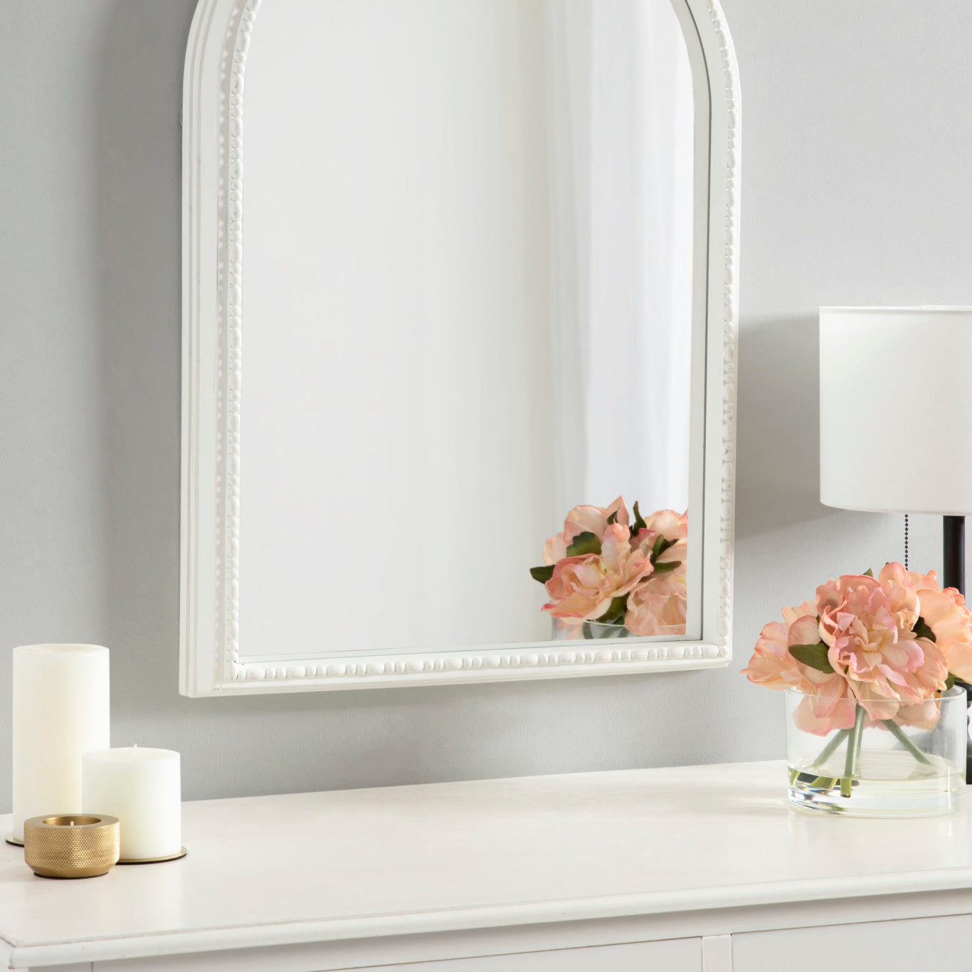 Create the cozy and coastal home of your dreams with the Astele wall mirror. This beautiful wall mirror incorporates a distressed white finish on a beaded, textural frame that draws the eye and creates a rustic visual to accentuate your personal style. Its arched shape and large size are perfect for creating an aesthetically-pleasing focal point to unify your decor in the living room, bedroom, or entryway, or you can hang it above your vanity as a robust bathroom mirror in a single or double orientation.