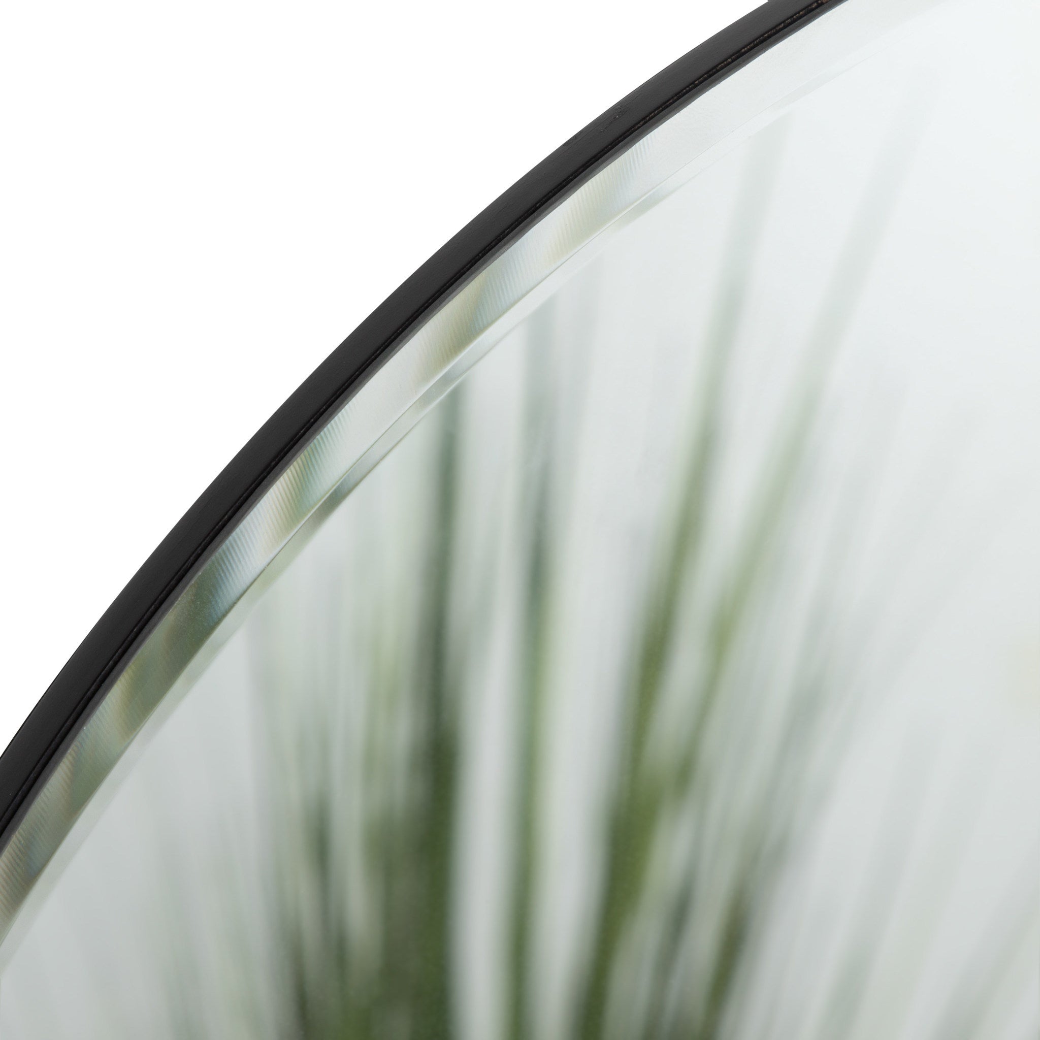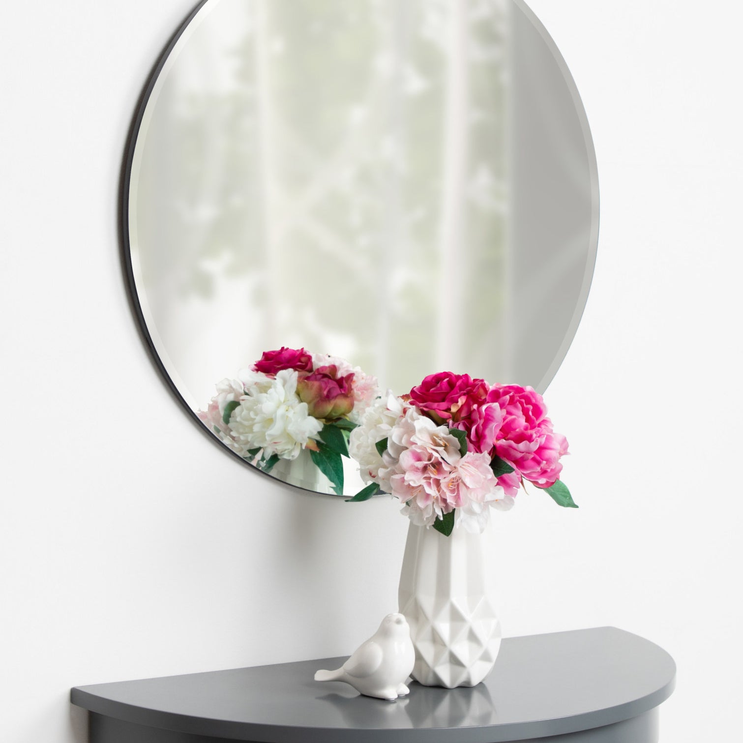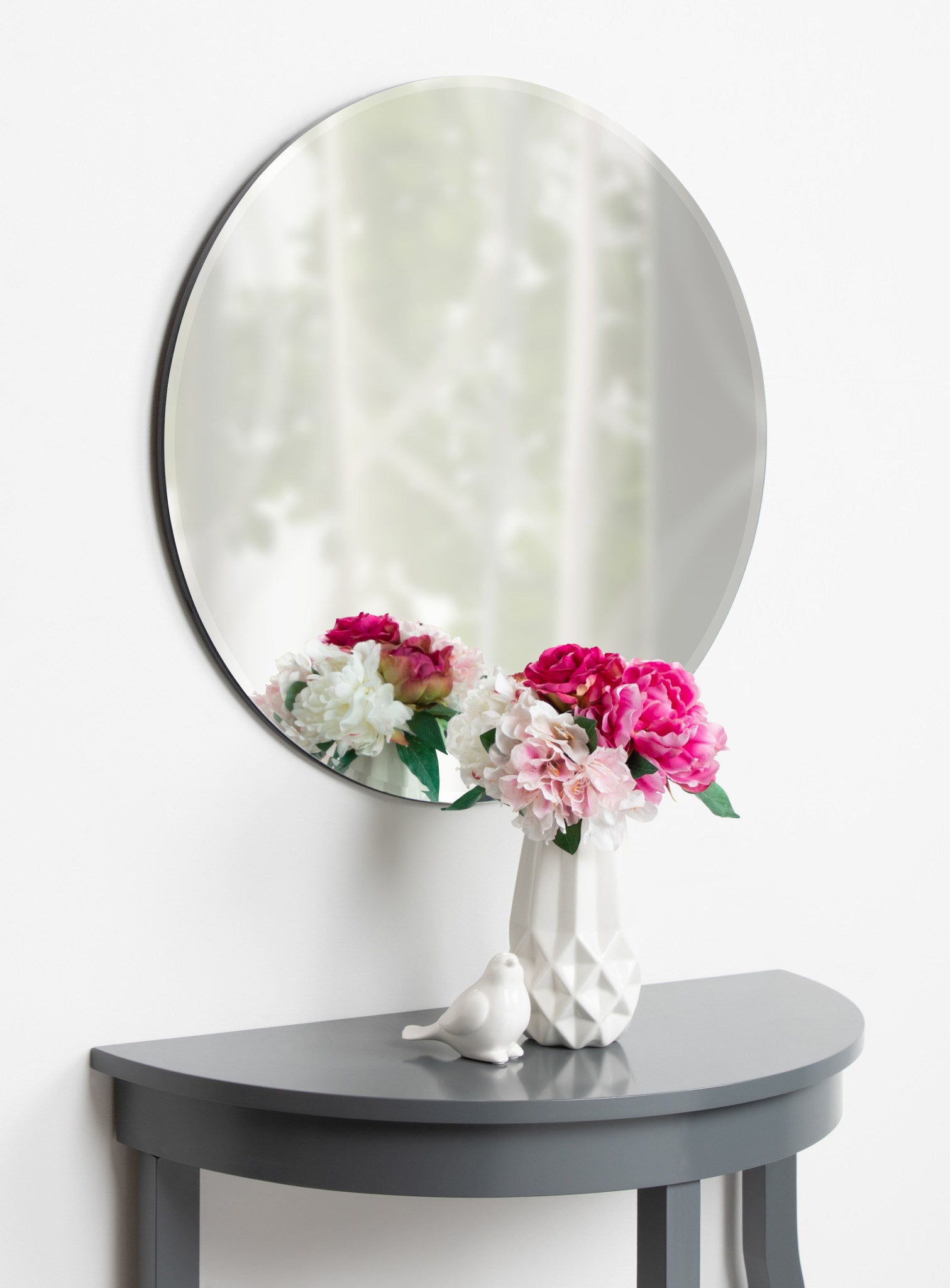 Create the illusion of space and decorate in contemporary style with this modern frameless wall mirror. It will be the highlight of any room and an essential element in your home decor. This mirror displays flat against the wall to bring in reflective light and space. With its soothing, circular shape, frameless style, classic beveled glass, and contemporary design, it's an easy way to revamp an area. Hang it above a fireplace, over an accent table, in a hallway, or use it as a vanity in a bathroom. This mirror is easy to install with hanging hardware already attached to the wooden back for horizontal or vertical wall display. The overall dimensions are 26-inches in diameter by .63-inches deep.