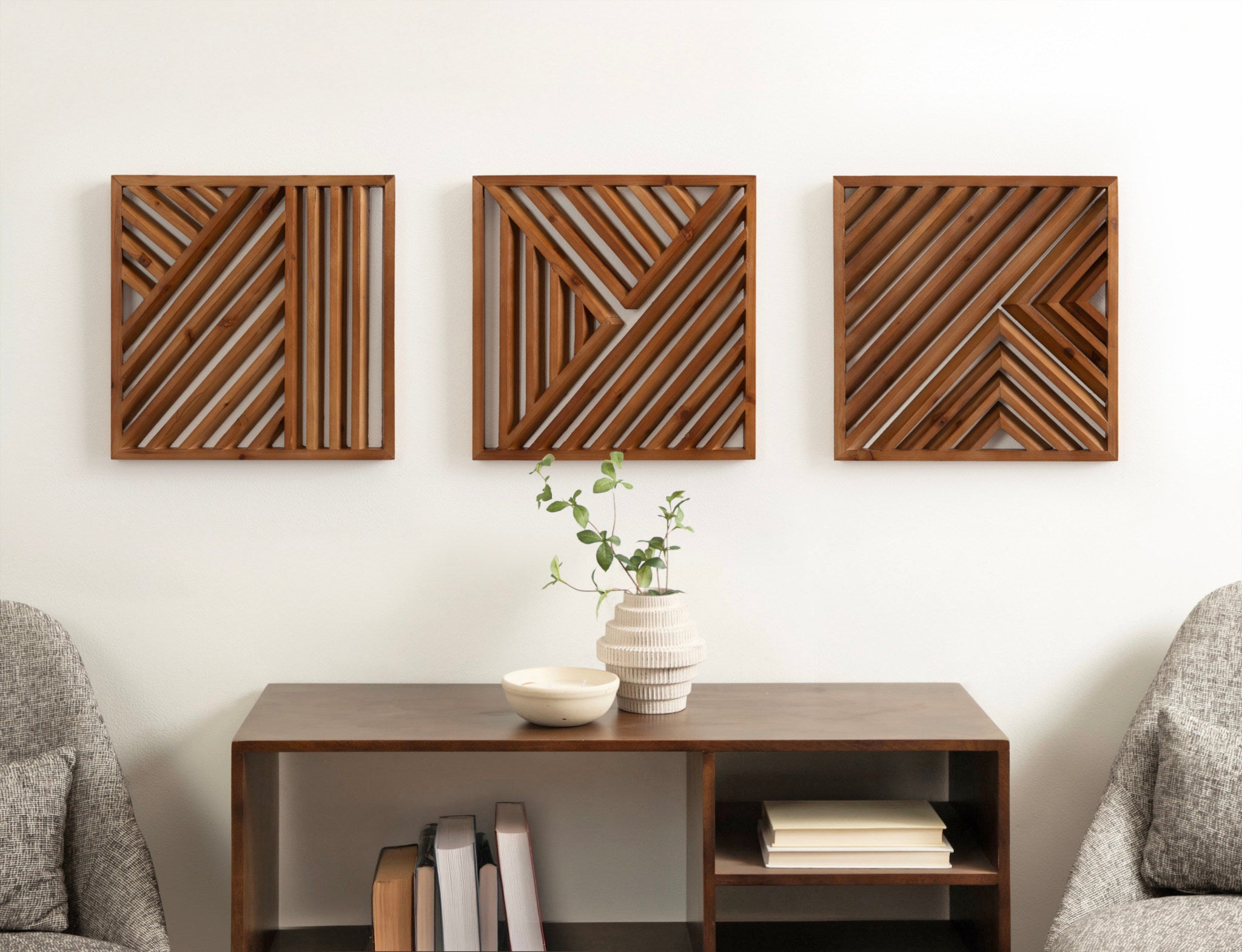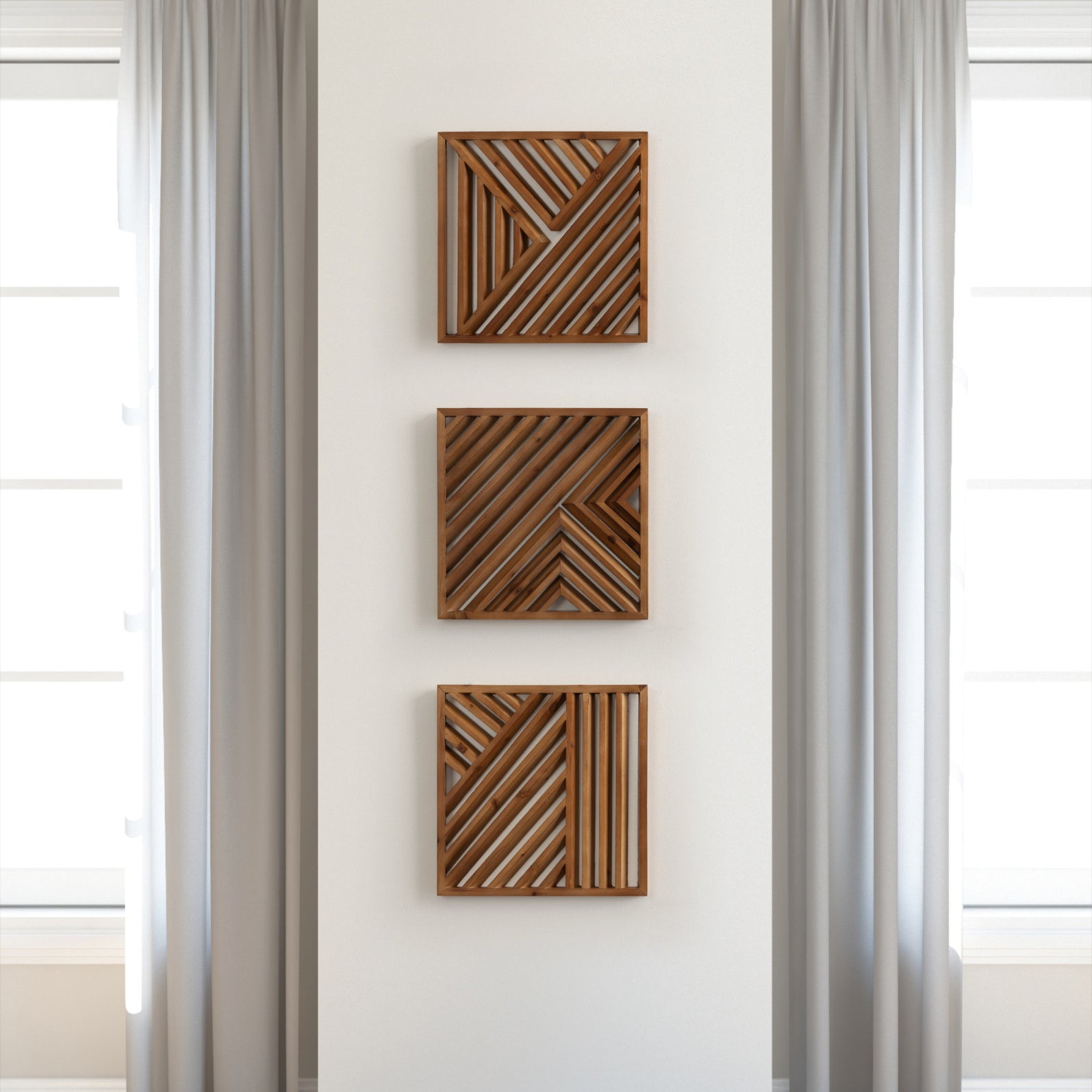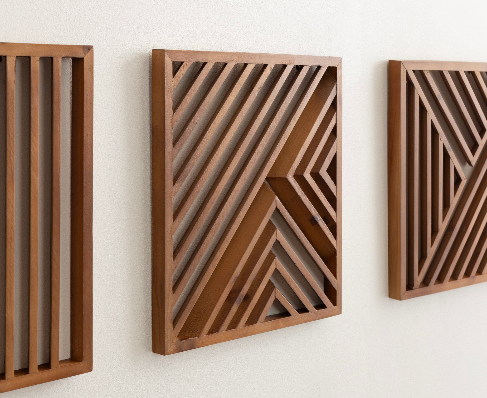 Create a memorable modern decor aesthetic on your wall with the Barreda wall plaque set. These mesmerizing wall accents utilize a wealth of dimension to command attention through visual eccentricities. Each plaque incorporates horizontal and diagonal lines to draw the eye and create a dynamic focal point amidst your other home decor. The Barreda is crafted from rich, high-quality solid wood, delivering a statement piece capable of flourishing for generations to come. With this three-piece set, you can showcase them together as a large, cohesive display or spread them throughout your home. Hang this transitional accent piece in your living room, bedroom, entryway, or dining room. Use the sawtooth hangers attached to the back of the frame for quick and easy installation in a matter of minutes.