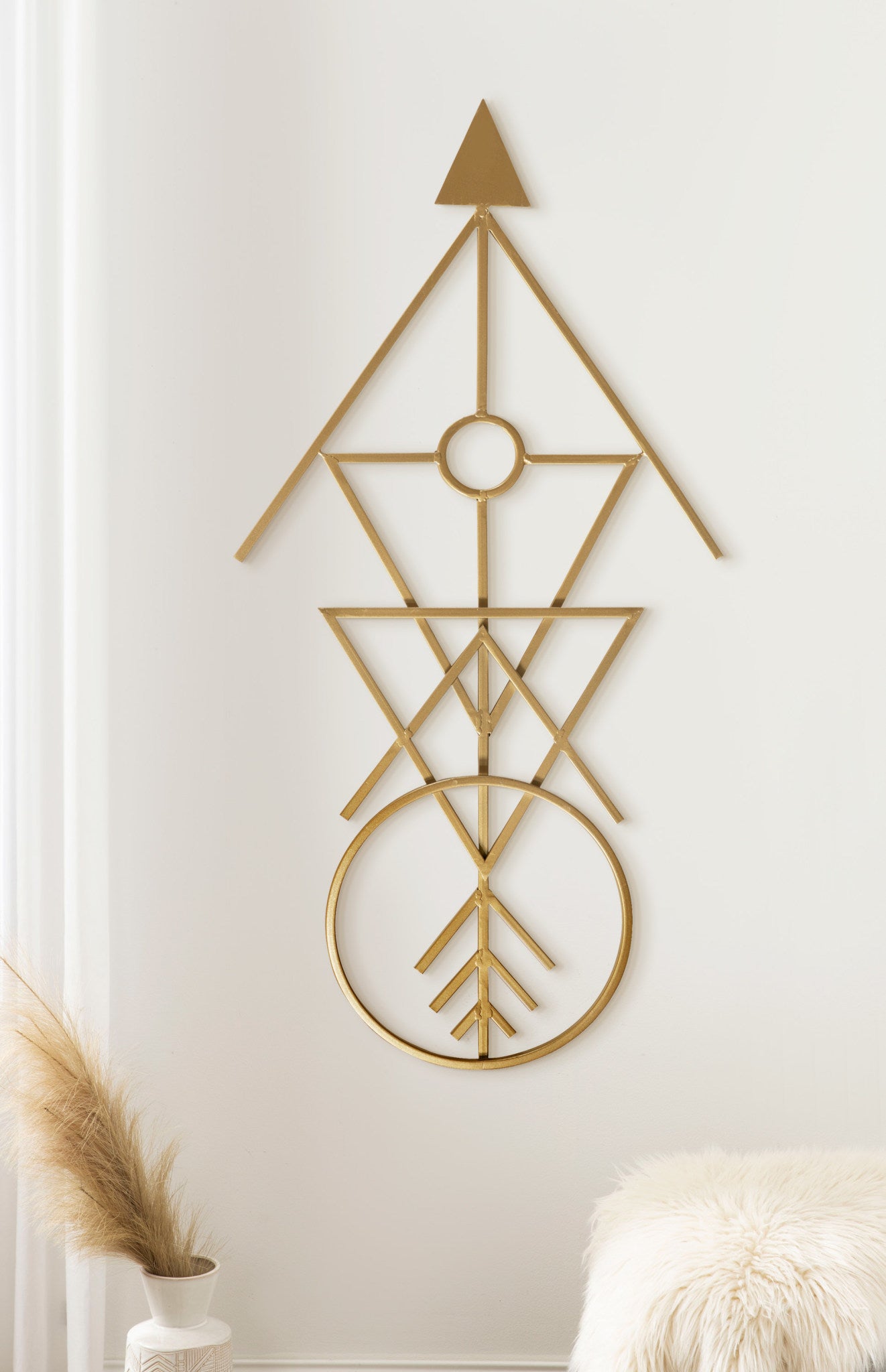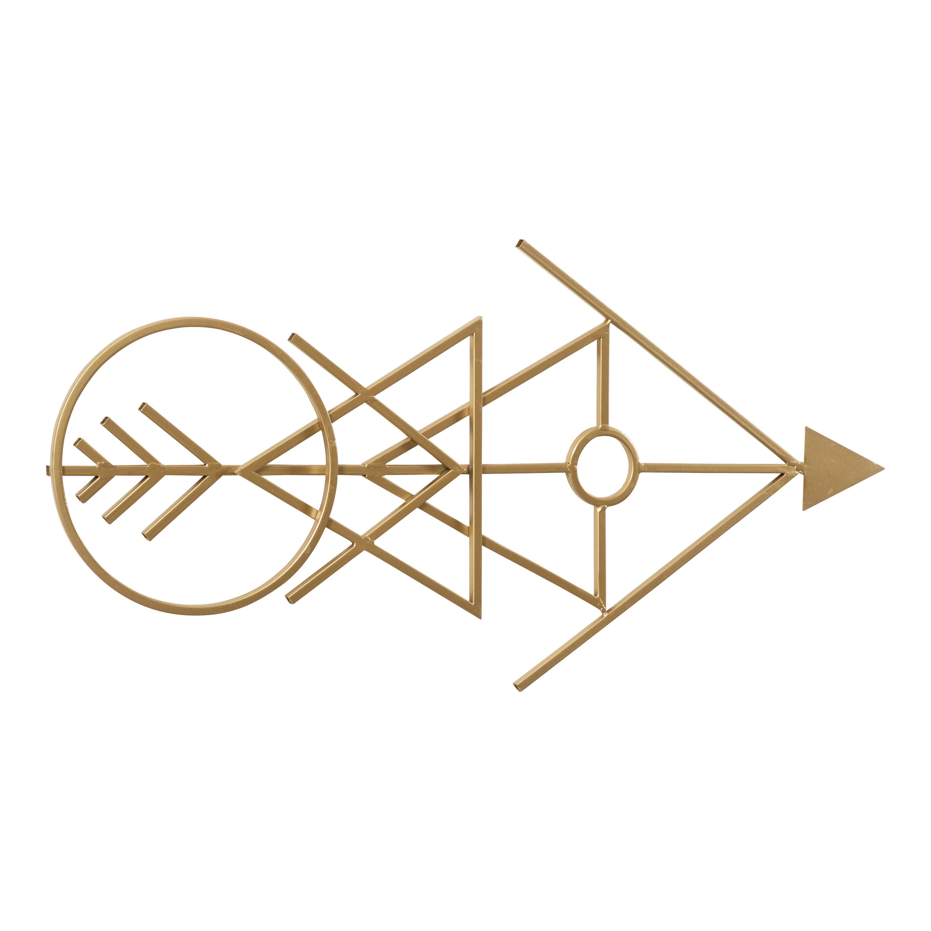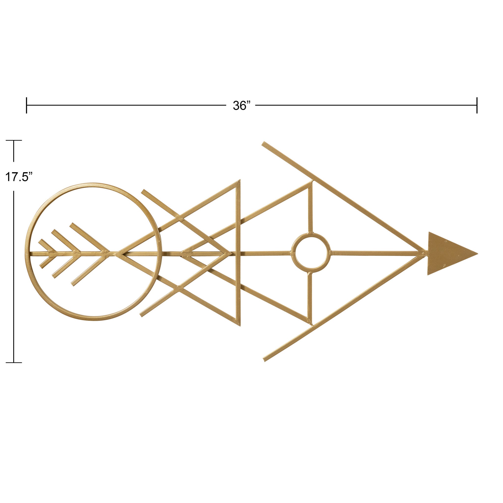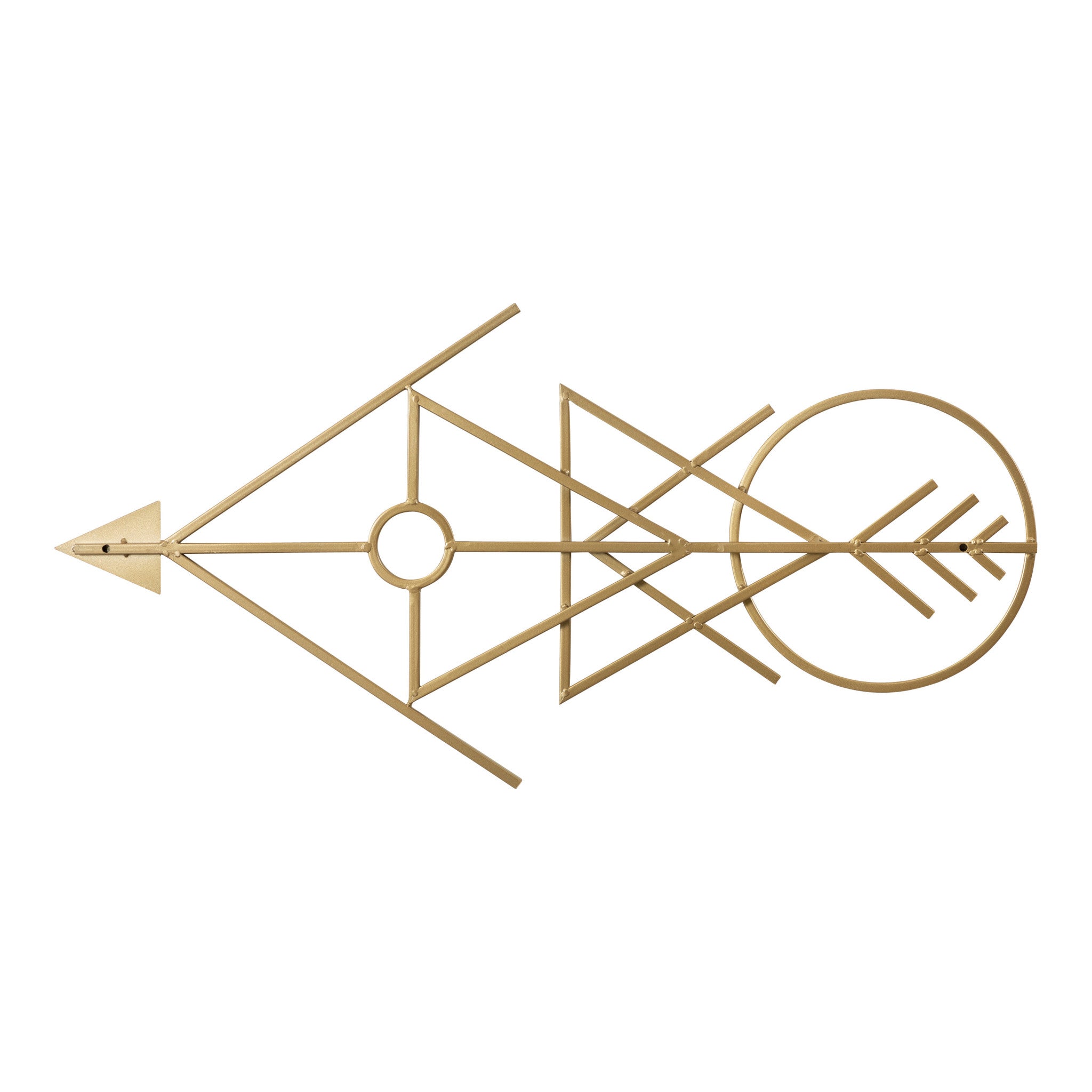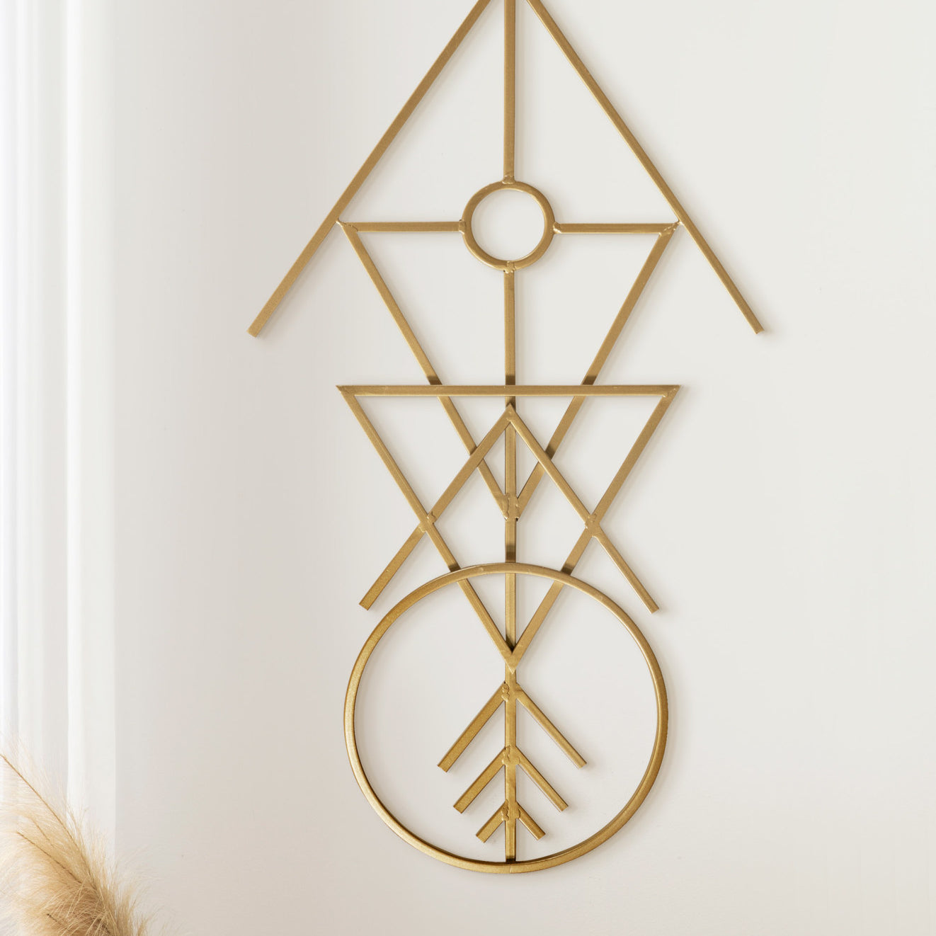 Enhance the bohemian beauty of your home decor scheme with the elegant Benta gold wall art plaque. This beautiful accent piece highlights your bold and worldly taste with its unique design. The Benta utilizes geometric shapes that take the overall form of an arrow to elicit the beauty and fascinating culture of centuries past. This piece of metal wall decor is constructed from robust iron material, providing long-lasting resiliency and premium quality that is made for years of decadent display. The gold finish on this piece of boho decor provides a certain elegance and sleekness to your favorite living space. This lovely accent piece highlights your unique taste while creating a commanding presence with its large size. The overall display dimensions of this charming accent piece are 36 inches wide by 17.5 inches tall, making the Benta a dynamic accent piece to give your wall life and depth. Hang this beautiful wall decor piece among your entryway, bathroom, living room, or bedroom decor easily with the metal hangers conveniently attached to the back of the Benta.